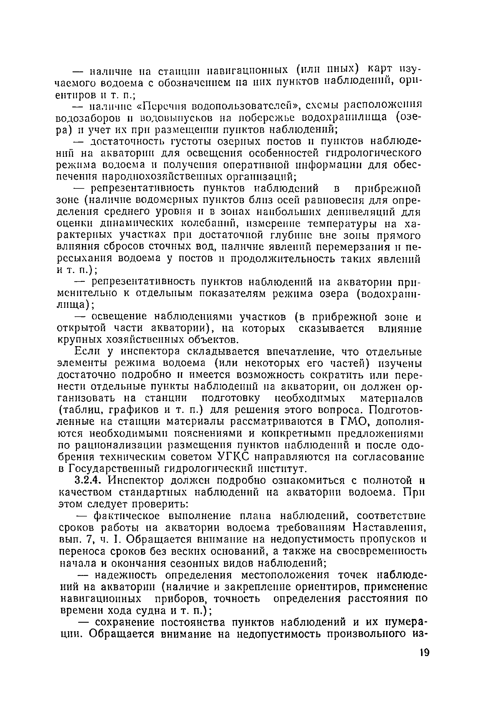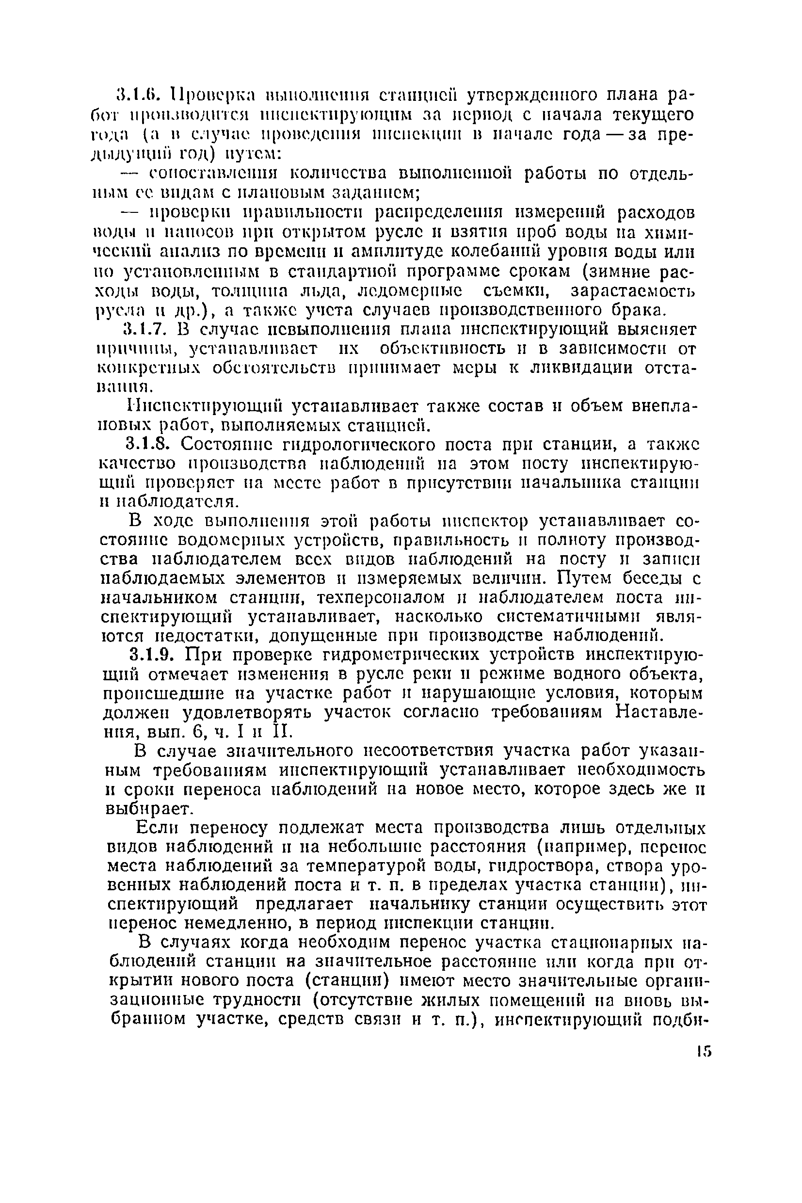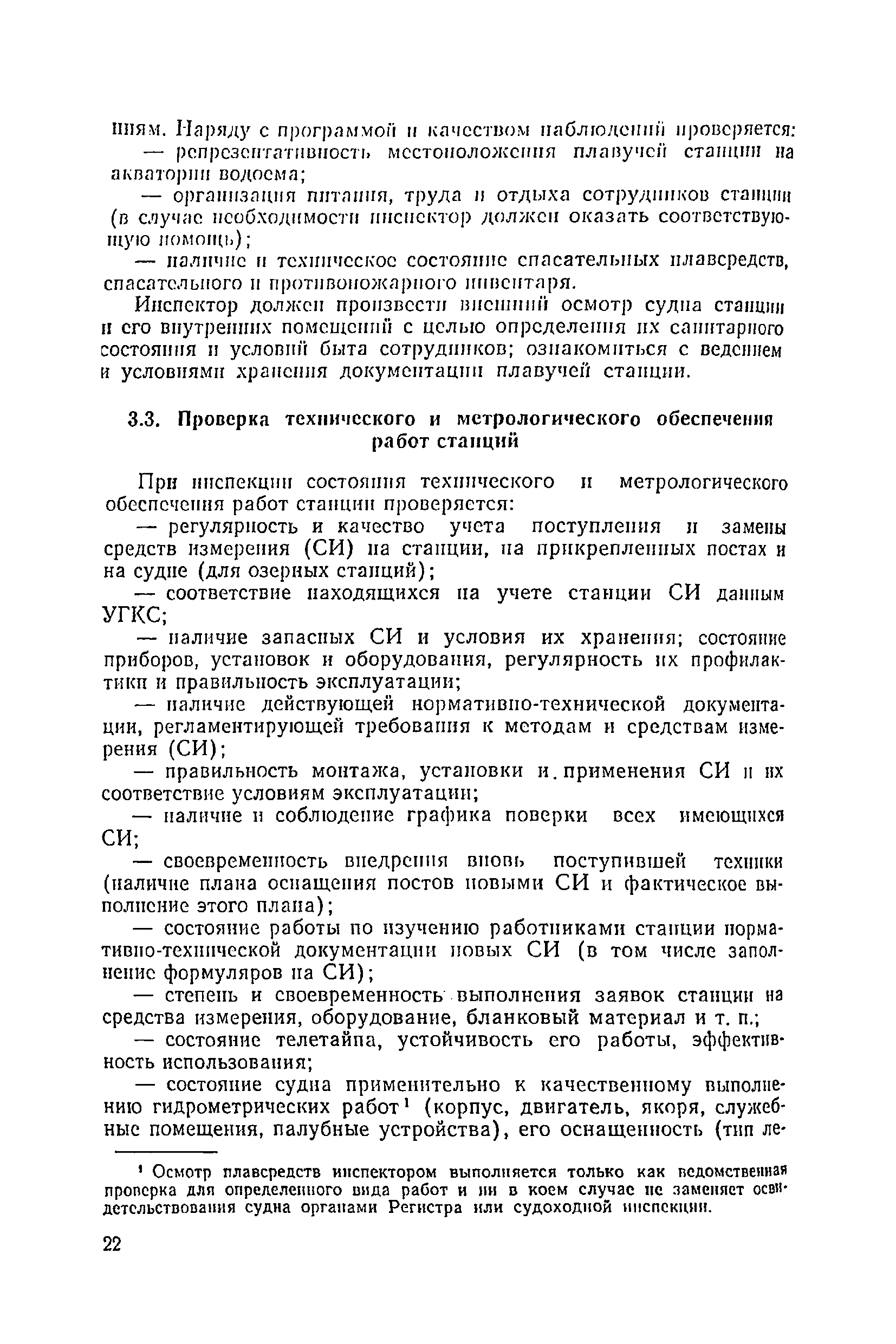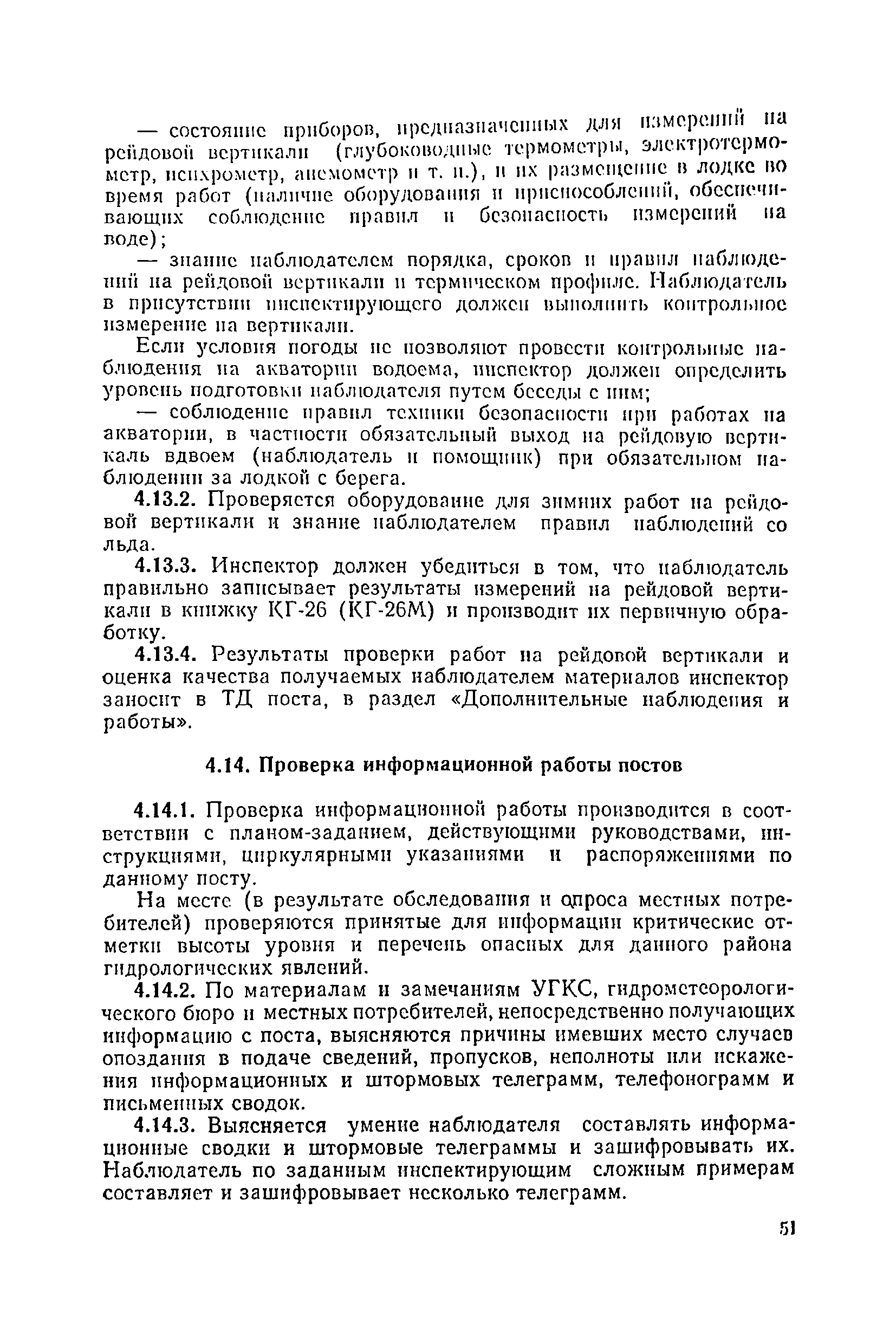 Наставление гидрометеорологическим станциям и постам. Выпуск 10. Инспекции гидрометеорологических станций и постов. Часть II. Инспекция гидрологических станций и постов| Статус: | действует | | Название рус.: | Наставление гидрометеорологическим станциям и постам. Выпуск 10. Инспекции гидрометеорологических станций и постов. Часть II. Инспекция гидрологических станций и постов | | Дата добавления в базу: | 01.02.2020 | | Дата актуализации: | 01.01.2021 | | Дата введения: | 01.01.1981 | | Область применения: | Документ является пособием для работников сети, обеспечивающих текущий контроль и надзор за работой станций и прикрепленных к станциям постов в период между инспекциями | | Оглавление: | Предисловие 1 Общие положения 1.1 Задачи инспекций станций и постов 1.2 Виды и сроки инспекций 1.3 Инспекция ведомственных постов (станций) 1.4 Состав инспектирующих 1.5 Обязанности и права инспектирующих 1.6 Этапы проведения инспекций и контроль за выполнением предложений инспектирующих 2 Подготовка к инспекции станции 2.1 Состав подготовительных работ 2.2 Рекомендации по проведению подготовительных работ 3 Проведение инспекция гидрологических и озерных станций 3.1 Проверка выполнения гидрологической станцией плана работ и руководства постами 3.2 Проверка работы озерной станции по производству наблюдений и руководству постами 3.3 Проверка технического и метрологического обеспечения работ станций 3.4 Проверка работ по обработке и подготовке к печати материалов наблюдений 3.5 Проверка состояния работ по гидрометеорологическому обеспечению народнохозяйственных организаций 3.6 Проверка выполнения методических и научно-исследовательских работ 3.7 Проверка организации труда на станции и ее хозяйственно-финансовой деятельности 3.8 Подведение итогов и оформление результатов инспекция 4 Инспекция гидрологических постов 4.1 Подготовка к инспекции постов. Ознакомление с Техническим делом 4.2 Виды работ при инспекции поста 4.3 Обследование водного объекта на участке поста 4.4 Проверка топографо-геодезического обоснования поста 4.5 Проверка наблюдений за уровнем воды и уклоном водной поверхности 4.6 Проверка наблюдений за температурой воды и воздуха 4.7 Проверка наблюдений за ледовой обстановкой и измерений толщины льда 4.8 Проверка наблюдений за водной растительностью, ветром, волнением и другими явлениями 4.9 Проверка работы по учету стока воды 4.10 Особенности инспекция постов, учитывающих сток в створах гидротехнических сооружений 4.11 Проверка работы по учету стока наносов 4.12 Проверка работ по организации и проведению наблюдений и контроля за загрязнением поверхностных вод суши в системе ОГСНК 4.13 Проверка работ озерного гидрологического поста на рейдовой вертикали 4.14 Проверка информационной работы постов 4.15 Общие вопросы инспекции постов 4.16 Оформление результатов инспекции постов Приложение 1. Схема акта инспекции гидрологических станций Приложение 2. Перечень основных дел (папок) и журналов, которые должны вестись на гидрологических станциях 1 разряда Приложение 3. Акт Инспекторского осмотра поста | | Разработан: | ФГБУ ВНИИСХМ