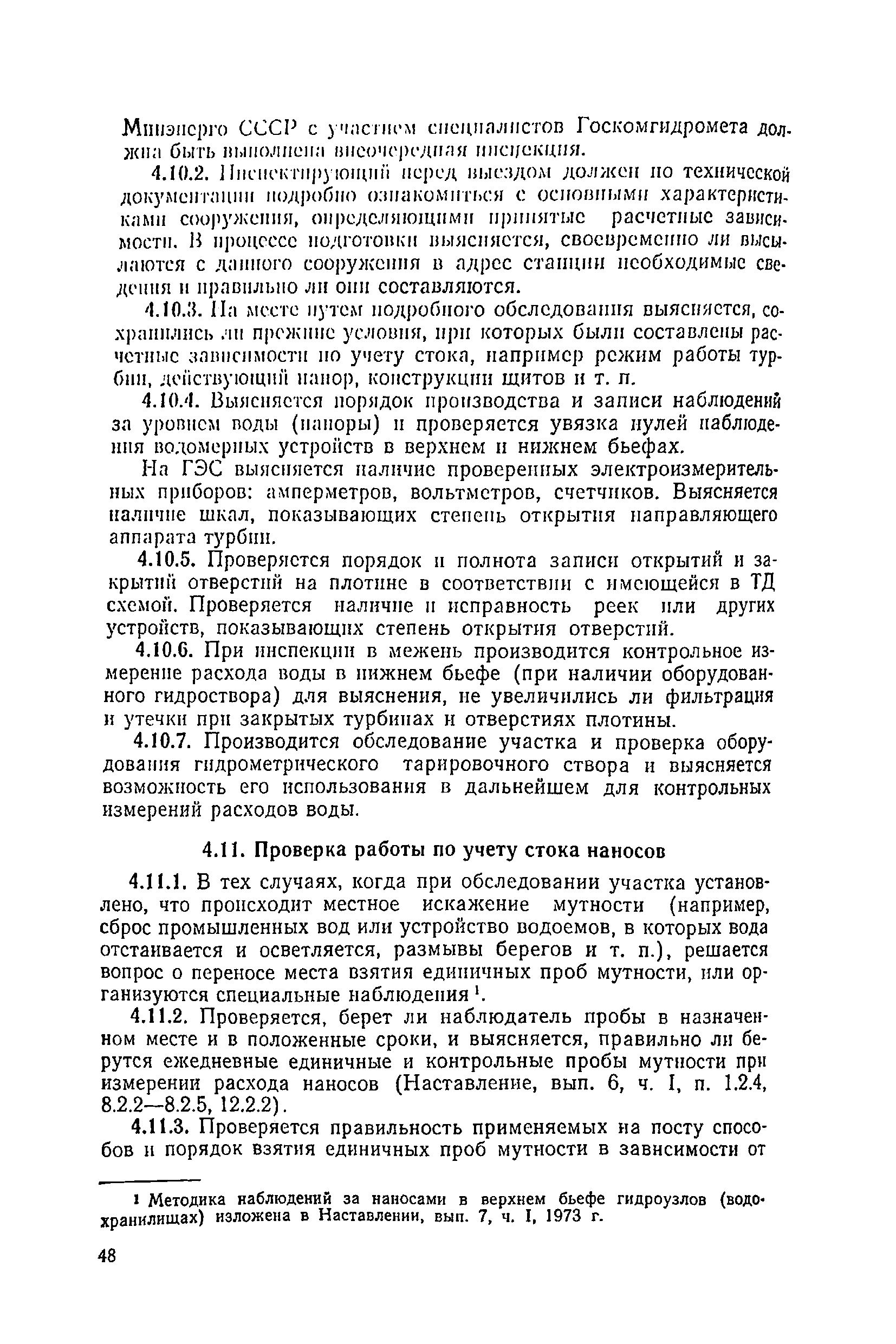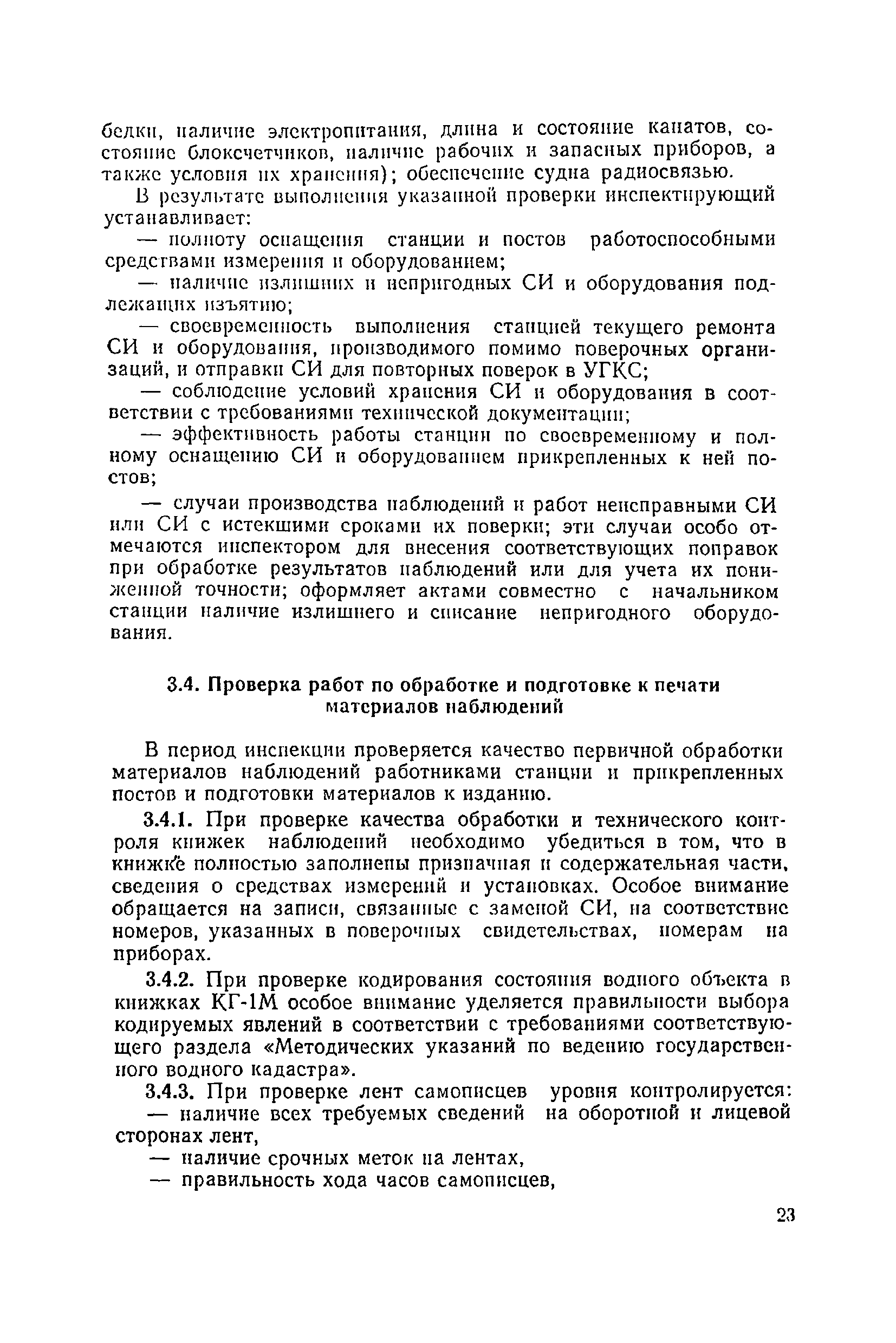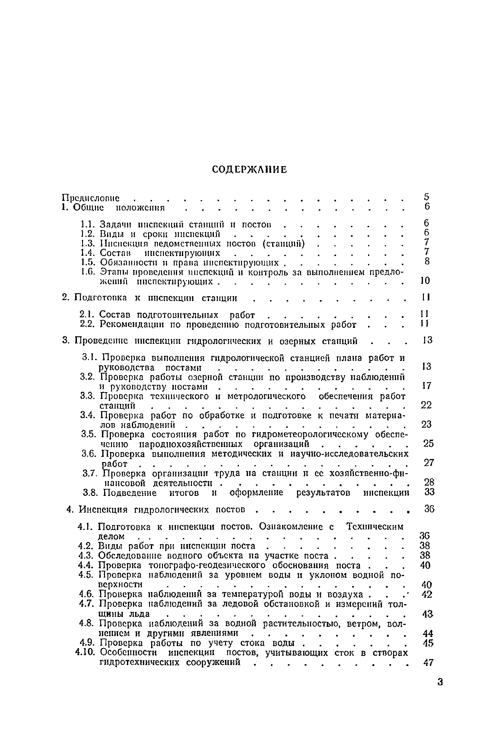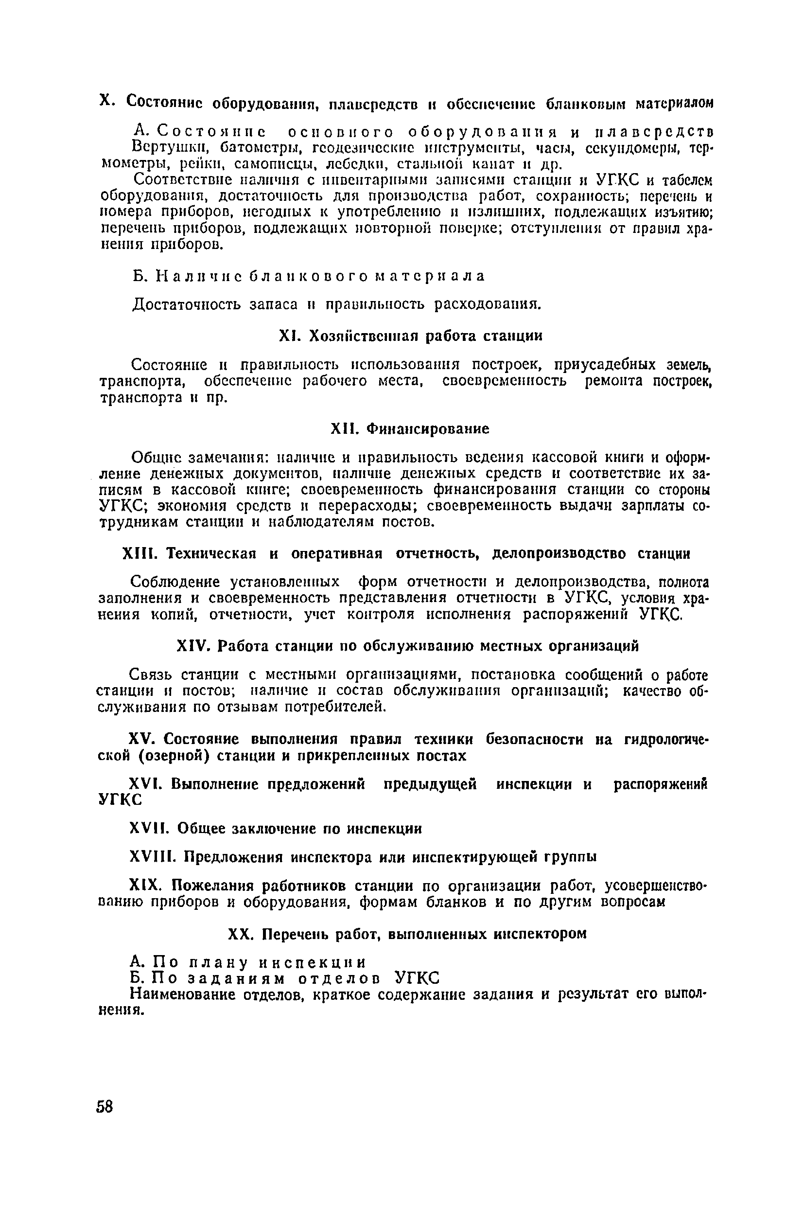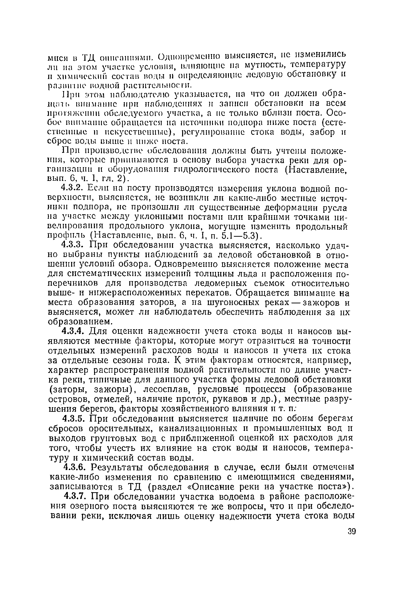 Наставление гидрометеорологическим станциям и постам. Выпуск 10. Инспекции гидрометеорологических станций и постов. Часть II. Инспекция гидрологических станций и постов| Статус: | действует | | Название рус.: | Наставление гидрометеорологическим станциям и постам. Выпуск 10. Инспекции гидрометеорологических станций и постов. Часть II. Инспекция гидрологических станций и постов | | Дата добавления в базу: | 01.02.2020 | | Дата актуализации: | 01.01.2021 | | Дата введения: | 01.01.1981 | | Область применения: | Документ является пособием для работников сети, обеспечивающих текущий контроль и надзор за работой станций и прикрепленных к станциям постов в период между инспекциями | | Оглавление: | Предисловие 1 Общие положения 1.1 Задачи инспекций станций и постов 1.2 Виды и сроки инспекций 1.3 Инспекция ведомственных постов (станций) 1.4 Состав инспектирующих 1.5 Обязанности и права инспектирующих 1.6 Этапы проведения инспекций и контроль за выполнением предложений инспектирующих 2 Подготовка к инспекции станции 2.1 Состав подготовительных работ 2.2 Рекомендации по проведению подготовительных работ 3 Проведение инспекция гидрологических и озерных станций 3.1 Проверка выполнения гидрологической станцией плана работ и руководства постами 3.2 Проверка работы озерной станции по производству наблюдений и руководству постами 3.3 Проверка технического и метрологического обеспечения работ станций 3.4 Проверка работ по обработке и подготовке к печати материалов наблюдений 3.5 Проверка состояния работ по гидрометеорологическому обеспечению народнохозяйственных организаций 3.6 Проверка выполнения методических и научно-исследовательских работ 3.7 Проверка организации труда на станции и ее хозяйственно-финансовой деятельности 3.8 Подведение итогов и оформление результатов инспекция 4 Инспекция гидрологических постов 4.1 Подготовка к инспекции постов. Ознакомление с Техническим делом 4.2 Виды работ при инспекции поста 4.3 Обследование водного объекта на участке поста 4.4 Проверка топографо-геодезического обоснования поста 4.5 Проверка наблюдений за уровнем воды и уклоном водной поверхности 4.6 Проверка наблюдений за температурой воды и воздуха 4.7 Проверка наблюдений за ледовой обстановкой и измерений толщины льда 4.8 Проверка наблюдений за водной растительностью, ветром, волнением и другими явлениями 4.9 Проверка работы по учету стока воды 4.10 Особенности инспекция постов, учитывающих сток в створах гидротехнических сооружений 4.11 Проверка работы по учету стока наносов 4.12 Проверка работ по организации и проведению наблюдений и контроля за загрязнением поверхностных вод суши в системе ОГСНК 4.13 Проверка работ озерного гидрологического поста на рейдовой вертикали 4.14 Проверка информационной работы постов 4.15 Общие вопросы инспекции постов 4.16 Оформление результатов инспекции постов Приложение 1. Схема акта инспекции гидрологических станций Приложение 2. Перечень основных дел (папок) и журналов, которые должны вестись на гидрологических станциях 1 разряда Приложение 3. Акт Инспекторского осмотра поста | | Разработан: | ФГБУ ВНИИСХМ