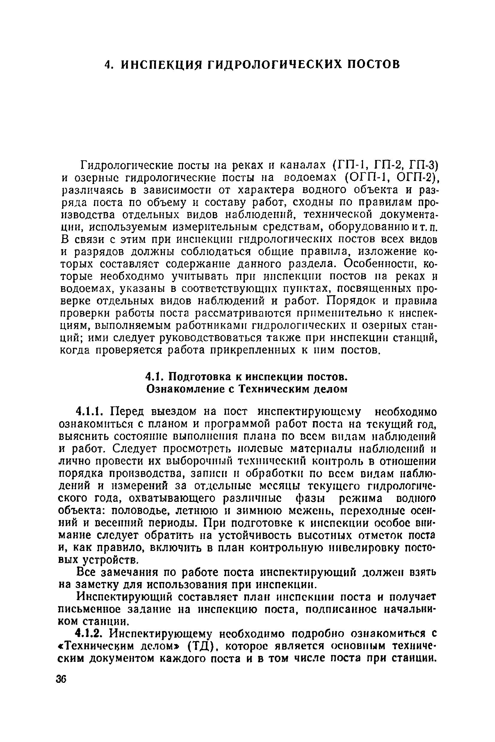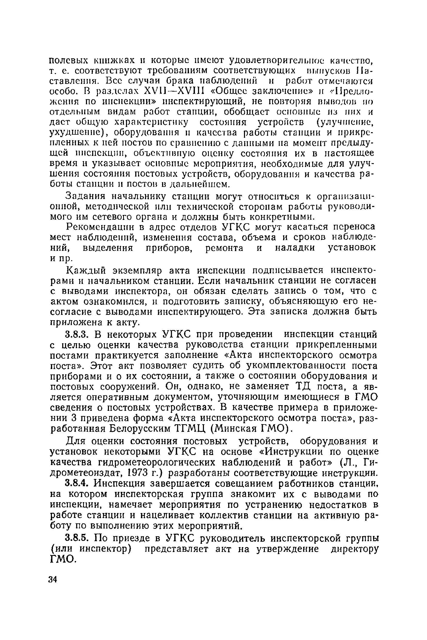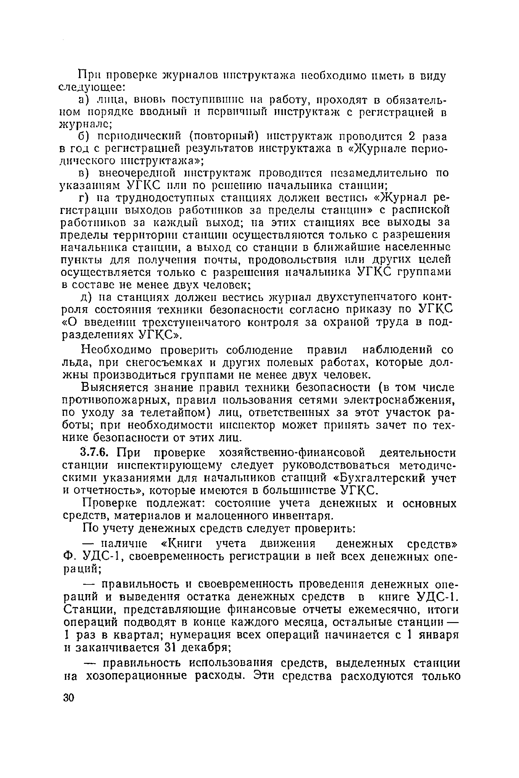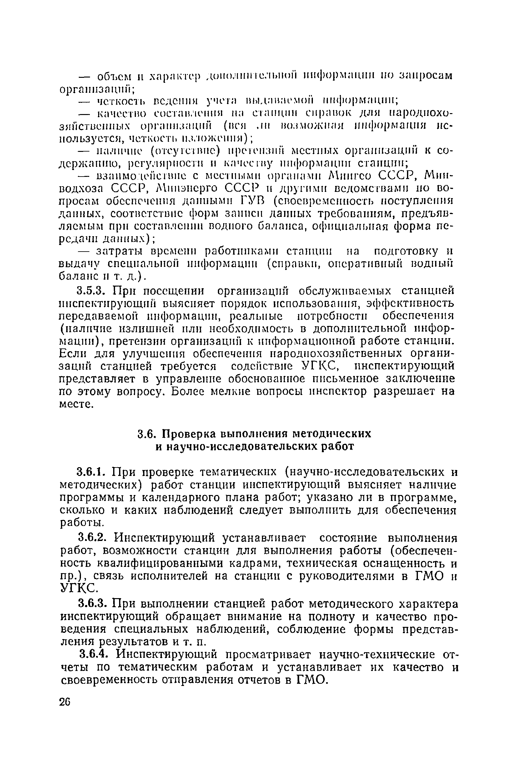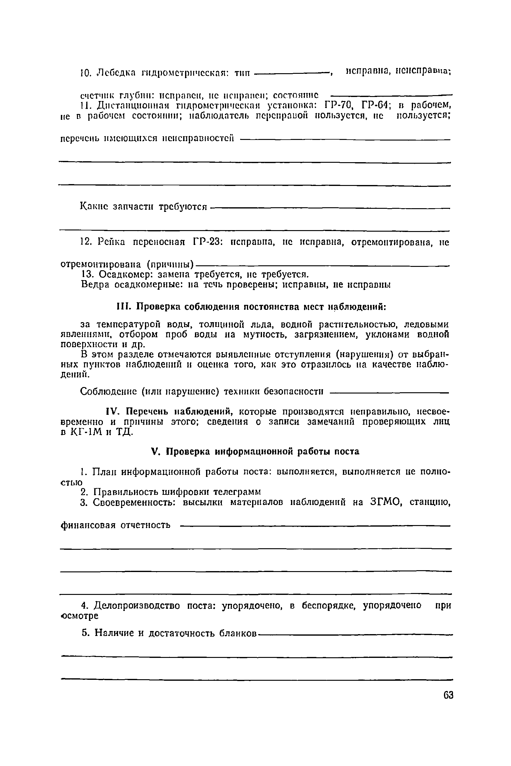 Наставление гидрометеорологическим станциям и постам. Выпуск 10. Инспекции гидрометеорологических станций и постов. Часть II. Инспекция гидрологических станций и постов| Статус: | действует | | Название рус.: | Наставление гидрометеорологическим станциям и постам. Выпуск 10. Инспекции гидрометеорологических станций и постов. Часть II. Инспекция гидрологических станций и постов | | Дата добавления в базу: | 01.02.2020 | | Дата актуализации: | 01.01.2021 | | Дата введения: | 01.01.1981 | | Область применения: | Документ является пособием для работников сети, обеспечивающих текущий контроль и надзор за работой станций и прикрепленных к станциям постов в период между инспекциями | | Оглавление: | Предисловие 1 Общие положения 1.1 Задачи инспекций станций и постов 1.2 Виды и сроки инспекций 1.3 Инспекция ведомственных постов (станций) 1.4 Состав инспектирующих 1.5 Обязанности и права инспектирующих 1.6 Этапы проведения инспекций и контроль за выполнением предложений инспектирующих 2 Подготовка к инспекции станции 2.1 Состав подготовительных работ 2.2 Рекомендации по проведению подготовительных работ 3 Проведение инспекция гидрологических и озерных станций 3.1 Проверка выполнения гидрологической станцией плана работ и руководства постами 3.2 Проверка работы озерной станции по производству наблюдений и руководству постами 3.3 Проверка технического и метрологического обеспечения работ станций 3.4 Проверка работ по обработке и подготовке к печати материалов наблюдений 3.5 Проверка состояния работ по гидрометеорологическому обеспечению народнохозяйственных организаций 3.6 Проверка выполнения методических и научно-исследовательских работ 3.7 Проверка организации труда на станции и ее хозяйственно-финансовой деятельности 3.8 Подведение итогов и оформление результатов инспекция 4 Инспекция гидрологических постов 4.1 Подготовка к инспекции постов. Ознакомление с Техническим делом 4.2 Виды работ при инспекции поста 4.3 Обследование водного объекта на участке поста 4.4 Проверка топографо-геодезического обоснования поста 4.5 Проверка наблюдений за уровнем воды и уклоном водной поверхности 4.6 Проверка наблюдений за температурой воды и воздуха 4.7 Проверка наблюдений за ледовой обстановкой и измерений толщины льда 4.8 Проверка наблюдений за водной растительностью, ветром, волнением и другими явлениями 4.9 Проверка работы по учету стока воды 4.10 Особенности инспекция постов, учитывающих сток в створах гидротехнических сооружений 4.11 Проверка работы по учету стока наносов 4.12 Проверка работ по организации и проведению наблюдений и контроля за загрязнением поверхностных вод суши в системе ОГСНК 4.13 Проверка работ озерного гидрологического поста на рейдовой вертикали 4.14 Проверка информационной работы постов 4.15 Общие вопросы инспекции постов 4.16 Оформление результатов инспекции постов Приложение 1. Схема акта инспекции гидрологических станций Приложение 2. Перечень основных дел (папок) и журналов, которые должны вестись на гидрологических станциях 1 разряда Приложение 3. Акт Инспекторского осмотра поста | | Разработан: | ФГБУ ВНИИСХМ