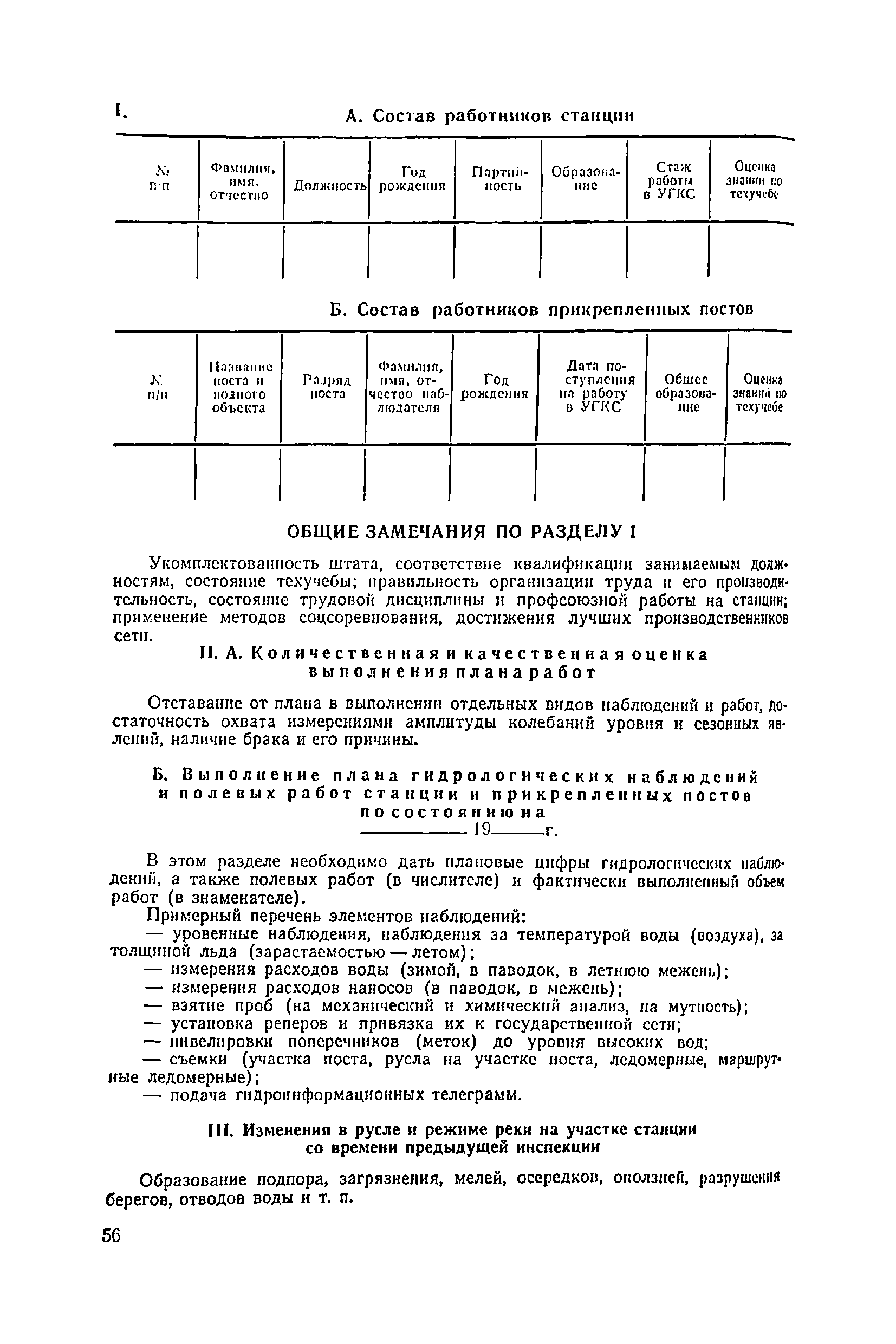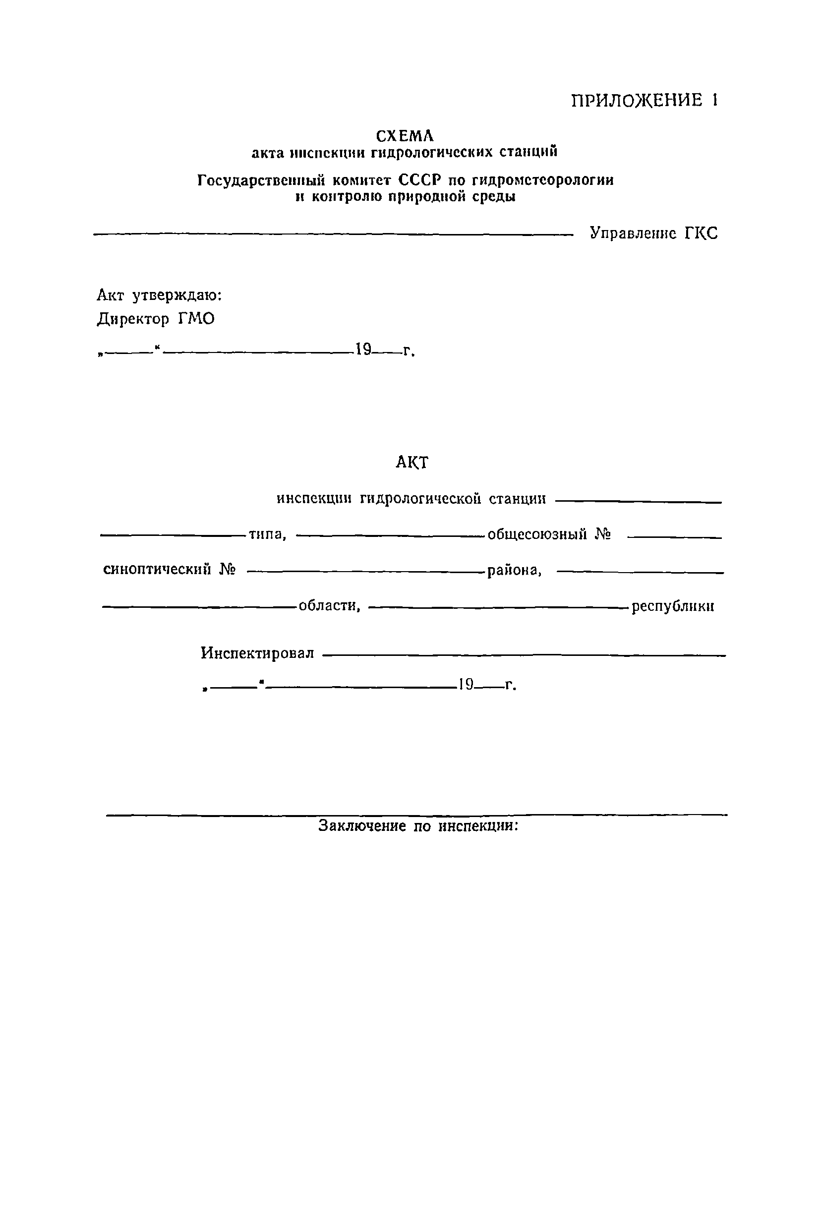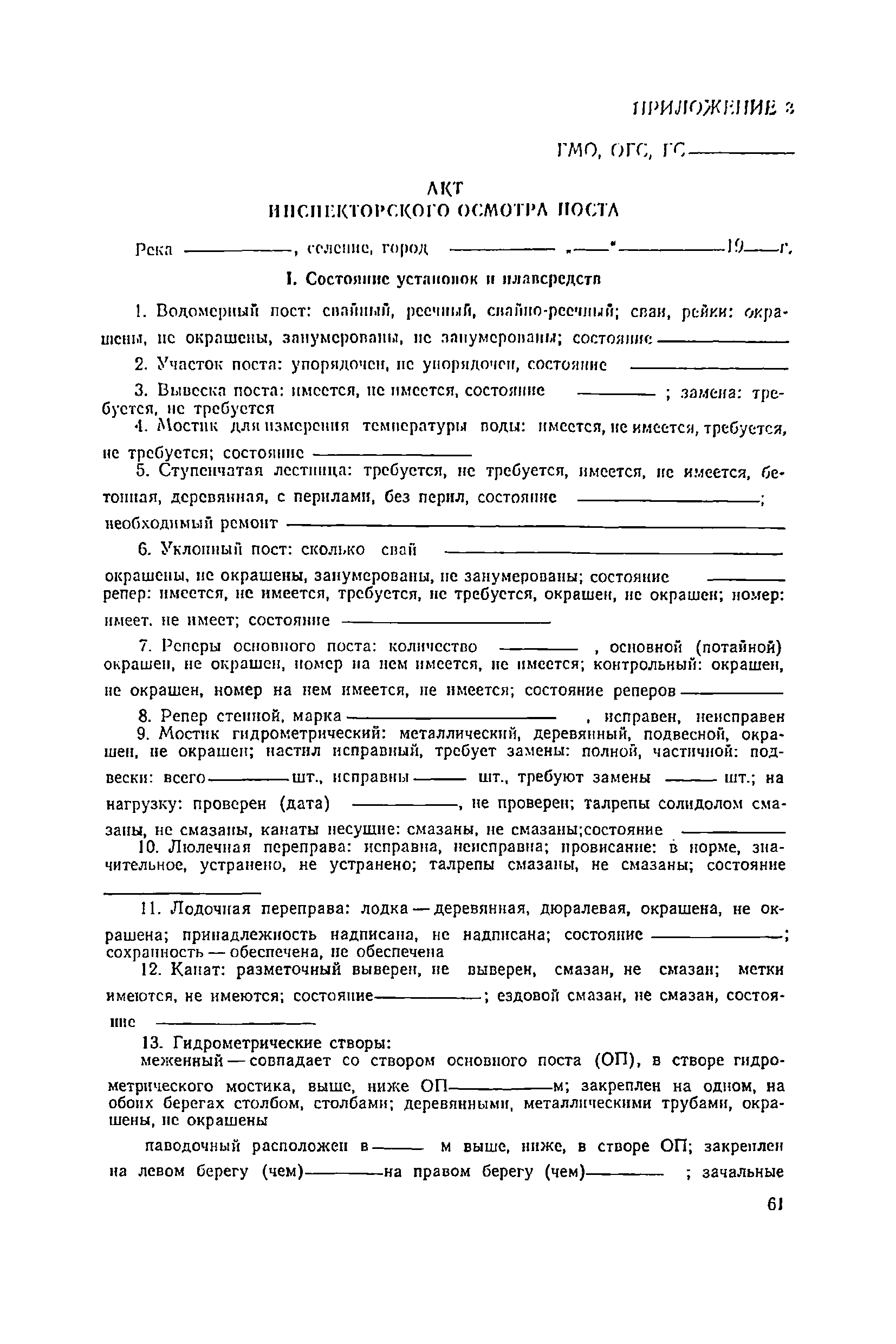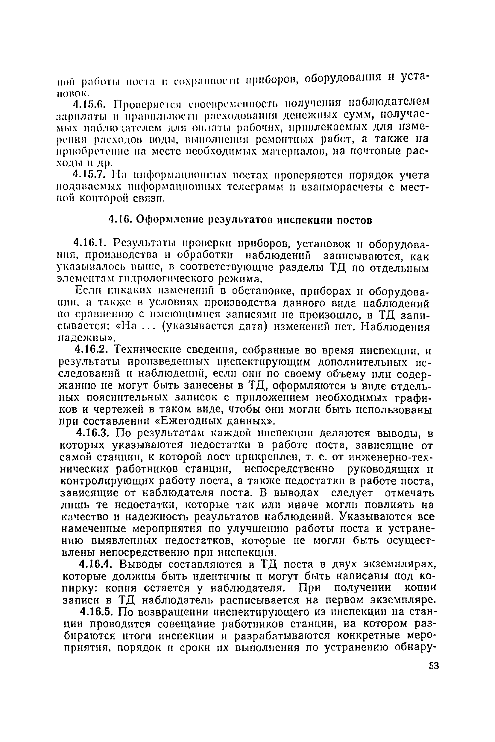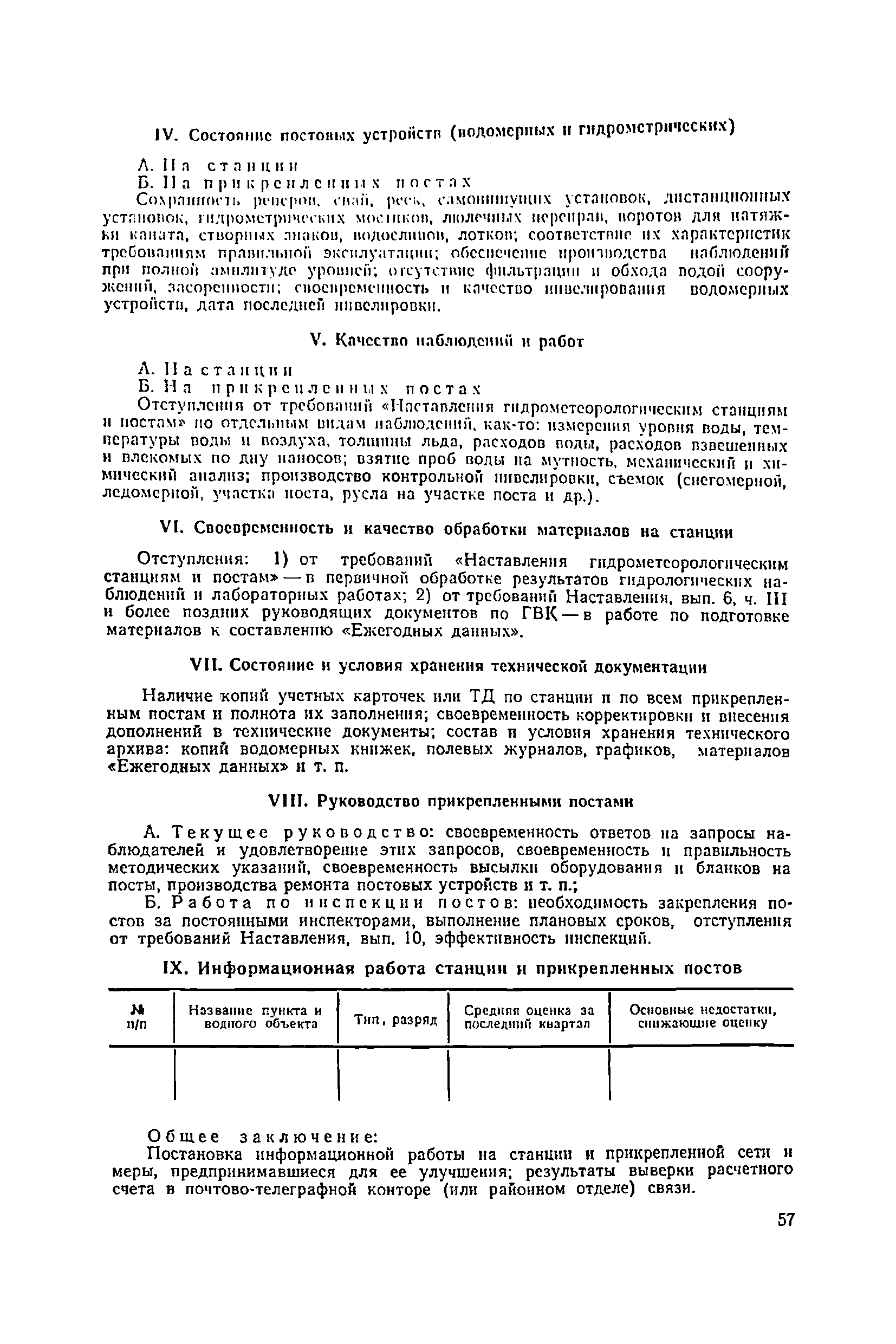 Наставление гидрометеорологическим станциям и постам. Выпуск 10. Инспекции гидрометеорологических станций и постов. Часть II. Инспекция гидрологических станций и постов| Статус: | действует | | Название рус.: | Наставление гидрометеорологическим станциям и постам. Выпуск 10. Инспекции гидрометеорологических станций и постов. Часть II. Инспекция гидрологических станций и постов | | Дата добавления в базу: | 01.02.2020 | | Дата актуализации: | 01.01.2021 | | Дата введения: | 01.01.1981 | | Область применения: | Документ является пособием для работников сети, обеспечивающих текущий контроль и надзор за работой станций и прикрепленных к станциям постов в период между инспекциями | | Оглавление: | Предисловие 1 Общие положения 1.1 Задачи инспекций станций и постов 1.2 Виды и сроки инспекций 1.3 Инспекция ведомственных постов (станций) 1.4 Состав инспектирующих 1.5 Обязанности и права инспектирующих 1.6 Этапы проведения инспекций и контроль за выполнением предложений инспектирующих 2 Подготовка к инспекции станции 2.1 Состав подготовительных работ 2.2 Рекомендации по проведению подготовительных работ 3 Проведение инспекция гидрологических и озерных станций 3.1 Проверка выполнения гидрологической станцией плана работ и руководства постами 3.2 Проверка работы озерной станции по производству наблюдений и руководству постами 3.3 Проверка технического и метрологического обеспечения работ станций 3.4 Проверка работ по обработке и подготовке к печати материалов наблюдений 3.5 Проверка состояния работ по гидрометеорологическому обеспечению народнохозяйственных организаций 3.6 Проверка выполнения методических и научно-исследовательских работ 3.7 Проверка организации труда на станции и ее хозяйственно-финансовой деятельности 3.8 Подведение итогов и оформление результатов инспекция 4 Инспекция гидрологических постов 4.1 Подготовка к инспекции постов. Ознакомление с Техническим делом 4.2 Виды работ при инспекции поста 4.3 Обследование водного объекта на участке поста 4.4 Проверка топографо-геодезического обоснования поста 4.5 Проверка наблюдений за уровнем воды и уклоном водной поверхности 4.6 Проверка наблюдений за температурой воды и воздуха 4.7 Проверка наблюдений за ледовой обстановкой и измерений толщины льда 4.8 Проверка наблюдений за водной растительностью, ветром, волнением и другими явлениями 4.9 Проверка работы по учету стока воды 4.10 Особенности инспекция постов, учитывающих сток в створах гидротехнических сооружений 4.11 Проверка работы по учету стока наносов 4.12 Проверка работ по организации и проведению наблюдений и контроля за загрязнением поверхностных вод суши в системе ОГСНК 4.13 Проверка работ озерного гидрологического поста на рейдовой вертикали 4.14 Проверка информационной работы постов 4.15 Общие вопросы инспекции постов 4.16 Оформление результатов инспекции постов Приложение 1. Схема акта инспекции гидрологических станций Приложение 2. Перечень основных дел (папок) и журналов, которые должны вестись на гидрологических станциях 1 разряда Приложение 3. Акт Инспекторского осмотра поста | | Разработан: | ФГБУ ВНИИСХМ