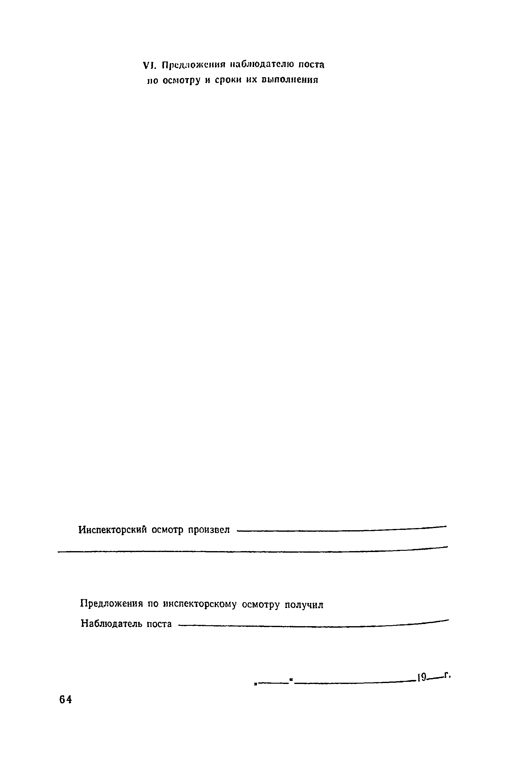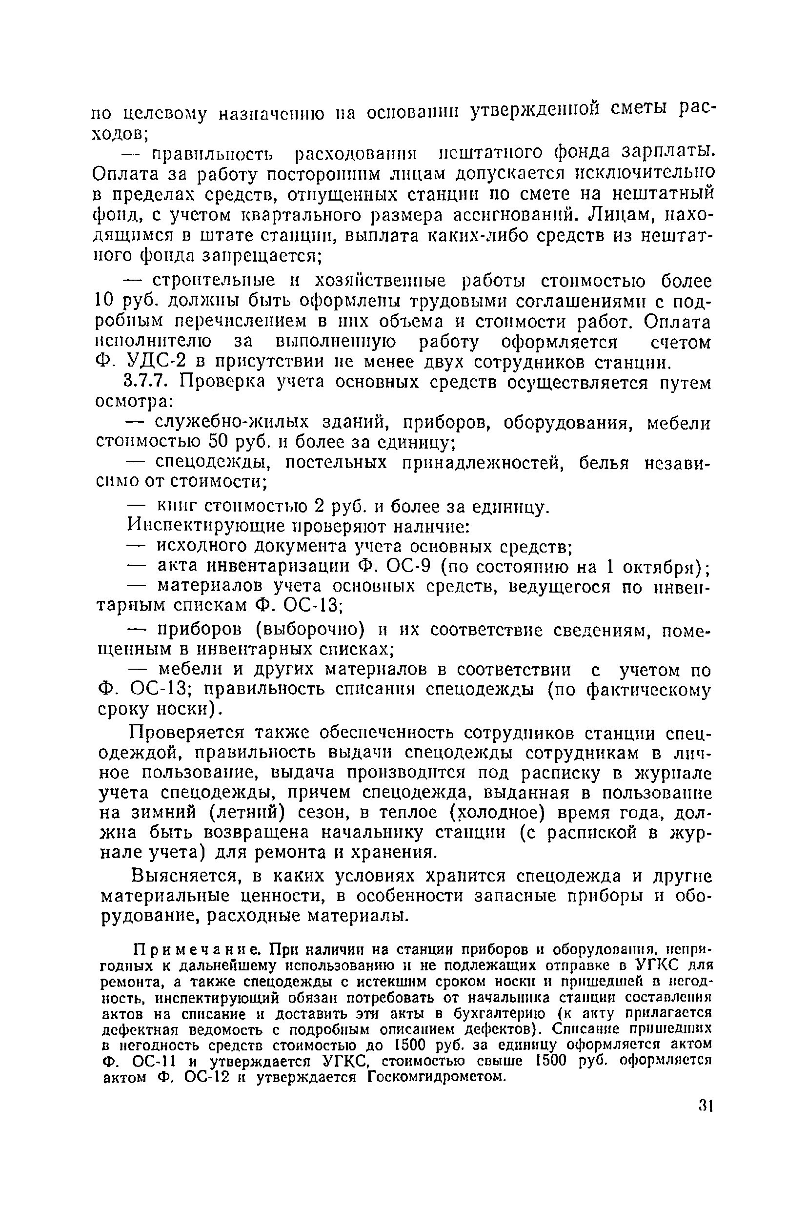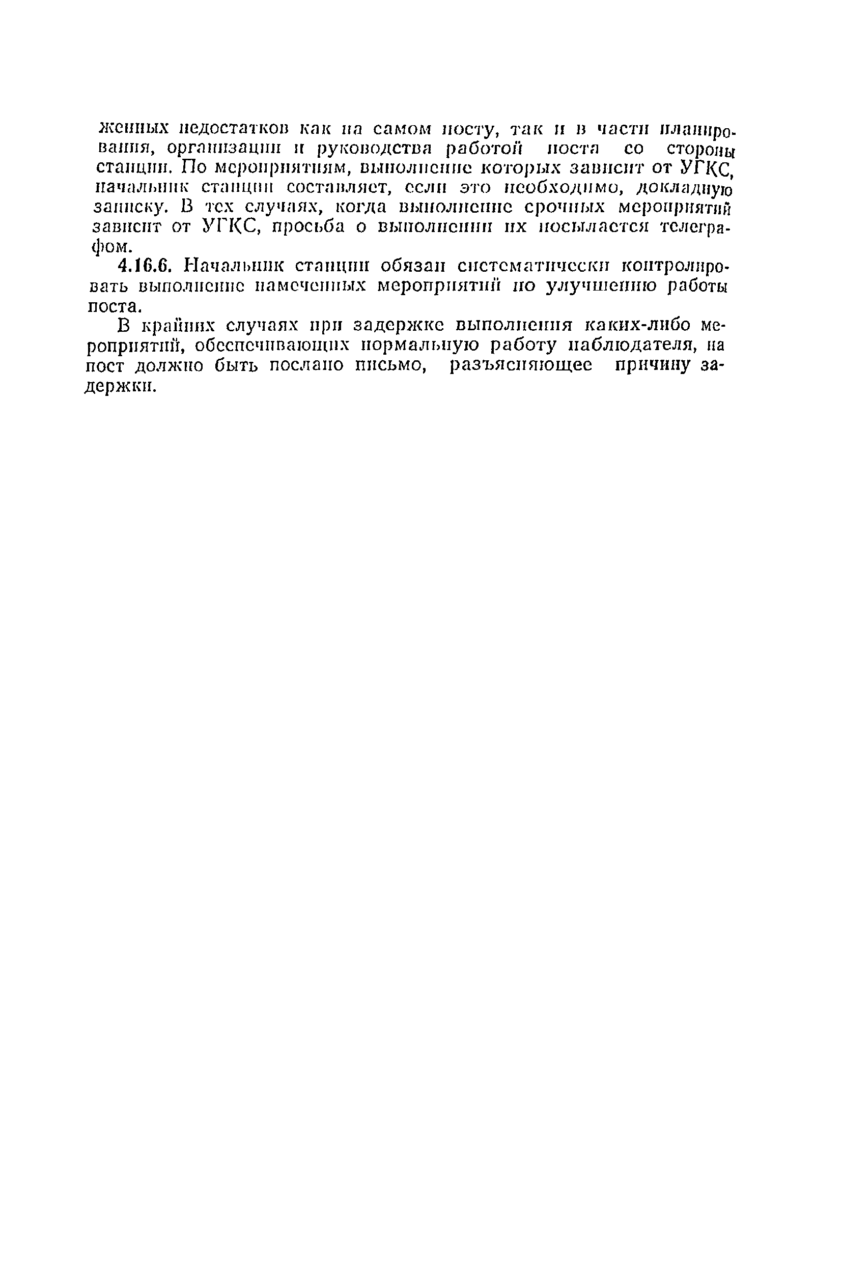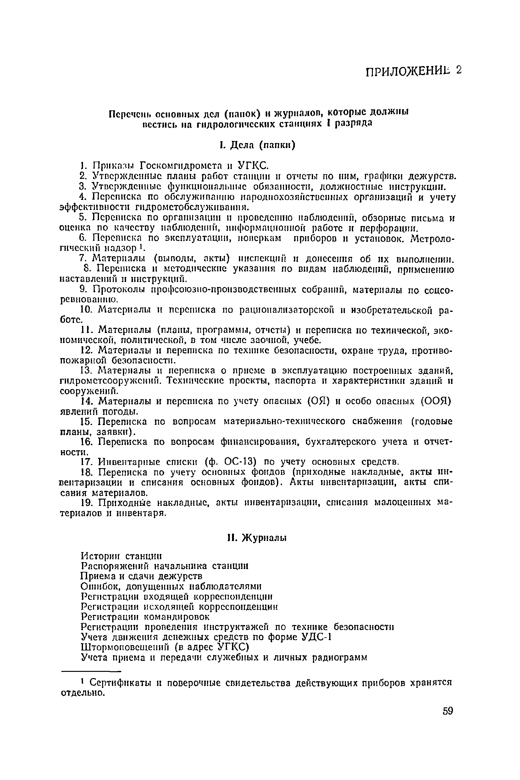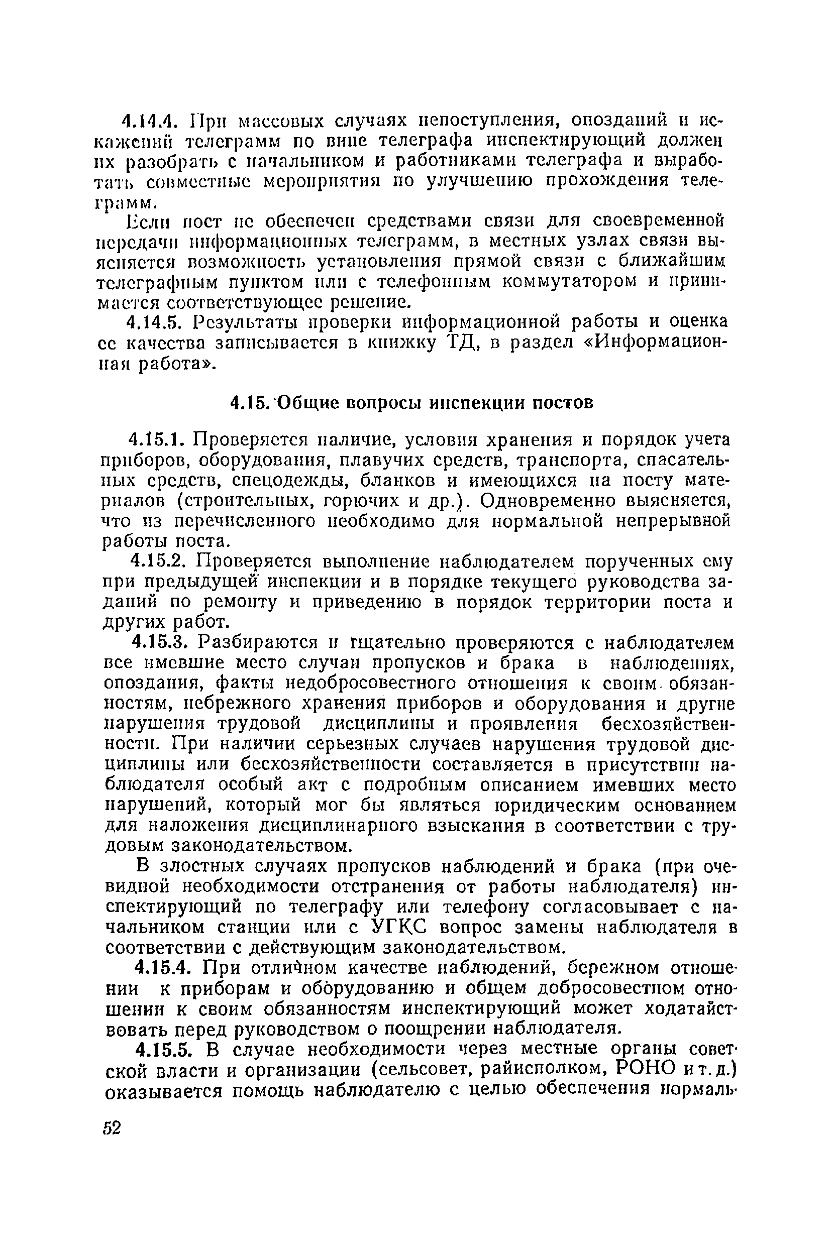 Наставление гидрометеорологическим станциям и постам. Выпуск 10. Инспекции гидрометеорологических станций и постов. Часть II. Инспекция гидрологических станций и постов| Статус: | действует | | Название рус.: | Наставление гидрометеорологическим станциям и постам. Выпуск 10. Инспекции гидрометеорологических станций и постов. Часть II. Инспекция гидрологических станций и постов | | Дата добавления в базу: | 01.02.2020 | | Дата актуализации: | 01.01.2021 | | Дата введения: | 01.01.1981 | | Область применения: | Документ является пособием для работников сети, обеспечивающих текущий контроль и надзор за работой станций и прикрепленных к станциям постов в период между инспекциями | | Оглавление: | Предисловие 1 Общие положения 1.1 Задачи инспекций станций и постов 1.2 Виды и сроки инспекций 1.3 Инспекция ведомственных постов (станций) 1.4 Состав инспектирующих 1.5 Обязанности и права инспектирующих 1.6 Этапы проведения инспекций и контроль за выполнением предложений инспектирующих 2 Подготовка к инспекции станции 2.1 Состав подготовительных работ 2.2 Рекомендации по проведению подготовительных работ 3 Проведение инспекция гидрологических и озерных станций 3.1 Проверка выполнения гидрологической станцией плана работ и руководства постами 3.2 Проверка работы озерной станции по производству наблюдений и руководству постами 3.3 Проверка технического и метрологического обеспечения работ станций 3.4 Проверка работ по обработке и подготовке к печати материалов наблюдений 3.5 Проверка состояния работ по гидрометеорологическому обеспечению народнохозяйственных организаций 3.6 Проверка выполнения методических и научно-исследовательских работ 3.7 Проверка организации труда на станции и ее хозяйственно-финансовой деятельности 3.8 Подведение итогов и оформление результатов инспекция 4 Инспекция гидрологических постов 4.1 Подготовка к инспекции постов. Ознакомление с Техническим делом 4.2 Виды работ при инспекции поста 4.3 Обследование водного объекта на участке поста 4.4 Проверка топографо-геодезического обоснования поста 4.5 Проверка наблюдений за уровнем воды и уклоном водной поверхности 4.6 Проверка наблюдений за температурой воды и воздуха 4.7 Проверка наблюдений за ледовой обстановкой и измерений толщины льда 4.8 Проверка наблюдений за водной растительностью, ветром, волнением и другими явлениями 4.9 Проверка работы по учету стока воды 4.10 Особенности инспекция постов, учитывающих сток в створах гидротехнических сооружений 4.11 Проверка работы по учету стока наносов 4.12 Проверка работ по организации и проведению наблюдений и контроля за загрязнением поверхностных вод суши в системе ОГСНК 4.13 Проверка работ озерного гидрологического поста на рейдовой вертикали 4.14 Проверка информационной работы постов 4.15 Общие вопросы инспекции постов 4.16 Оформление результатов инспекции постов Приложение 1. Схема акта инспекции гидрологических станций Приложение 2. Перечень основных дел (папок) и журналов, которые должны вестись на гидрологических станциях 1 разряда Приложение 3. Акт Инспекторского осмотра поста | | Разработан: | ФГБУ ВНИИСХМ
