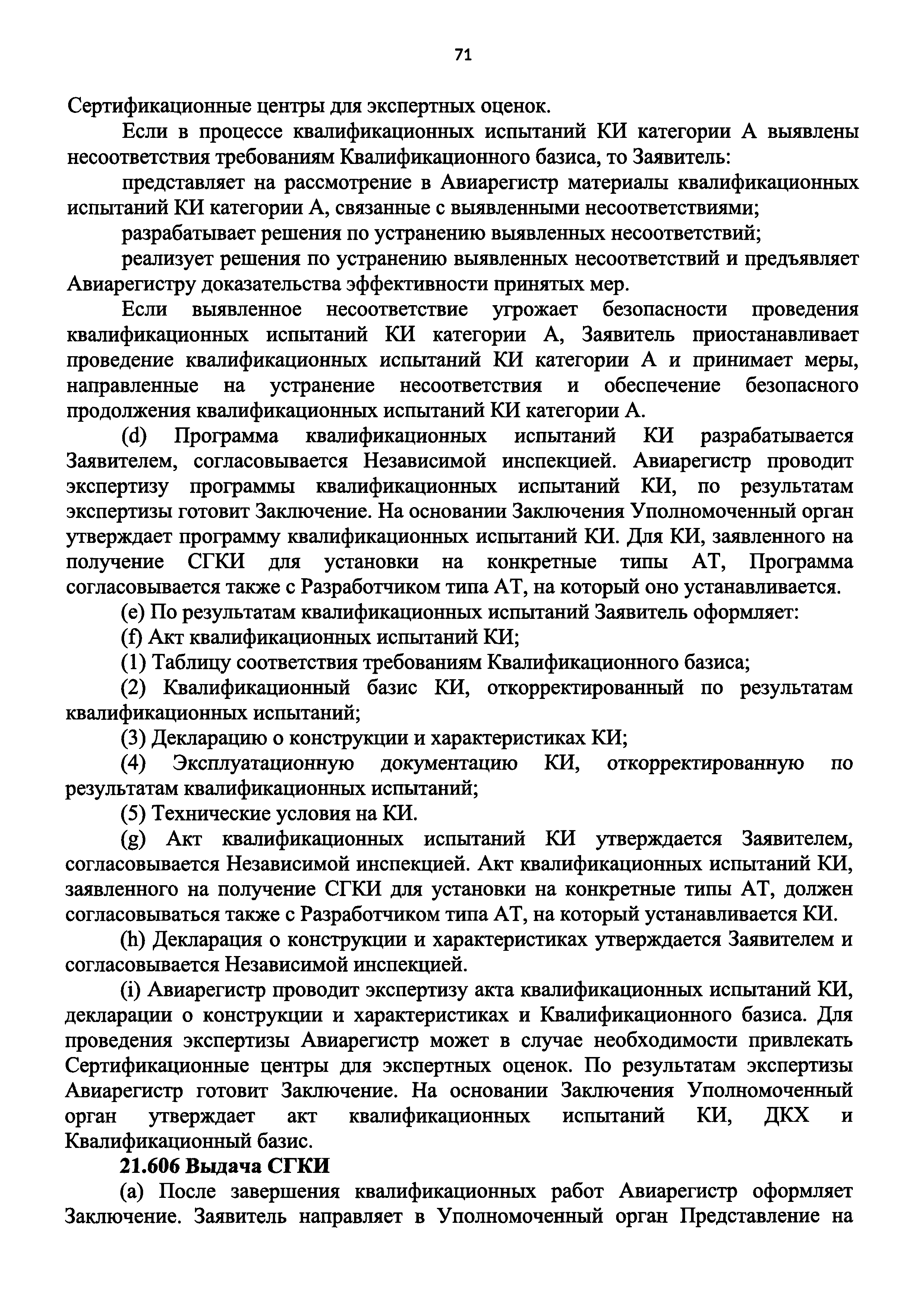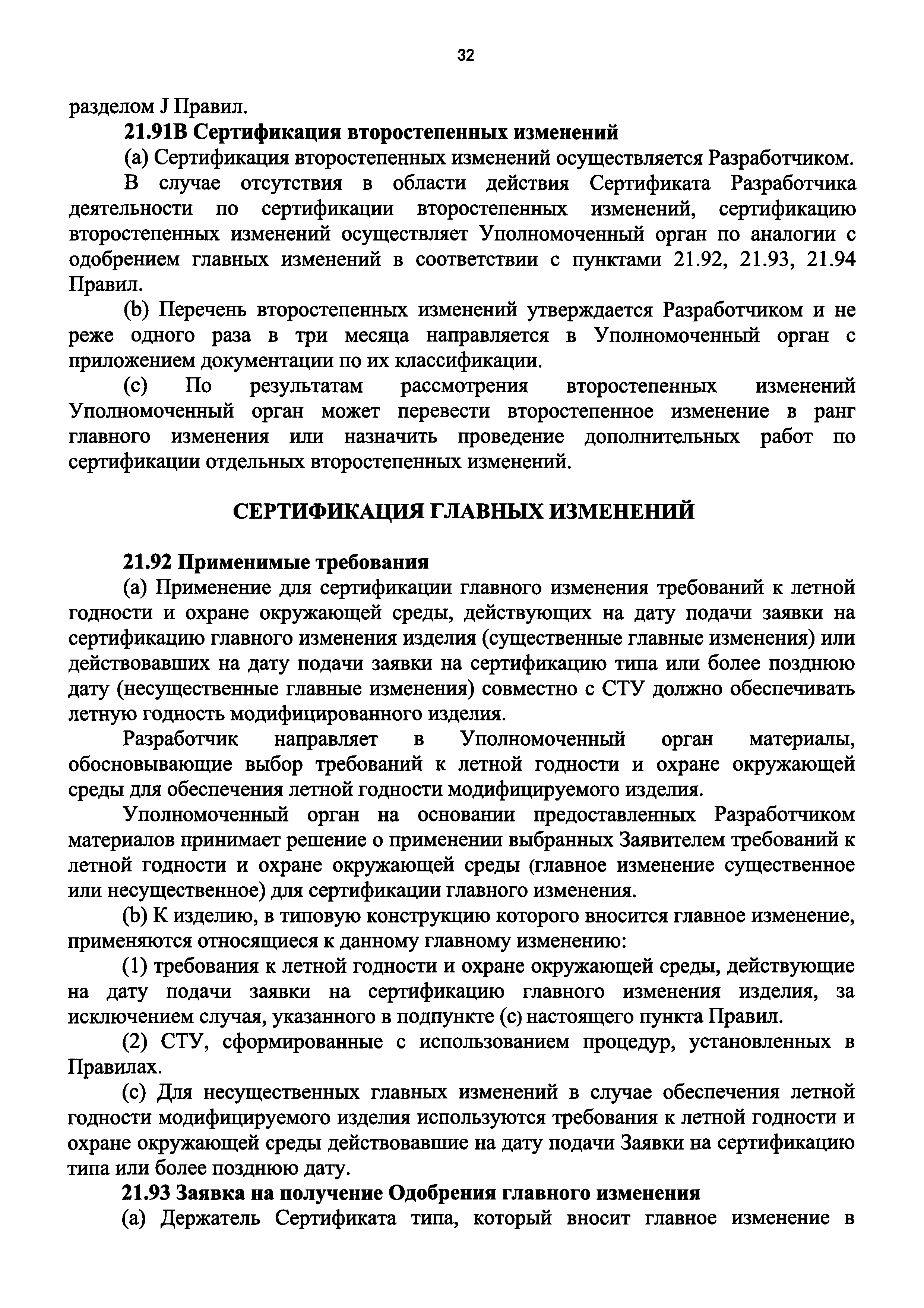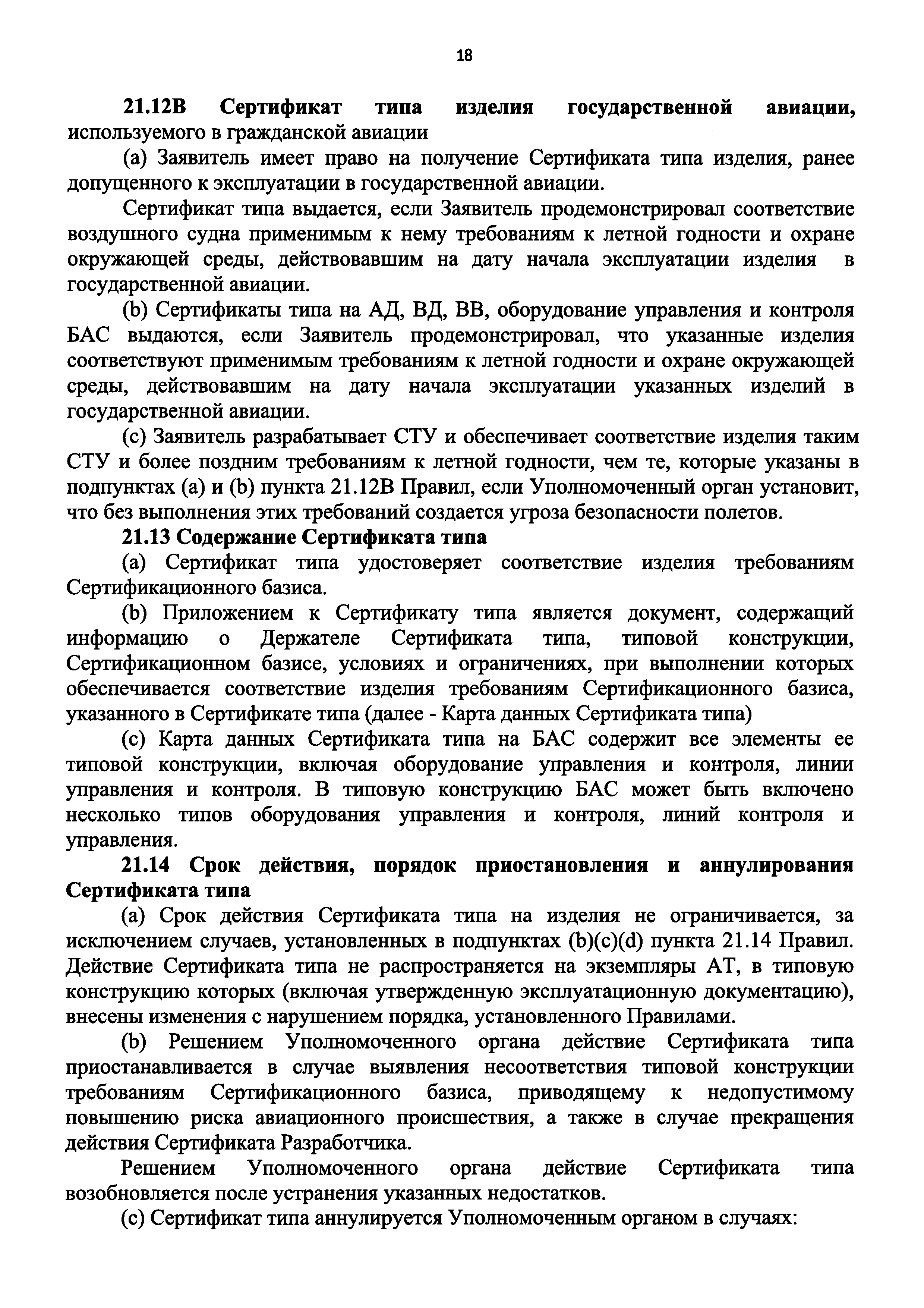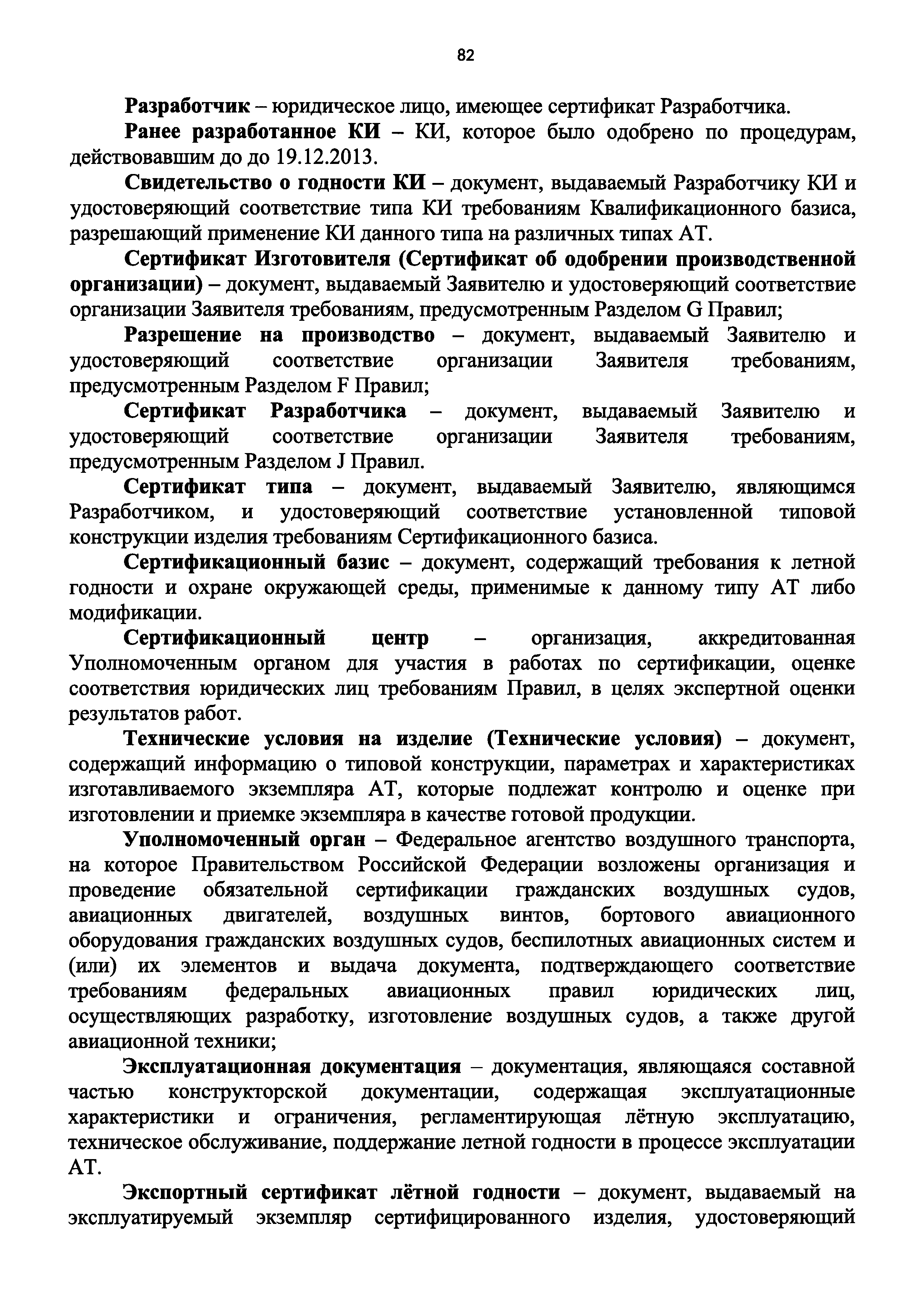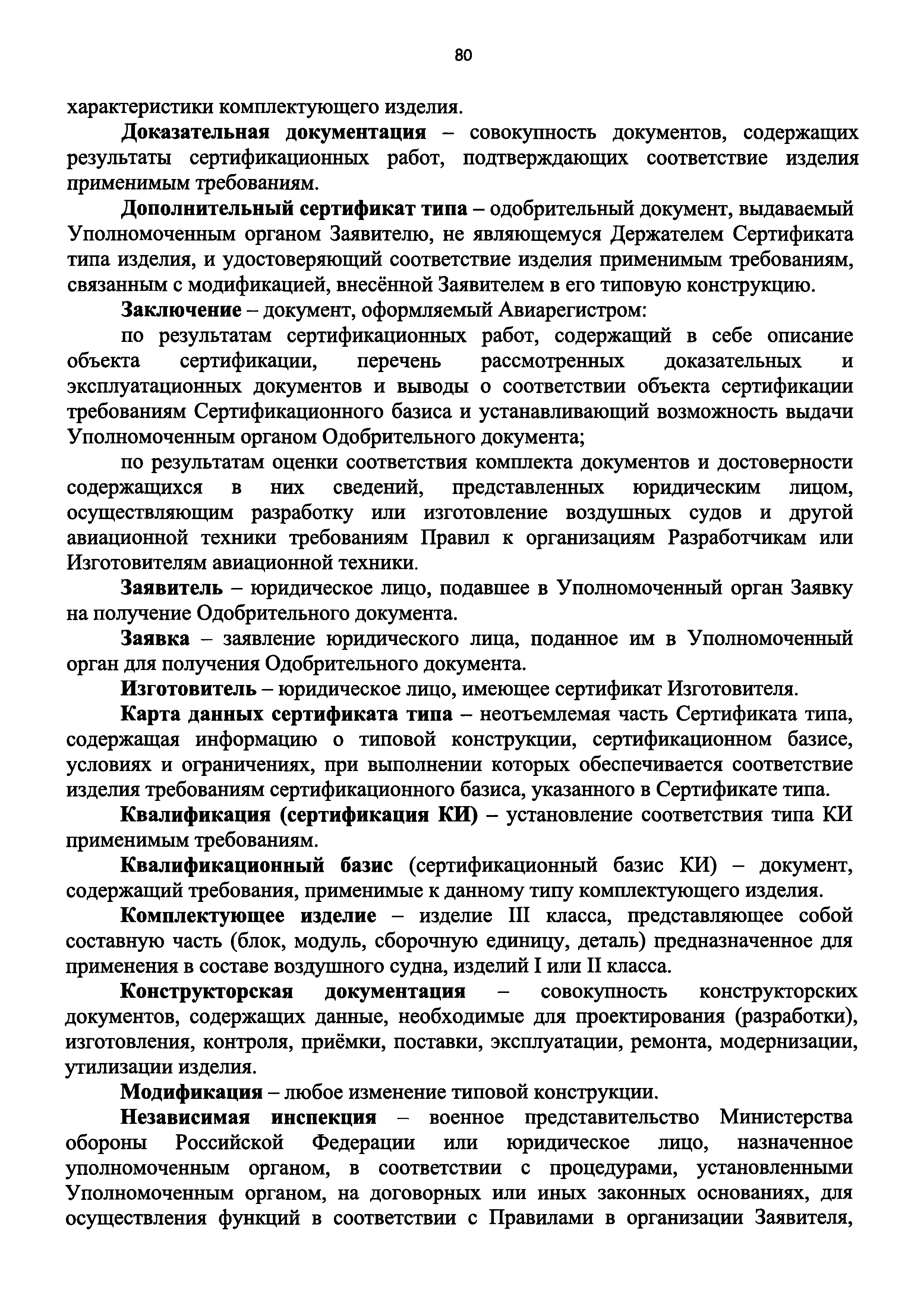 регулируют порядок взаимодействия участников процесса обязательной сертификации гражданских ВС и другой AT и подтверждения соответствия юридических лиц, осуществляющих разработку и изготовление ВС и другой AT требованиям Правил | | Оглавление: | Раздел А - Общие положения Раздел В - Сертификация авиационной техники Раздел D - Модификации типовой конструкции Раздел Е - Дополнительный сертификат типа Раздел F - Разрешение на производство на основании сертификата типа Раздел G - Сертификат одобрения производственной организации Раздел Н - Удостоверение о приемке Раздел J - Сертификат разработчика авиационной техники Раздел L - Сертификация экспортируемой авиационной техники Раздел N - Сертификация иностранных изделий, модификаций Раздел О - Квалификация комплектующих изделий Раздел Q - Идентификация изделий авиационной техники Приложение 1. Сертификат одобрения производственной организации Приложение 2. Сертификат разработчика авиационной техники Приложение 3. Сокращенные наименования | | Утверждён: | 17.06.2019 Министерство транспорта Российской Федерации (Russian Federation Ministry of Transportation 184)