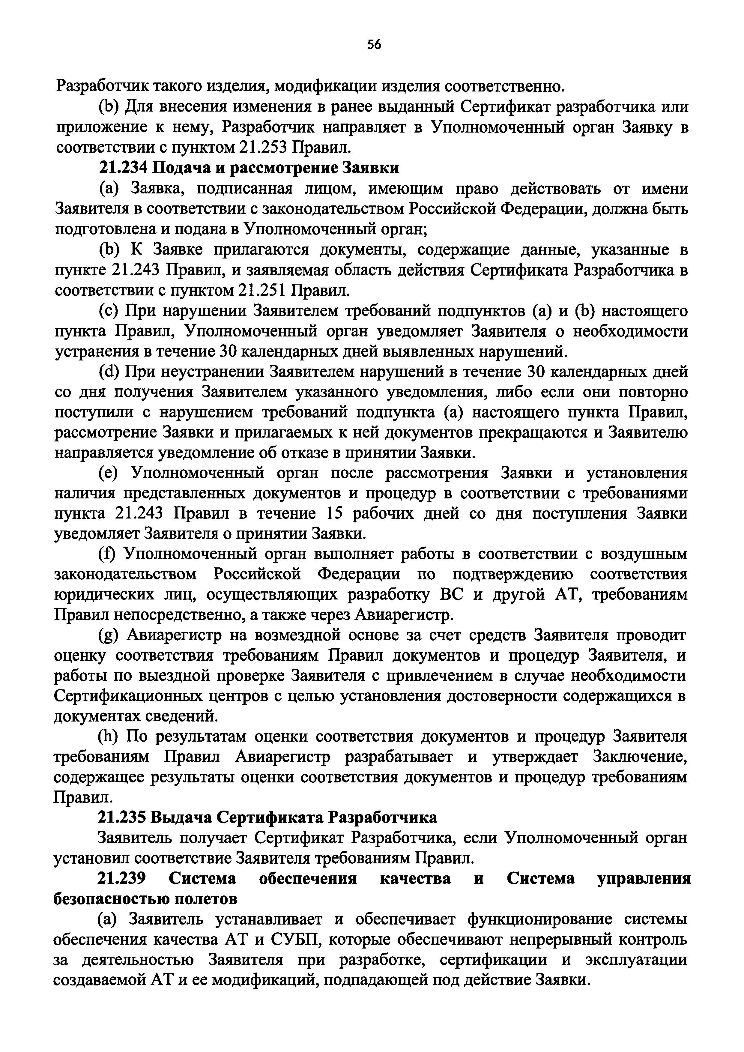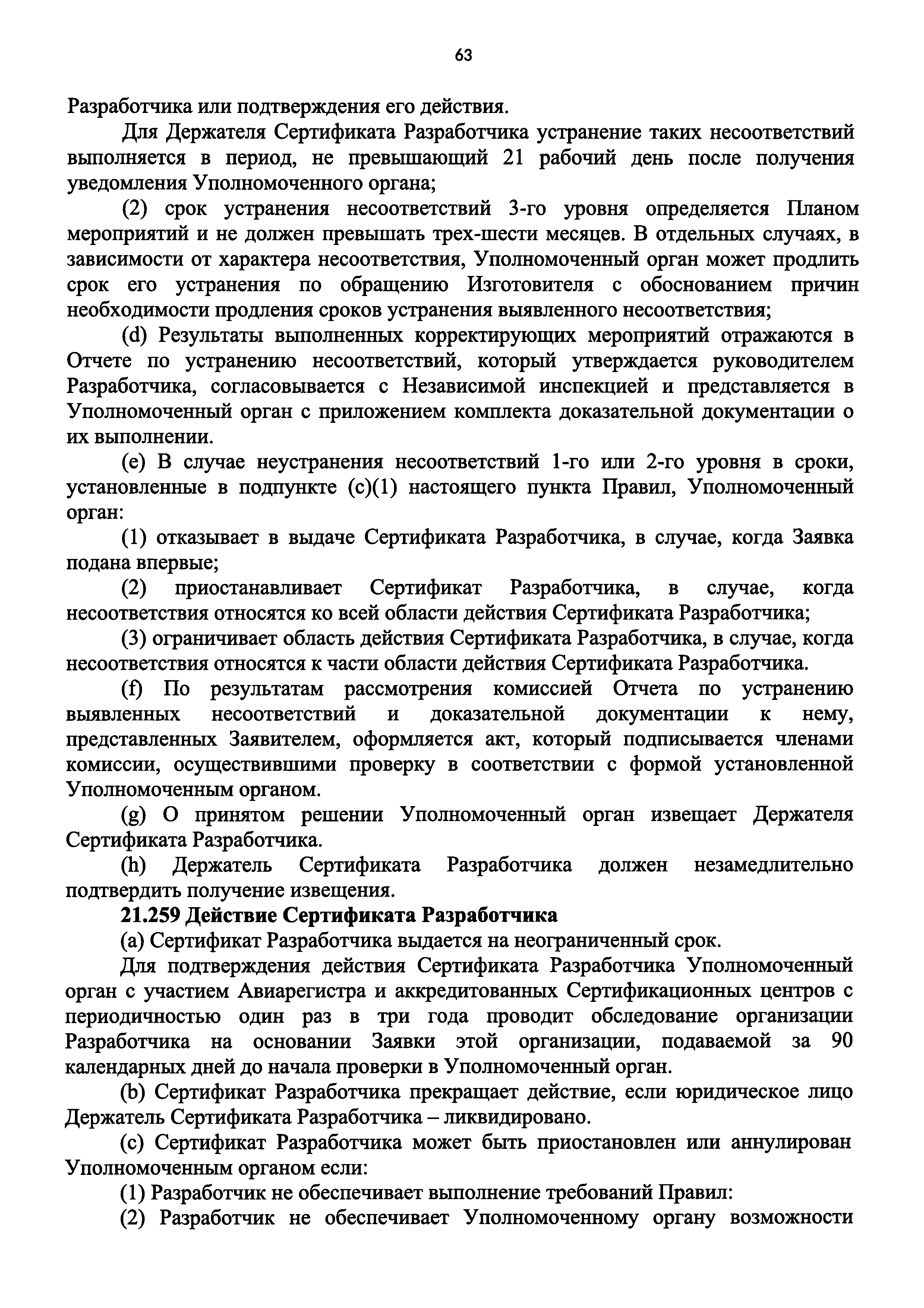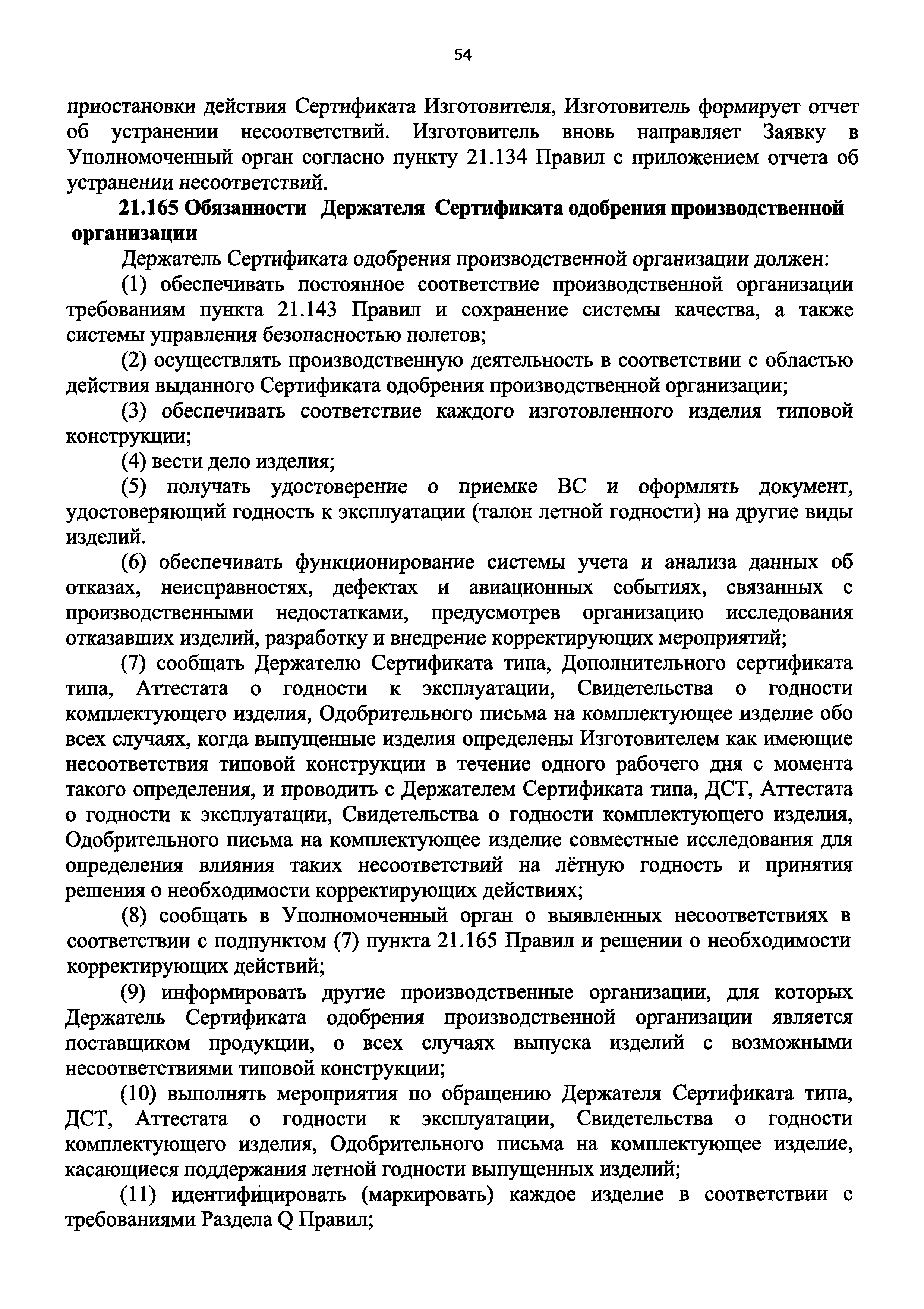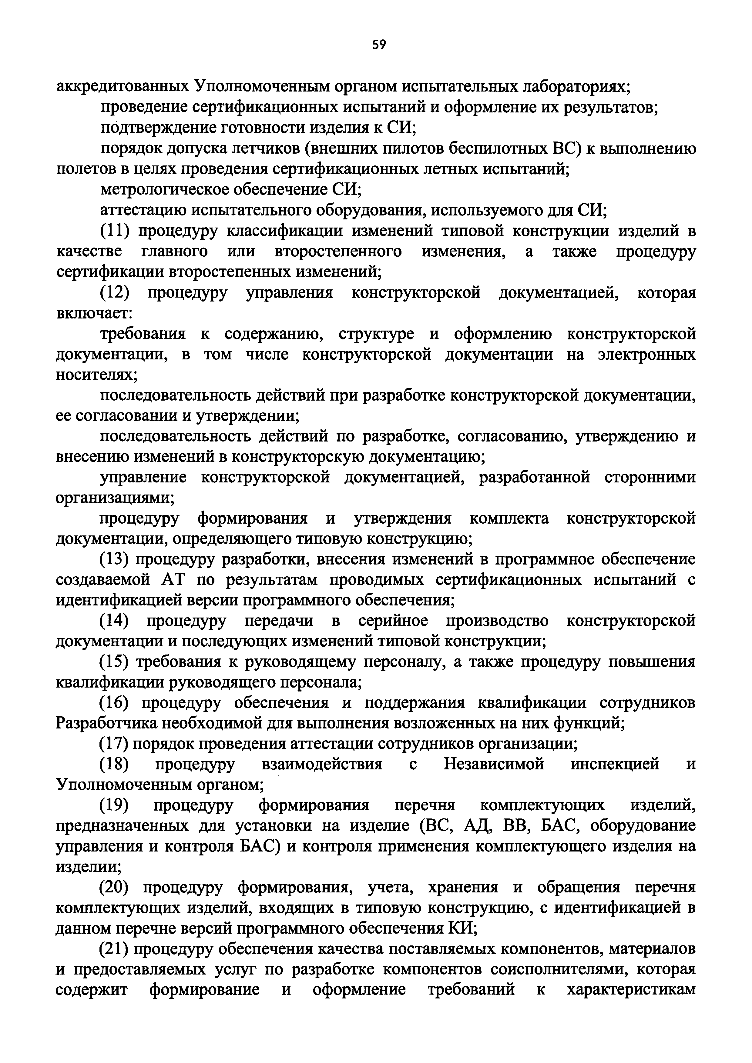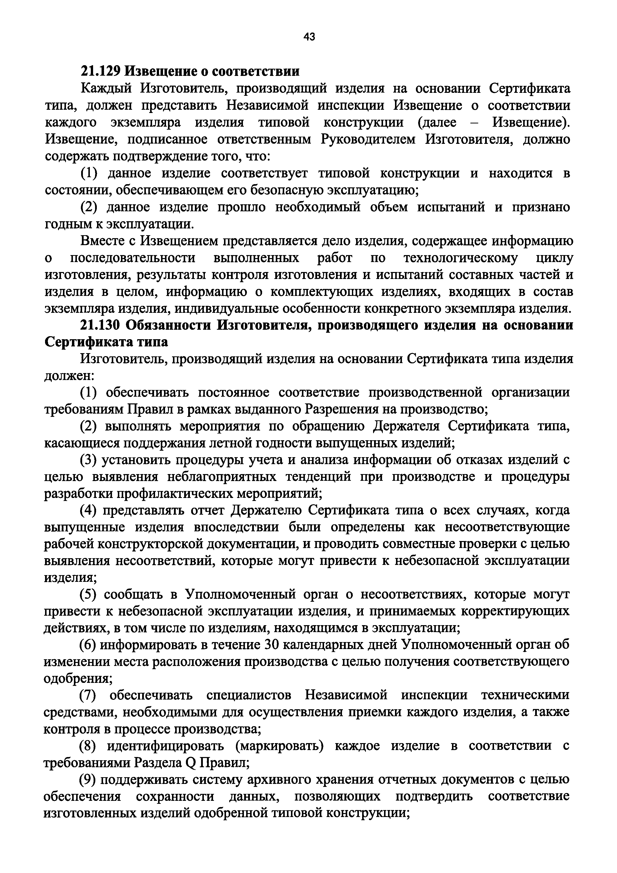 регулируют порядок взаимодействия участников процесса обязательной сертификации гражданских ВС и другой AT и подтверждения соответствия юридических лиц, осуществляющих разработку и изготовление ВС и другой AT требованиям Правил | | Оглавление: | Раздел А - Общие положения Раздел В - Сертификация авиационной техники Раздел D - Модификации типовой конструкции Раздел Е - Дополнительный сертификат типа Раздел F - Разрешение на производство на основании сертификата типа Раздел G - Сертификат одобрения производственной организации Раздел Н - Удостоверение о приемке Раздел J - Сертификат разработчика авиационной техники Раздел L - Сертификация экспортируемой авиационной техники Раздел N - Сертификация иностранных изделий, модификаций Раздел О - Квалификация комплектующих изделий Раздел Q - Идентификация изделий авиационной техники Приложение 1. Сертификат одобрения производственной организации Приложение 2. Сертификат разработчика авиационной техники Приложение 3. Сокращенные наименования | | Утверждён: | 17.06.2019 Министерство транспорта Российской Федерации (Russian Federation Ministry of Transportation 184)