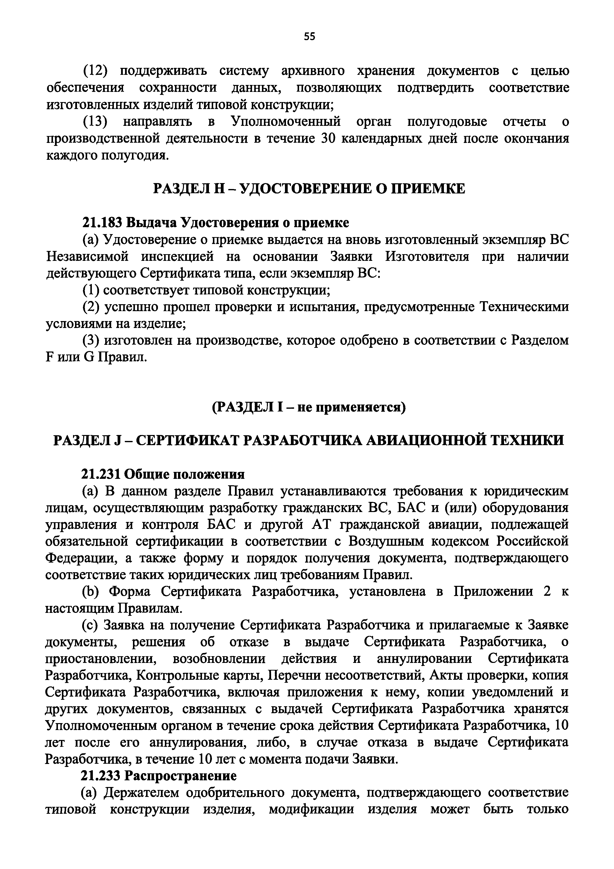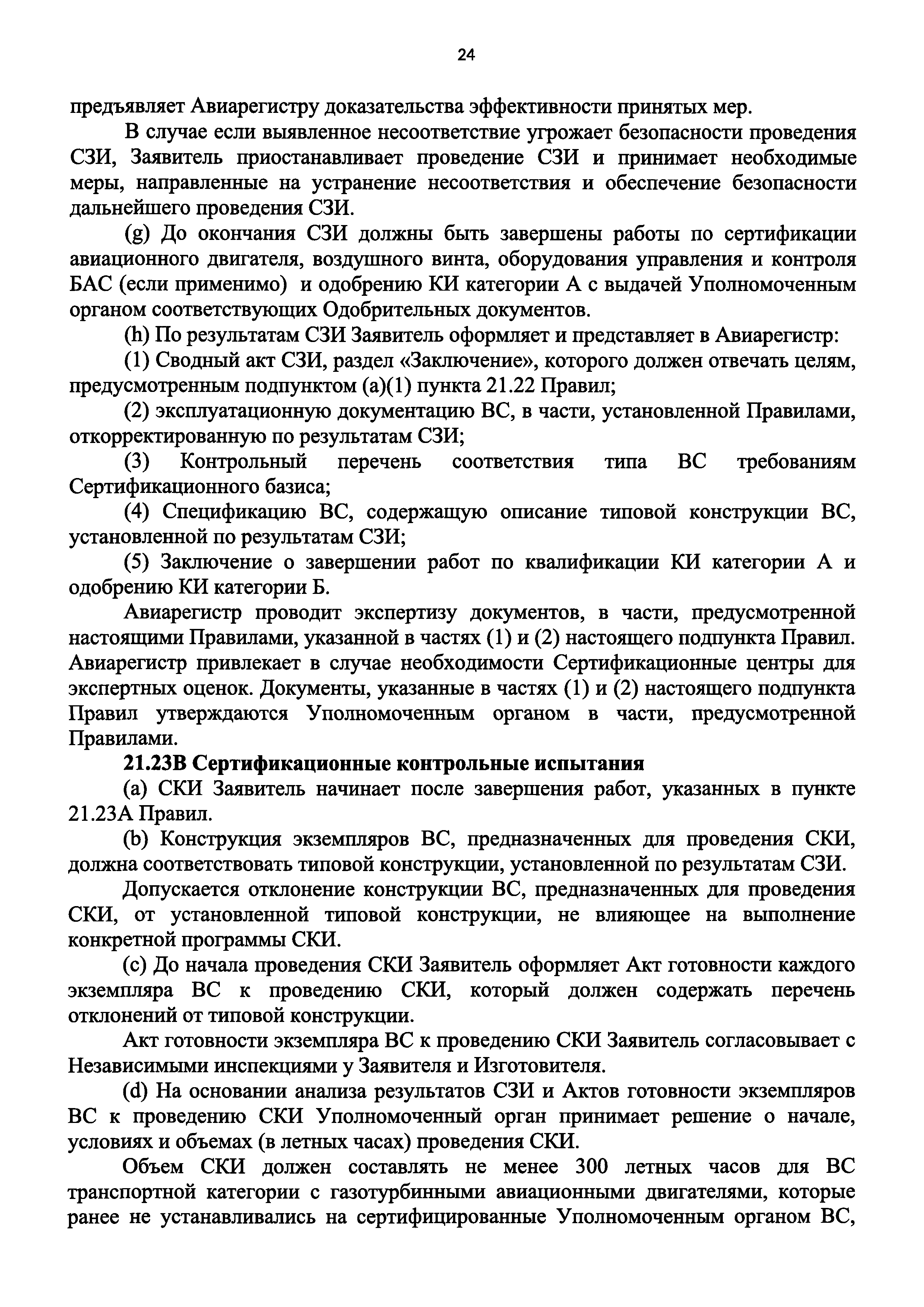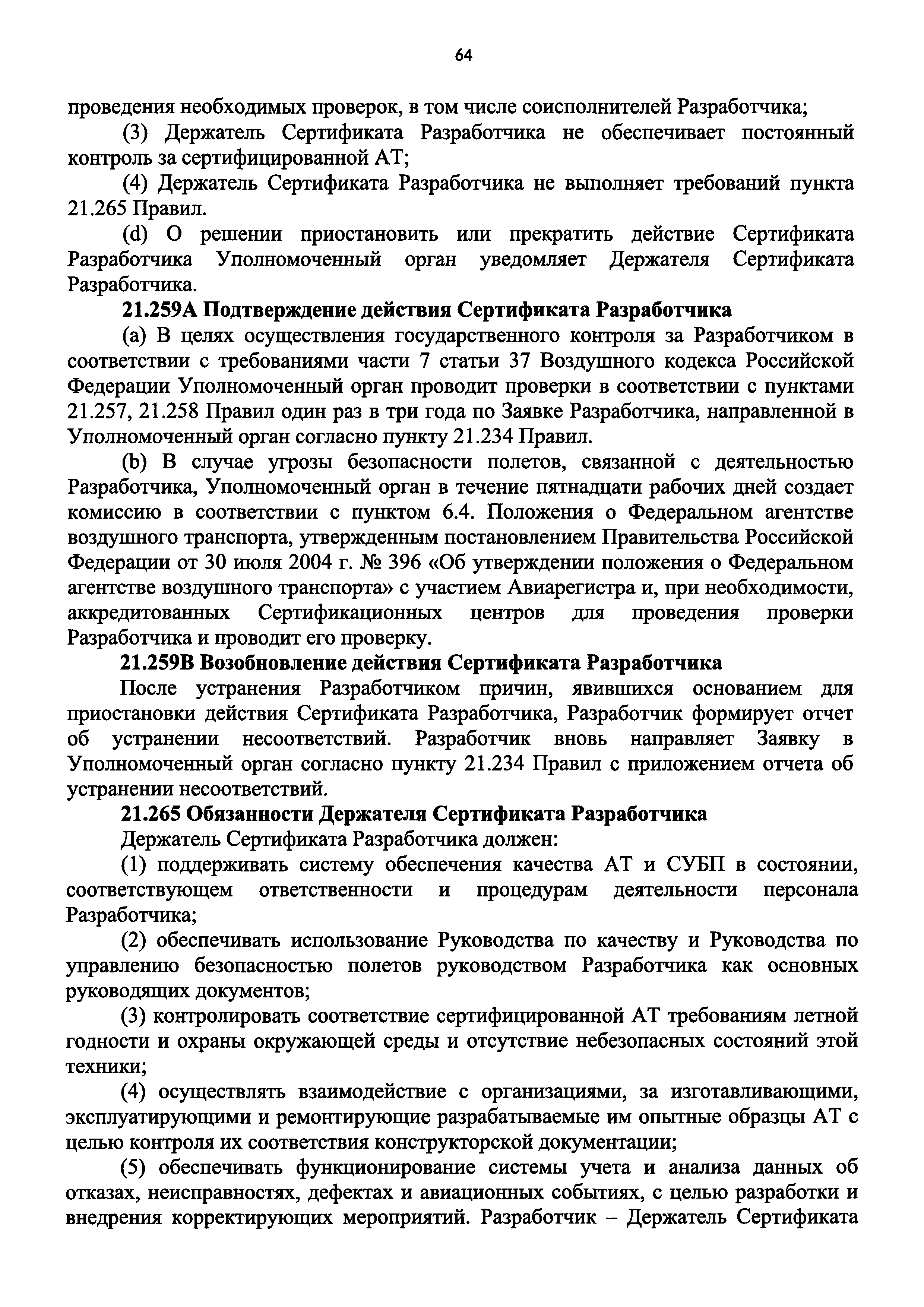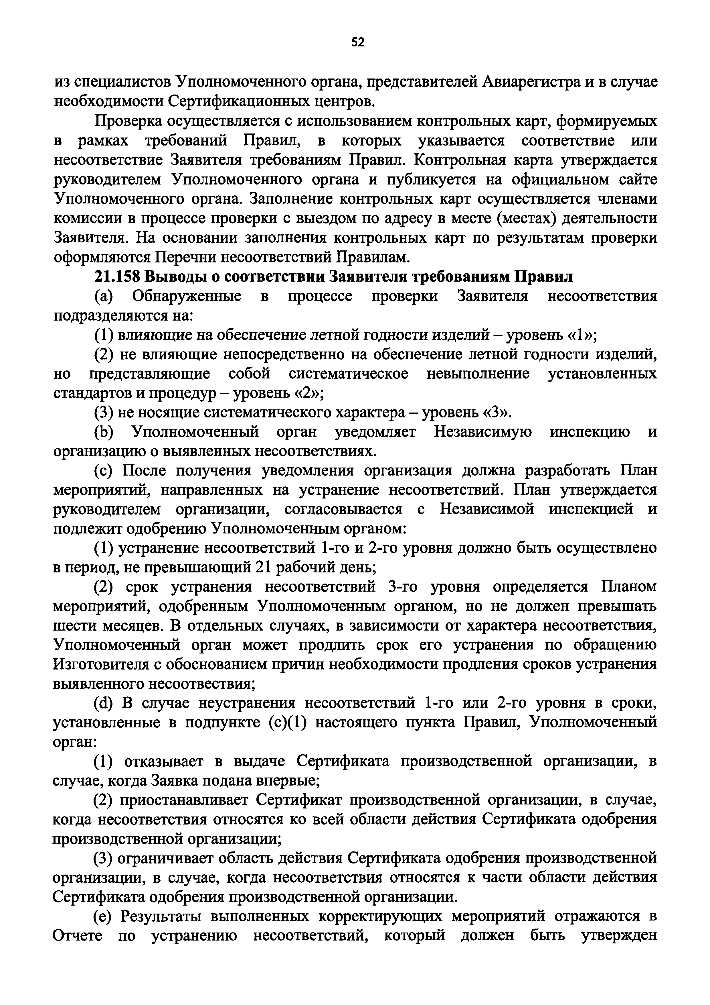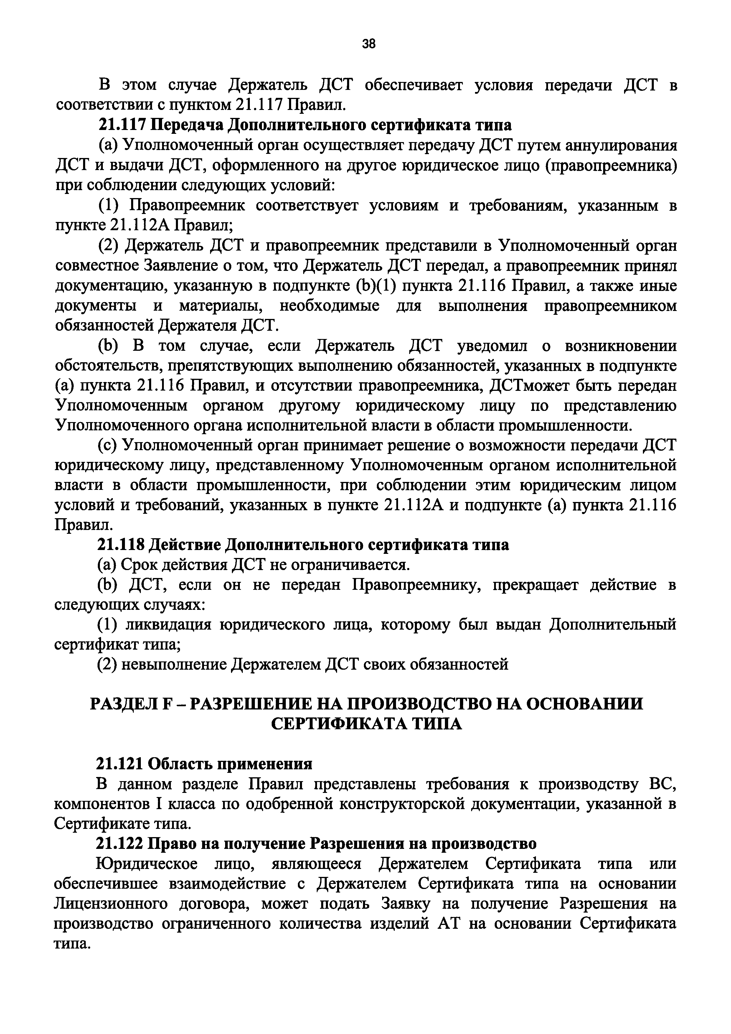 регулируют порядок взаимодействия участников процесса обязательной сертификации гражданских ВС и другой AT и подтверждения соответствия юридических лиц, осуществляющих разработку и изготовление ВС и другой AT требованиям Правил | | Оглавление: | Раздел А - Общие положения Раздел В - Сертификация авиационной техники Раздел D - Модификации типовой конструкции Раздел Е - Дополнительный сертификат типа Раздел F - Разрешение на производство на основании сертификата типа Раздел G - Сертификат одобрения производственной организации Раздел Н - Удостоверение о приемке Раздел J - Сертификат разработчика авиационной техники Раздел L - Сертификация экспортируемой авиационной техники Раздел N - Сертификация иностранных изделий, модификаций Раздел О - Квалификация комплектующих изделий Раздел Q - Идентификация изделий авиационной техники Приложение 1. Сертификат одобрения производственной организации Приложение 2. Сертификат разработчика авиационной техники Приложение 3. Сокращенные наименования | | Утверждён: | 17.06.2019 Министерство транспорта Российской Федерации (Russian Federation Ministry of Transportation 184)