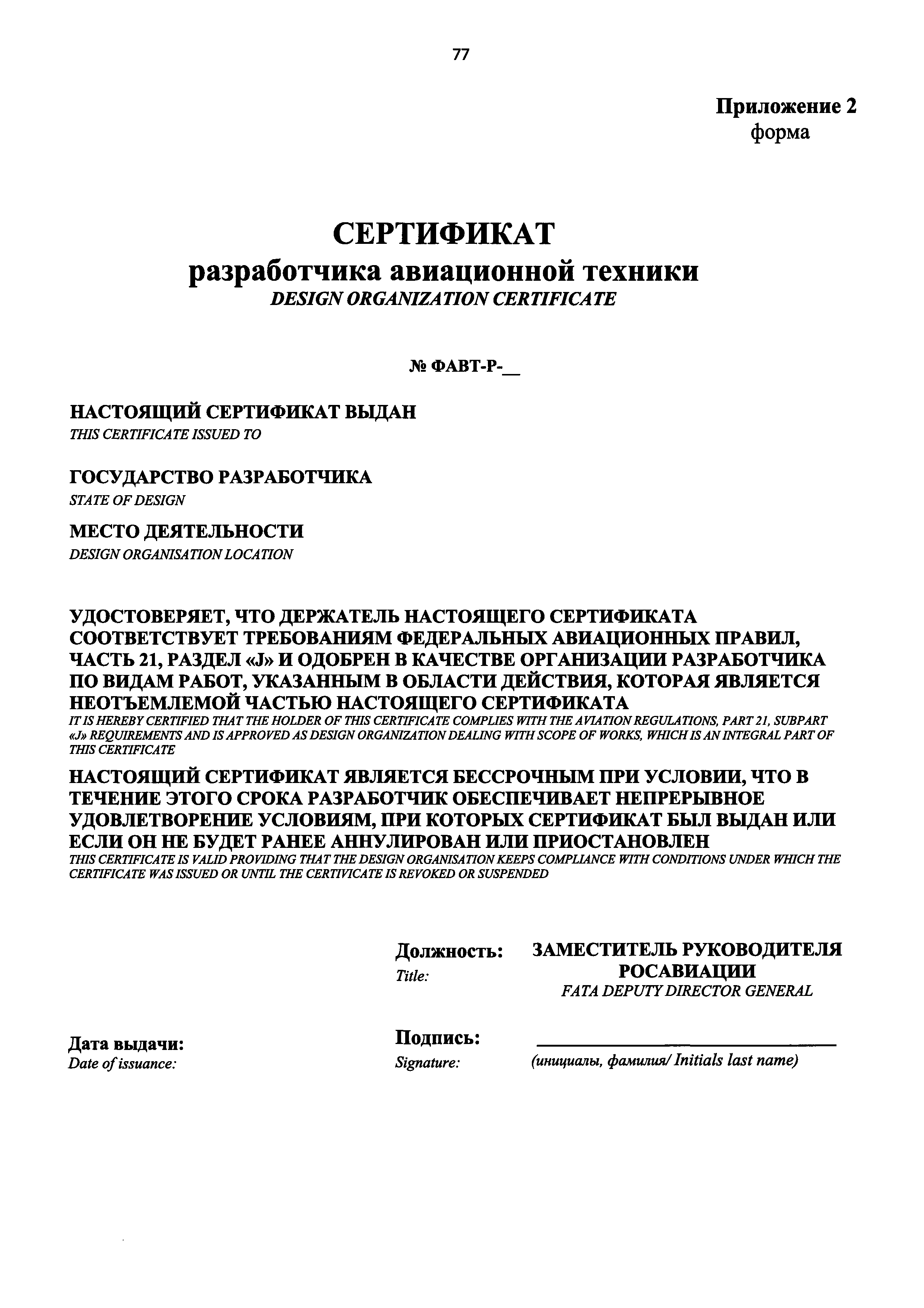 устанавливают форму и порядок получения документа, подтверждающего соответствие гражданских ВС и другой AT требованиям документа, содержащего требования к летной годности и охране окружающей среды, применимые к данному типу AT либо модификации, и юридических лиц требованиям Правил;
