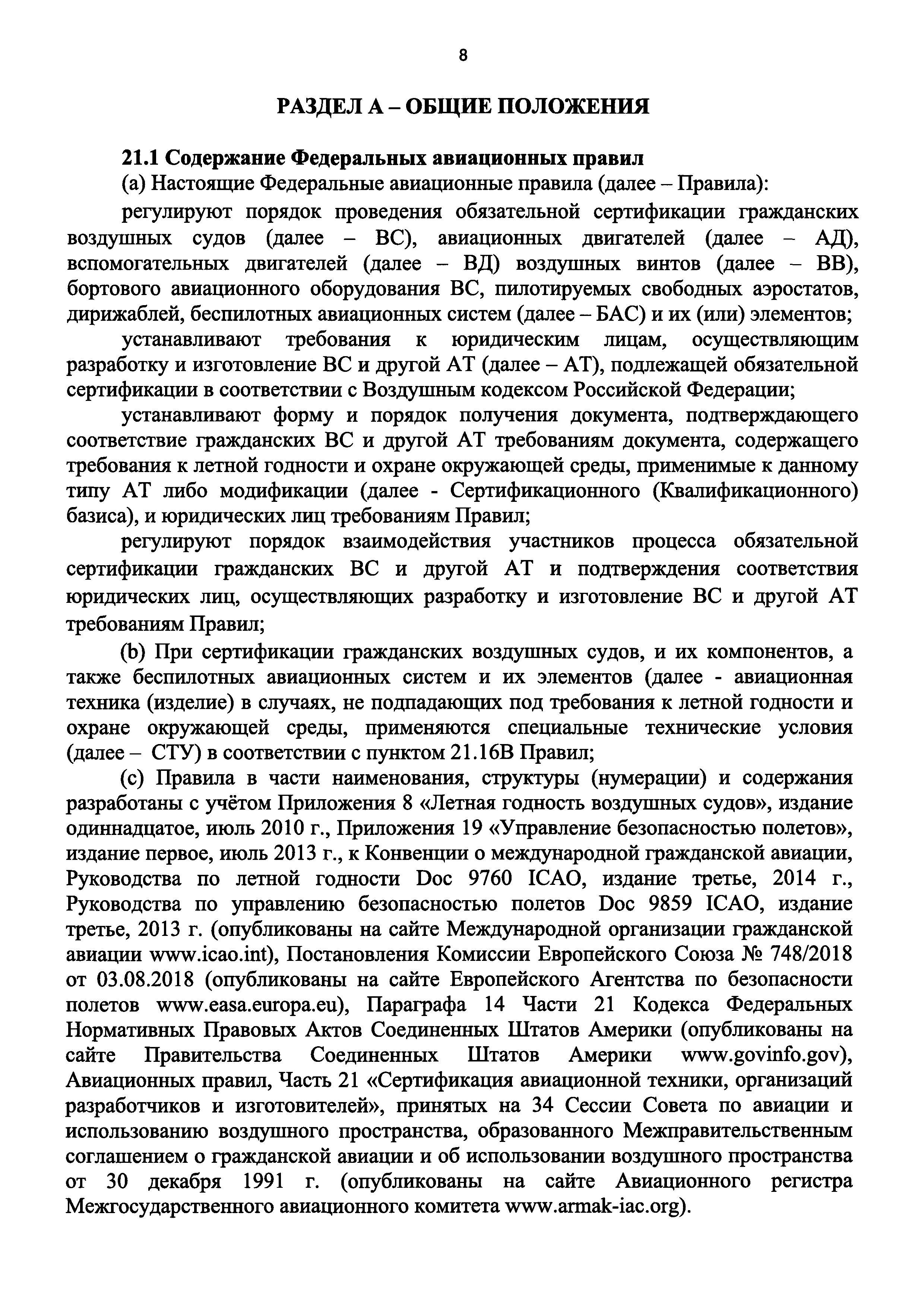 Федеральные авиационные правила "Сертификация авиационной техники, организаций разработчиков и изготовителей. Часть 21"| Статус: | действует | | Название рус.: | Федеральные авиационные правила "Сертификация авиационной техники, организаций разработчиков и изготовителей. Часть 21" | | Дата добавления в базу: | 01.02.2020 | | Дата актуализации: | 01.01.2021 | | Дата введения: | 08.12.2019 | | Область применения: | Федеральные авиационные правила:
