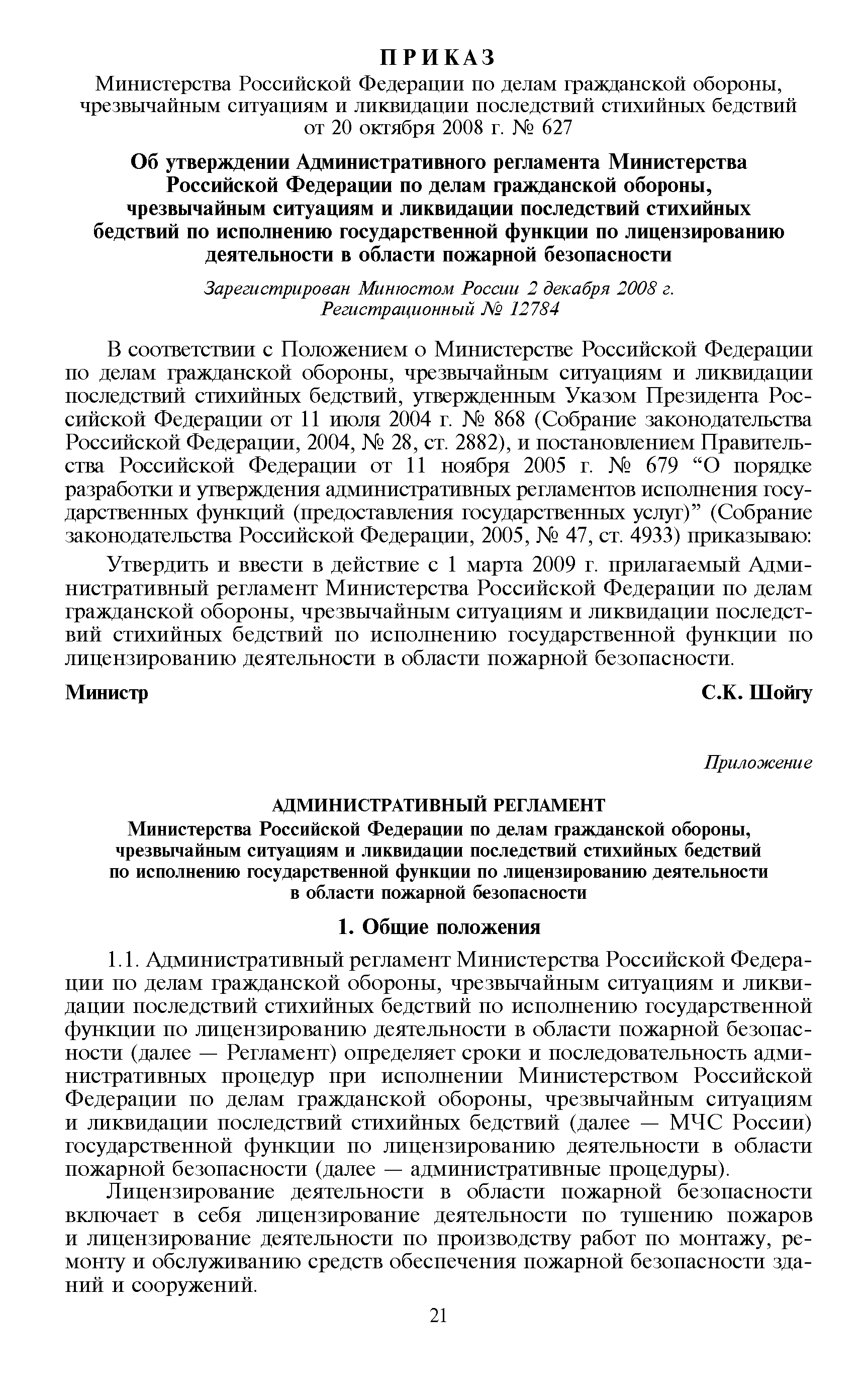| Область применения: | Административный регламент определяет сроки и последовательность административных процедур при исполнении Министерством Российской Федерации по делам гражданской обороны, чрезвычайным ситуациям и ликвидации последствий стихийных бедствий государственной функции по лицензированию деятельности в области пожарной безопасности |