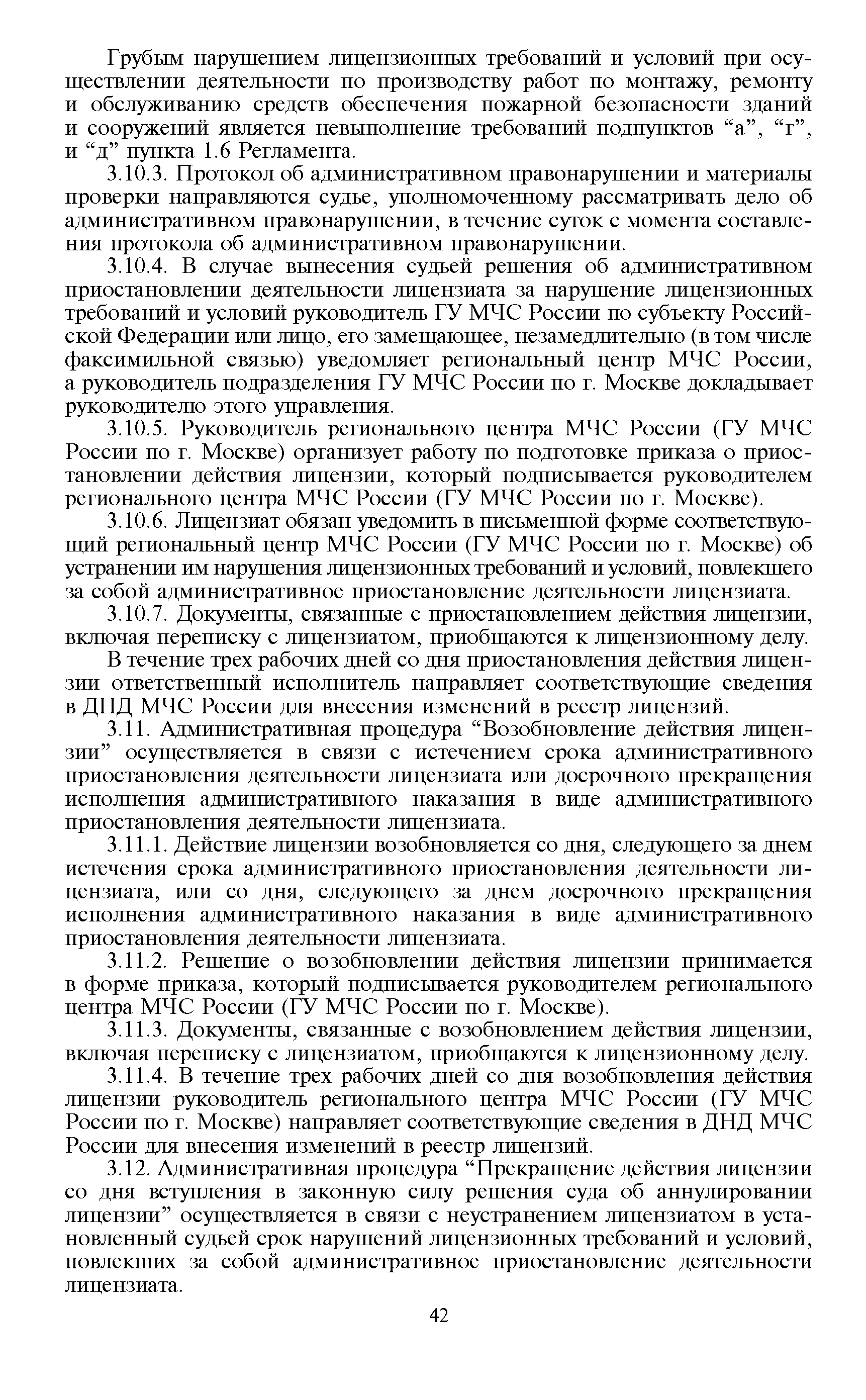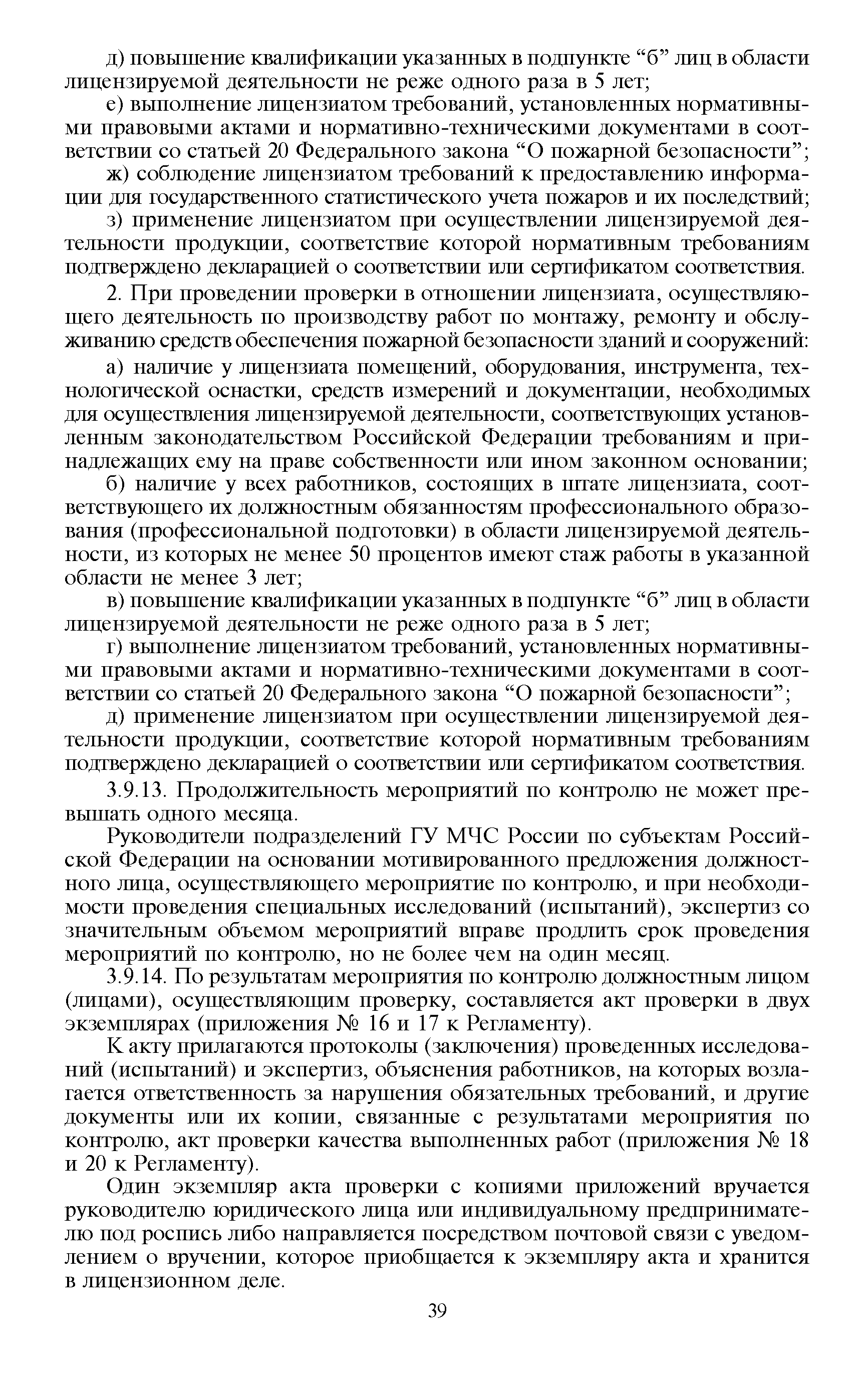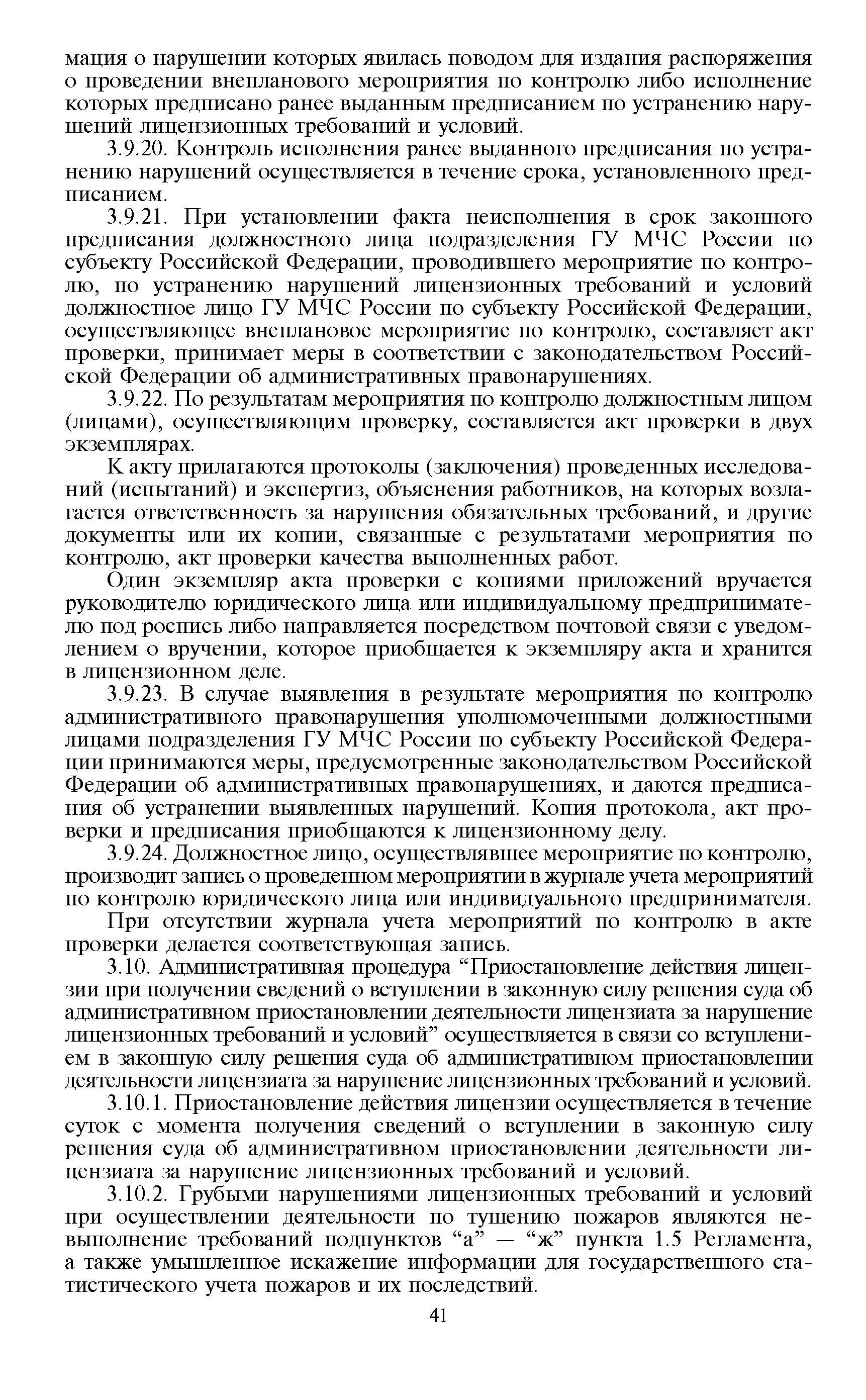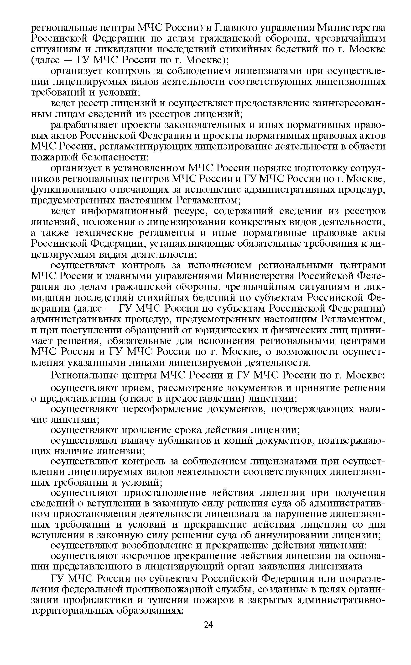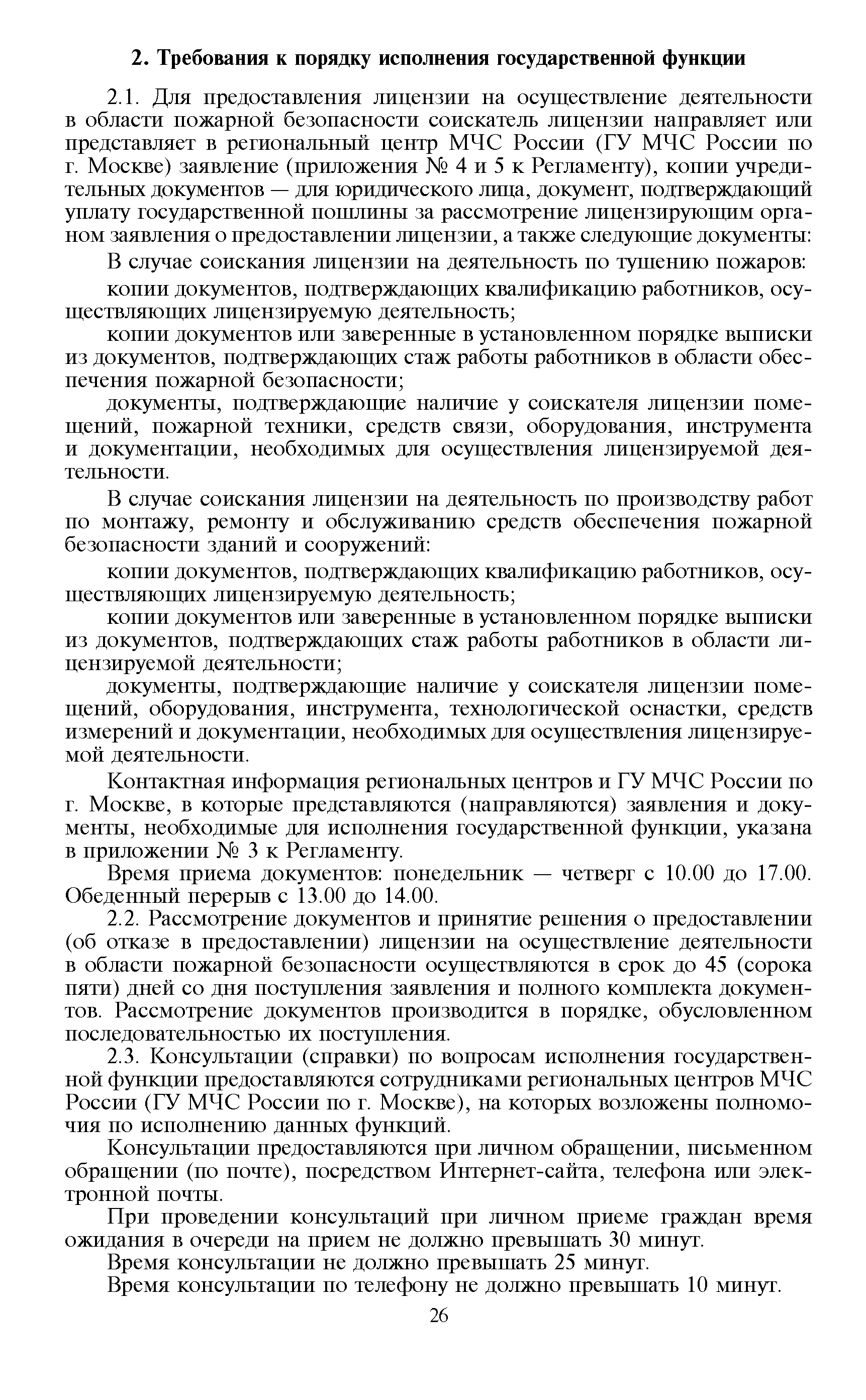 | Оглавление: | 1. Общие положения 2. Требования к порядку исполнения государственной функции 3. Административные процедуры 4. Порядок и формы контроля за исполнением государственной функции 5. Порядок обжалования действий (бездействий) должностного лица МЧС России, а также принимаемого им решения при исполнении административных процедур Приложение № 1. Административные процедуры, осуществляемые в связи с поступлением заявления и документов для предоставления лицензии, для переоформления документа, подтверждающего наличие лицензии Приложение № 2. Административные процедуры контроля за соблюдением лицензионных требований и условий Приложение № 3. Контактная информация о региональных центрах МЧС России и ГУ МЧС России по г. Москве, в которые направляются или представляются заявления и документы для предоставления лицензии Приложение № 4. Форма заявления о предоставлении лицензии для юридического лица Приложение № 5. Форма заявления о предоставлении лицензии для индивидуального предпринимателя Приложение № 6. Форма поручения о проведении проверки возможности выполнения соискателем лицензии лицензионных требований и условий Приложение № 7. Перечень ГУ МЧС России по субъектам РФ и контактная информация о них, которые обладают полномочиями по проведению проверки возможности выполнения лицензионных требований и условий соискателей лицензий Приложение № 8. Форма распоряжения о проведении проверки возможности выполнения соискателем лицензии лицензионных требований и условий при осуществлении лицензируемого вида деятельности Приложение № 9. Форма акта проверки возможности выполнения соискателем лицензии лицензионных требований и условий при осуществлении деятельности по тушению пожаров Приложение № 10. Форма акта проверки возможности выполнения соискателем лицензии лицензионных требований и условий при производстве работ по монтажу, ремонту и обслуживанию средств обеспечения пожарной безопасности зданий и сооружений Приложение № 11. Форма уведомления о предоставлении лицензии Приложение № 12. Форма уведомления об отказе в предоставлении лицензии Приложение № 13. Форма заявления о переоформлении лицензии для юридического лица Приложение № 14. Форма заявления о переоформлении лицензии для индивидуального предпринимателя Приложение № 15. Форма распоряжения о проведении проверки соблюдения лицензиатом лицензионных требований и условий при осуществлении лицензируемого вида деятельности Приложение № 16. Форма акта проверки соблюдения лицензиатом лицензионных требований и условий при осуществлении деятельности по тушению пожаров Приложение № 17. Форма акта проверки соблюдения лицензиатом лицензионных требований и условий при производстве работ по монтажу, ремонту и обслуживанию средств обеспечения пожарной безопасности зданий и сооружений Приложение № 18. Форма акта проверки качества выполненных работ по тушению пожаров Приложение № 19. Форма акта проверки качества выполненных работ по монтажу, ремонту и обслуживанию средств обеспечения пожарной безопасности зданий и сооружений Приложение № 20. Форма акта проверки качества выполненных работ по огнезащите материалов, изделий и конструкций Приложение № 21. Форма предписания лицензирующего органа Приложение № 22. Форма заявления о прекращении ос