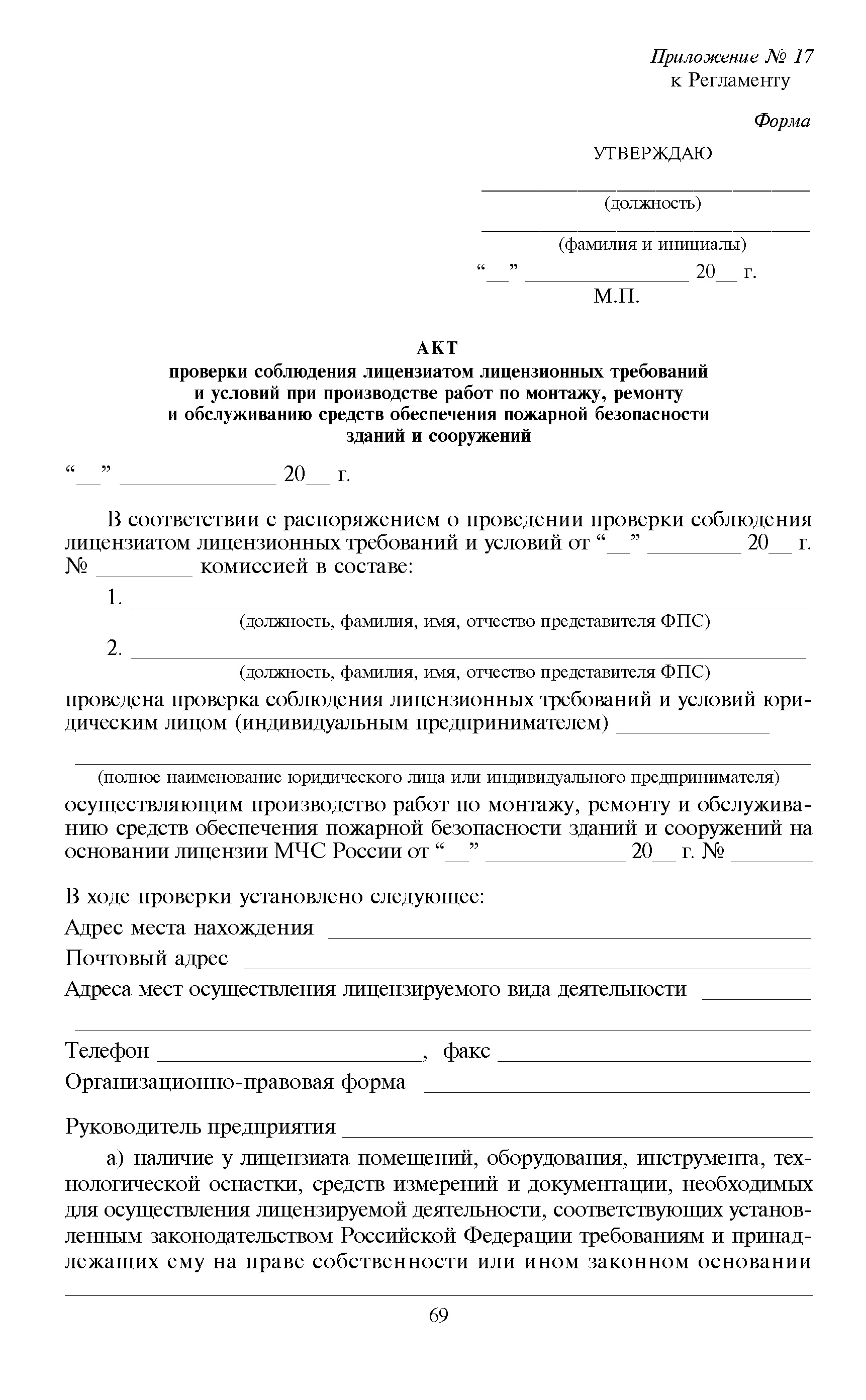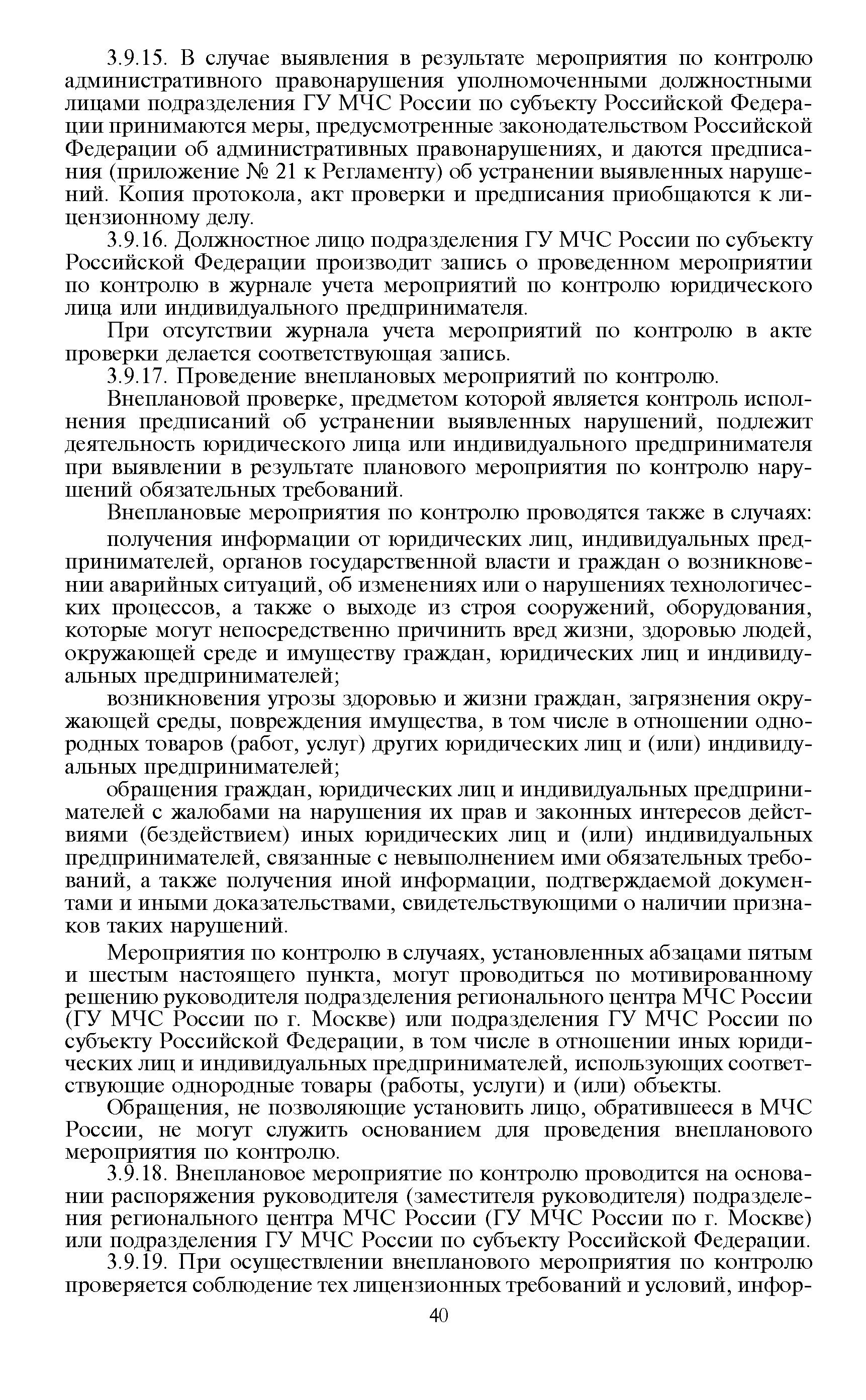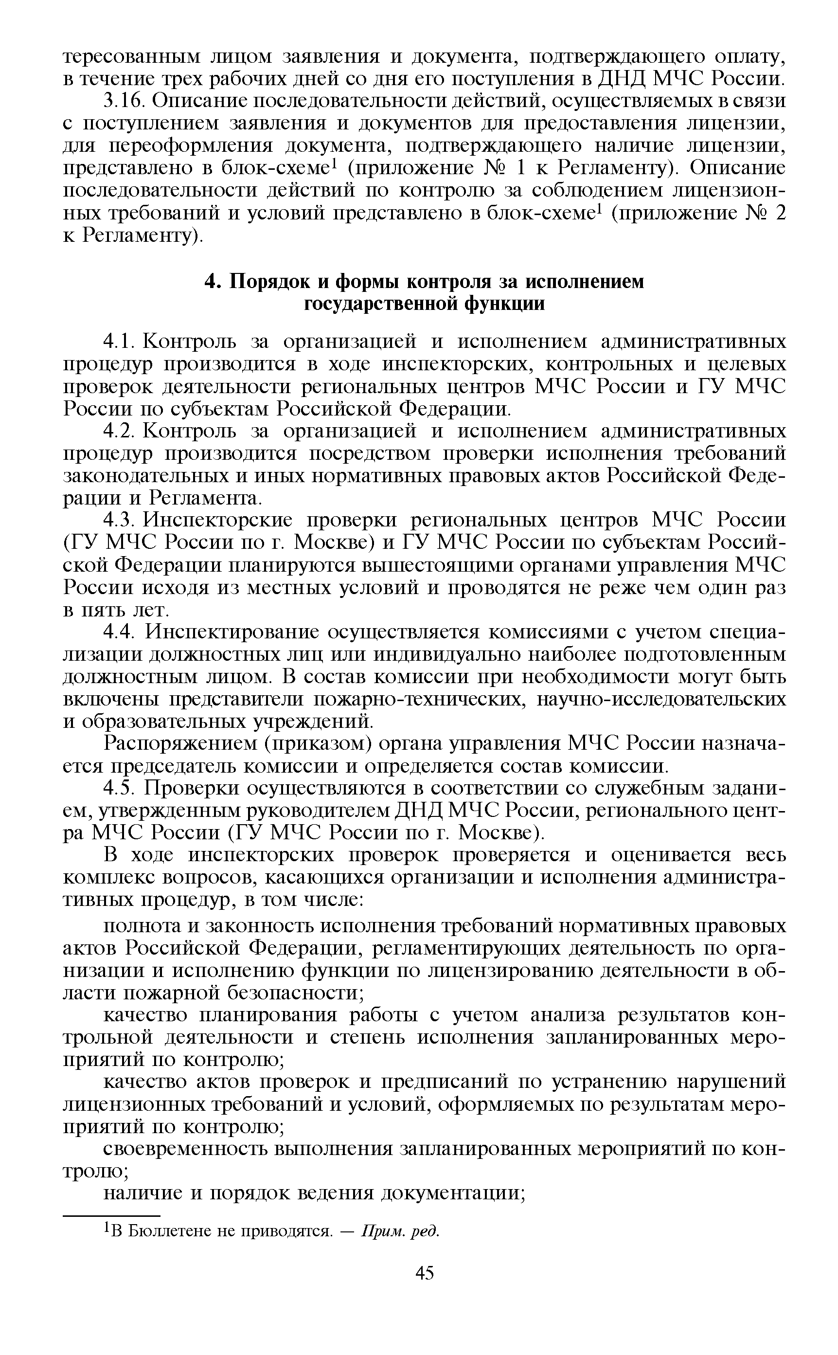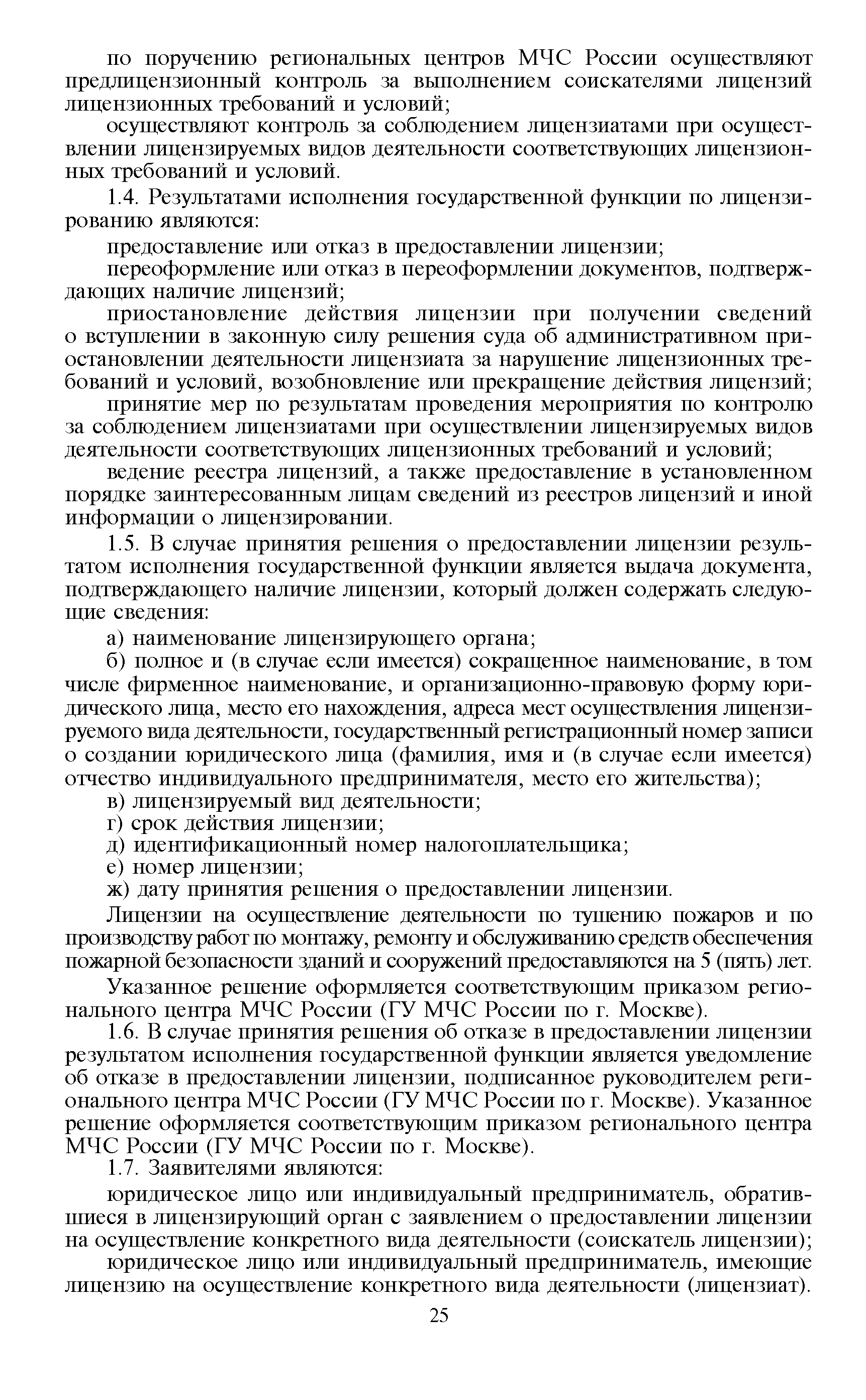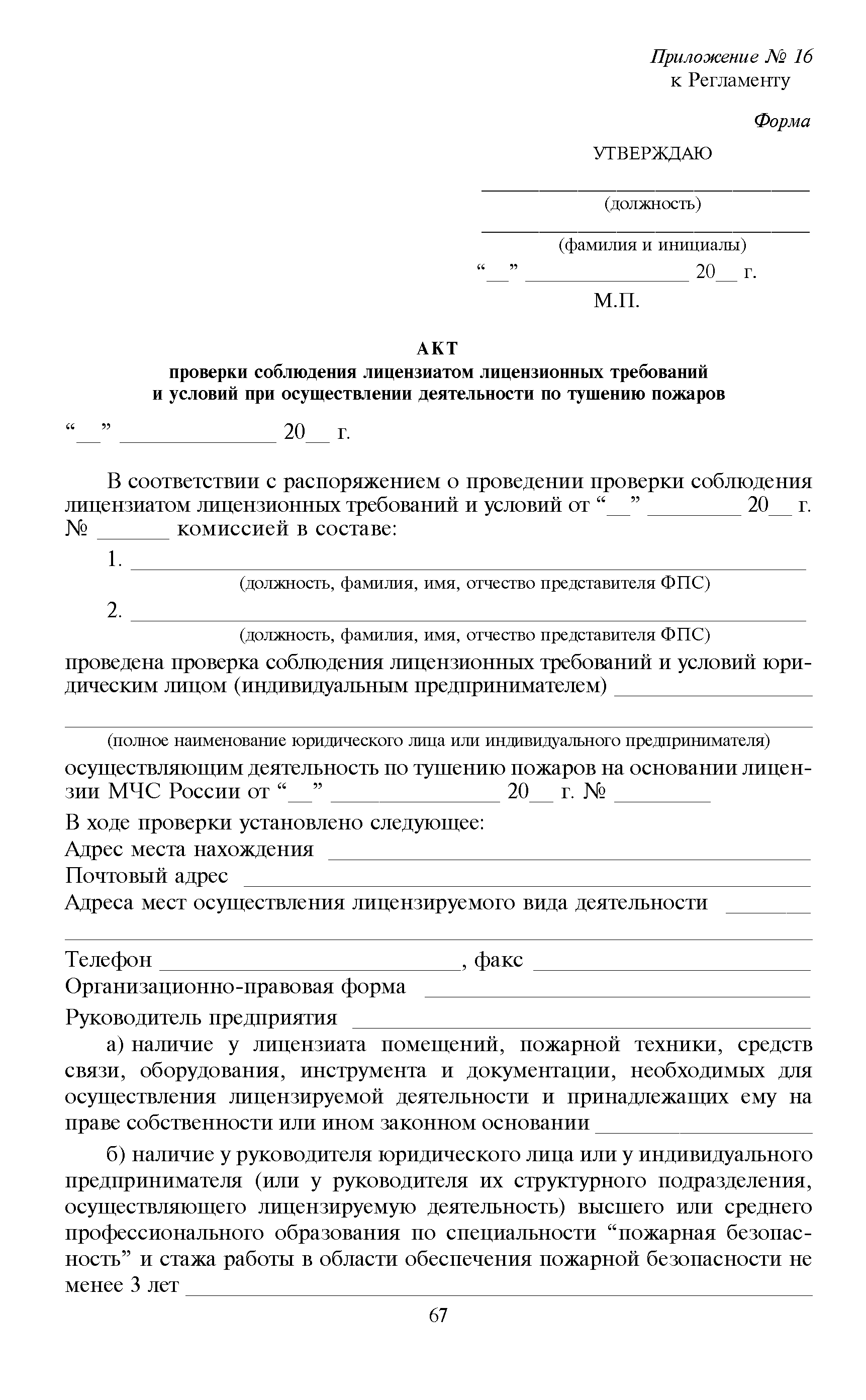 | Оглавление: | 1. Общие положения 2. Требования к порядку исполнения государственной функции 3. Административные процедуры 4. Порядок и формы контроля за исполнением государственной функции 5. Порядок обжалования действий (бездействий) должностного лица МЧС России, а также принимаемого им решения при исполнении административных процедур Приложение № 1. Административные процедуры, осуществляемые в связи с поступлением заявления и документов для предоставления лицензии, для переоформления документа, подтверждающего наличие лицензии Приложение № 2. Административные процедуры контроля за соблюдением лицензионных требований и условий Приложение № 3. Контактная информация о региональных центрах МЧС России и ГУ МЧС России по г. Москве, в которые направляются или представляются заявления и документы для предоставления лицензии Приложение № 4. Форма заявления о предоставлении лицензии для юридического лица Приложение № 5. Форма заявления о предоставлении лицензии для индивидуального предпринимателя Приложение № 6. Форма поручения о проведении проверки возможности выполнения соискателем лицензии лицензионных требований и условий Приложение № 7. Перечень ГУ МЧС России по субъектам РФ и контактная информация о них, которые обладают полномочиями по проведению проверки возможности выполнения лицензионных требований и условий соискателей лицензий Приложение № 8. Форма распоряжения о проведении проверки возможности выполнения соискателем лицензии лицензионных требований и условий при осуществлении лицензируемого вида деятельности Приложение № 9. Форма акта проверки возможности выполнения соискателем лицензии лицензионных требований и условий при осуществлении деятельности по тушению пожаров Приложение № 10. Форма акта проверки возможности выполнения соискателем лицензии лицензионных требований и условий при производстве работ по монтажу, ремонту и обслуживанию средств обеспечения пожарной безопасности зданий и сооружений Приложение № 11. Форма уведомления о предоставлении лицензии Приложение № 12. Форма уведомления об отказе в предоставлении лицензии Приложение № 13. Форма заявления о переоформлении лицензии для юридического лица Приложение № 14. Форма заявления о переоформлении лицензии для индивидуального предпринимателя Приложение № 15. Форма распоряжения о проведении проверки соблюдения лицензиатом лицензионных требований и условий при осуществлении лицензируемого вида деятельности Приложение № 16. Форма акта проверки соблюдения лицензиатом лицензионных требований и условий при осуществлении деятельности по тушению пожаров Приложение № 17. Форма акта проверки соблюдения лицензиатом лицензионных требований и условий при производстве работ по монтажу, ремонту и обслуживанию средств обеспечения пожарной безопасности зданий и сооружений Приложение № 18. Форма акта проверки качества выполненных работ по тушению пожаров Приложение № 19. Форма акта проверки качества выполненных работ по монтажу, ремонту и обслуживанию средств обеспечения пожарной безопасности зданий и сооружений Приложение № 20. Форма акта проверки качества выполненных работ по огнезащите материалов, изделий и конструкций Приложение № 21. Форма предписания лицензирующего органа Приложение № 22. Форма заявления о прекращении ос