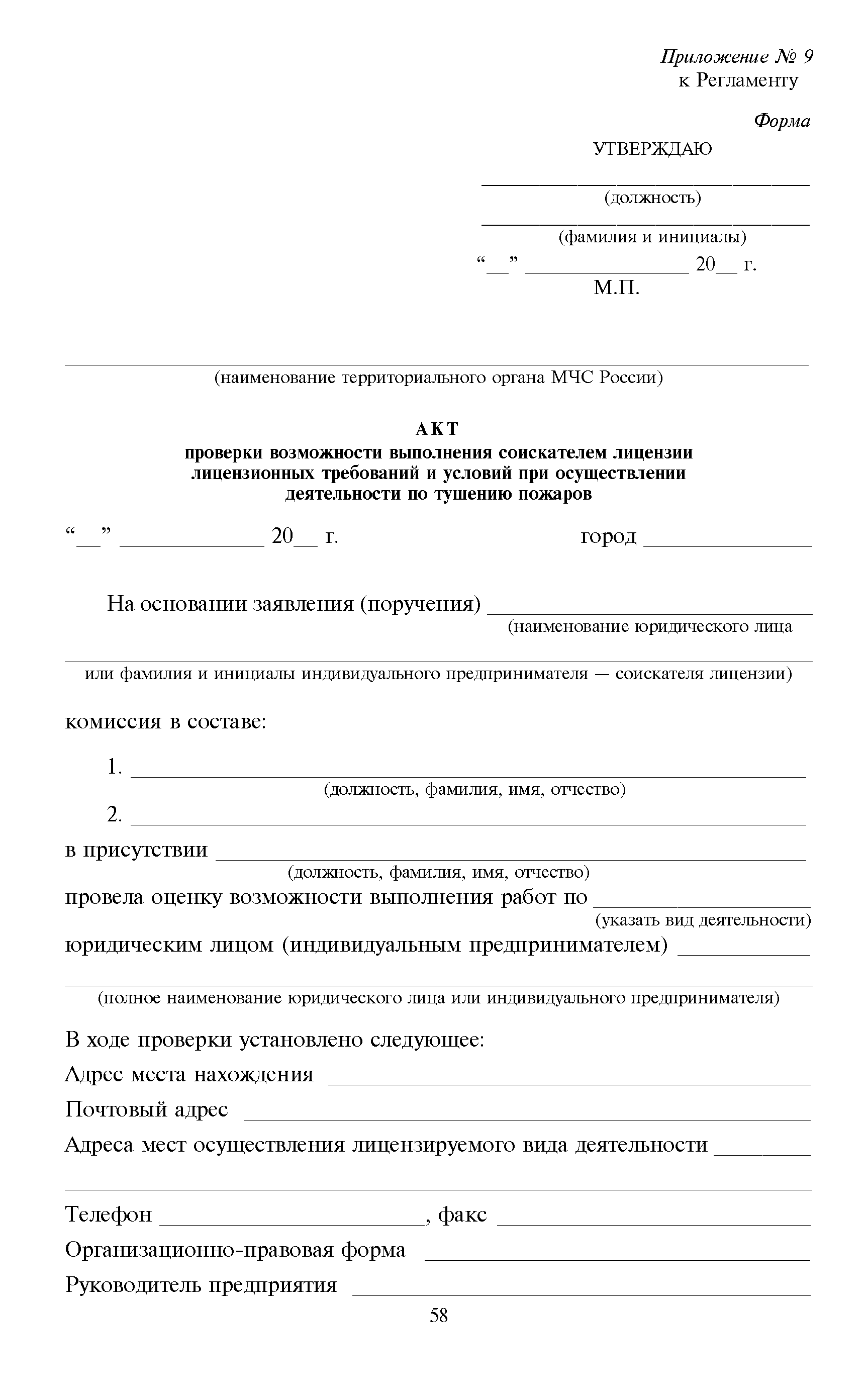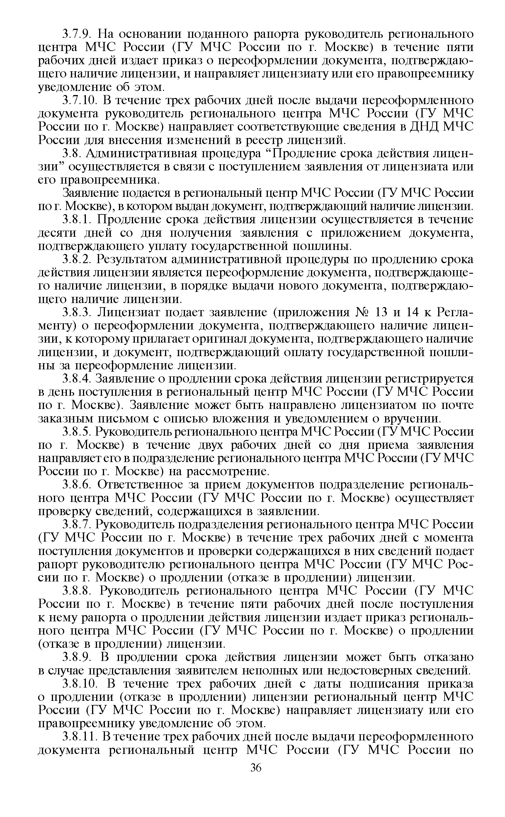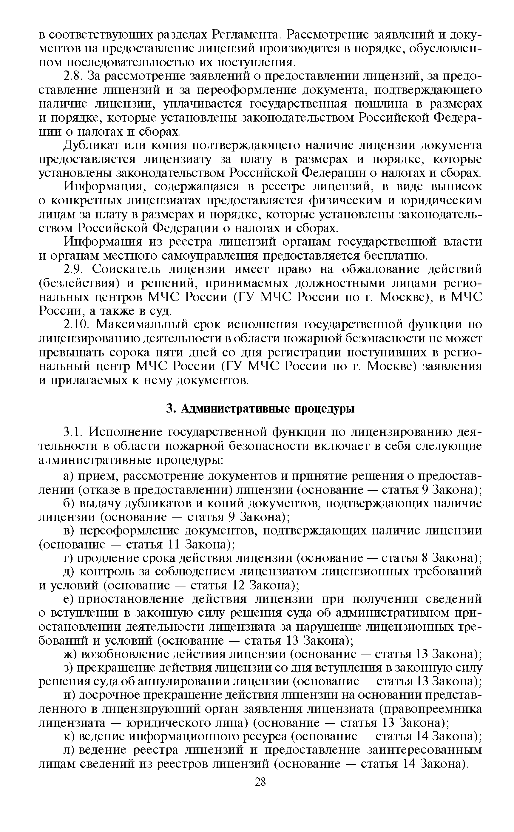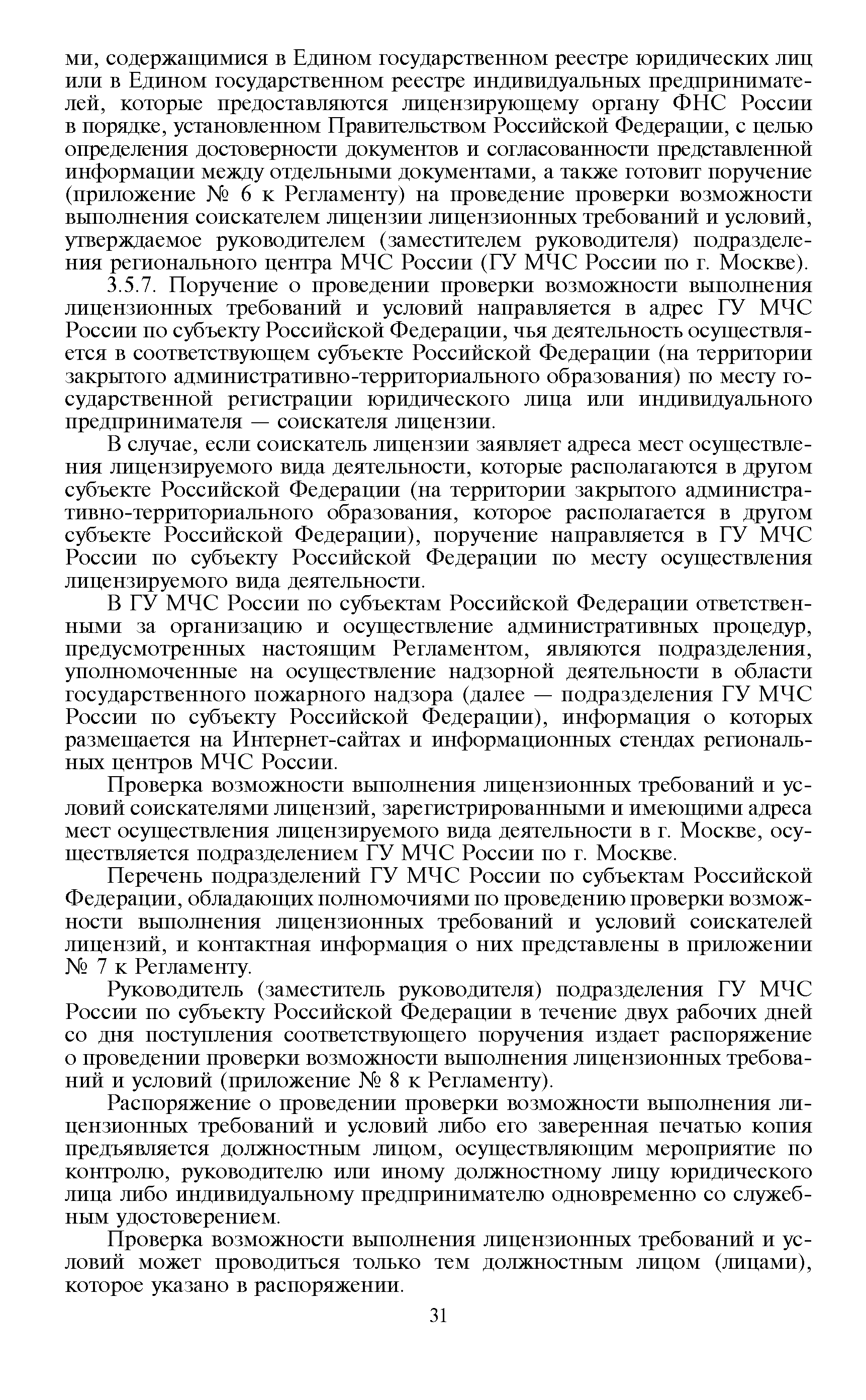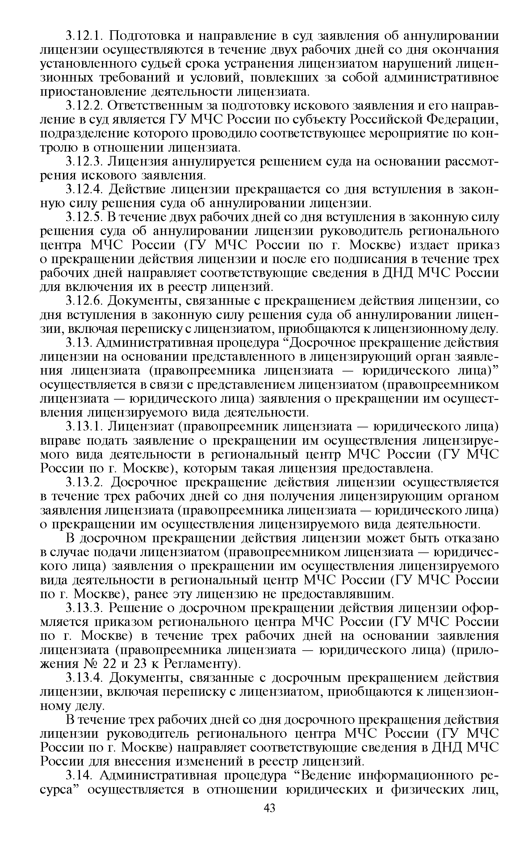 | Оглавление: | 1. Общие положения 2. Требования к порядку исполнения государственной функции 3. Административные процедуры 4. Порядок и формы контроля за исполнением государственной функции 5. Порядок обжалования действий (бездействий) должностного лица МЧС России, а также принимаемого им решения при исполнении административных процедур Приложение № 1. Административные процедуры, осуществляемые в связи с поступлением заявления и документов для предоставления лицензии, для переоформления документа, подтверждающего наличие лицензии Приложение № 2. Административные процедуры контроля за соблюдением лицензионных требований и условий Приложение № 3. Контактная информация о региональных центрах МЧС России и ГУ МЧС России по г. Москве, в которые направляются или представляются заявления и документы для предоставления лицензии Приложение № 4. Форма заявления о предоставлении лицензии для юридического лица Приложение № 5. Форма заявления о предоставлении лицензии для индивидуального предпринимателя Приложение № 6. Форма поручения о проведении проверки возможности выполнения соискателем лицензии лицензионных требований и условий Приложение № 7. Перечень ГУ МЧС России по субъектам РФ и контактная информация о них, которые обладают полномочиями по проведению проверки возможности выполнения лицензионных требований и условий соискателей лицензий Приложение № 8. Форма распоряжения о проведении проверки возможности выполнения соискателем лицензии лицензионных требований и условий при осуществлении лицензируемого вида деятельности Приложение № 9. Форма акта проверки возможности выполнения соискателем лицензии лицензионных требований и условий при осуществлении деятельности по тушению пожаров Приложение № 10. Форма акта проверки возможности выполнения соискателем лицензии лицензионных требований и условий при производстве работ по монтажу, ремонту и обслуживанию средств обеспечения пожарной безопасности зданий и сооружений Приложение № 11. Форма уведомления о предоставлении лицензии Приложение № 12. Форма уведомления об отказе в предоставлении лицензии Приложение № 13. Форма заявления о переоформлении лицензии для юридического лица Приложение № 14. Форма заявления о переоформлении лицензии для индивидуального предпринимателя Приложение № 15. Форма распоряжения о проведении проверки соблюдения лицензиатом лицензионных требований и условий при осуществлении лицензируемого вида деятельности Приложение № 16. Форма акта проверки соблюдения лицензиатом лицензионных требований и условий при осуществлении деятельности по тушению пожаров Приложение № 17. Форма акта проверки соблюдения лицензиатом лицензионных требований и условий при производстве работ по монтажу, ремонту и обслуживанию средств обеспечения пожарной безопасности зданий и сооружений Приложение № 18. Форма акта проверки качества выполненных работ по тушению пожаров Приложение № 19. Форма акта проверки качества выполненных работ по монтажу, ремонту и обслуживанию средств обеспечения пожарной безопасности зданий и сооружений Приложение № 20. Форма акта проверки качества выполненных работ по огнезащите материалов, изделий и конструкций Приложение № 21. Форма предписания лицензирующего органа Приложение № 22. Форма заявления о прекращении ос