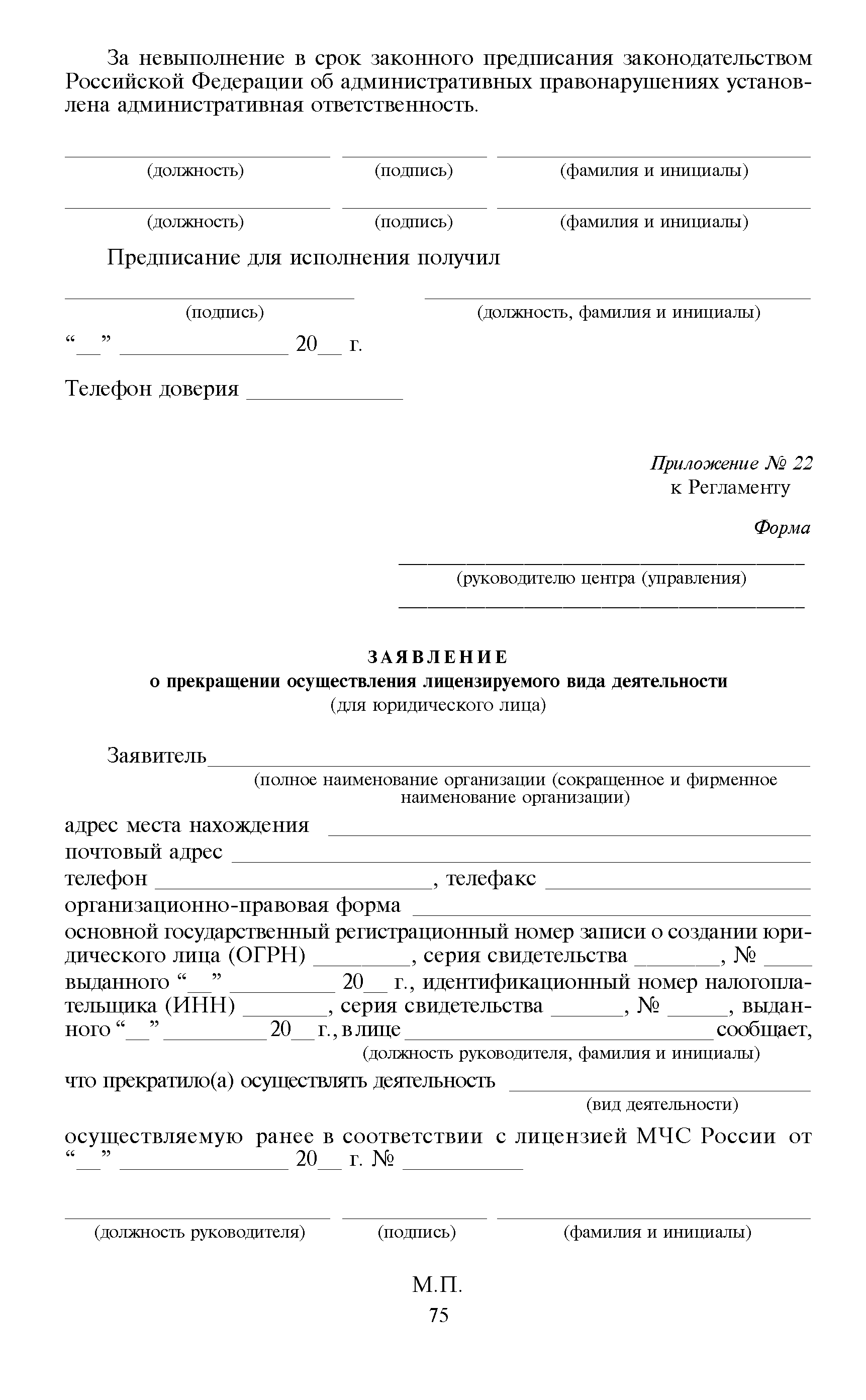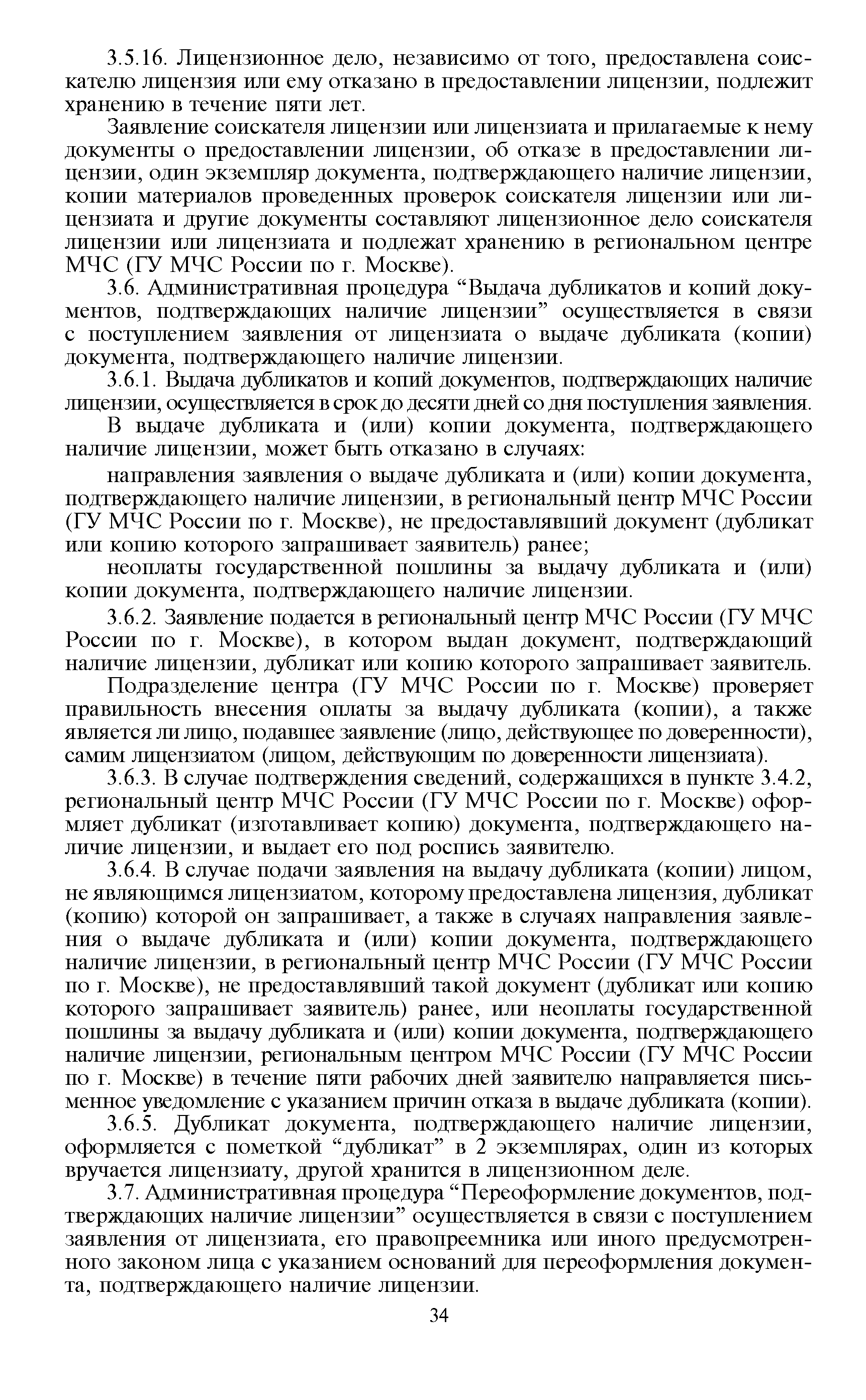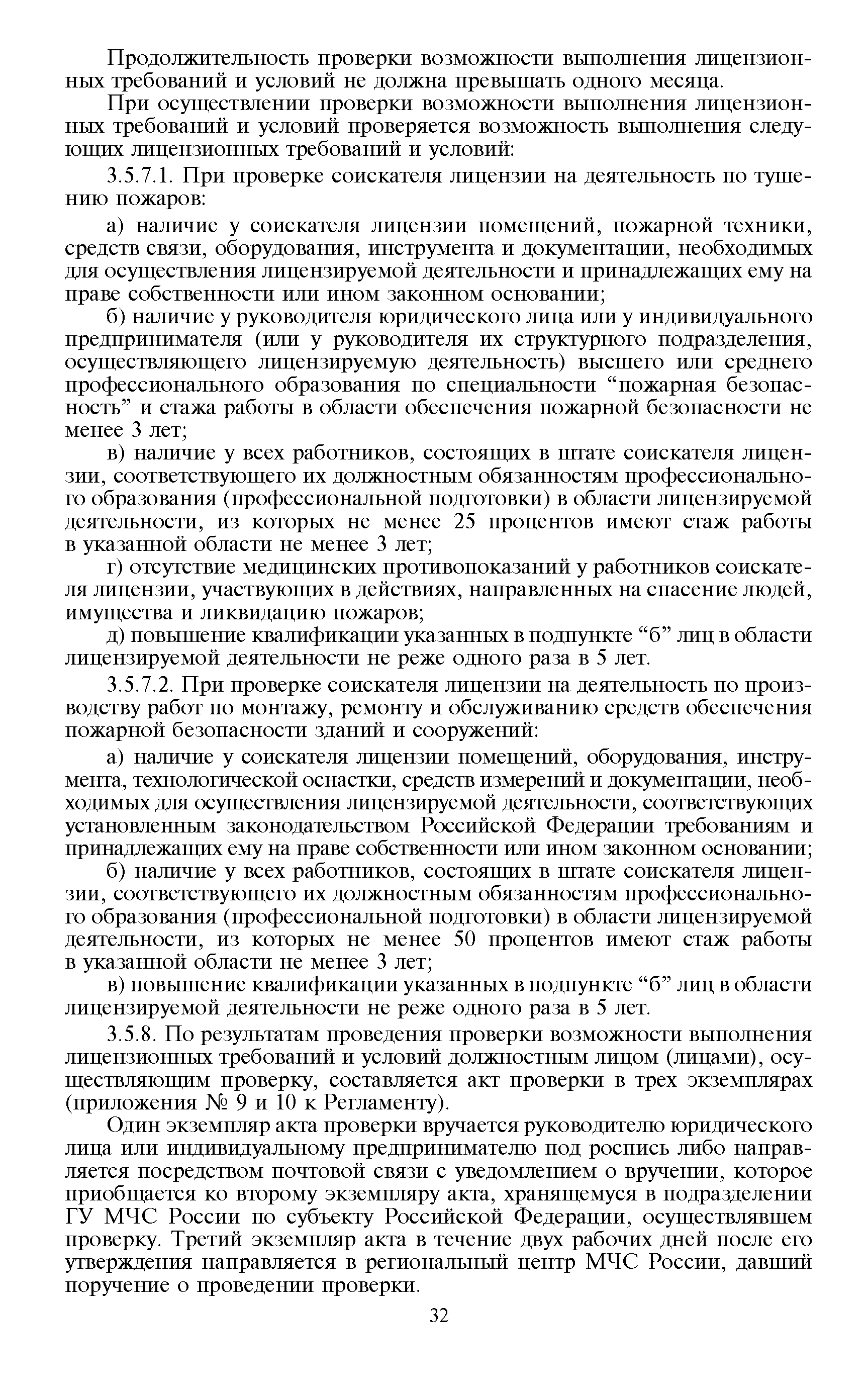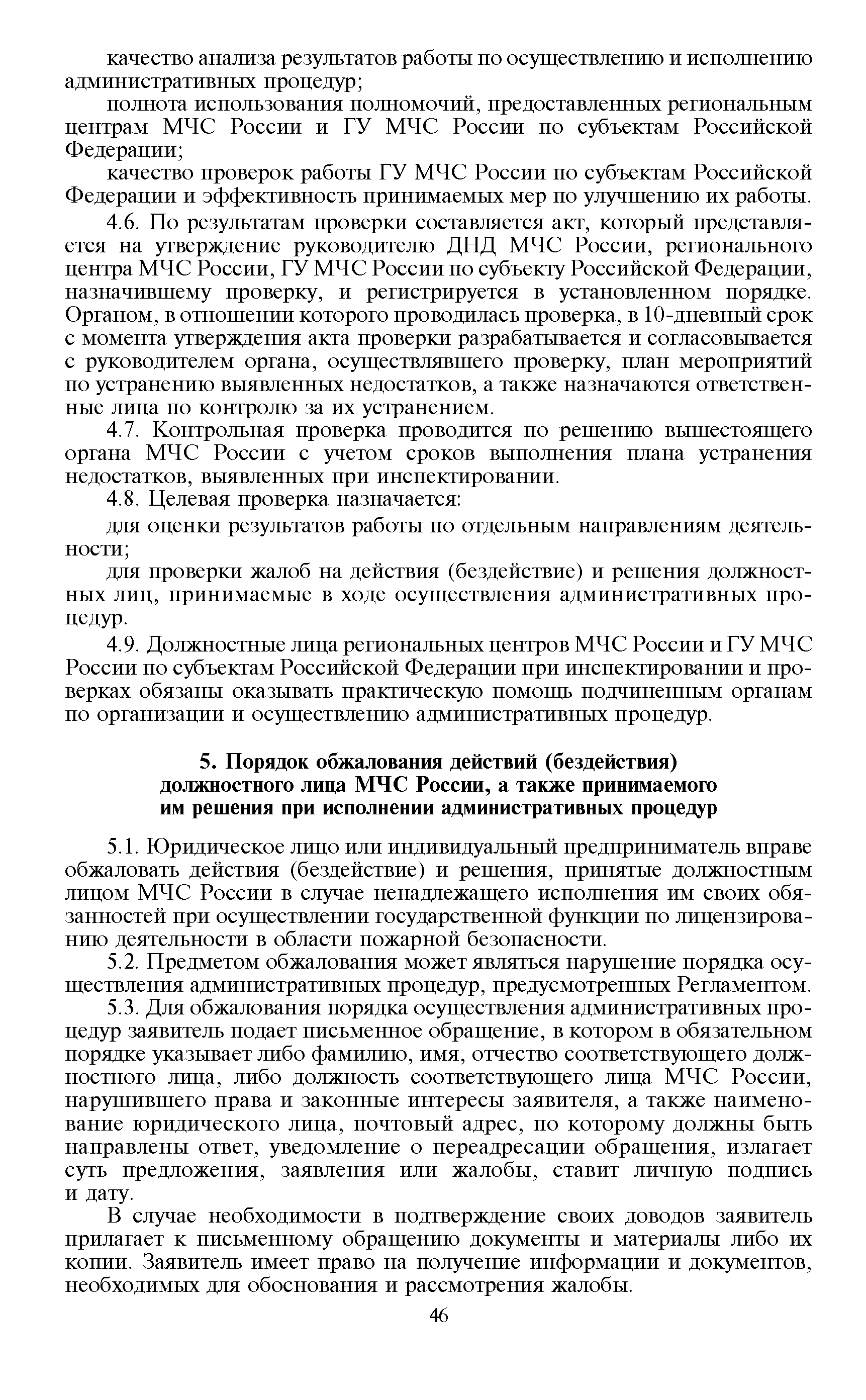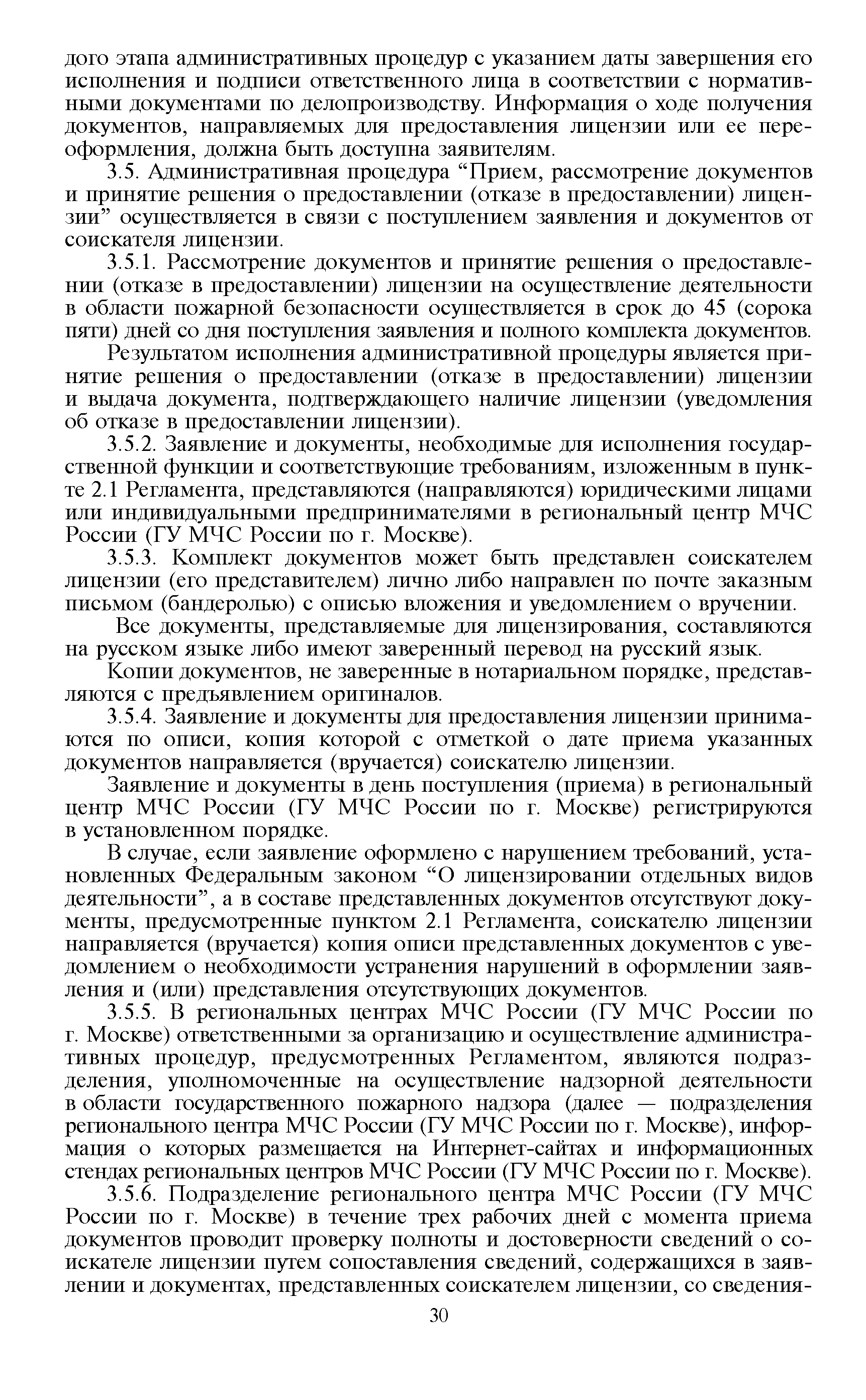 | Оглавление: | 1. Общие положения 2. Требования к порядку исполнения государственной функции 3. Административные процедуры 4. Порядок и формы контроля за исполнением государственной функции 5. Порядок обжалования действий (бездействий) должностного лица МЧС России, а также принимаемого им решения при исполнении административных процедур Приложение № 1. Административные процедуры, осуществляемые в связи с поступлением заявления и документов для предоставления лицензии, для переоформления документа, подтверждающего наличие лицензии Приложение № 2. Административные процедуры контроля за соблюдением лицензионных требований и условий Приложение № 3. Контактная информация о региональных центрах МЧС России и ГУ МЧС России по г. Москве, в которые направляются или представляются заявления и документы для предоставления лицензии Приложение № 4. Форма заявления о предоставлении лицензии для юридического лица Приложение № 5. Форма заявления о предоставлении лицензии для индивидуального предпринимателя Приложение № 6. Форма поручения о проведении проверки возможности выполнения соискателем лицензии лицензионных требований и условий Приложение № 7. Перечень ГУ МЧС России по субъектам РФ и контактная информация о них, которые обладают полномочиями по проведению проверки возможности выполнения лицензионных требований и условий соискателей лицензий Приложение № 8. Форма распоряжения о проведении проверки возможности выполнения соискателем лицензии лицензионных требований и условий при осуществлении лицензируемого вида деятельности Приложение № 9. Форма акта проверки возможности выполнения соискателем лицензии лицензионных требований и условий при осуществлении деятельности по тушению пожаров Приложение № 10. Форма акта проверки возможности выполнения соискателем лицензии лицензионных требований и условий при производстве работ по монтажу, ремонту и обслуживанию средств обеспечения пожарной безопасности зданий и сооружений Приложение № 11. Форма уведомления о предоставлении лицензии Приложение № 12. Форма уведомления об отказе в предоставлении лицензии Приложение № 13. Форма заявления о переоформлении лицензии для юридического лица Приложение № 14. Форма заявления о переоформлении лицензии для индивидуального предпринимателя Приложение № 15. Форма распоряжения о проведении проверки соблюдения лицензиатом лицензионных требований и условий при осуществлении лицензируемого вида деятельности Приложение № 16. Форма акта проверки соблюдения лицензиатом лицензионных требований и условий при осуществлении деятельности по тушению пожаров Приложение № 17. Форма акта проверки соблюдения лицензиатом лицензионных требований и условий при производстве работ по монтажу, ремонту и обслуживанию средств обеспечения пожарной безопасности зданий и сооружений Приложение № 18. Форма акта проверки качества выполненных работ по тушению пожаров Приложение № 19. Форма акта проверки качества выполненных работ по монтажу, ремонту и обслуживанию средств обеспечения пожарной безопасности зданий и сооружений Приложение № 20. Форма акта проверки качества выполненных работ по огнезащите материалов, изделий и конструкций Приложение № 21. Форма предписания лицензирующего органа Приложение № 22. Форма заявления о прекращении ос