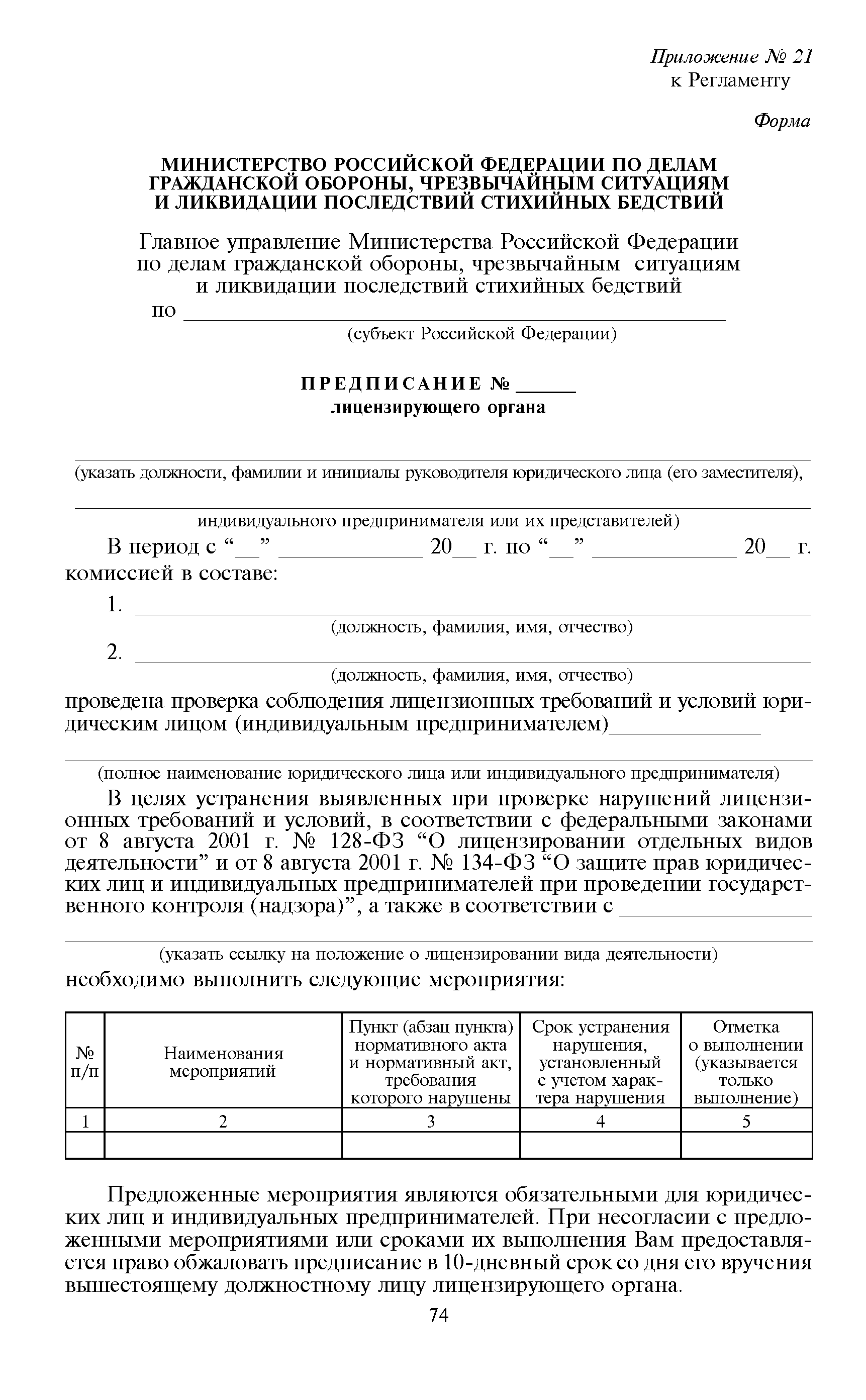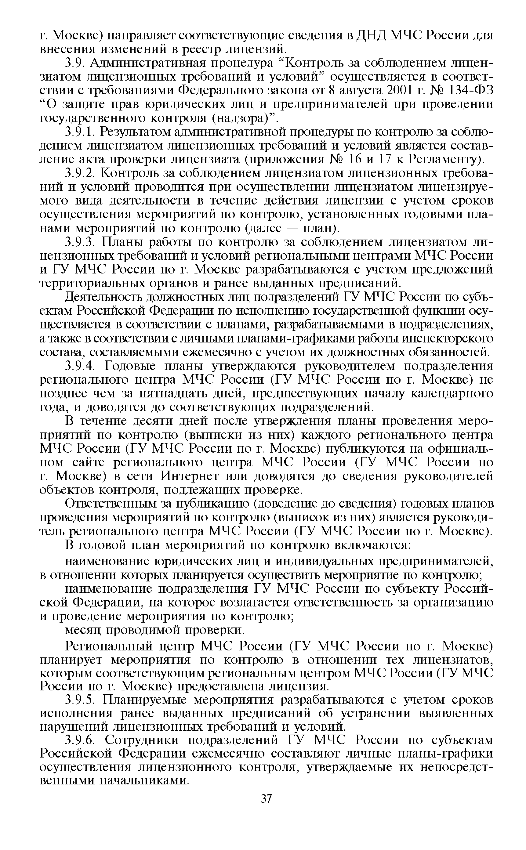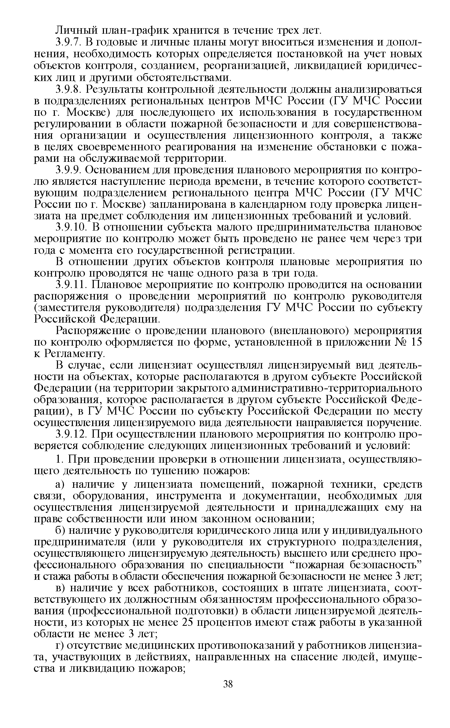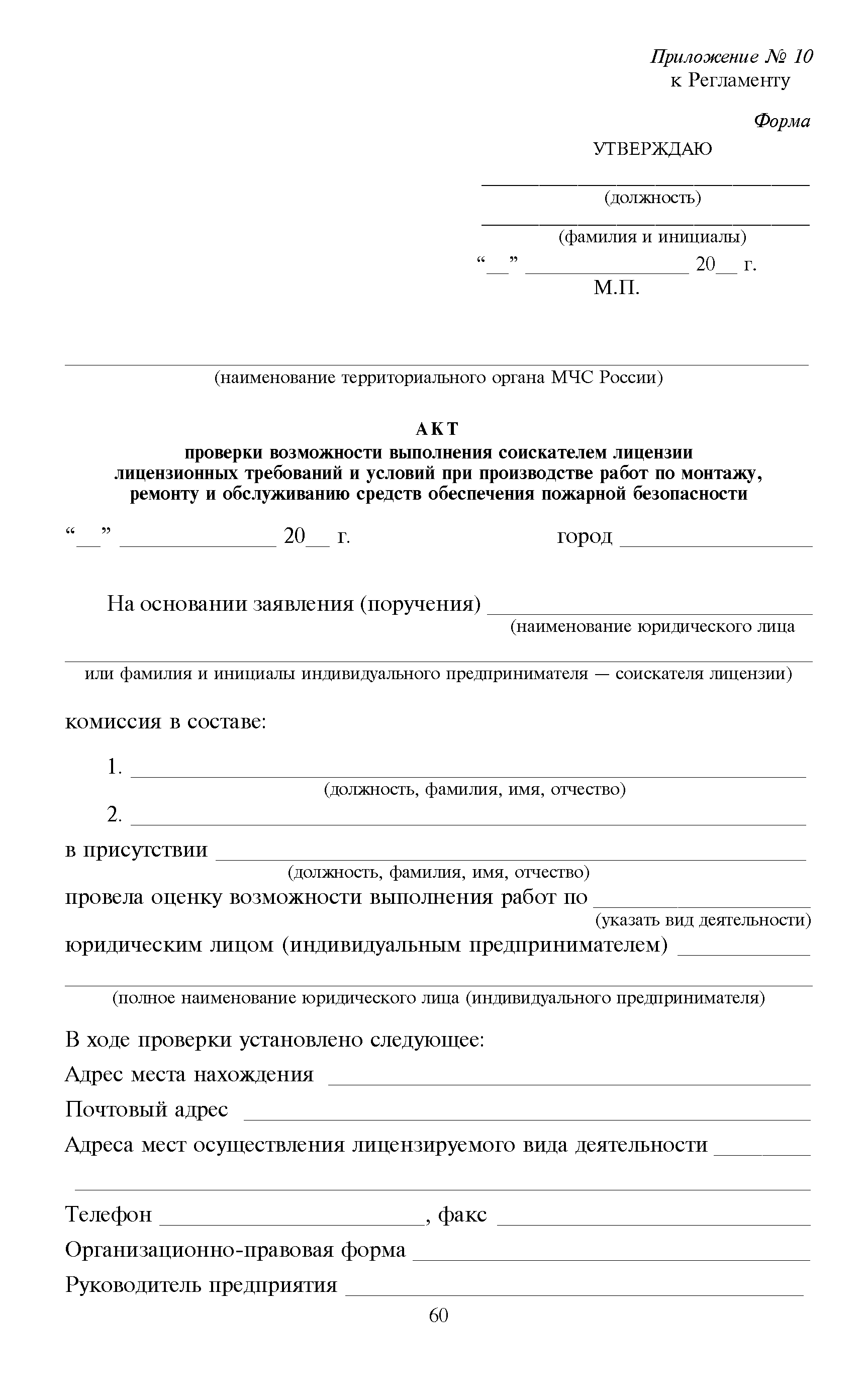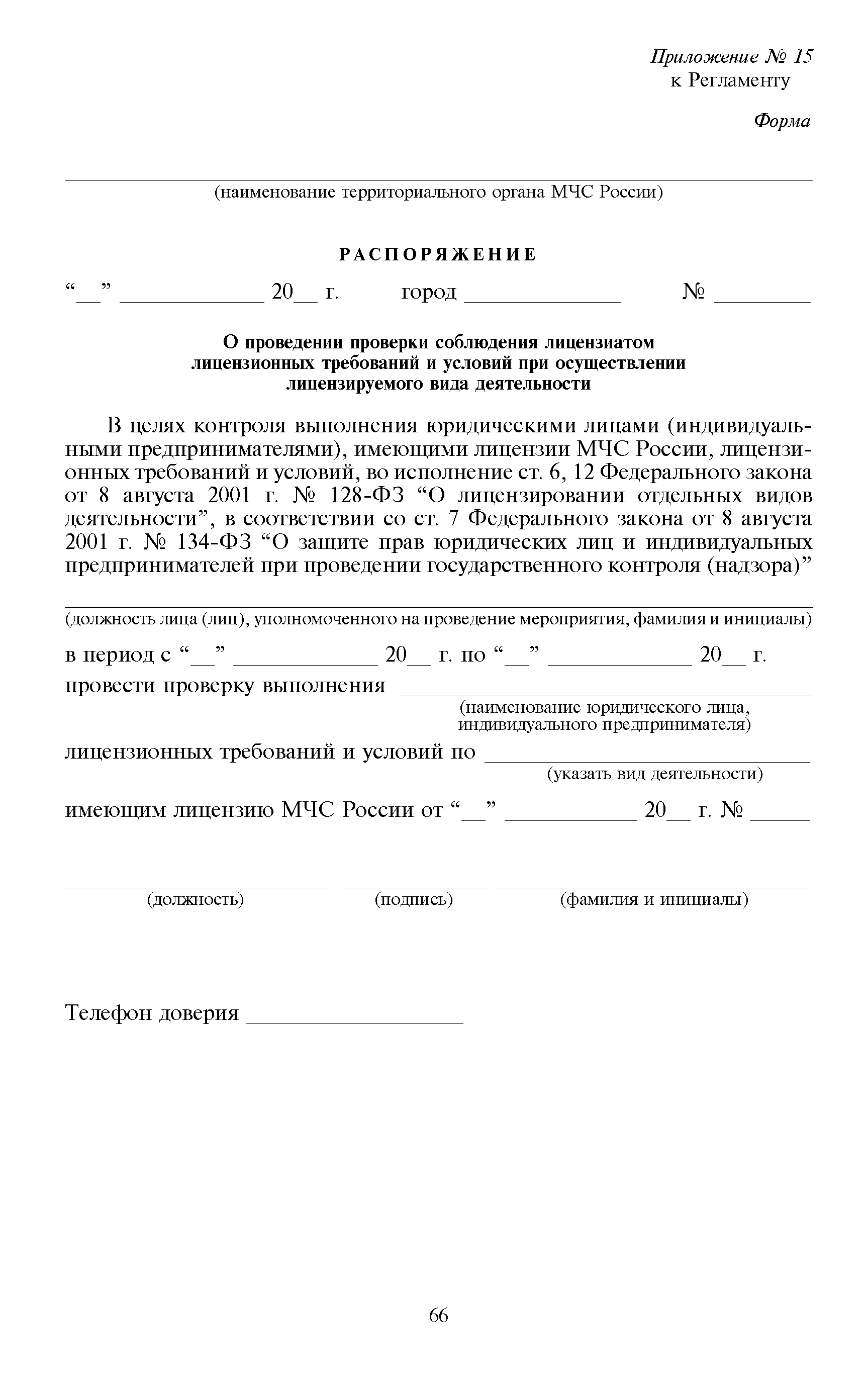 | Оглавление: | 1. Общие положения 2. Требования к порядку исполнения государственной функции 3. Административные процедуры 4. Порядок и формы контроля за исполнением государственной функции 5. Порядок обжалования действий (бездействий) должностного лица МЧС России, а также принимаемого им решения при исполнении административных процедур Приложение № 1. Административные процедуры, осуществляемые в связи с поступлением заявления и документов для предоставления лицензии, для переоформления документа, подтверждающего наличие лицензии Приложение № 2. Административные процедуры контроля за соблюдением лицензионных требований и условий Приложение № 3. Контактная информация о региональных центрах МЧС России и ГУ МЧС России по г. Москве, в которые направляются или представляются заявления и документы для предоставления лицензии Приложение № 4. Форма заявления о предоставлении лицензии для юридического лица Приложение № 5. Форма заявления о предоставлении лицензии для индивидуального предпринимателя Приложение № 6. Форма поручения о проведении проверки возможности выполнения соискателем лицензии лицензионных требований и условий Приложение № 7. Перечень ГУ МЧС России по субъектам РФ и контактная информация о них, которые обладают полномочиями по проведению проверки возможности выполнения лицензионных требований и условий соискателей лицензий Приложение № 8. Форма распоряжения о проведении проверки возможности выполнения соискателем лицензии лицензионных требований и условий при осуществлении лицензируемого вида деятельности Приложение № 9. Форма акта проверки возможности выполнения соискателем лицензии лицензионных требований и условий при осуществлении деятельности по тушению пожаров Приложение № 10. Форма акта проверки возможности выполнения соискателем лицензии лицензионных требований и условий при производстве работ по монтажу, ремонту и обслуживанию средств обеспечения пожарной безопасности зданий и сооружений Приложение № 11. Форма уведомления о предоставлении лицензии Приложение № 12. Форма уведомления об отказе в предоставлении лицензии Приложение № 13. Форма заявления о переоформлении лицензии для юридического лица Приложение № 14. Форма заявления о переоформлении лицензии для индивидуального предпринимателя Приложение № 15. Форма распоряжения о проведении проверки соблюдения лицензиатом лицензионных требований и условий при осуществлении лицензируемого вида деятельности Приложение № 16. Форма акта проверки соблюдения лицензиатом лицензионных требований и условий при осуществлении деятельности по тушению пожаров Приложение № 17. Форма акта проверки соблюдения лицензиатом лицензионных требований и условий при производстве работ по монтажу, ремонту и обслуживанию средств обеспечения пожарной безопасности зданий и сооружений Приложение № 18. Форма акта проверки качества выполненных работ по тушению пожаров Приложение № 19. Форма акта проверки качества выполненных работ по монтажу, ремонту и обслуживанию средств обеспечения пожарной безопасности зданий и сооружений Приложение № 20. Форма акта проверки качества выполненных работ по огнезащите материалов, изделий и конструкций Приложение № 21. Форма предписания лицензирующего органа Приложение № 22. Форма заявления о прекращении ос