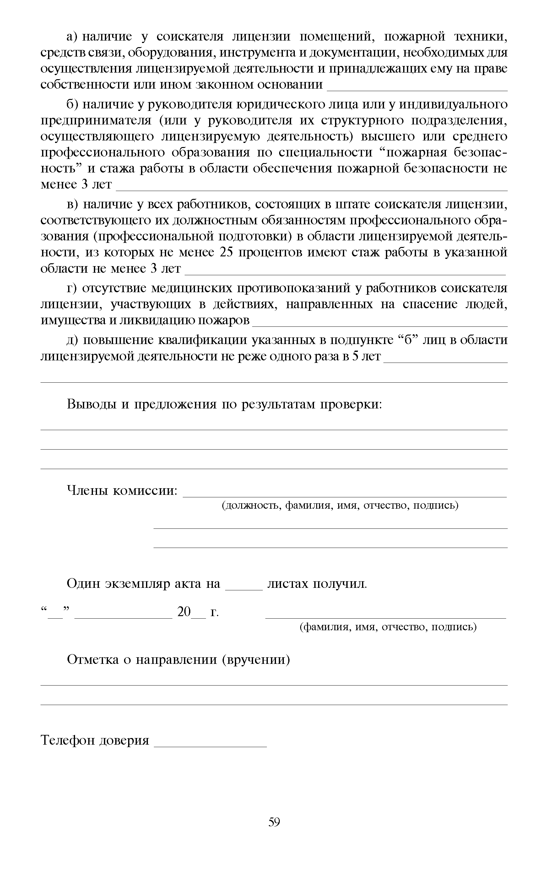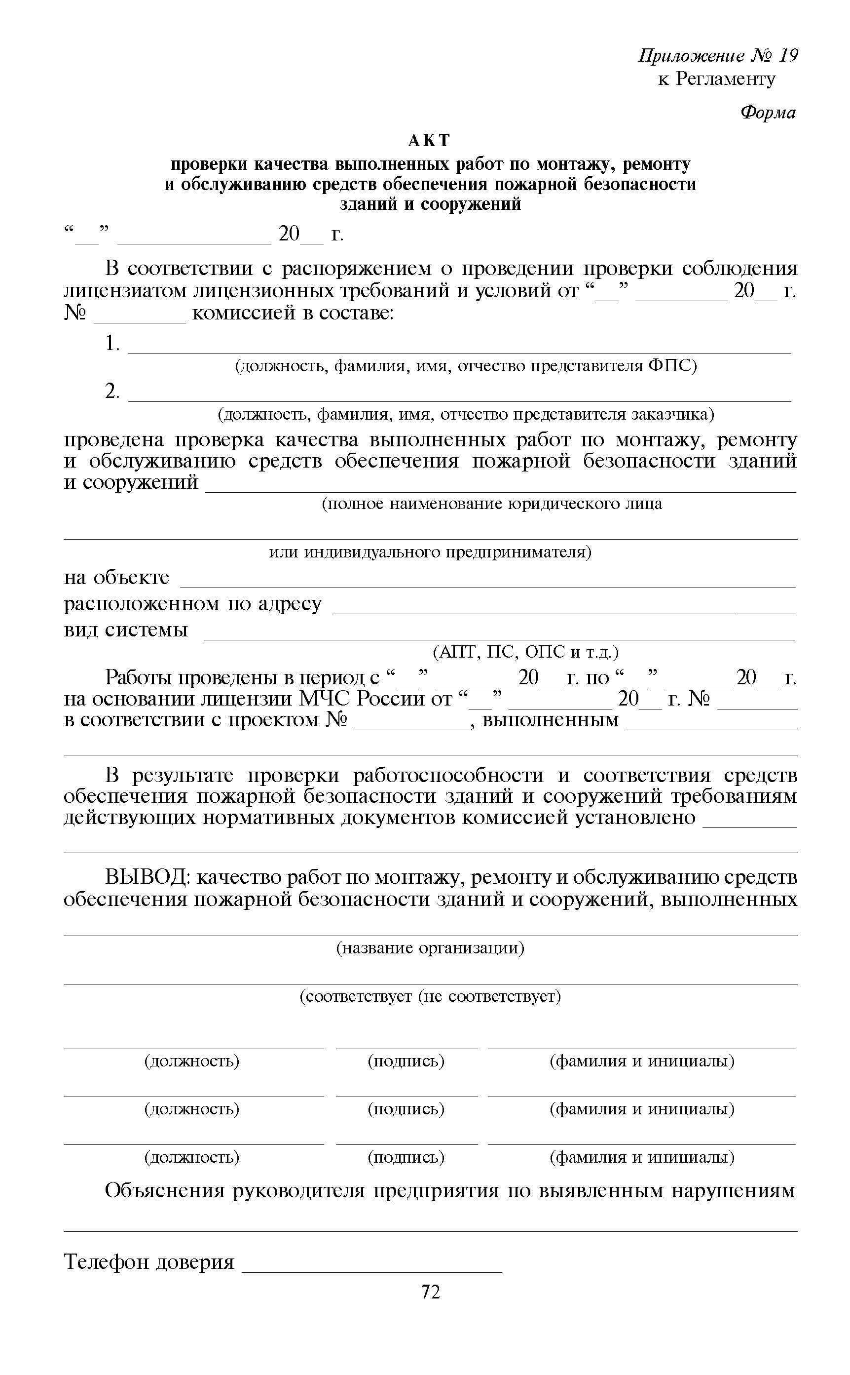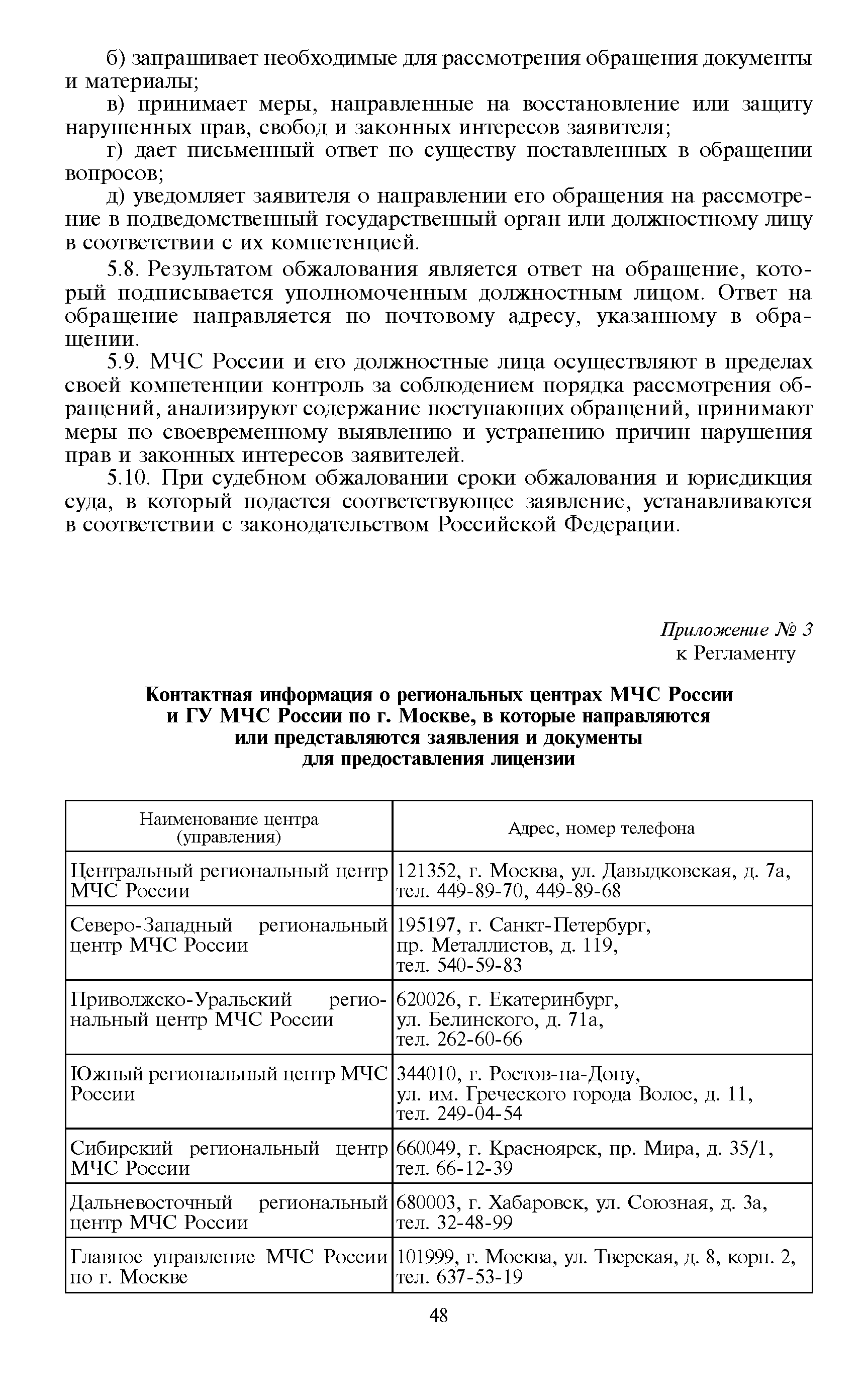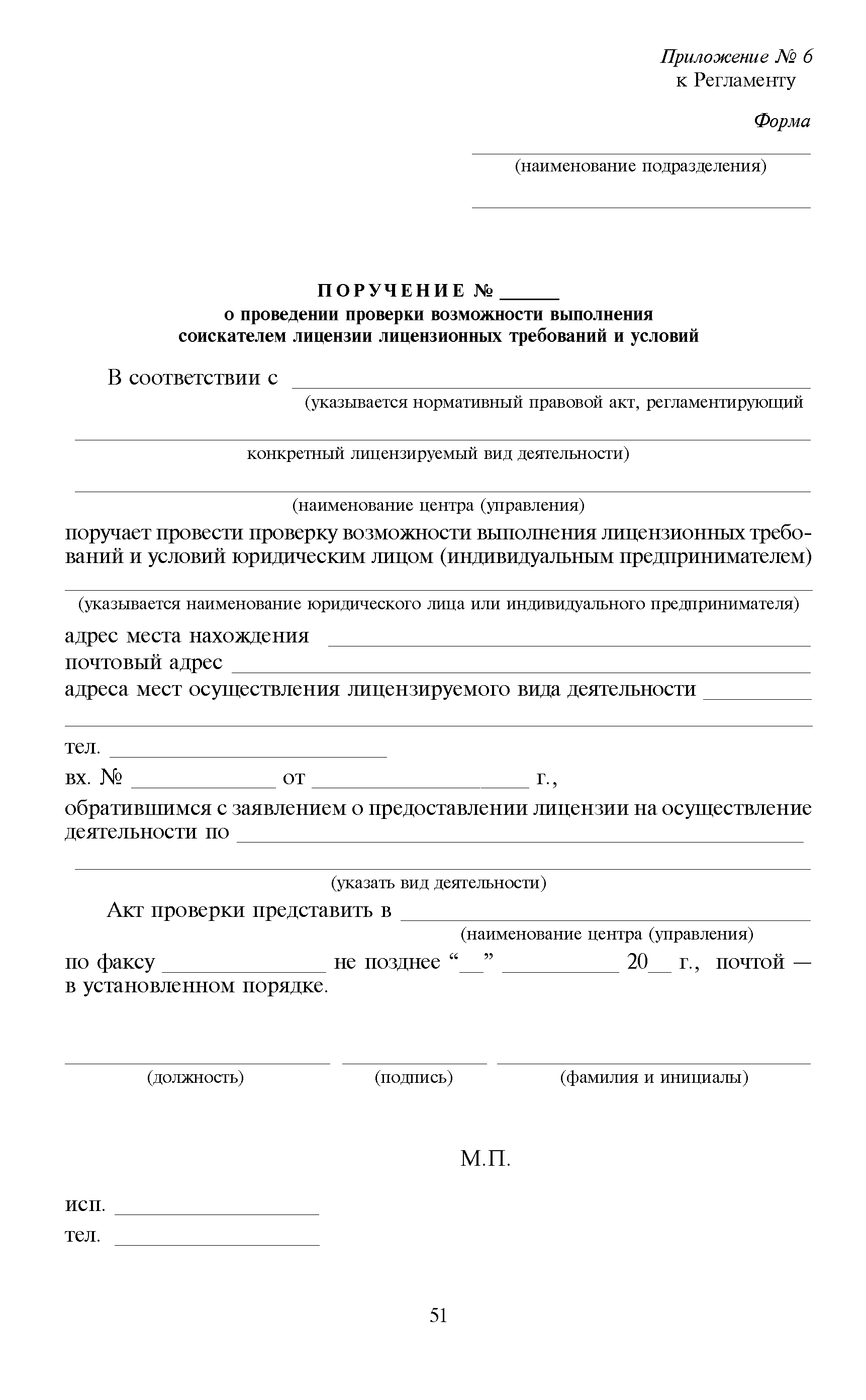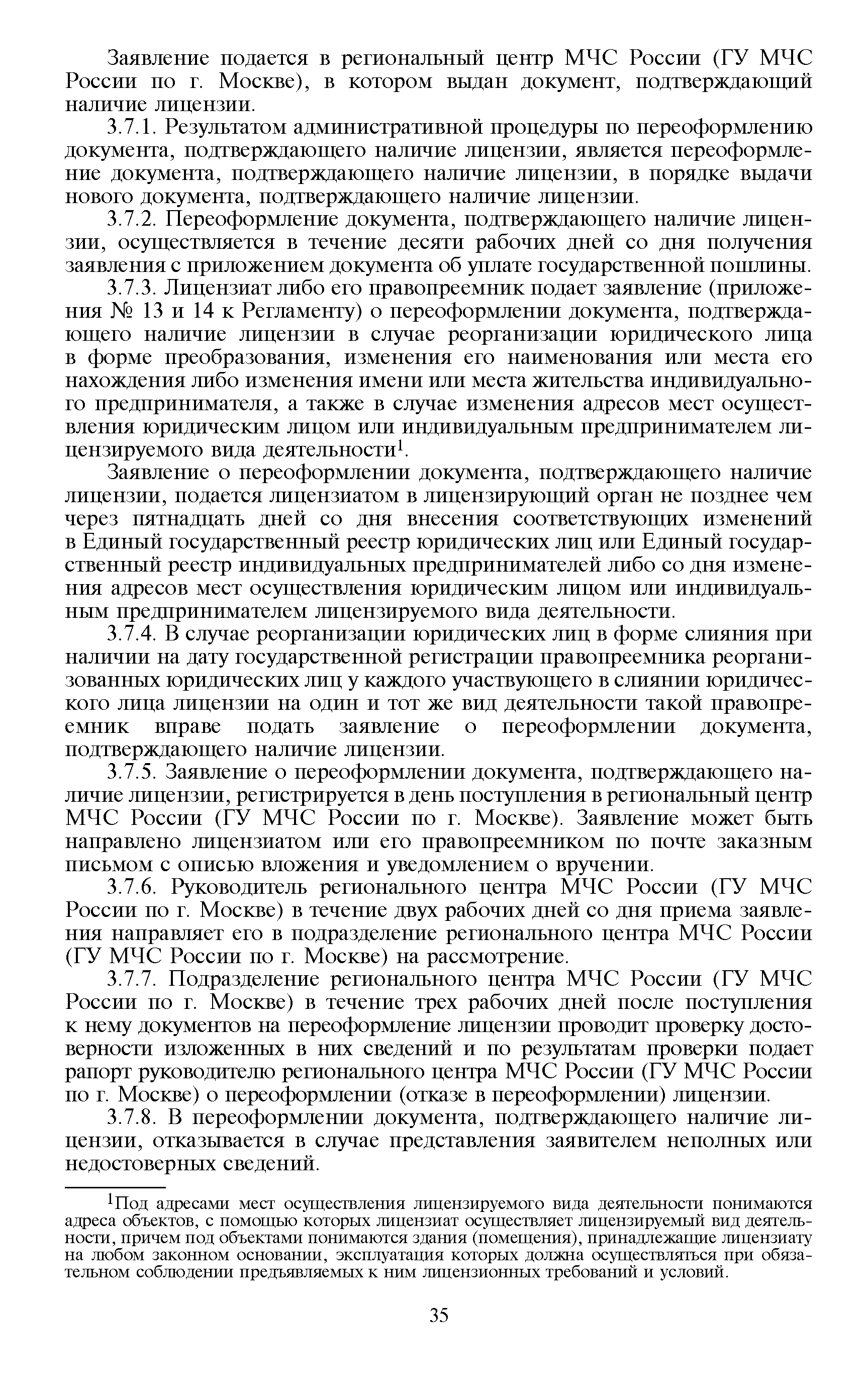 | Оглавление: | 1. Общие положения 2. Требования к порядку исполнения государственной функции 3. Административные процедуры 4. Порядок и формы контроля за исполнением государственной функции 5. Порядок обжалования действий (бездействий) должностного лица МЧС России, а также принимаемого им решения при исполнении административных процедур Приложение № 1. Административные процедуры, осуществляемые в связи с поступлением заявления и документов для предоставления лицензии, для переоформления документа, подтверждающего наличие лицензии Приложение № 2. Административные процедуры контроля за соблюдением лицензионных требований и условий Приложение № 3. Контактная информация о региональных центрах МЧС России и ГУ МЧС России по г. Москве, в которые направляются или представляются заявления и документы для предоставления лицензии Приложение № 4. Форма заявления о предоставлении лицензии для юридического лица Приложение № 5. Форма заявления о предоставлении лицензии для индивидуального предпринимателя Приложение № 6. Форма поручения о проведении проверки возможности выполнения соискателем лицензии лицензионных требований и условий Приложение № 7. Перечень ГУ МЧС России по субъектам РФ и контактная информация о них, которые обладают полномочиями по проведению проверки возможности выполнения лицензионных требований и условий соискателей лицензий Приложение № 8. Форма распоряжения о проведении проверки возможности выполнения соискателем лицензии лицензионных требований и условий при осуществлении лицензируемого вида деятельности Приложение № 9. Форма акта проверки возможности выполнения соискателем лицензии лицензионных требований и условий при осуществлении деятельности по тушению пожаров Приложение № 10. Форма акта проверки возможности выполнения соискателем лицензии лицензионных требований и условий при производстве работ по монтажу, ремонту и обслуживанию средств обеспечения пожарной безопасности зданий и сооружений Приложение № 11. Форма уведомления о предоставлении лицензии Приложение № 12. Форма уведомления об отказе в предоставлении лицензии Приложение № 13. Форма заявления о переоформлении лицензии для юридического лица Приложение № 14. Форма заявления о переоформлении лицензии для индивидуального предпринимателя Приложение № 15. Форма распоряжения о проведении проверки соблюдения лицензиатом лицензионных требований и условий при осуществлении лицензируемого вида деятельности Приложение № 16. Форма акта проверки соблюдения лицензиатом лицензионных требований и условий при осуществлении деятельности по тушению пожаров Приложение № 17. Форма акта проверки соблюдения лицензиатом лицензионных требований и условий при производстве работ по монтажу, ремонту и обслуживанию средств обеспечения пожарной безопасности зданий и сооружений Приложение № 18. Форма акта проверки качества выполненных работ по тушению пожаров Приложение № 19. Форма акта проверки качества выполненных работ по монтажу, ремонту и обслуживанию средств обеспечения пожарной безопасности зданий и сооружений Приложение № 20. Форма акта проверки качества выполненных работ по огнезащите материалов, изделий и конструкций Приложение № 21. Форма предписания лицензирующего органа Приложение № 22. Форма заявления о прекращении ос