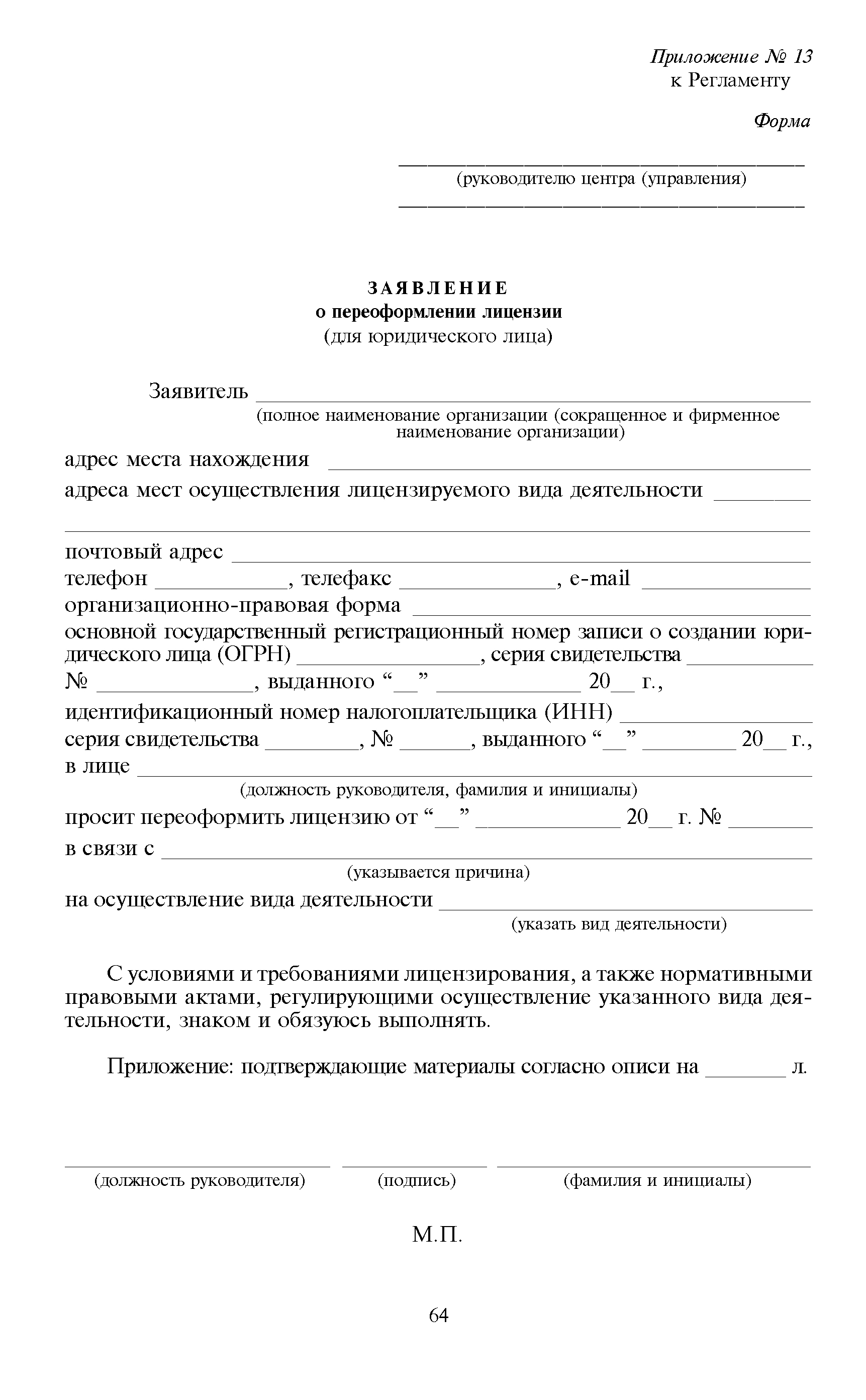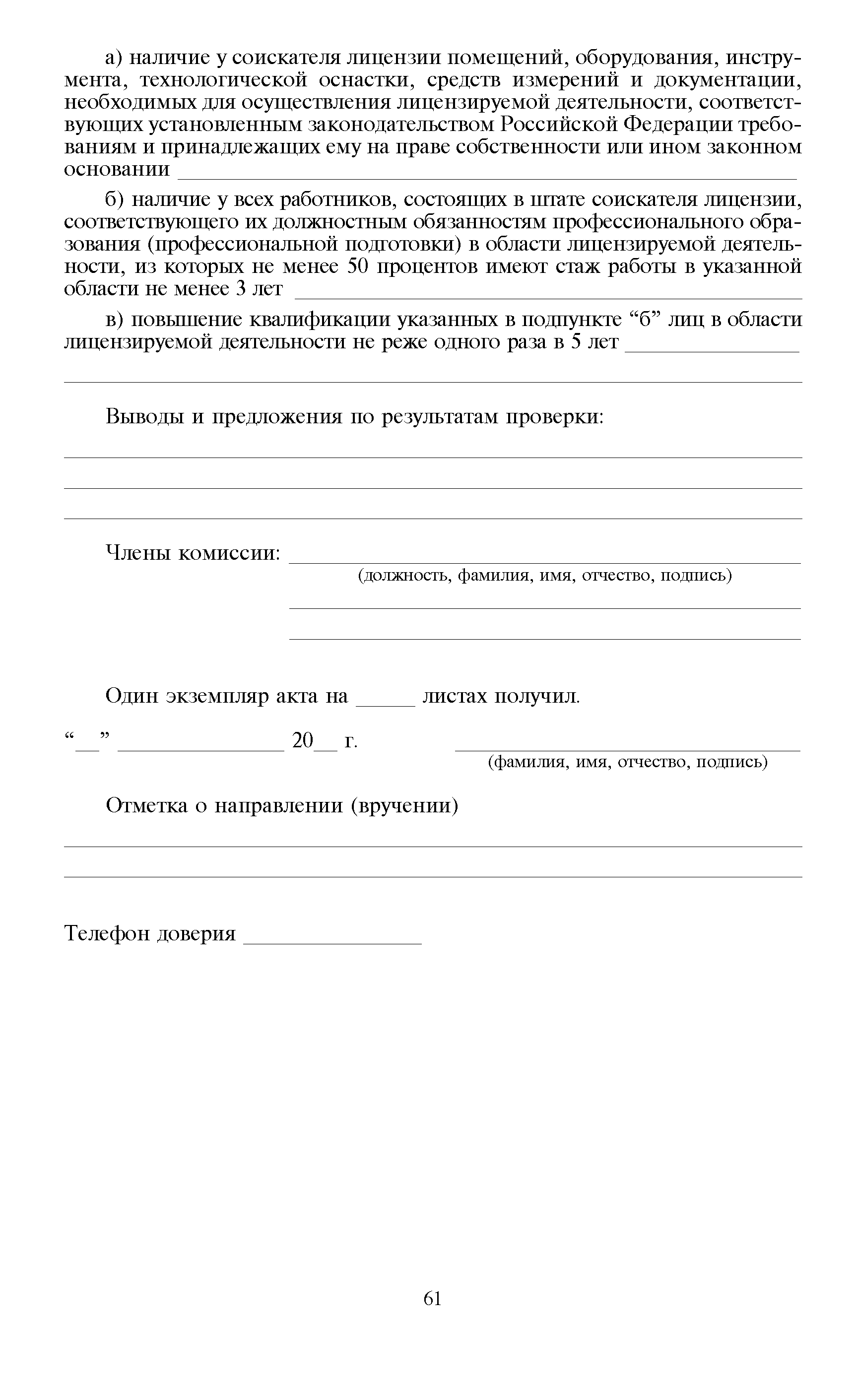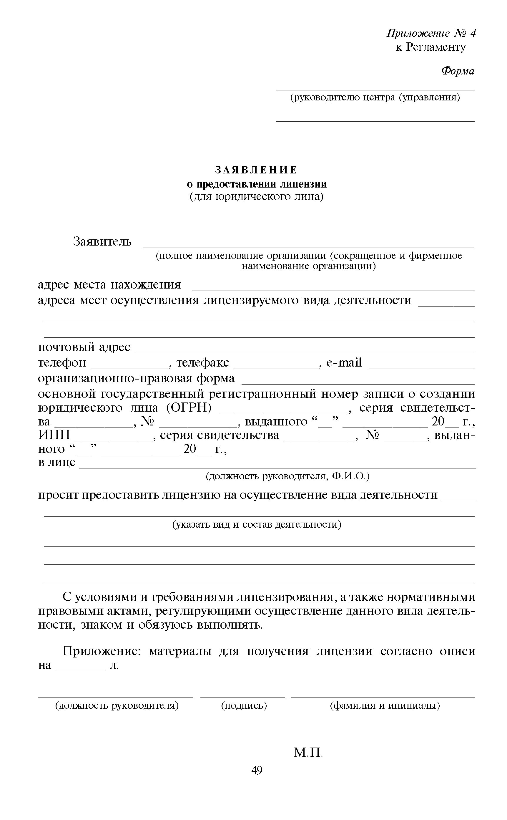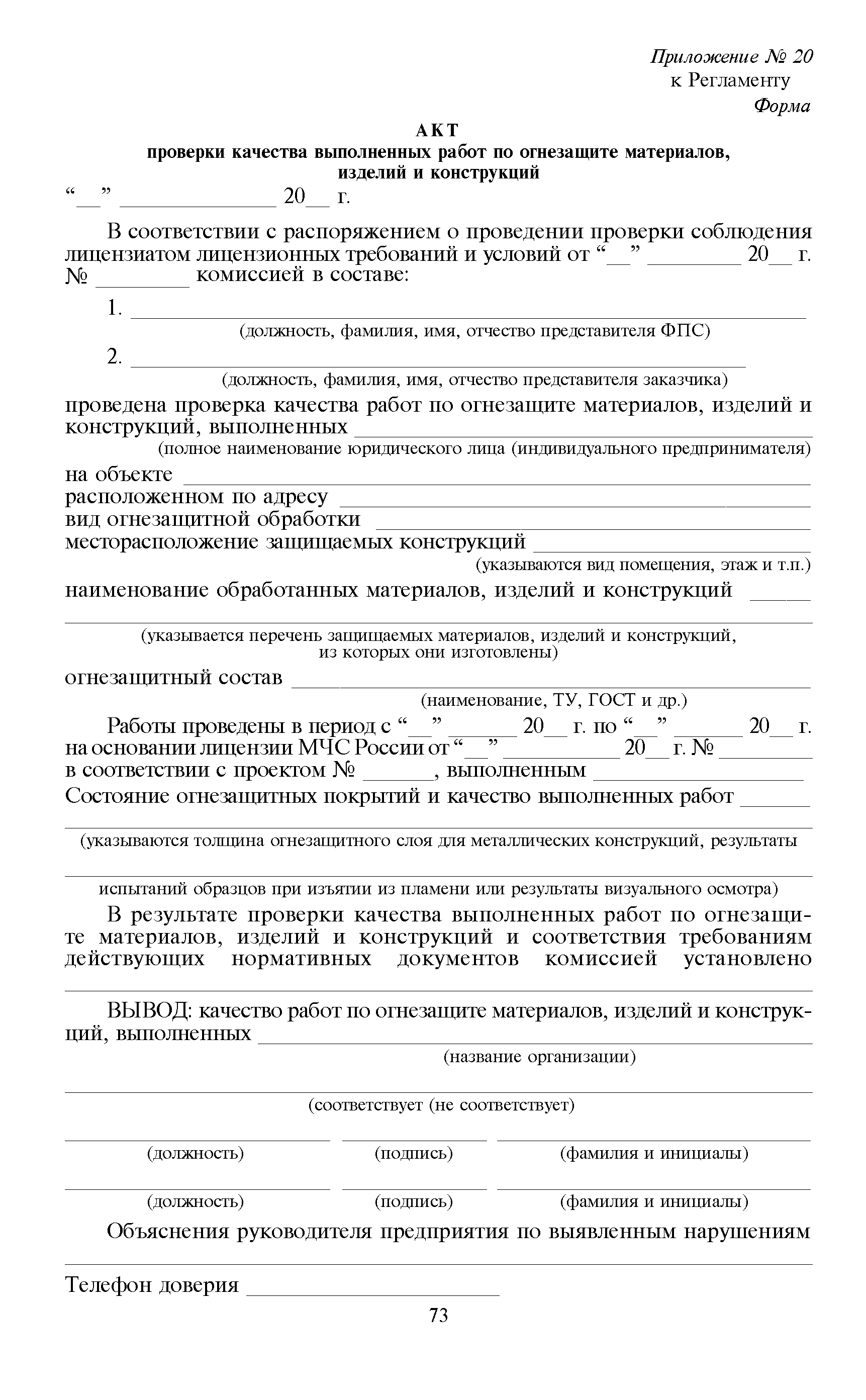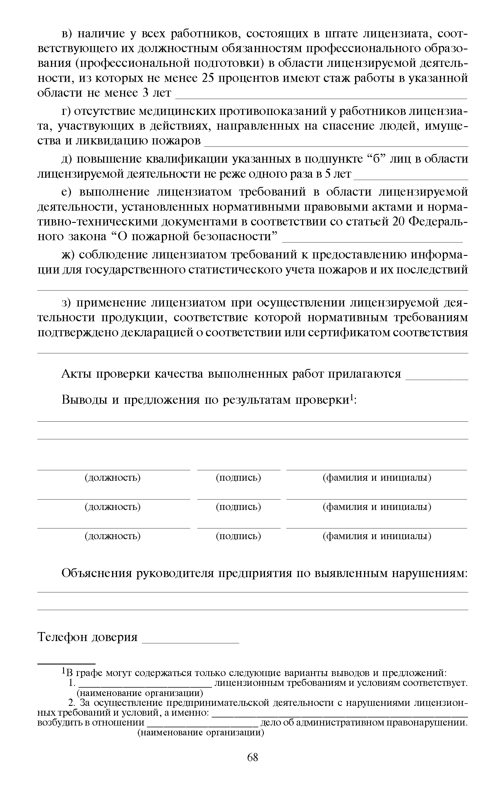 | Оглавление: | 1. Общие положения 2. Требования к порядку исполнения государственной функции 3. Административные процедуры 4. Порядок и формы контроля за исполнением государственной функции 5. Порядок обжалования действий (бездействий) должностного лица МЧС России, а также принимаемого им решения при исполнении административных процедур Приложение № 1. Административные процедуры, осуществляемые в связи с поступлением заявления и документов для предоставления лицензии, для переоформления документа, подтверждающего наличие лицензии Приложение № 2. Административные процедуры контроля за соблюдением лицензионных требований и условий Приложение № 3. Контактная информация о региональных центрах МЧС России и ГУ МЧС России по г. Москве, в которые направляются или представляются заявления и документы для предоставления лицензии Приложение № 4. Форма заявления о предоставлении лицензии для юридического лица Приложение № 5. Форма заявления о предоставлении лицензии для индивидуального предпринимателя Приложение № 6. Форма поручения о проведении проверки возможности выполнения соискателем лицензии лицензионных требований и условий Приложение № 7. Перечень ГУ МЧС России по субъектам РФ и контактная информация о них, которые обладают полномочиями по проведению проверки возможности выполнения лицензионных требований и условий соискателей лицензий Приложение № 8. Форма распоряжения о проведении проверки возможности выполнения соискателем лицензии лицензионных требований и условий при осуществлении лицензируемого вида деятельности Приложение № 9. Форма акта проверки возможности выполнения соискателем лицензии лицензионных требований и условий при осуществлении деятельности по тушению пожаров Приложение № 10. Форма акта проверки возможности выполнения соискателем лицензии лицензионных требований и условий при производстве работ по монтажу, ремонту и обслуживанию средств обеспечения пожарной безопасности зданий и сооружений Приложение № 11. Форма уведомления о предоставлении лицензии Приложение № 12. Форма уведомления об отказе в предоставлении лицензии Приложение № 13. Форма заявления о переоформлении лицензии для юридического лица Приложение № 14. Форма заявления о переоформлении лицензии для индивидуального предпринимателя Приложение № 15. Форма распоряжения о проведении проверки соблюдения лицензиатом лицензионных требований и условий при осуществлении лицензируемого вида деятельности Приложение № 16. Форма акта проверки соблюдения лицензиатом лицензионных требований и условий при осуществлении деятельности по тушению пожаров Приложение № 17. Форма акта проверки соблюдения лицензиатом лицензионных требований и условий при производстве работ по монтажу, ремонту и обслуживанию средств обеспечения пожарной безопасности зданий и сооружений Приложение № 18. Форма акта проверки качества выполненных работ по тушению пожаров Приложение № 19. Форма акта проверки качества выполненных работ по монтажу, ремонту и обслуживанию средств обеспечения пожарной безопасности зданий и сооружений Приложение № 20. Форма акта проверки качества выполненных работ по огнезащите материалов, изделий и конструкций Приложение № 21. Форма предписания лицензирующего органа Приложение № 22. Форма заявления о прекращении ос
