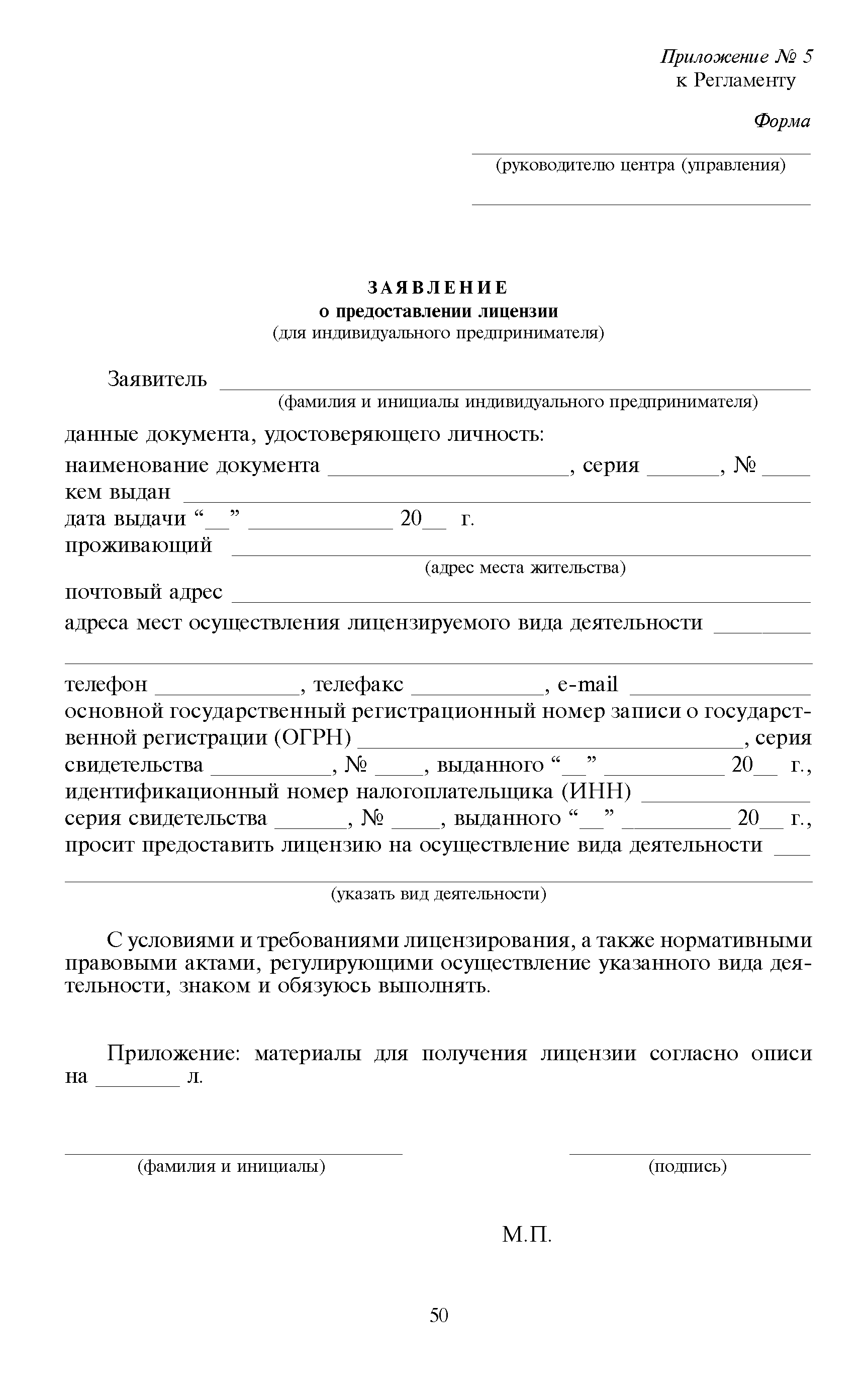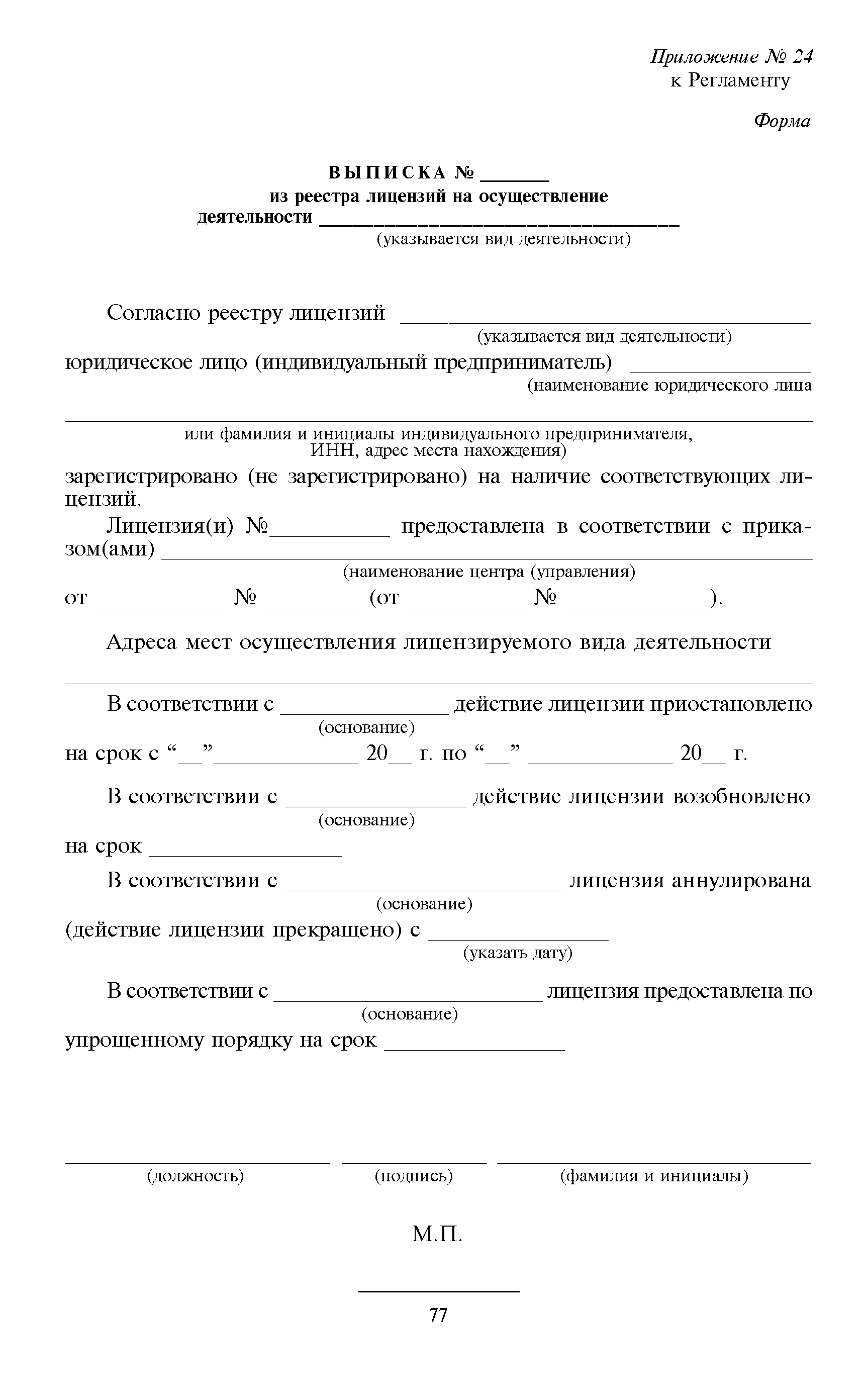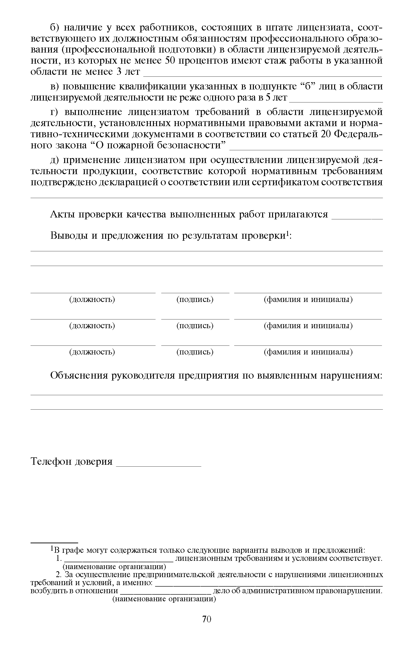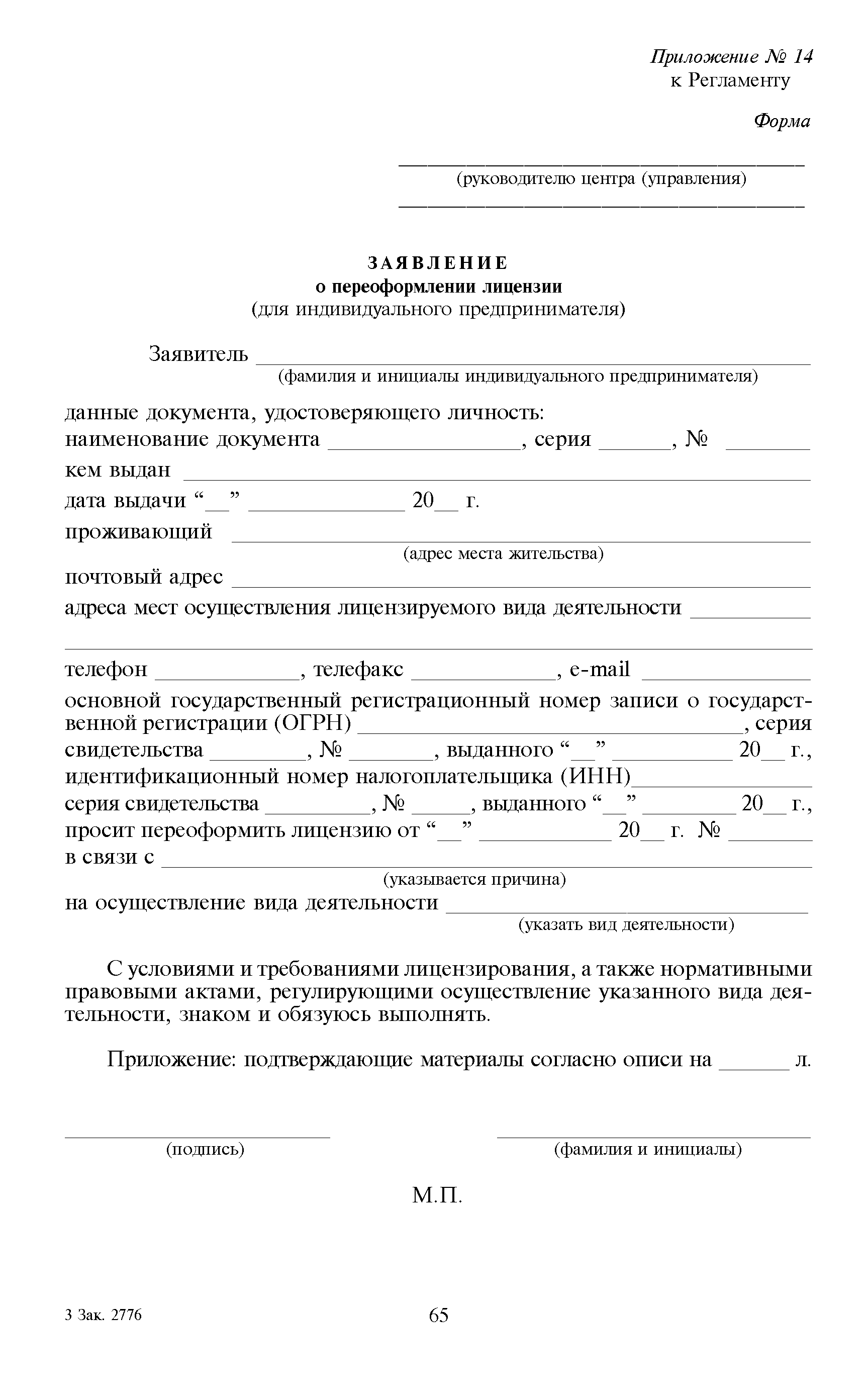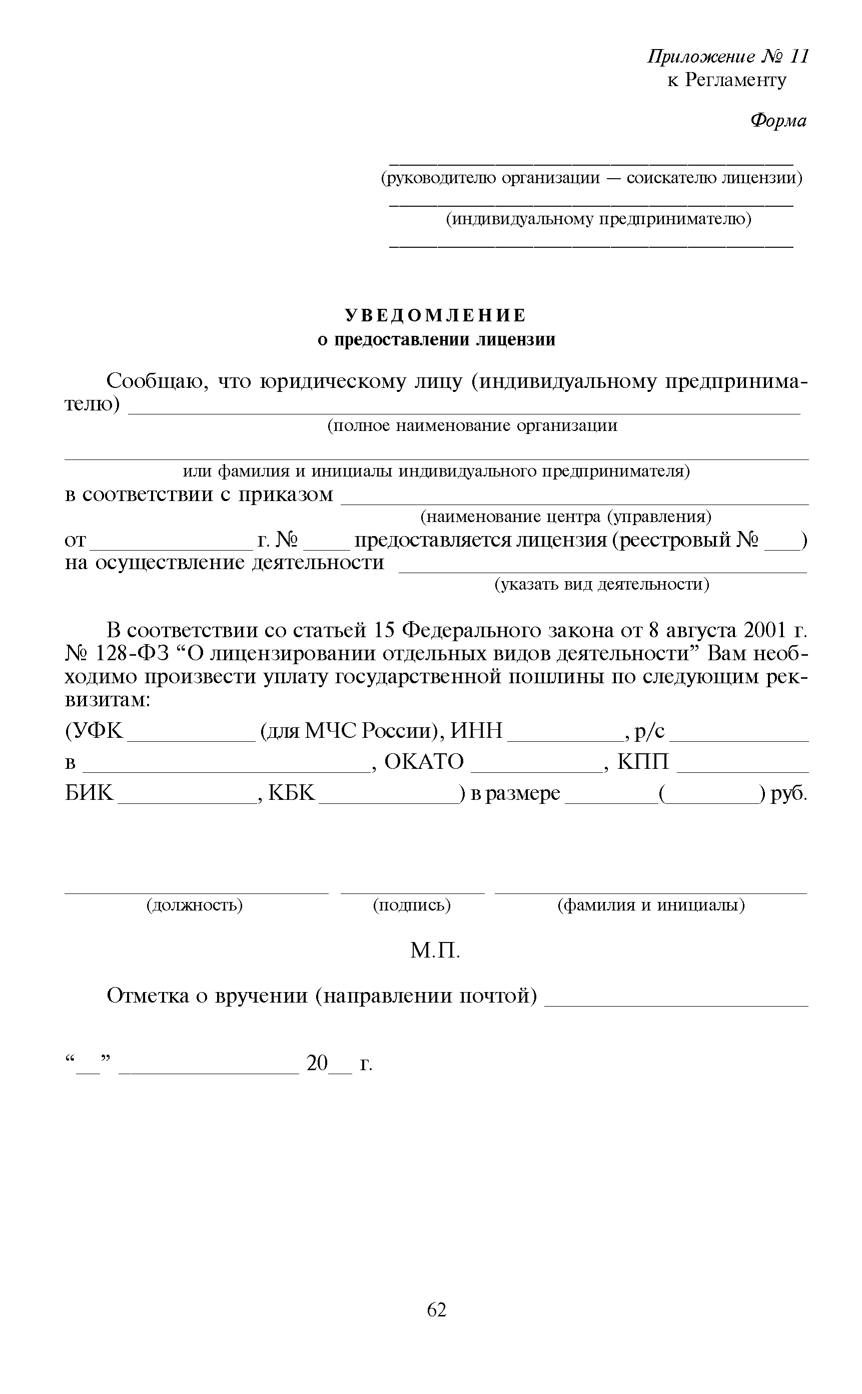 | Оглавление: | 1. Общие положения 2. Требования к порядку исполнения государственной функции 3. Административные процедуры 4. Порядок и формы контроля за исполнением государственной функции 5. Порядок обжалования действий (бездействий) должностного лица МЧС России, а также принимаемого им решения при исполнении административных процедур Приложение № 1. Административные процедуры, осуществляемые в связи с поступлением заявления и документов для предоставления лицензии, для переоформления документа, подтверждающего наличие лицензии Приложение № 2. Административные процедуры контроля за соблюдением лицензионных требований и условий Приложение № 3. Контактная информация о региональных центрах МЧС России и ГУ МЧС России по г. Москве, в которые направляются или представляются заявления и документы для предоставления лицензии Приложение № 4. Форма заявления о предоставлении лицензии для юридического лица Приложение № 5. Форма заявления о предоставлении лицензии для индивидуального предпринимателя Приложение № 6. Форма поручения о проведении проверки возможности выполнения соискателем лицензии лицензионных требований и условий Приложение № 7. Перечень ГУ МЧС России по субъектам РФ и контактная информация о них, которые обладают полномочиями по проведению проверки возможности выполнения лицензионных требований и условий соискателей лицензий Приложение № 8. Форма распоряжения о проведении проверки возможности выполнения соискателем лицензии лицензионных требований и условий при осуществлении лицензируемого вида деятельности Приложение № 9. Форма акта проверки возможности выполнения соискателем лицензии лицензионных требований и условий при осуществлении деятельности по тушению пожаров Приложение № 10. Форма акта проверки возможности выполнения соискателем лицензии лицензионных требований и условий при производстве работ по монтажу, ремонту и обслуживанию средств обеспечения пожарной безопасности зданий и сооружений Приложение № 11. Форма уведомления о предоставлении лицензии Приложение № 12. Форма уведомления об отказе в предоставлении лицензии Приложение № 13. Форма заявления о переоформлении лицензии для юридического лица Приложение № 14. Форма заявления о переоформлении лицензии для индивидуального предпринимателя Приложение № 15. Форма распоряжения о проведении проверки соблюдения лицензиатом лицензионных требований и условий при осуществлении лицензируемого вида деятельности Приложение № 16. Форма акта проверки соблюдения лицензиатом лицензионных требований и условий при осуществлении деятельности по тушению пожаров Приложение № 17. Форма акта проверки соблюдения лицензиатом лицензионных требований и условий при производстве работ по монтажу, ремонту и обслуживанию средств обеспечения пожарной безопасности зданий и сооружений Приложение № 18. Форма акта проверки качества выполненных работ по тушению пожаров Приложение № 19. Форма акта проверки качества выполненных работ по монтажу, ремонту и обслуживанию средств обеспечения пожарной безопасности зданий и сооружений Приложение № 20. Форма акта проверки качества выполненных работ по огнезащите материалов, изделий и конструкций Приложение № 21. Форма предписания лицензирующего органа Приложение № 22. Форма заявления о прекращении ос