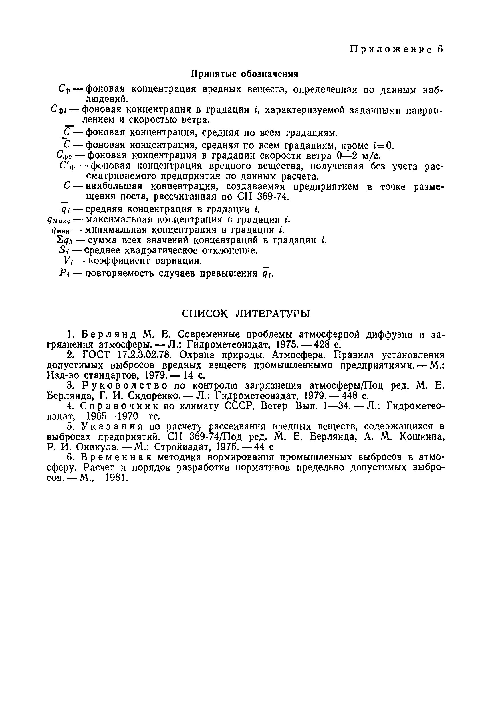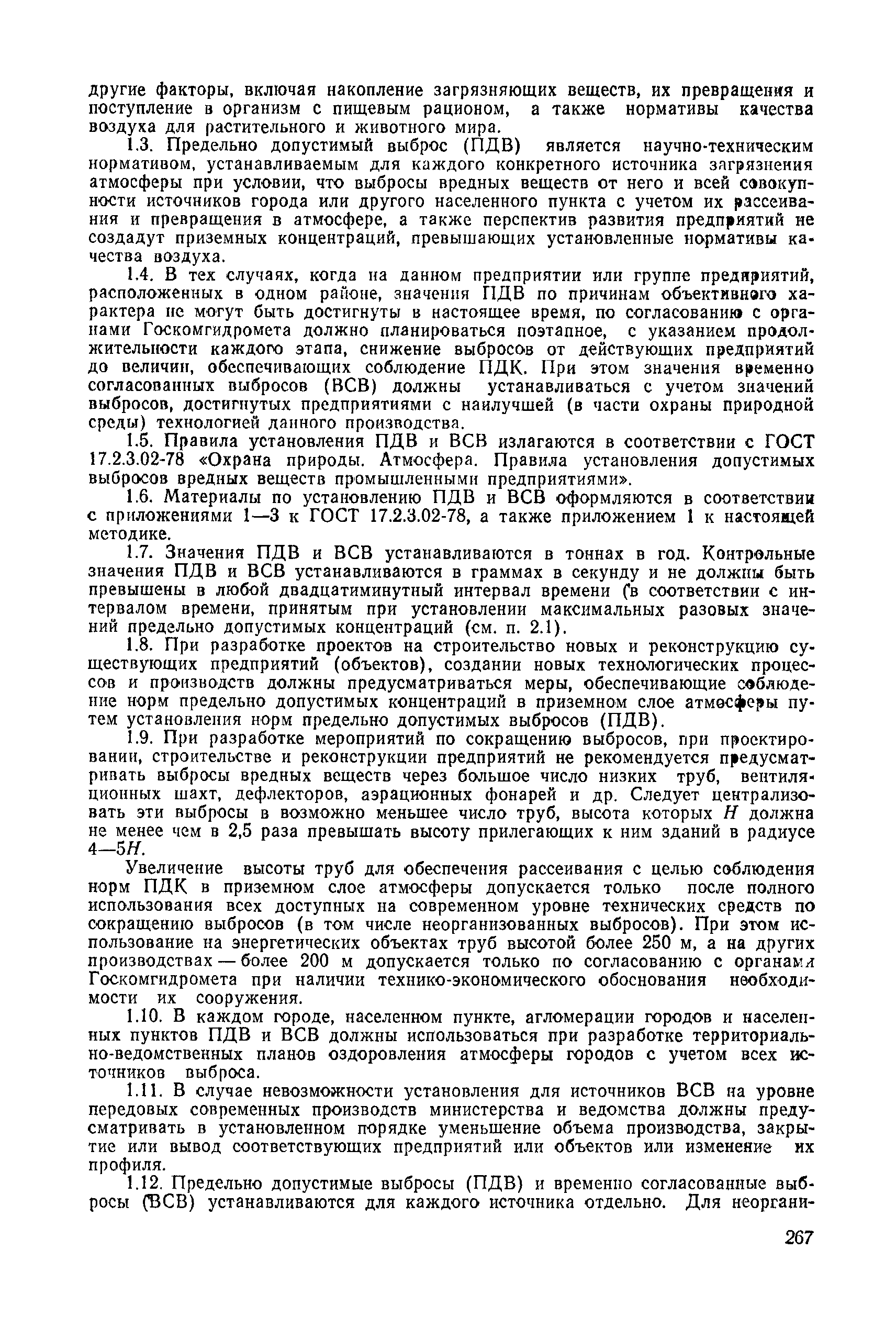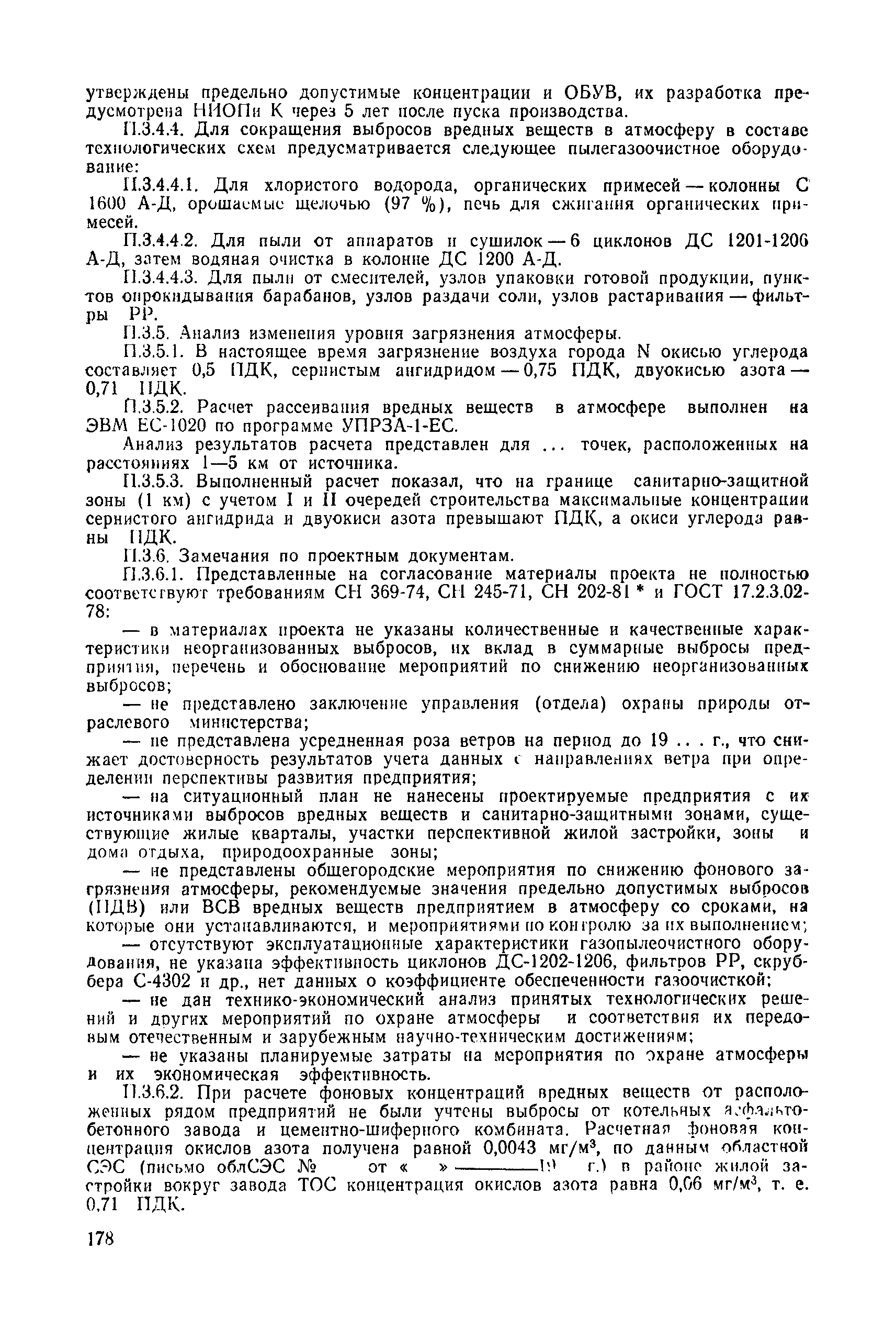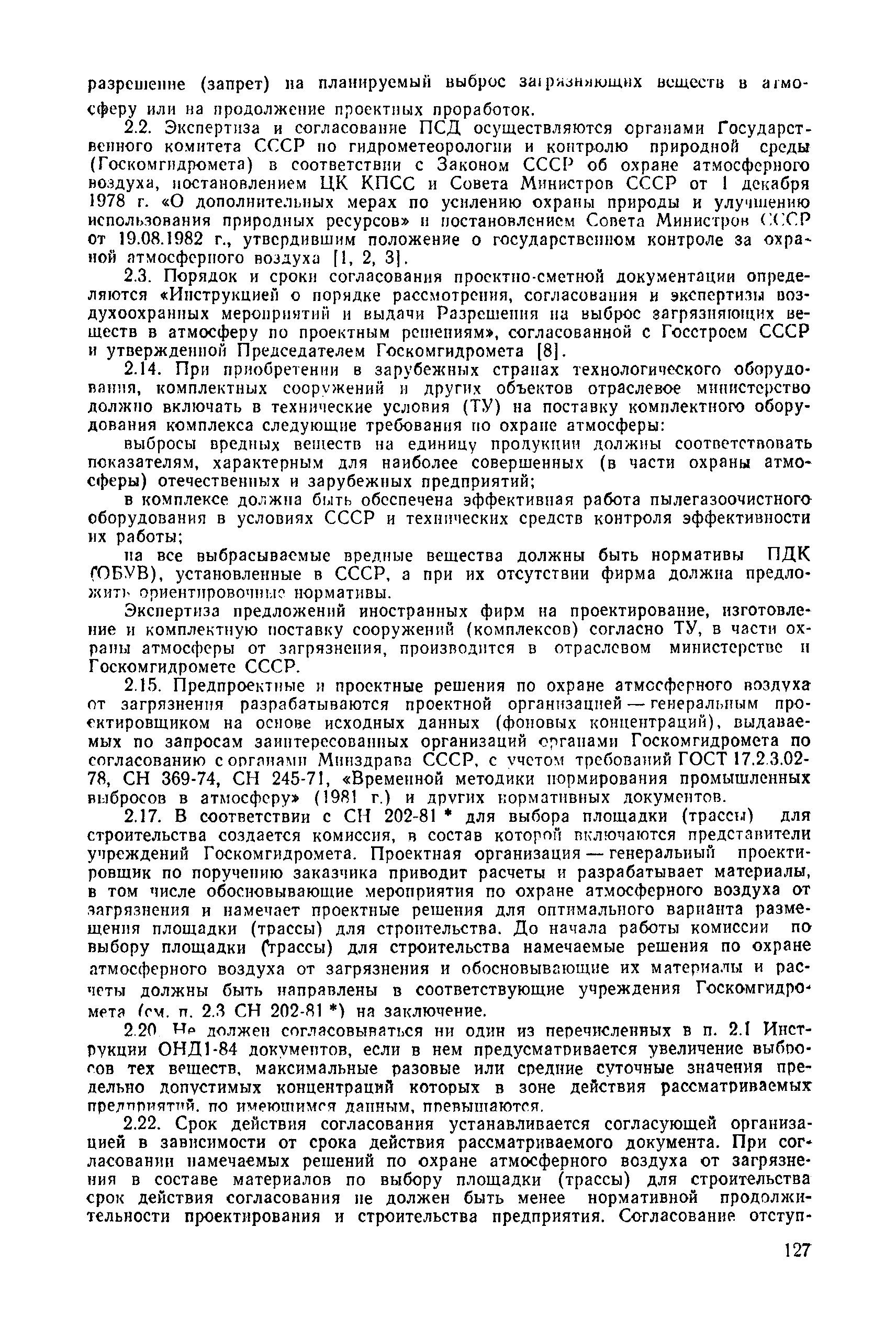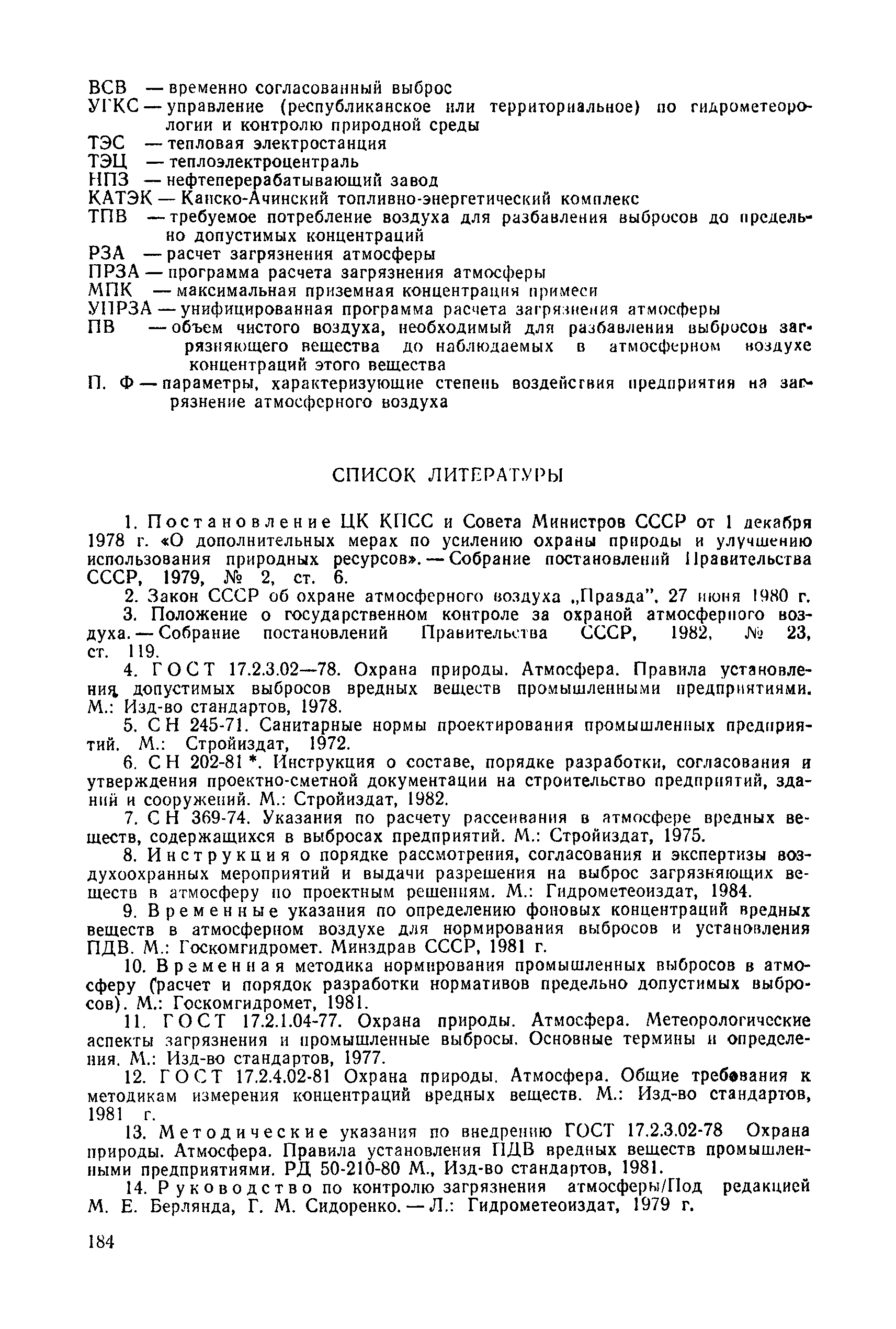 | | Нормативные ссылки: |   СН 387-78 «Инструкция по разработке схем генеральных планов групп предприятий с общими объектами (промышленных узлов)»  СН 245-71 «Санитарные нормы проектирования промышленных предприятий»  ГОСТ 17.2.3.02-78 «Охрана природы. Атмосфера. Правила установления допустимых выбросов вредных веществ промышленными предприятиями»  ОНД 1-84 «Инструкция о порядке рассмотрения, согласования и экспертизы воздухоохранных мероприятий и выдачи разрешений на выброс загрязняющих веществ в атмосферу по проектным решениям» РД 50-210-80 «Методические указания по внедрению ГОСТ 17.2.3.02-78 "Охрана природы. Атмосфера. Правила установления допустимых выбросов вредных веществ промышленными предприятиями"» СН 202-81 «Инструкция о составе, порядке разработки, согласования и утверждения проектов и смет на строительство предприятий, зданий и сооружений» ВСН 38-82/Госгражданстрой «Инструкция о составе, порядке разработки, согласования и утверждения схем и проектов районной планировки, планировки и застройки городов, поселков и сельских населенных пунктов» СНиП III-3-81 «Приемка в эксплуатацию законченных строительством объектов. Основные положения» СНиП II-33-75 «Отопление, вентиляция и кондиционирование воздуха»  СНиП 1.01.03-83* «Система нормативных документов в строительстве. Правила изложения и оформления нормативных документов и их изменений» СН 369-74 «Указания по расчету рассеивания в атмосфере вредных веществ, содержащихся в выбросах предприятий»