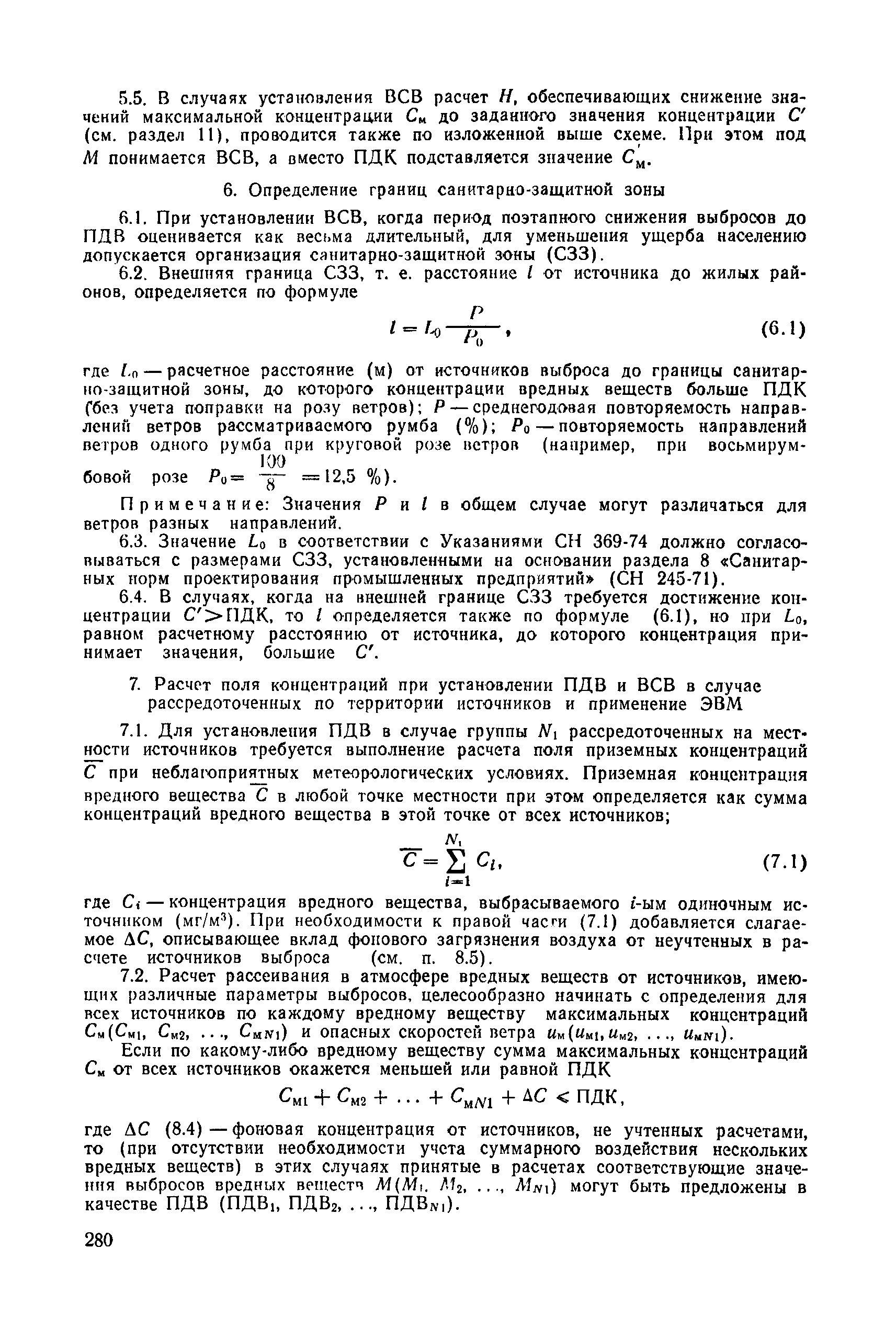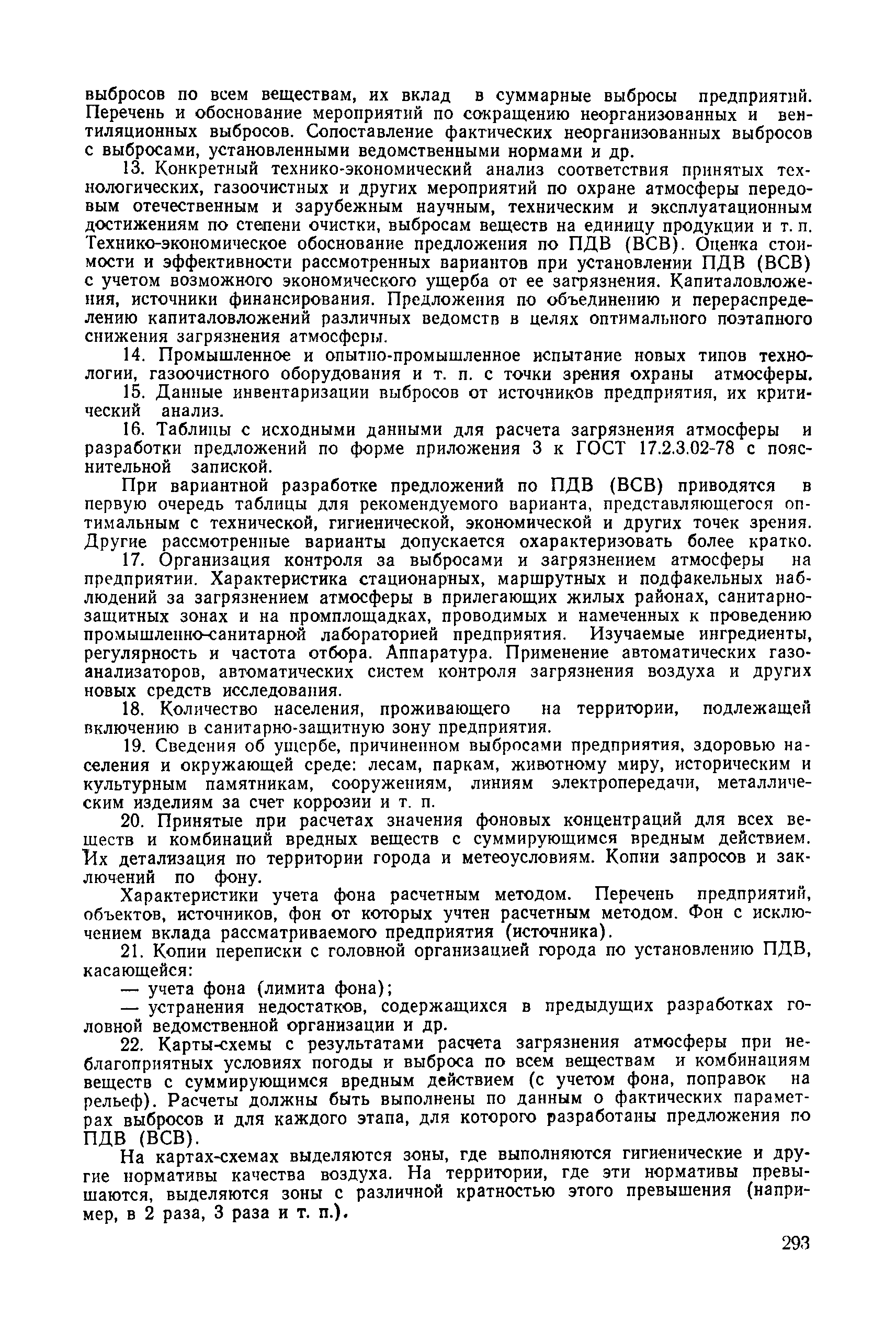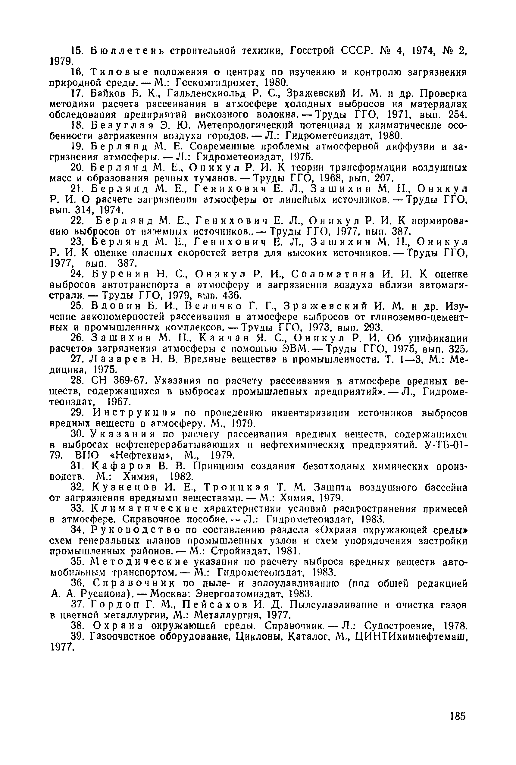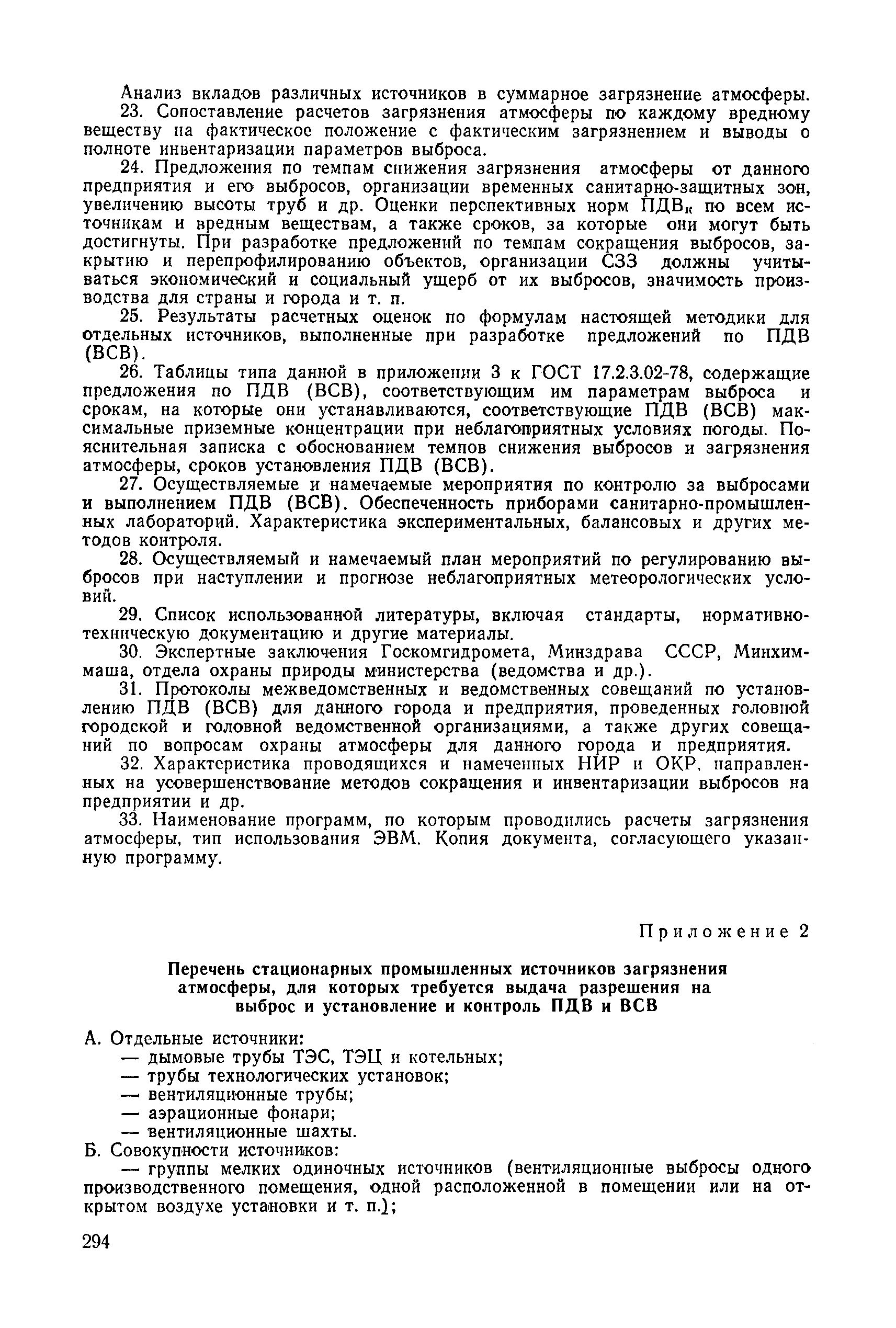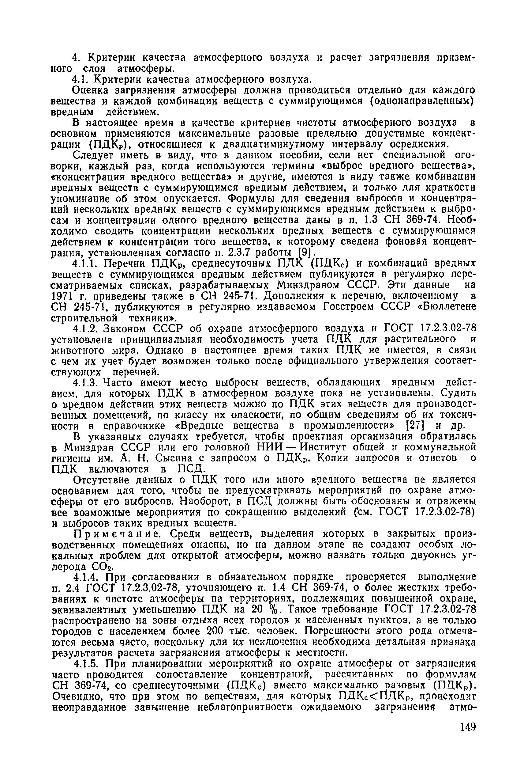 | | Нормативные ссылки: |   СН 387-78 «Инструкция по разработке схем генеральных планов групп предприятий с общими объектами (промышленных узлов)»  СН 245-71 «Санитарные нормы проектирования промышленных предприятий»  ГОСТ 17.2.3.02-78 «Охрана природы. Атмосфера. Правила установления допустимых выбросов вредных веществ промышленными предприятиями»  ОНД 1-84 «Инструкция о порядке рассмотрения, согласования и экспертизы воздухоохранных мероприятий и выдачи разрешений на выброс загрязняющих веществ в атмосферу по проектным решениям» РД 50-210-80 «Методические указания по внедрению ГОСТ 17.2.3.02-78 "Охрана природы. Атмосфера. Правила установления допустимых выбросов вредных веществ промышленными предприятиями"» СН 202-81 «Инструкция о составе, порядке разработки, согласования и утверждения проектов и смет на строительство предприятий, зданий и сооружений» ВСН 38-82/Госгражданстрой «Инструкция о составе, порядке разработки, согласования и утверждения схем и проектов районной планировки, планировки и застройки городов, поселков и сельских населенных пунктов» СНиП III-3-81 «Приемка в эксплуатацию законченных строительством объектов. Основные положения» СНиП II-33-75 «Отопление, вентиляция и кондиционирование воздуха»  СНиП 1.01.03-83* «Система нормативных документов в строительстве. Правила изложения и оформления нормативных документов и их изменений» СН 369-74 «Указания по расчету рассеивания в атмосфере вредных веществ, содержащихся в выбросах предприятий»
