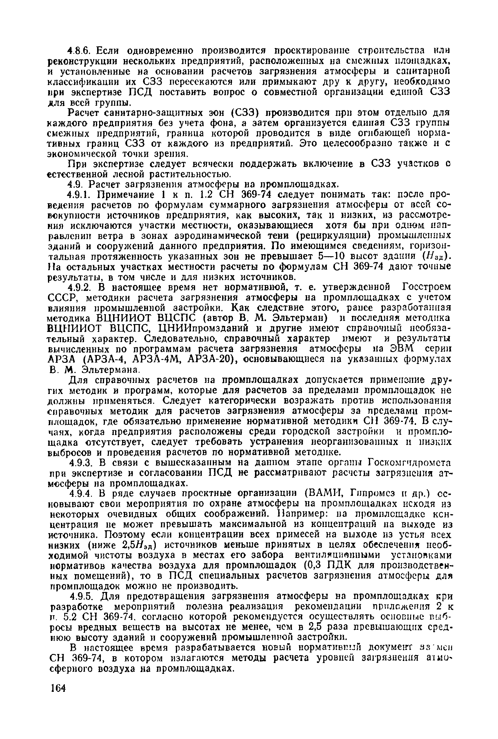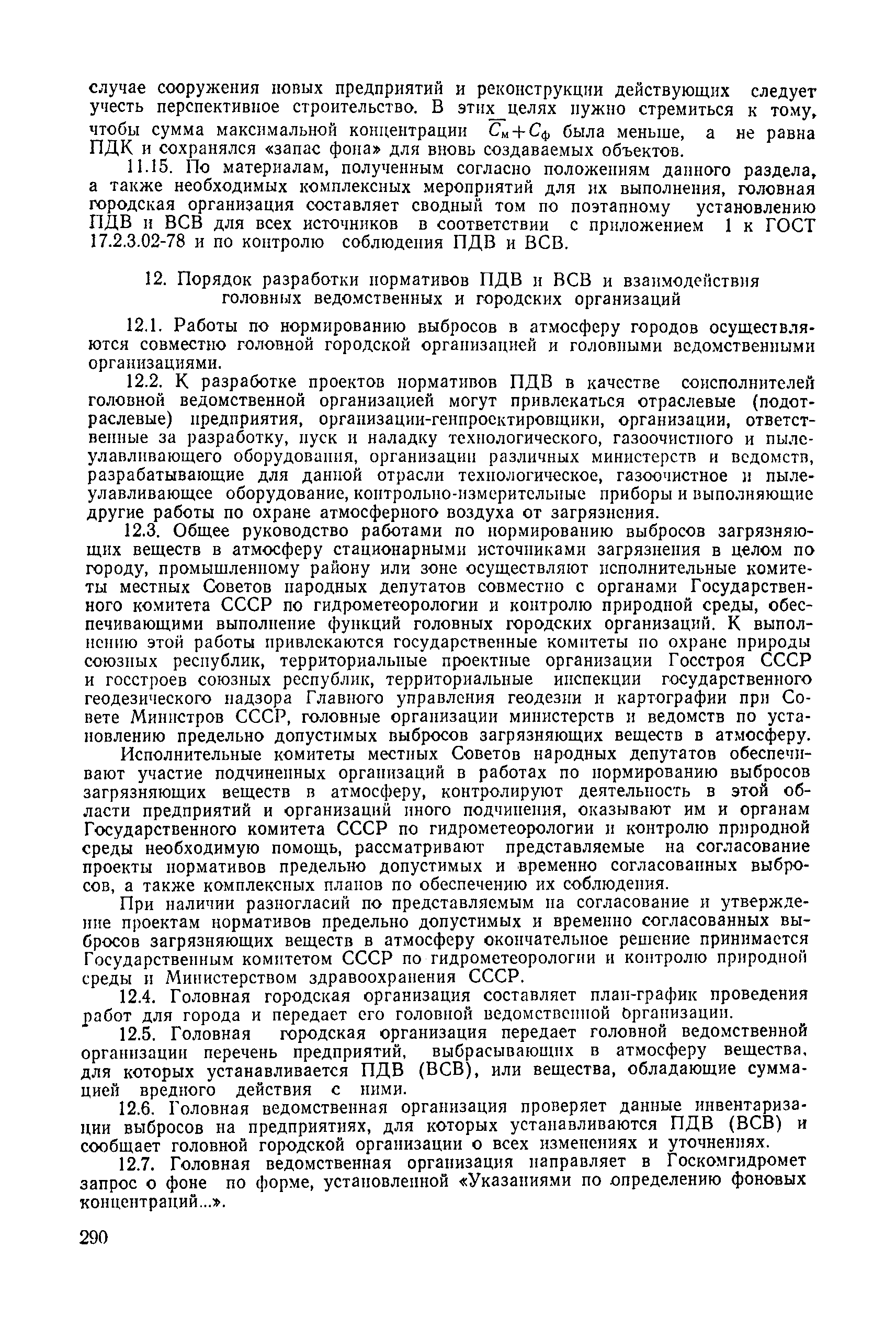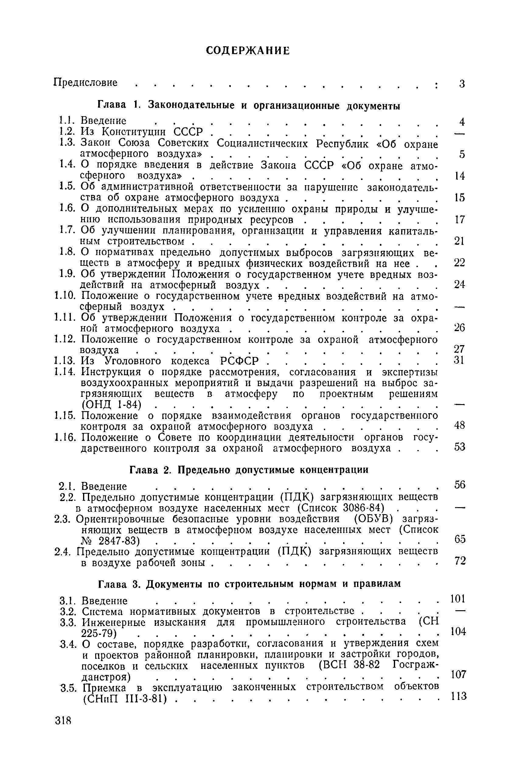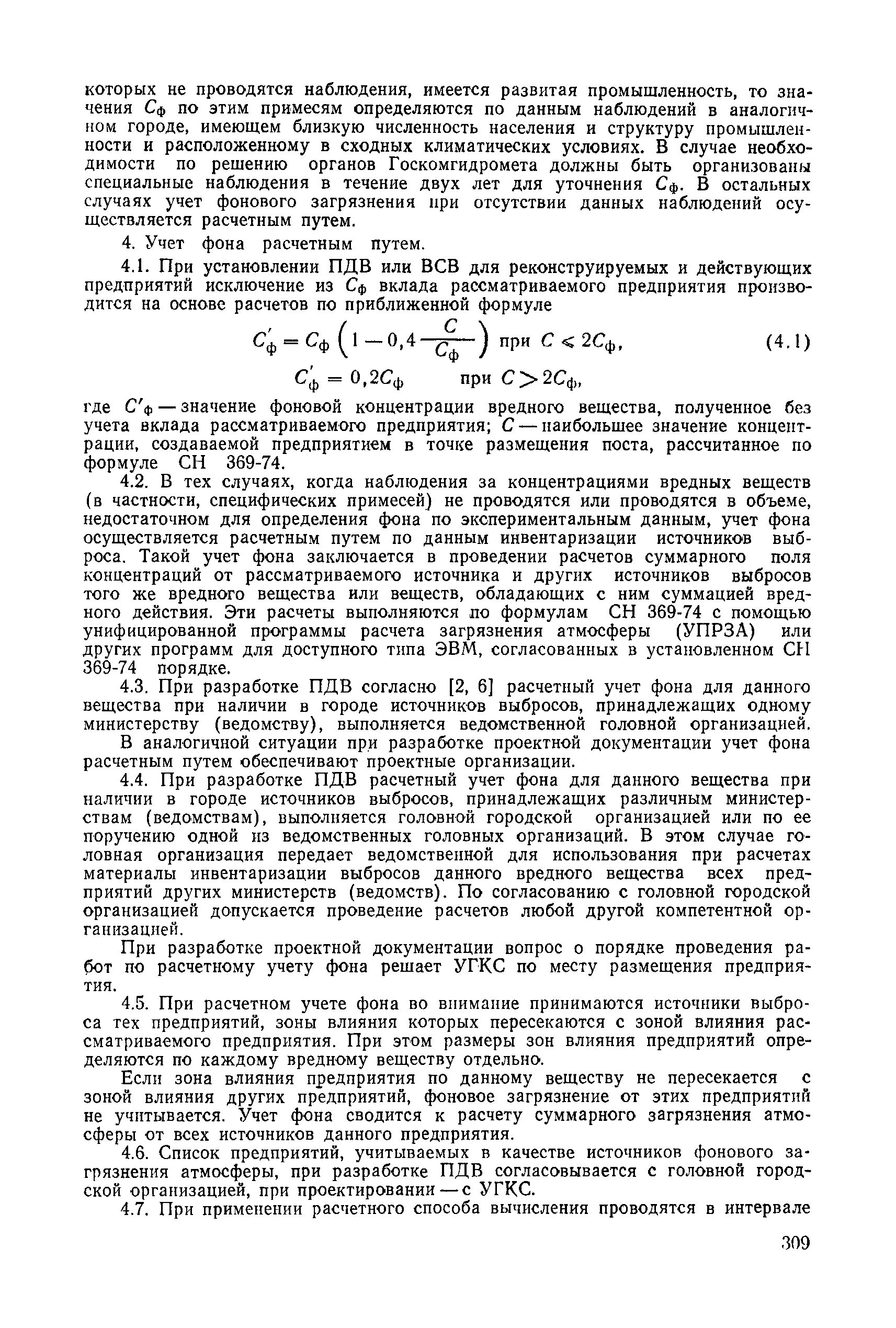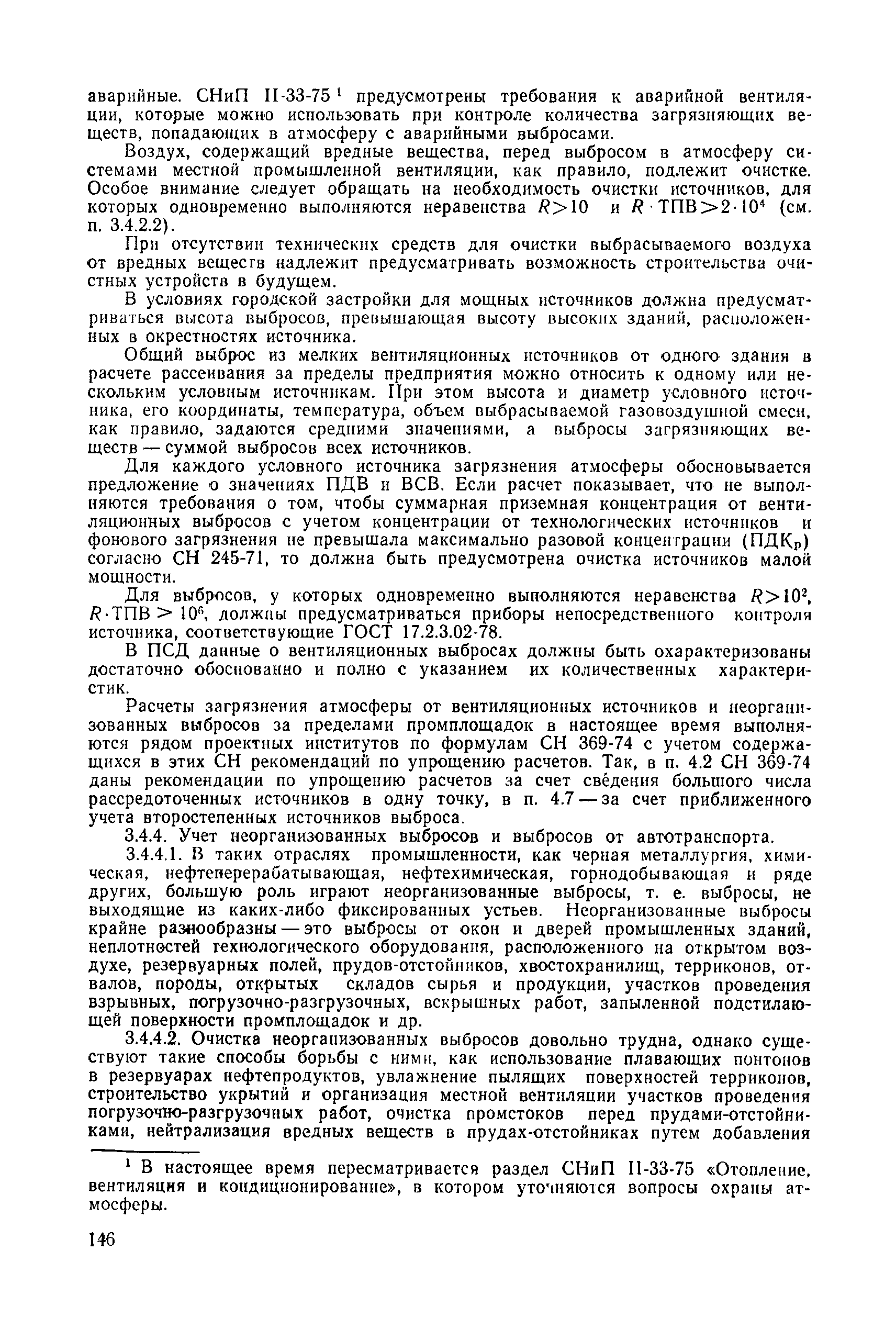 | | Нормативные ссылки: |   СН 387-78 «Инструкция по разработке схем генеральных планов групп предприятий с общими объектами (промышленных узлов)»  СН 245-71 «Санитарные нормы проектирования промышленных предприятий»  ГОСТ 17.2.3.02-78 «Охрана природы. Атмосфера. Правила установления допустимых выбросов вредных веществ промышленными предприятиями»  ОНД 1-84 «Инструкция о порядке рассмотрения, согласования и экспертизы воздухоохранных мероприятий и выдачи разрешений на выброс загрязняющих веществ в атмосферу по проектным решениям» РД 50-210-80 «Методические указания по внедрению ГОСТ 17.2.3.02-78 "Охрана природы. Атмосфера. Правила установления допустимых выбросов вредных веществ промышленными предприятиями"» СН 202-81 «Инструкция о составе, порядке разработки, согласования и утверждения проектов и смет на строительство предприятий, зданий и сооружений» ВСН 38-82/Госгражданстрой «Инструкция о составе, порядке разработки, согласования и утверждения схем и проектов районной планировки, планировки и застройки городов, поселков и сельских населенных пунктов» СНиП III-3-81 «Приемка в эксплуатацию законченных строительством объектов. Основные положения» СНиП II-33-75 «Отопление, вентиляция и кондиционирование воздуха»  СНиП 1.01.03-83* «Система нормативных документов в строительстве. Правила изложения и оформления нормативных документов и их изменений» СН 369-74 «Указания по расчету рассеивания в атмосфере вредных веществ, содержащихся в выбросах предприятий»