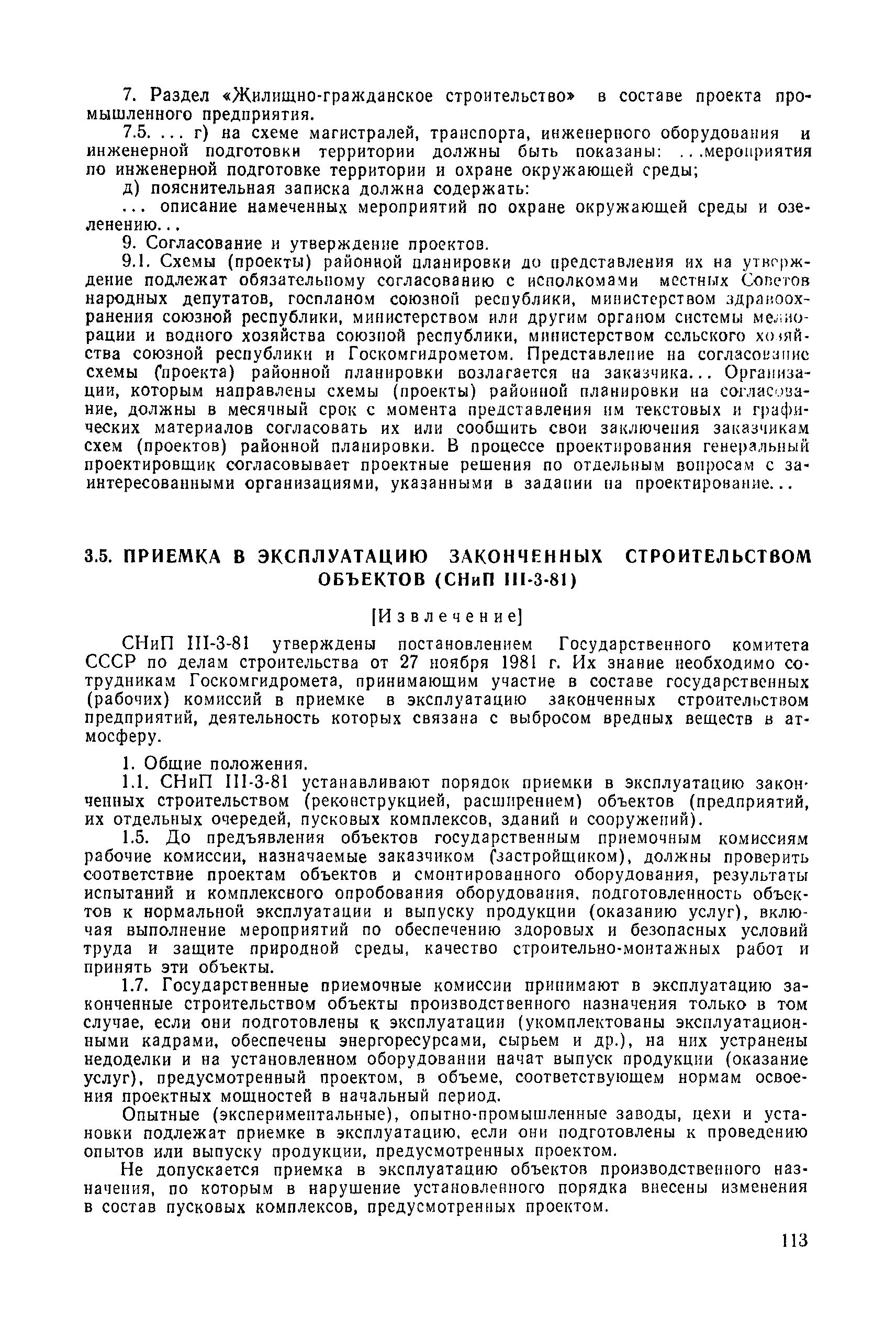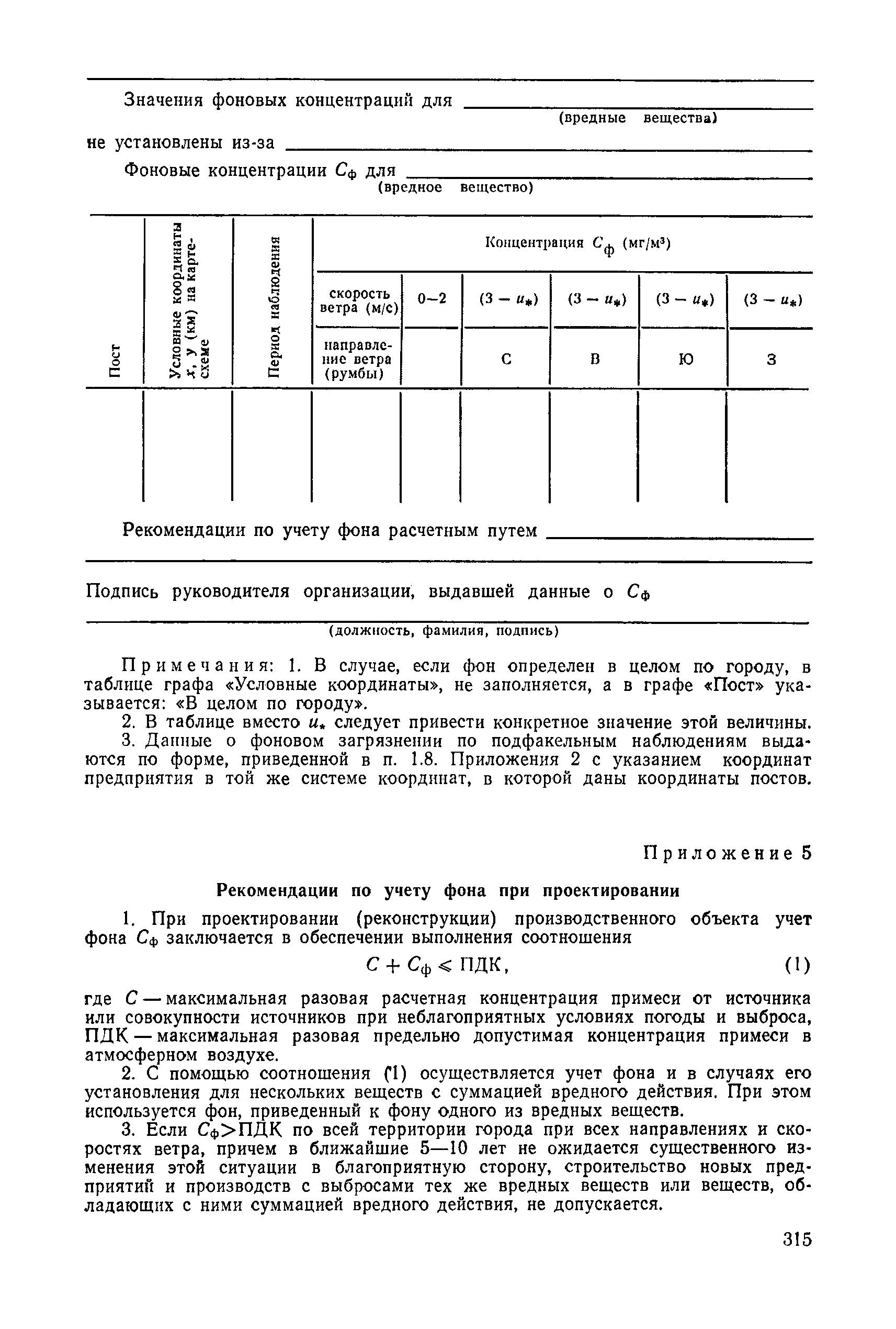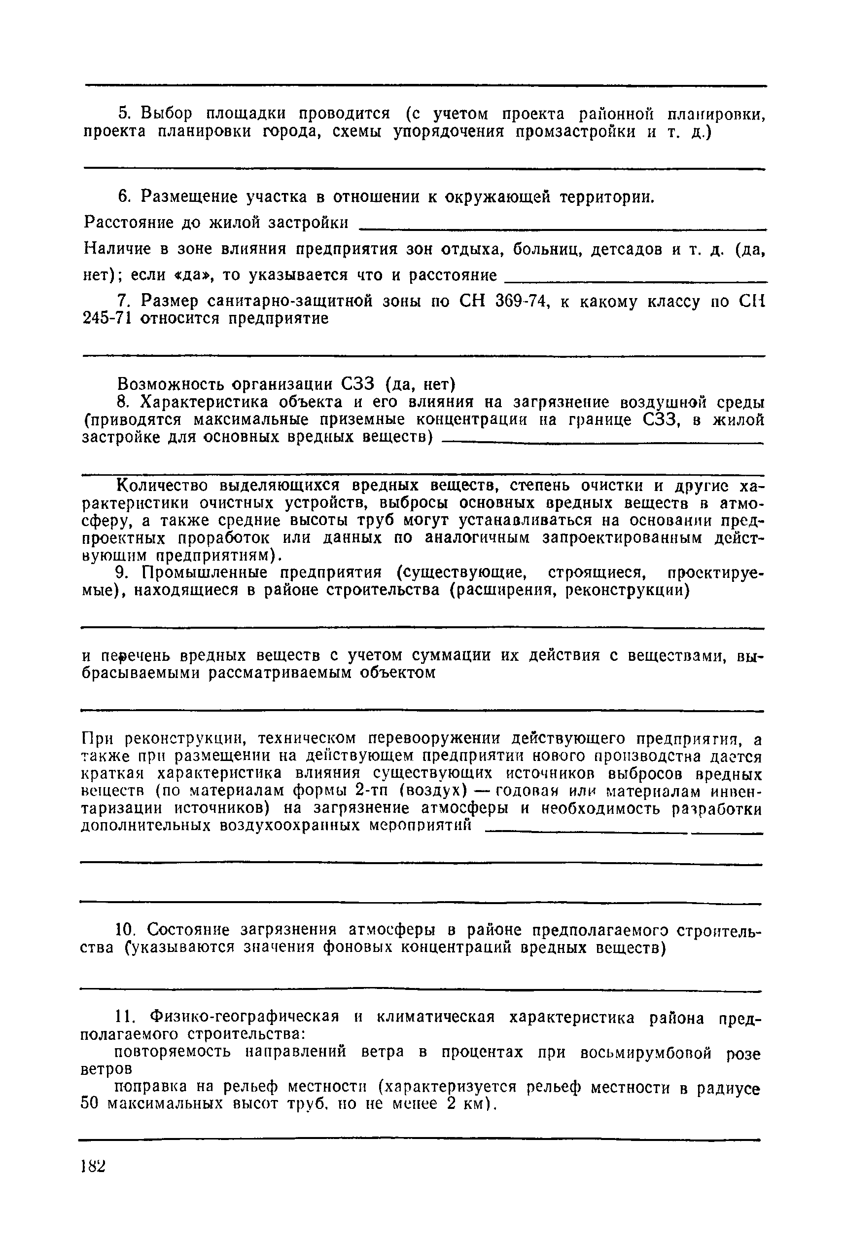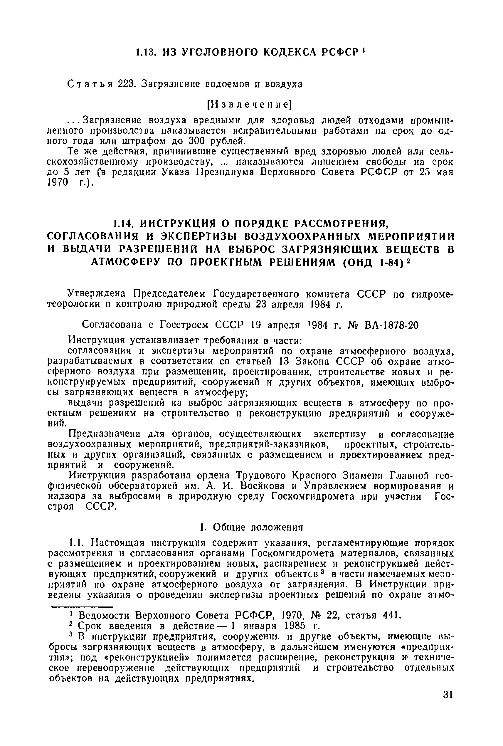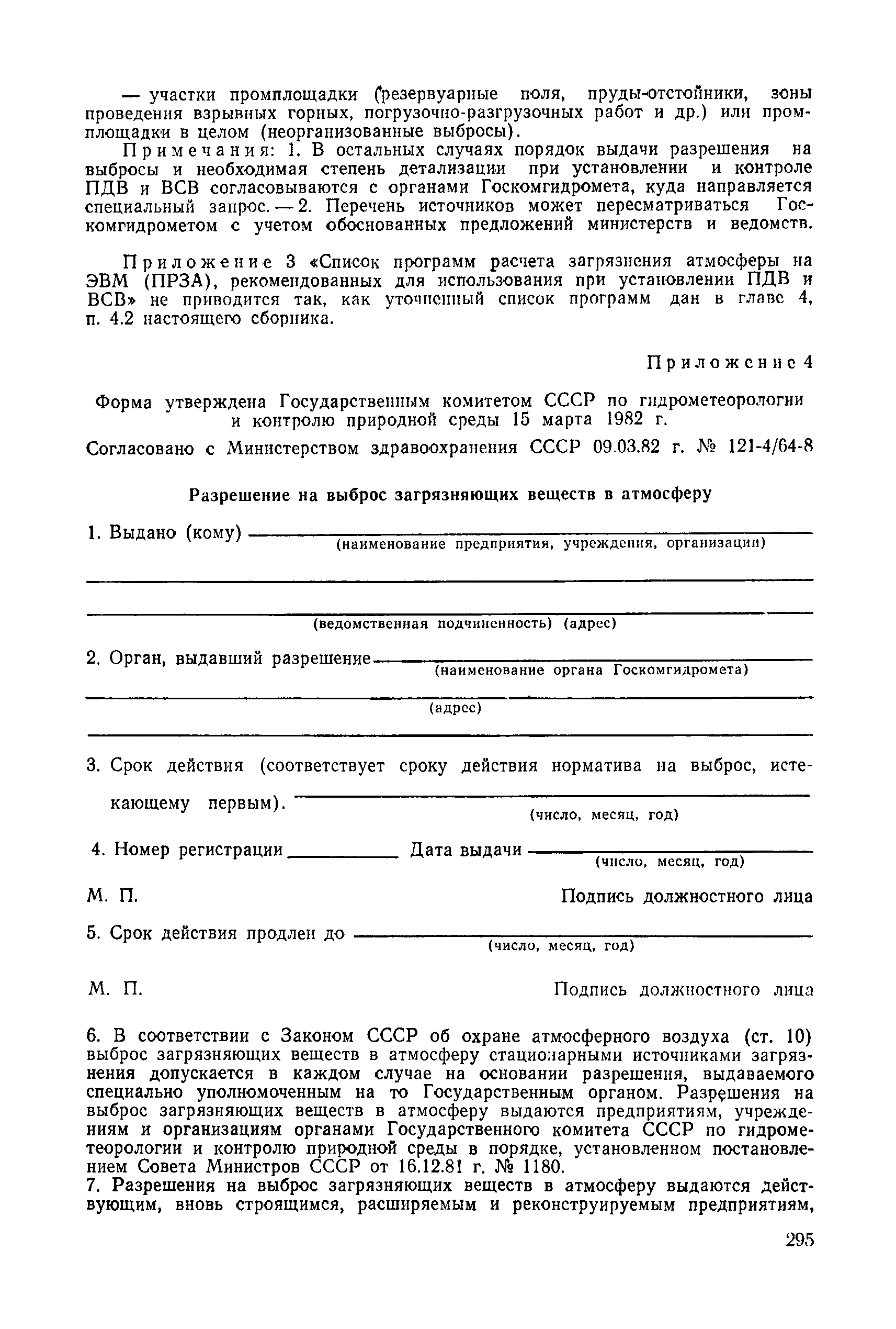 | | Нормативные ссылки: |   СН 387-78 «Инструкция по разработке схем генеральных планов групп предприятий с общими объектами (промышленных узлов)»  СН 245-71 «Санитарные нормы проектирования промышленных предприятий»  ГОСТ 17.2.3.02-78 «Охрана природы. Атмосфера. Правила установления допустимых выбросов вредных веществ промышленными предприятиями»  ОНД 1-84 «Инструкция о порядке рассмотрения, согласования и экспертизы воздухоохранных мероприятий и выдачи разрешений на выброс загрязняющих веществ в атмосферу по проектным решениям» РД 50-210-80 «Методические указания по внедрению ГОСТ 17.2.3.02-78 "Охрана природы. Атмосфера. Правила установления допустимых выбросов вредных веществ промышленными предприятиями"» СН 202-81 «Инструкция о составе, порядке разработки, согласования и утверждения проектов и смет на строительство предприятий, зданий и сооружений» ВСН 38-82/Госгражданстрой «Инструкция о составе, порядке разработки, согласования и утверждения схем и проектов районной планировки, планировки и застройки городов, поселков и сельских населенных пунктов» СНиП III-3-81 «Приемка в эксплуатацию законченных строительством объектов. Основные положения» СНиП II-33-75 «Отопление, вентиляция и кондиционирование воздуха»  СНиП 1.01.03-83* «Система нормативных документов в строительстве. Правила изложения и оформления нормативных документов и их изменений» СН 369-74 «Указания по расчету рассеивания в атмосфере вредных веществ, содержащихся в выбросах предприятий»