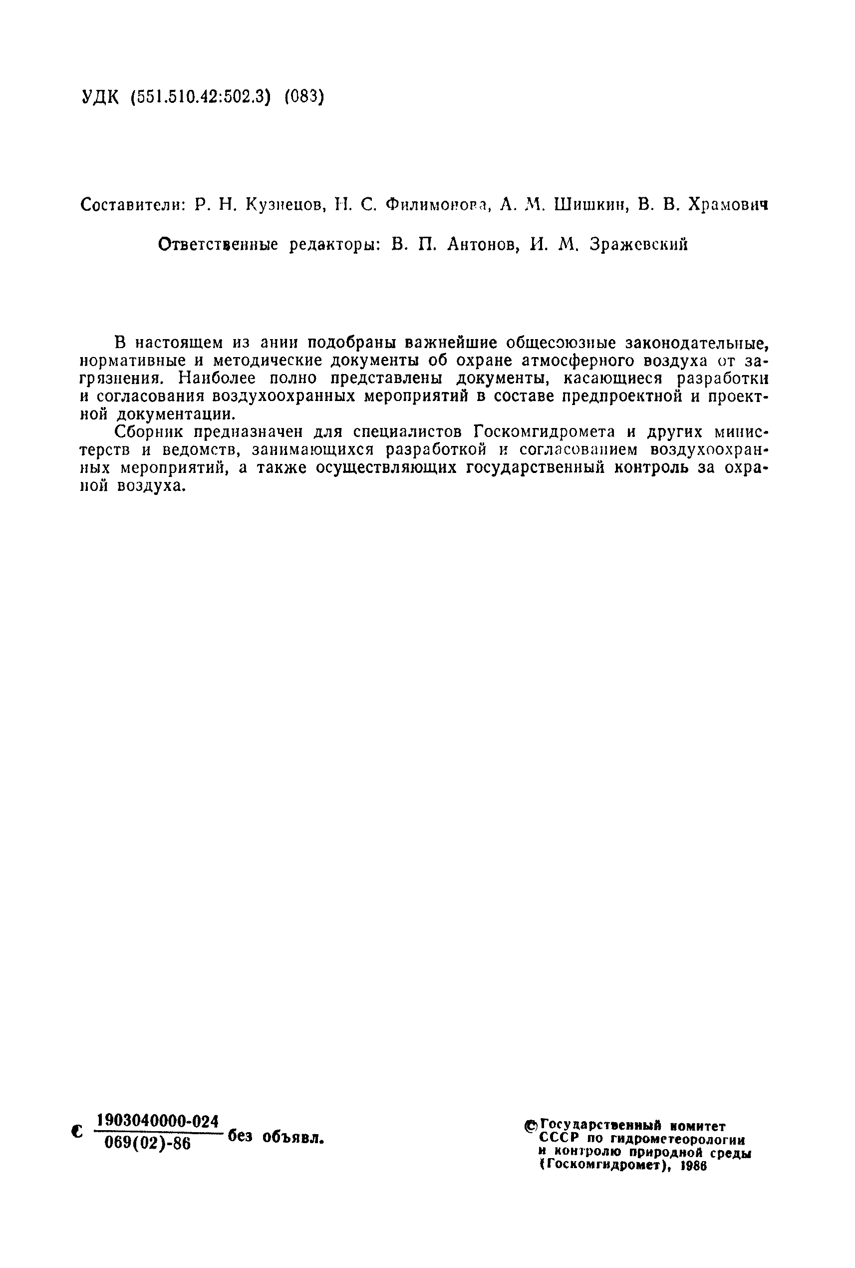 Сборник законодательных нормативных и методических документов для экспертизы воздухоохранных мероприятий| Статус: | справочные материалы, мп, тпр | | Название рус.: | Сборник законодательных нормативных и методических документов для экспертизы воздухоохранных мероприятий | | Дата добавления в базу: | 01.02.2020 | | Дата актуализации: | 01.01.2021 | | Область применения: | В издании подобраны важнейшие общесоюзные законодательные, нормативные и методические документы об охране атмосферного воздуха от загрязнения. Наиболее полно представлены документы, касающиеся разработки и согласования воздухоохранных мероприятий в составе предпроектной и проектной документации. Сборник предназначен для специалистов Госкомгидромета и других министерств и ведомств, занимающихся разработкой и согласованием воздухоохранных мероприятий, а также осуществляющих государственный контроль за охраной воздуха. | | Оглавление: | Глава 1. Законодательные и организационные документы Глава 2. Предельно допустимые концентрации Глава 3. Документы по строительным нормам и правилам Глава 4. Методические и справочные документы Глава 5. Нормативные документы по установлению предельно допустимых и временно согласованных выбросов в атмосферу | | Издан: | Гидрометеоиздат (1986 г. )