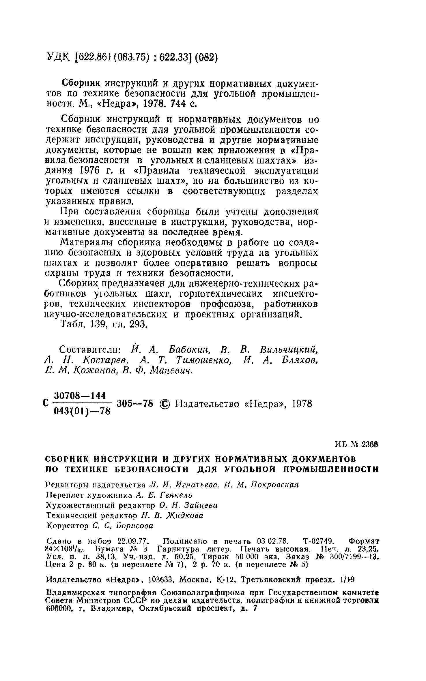 Сборник предназначен для инженерно-технических работников угольных шахт, горнотехнических инспекторов, технических инспекторов профсоюза, работников научно-исследовательских и проектных организаций.