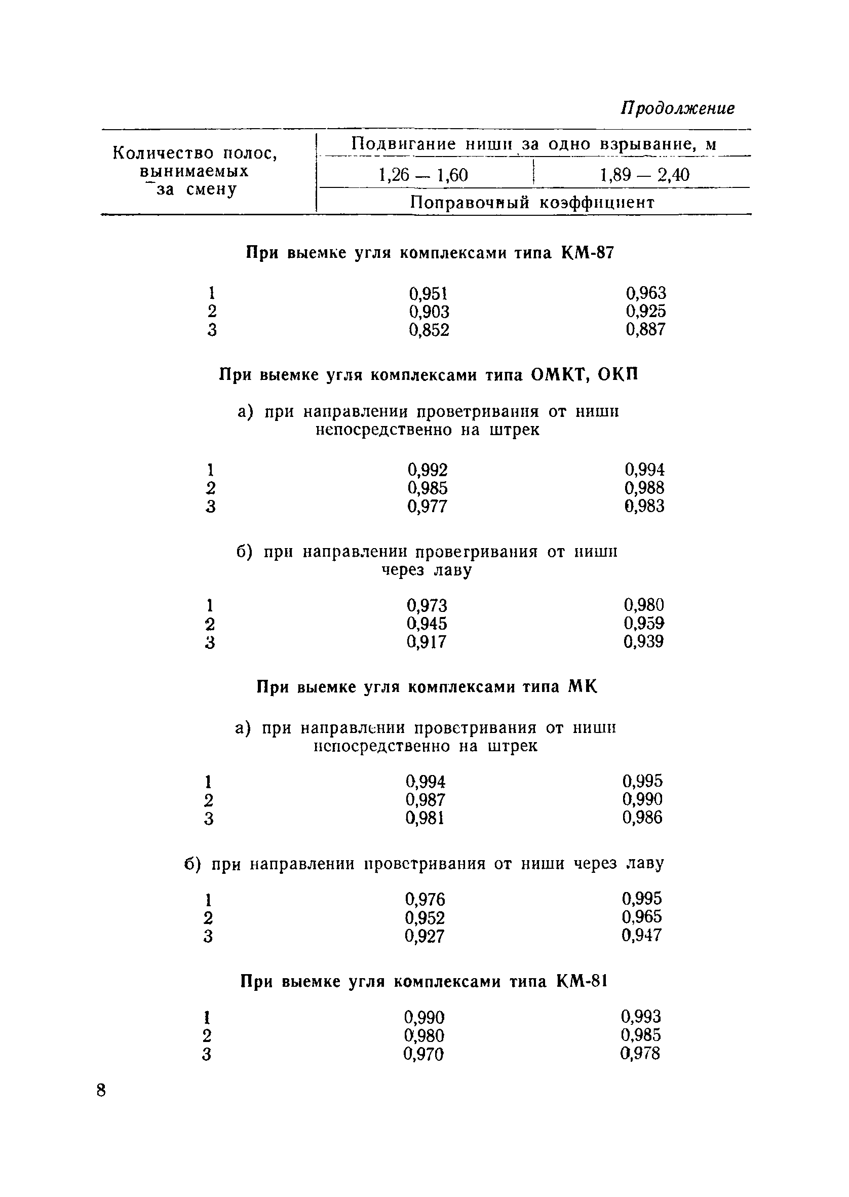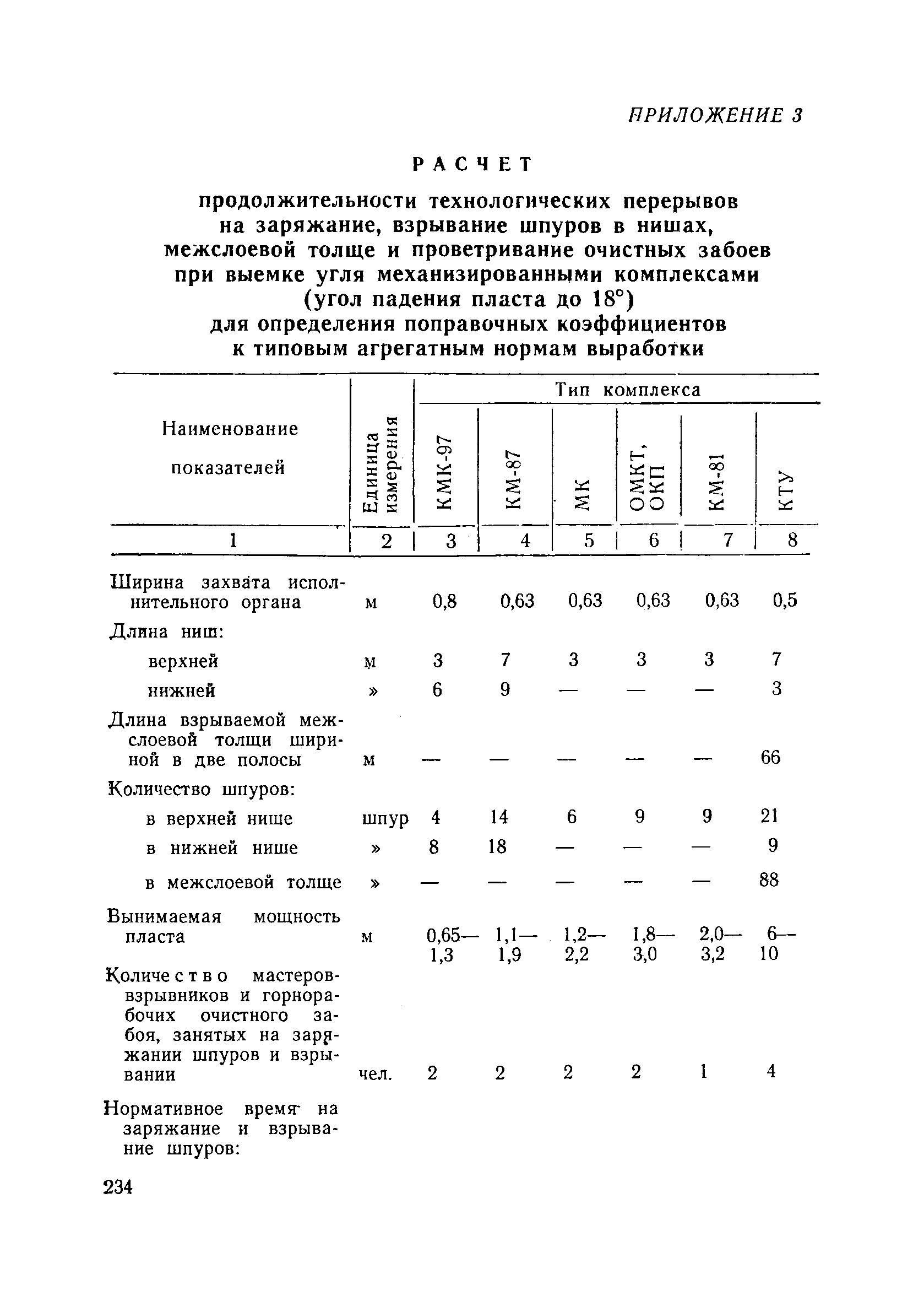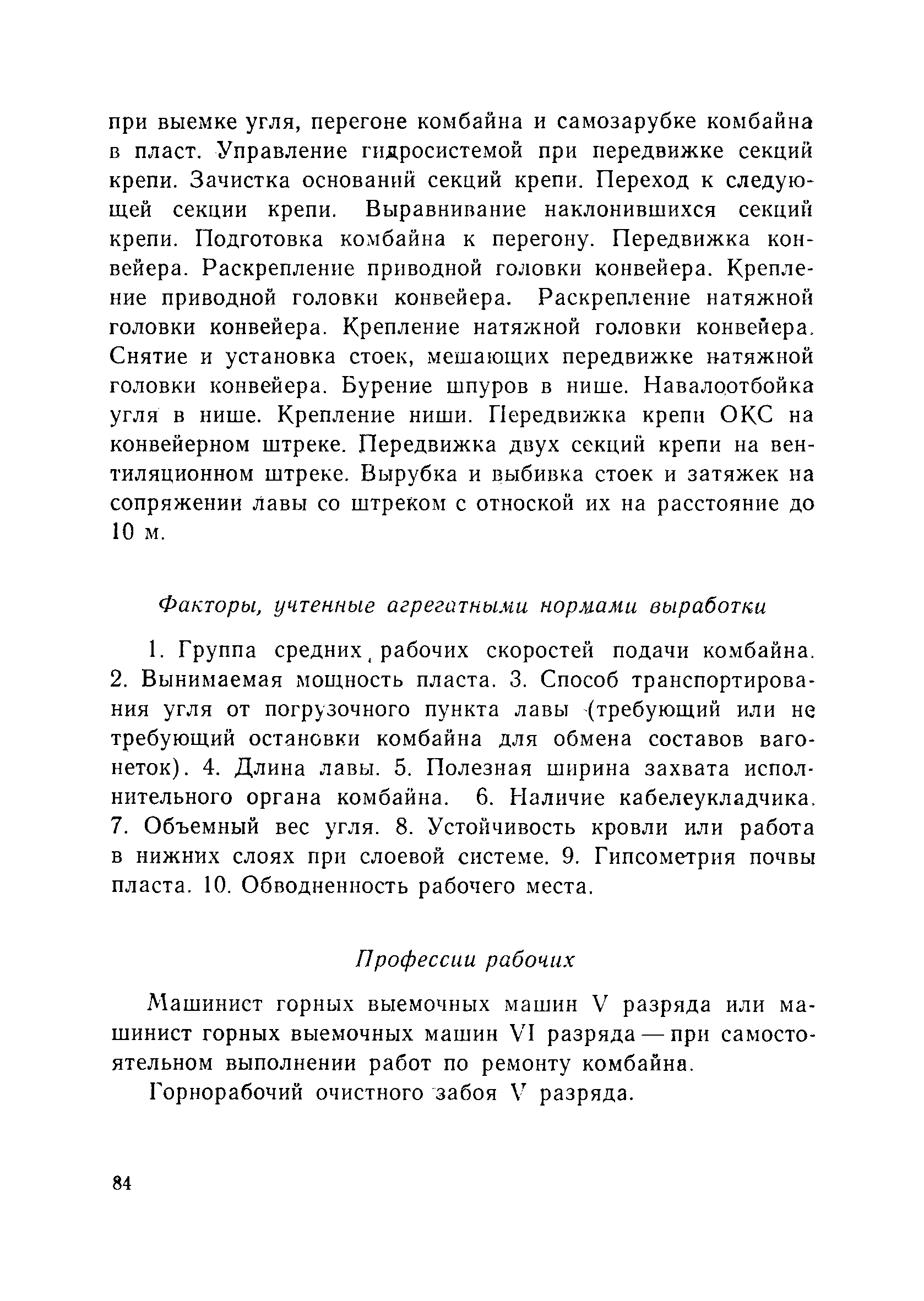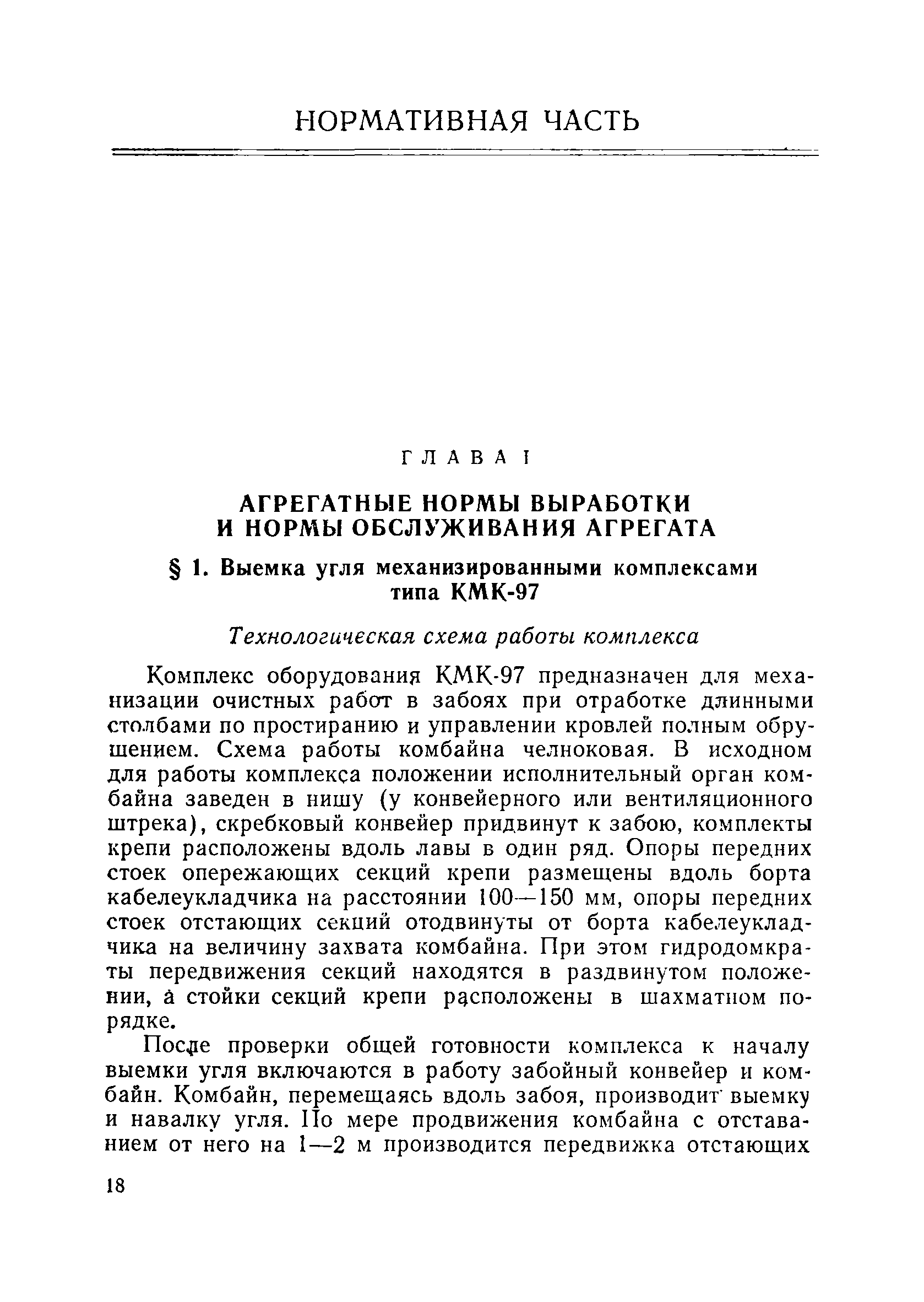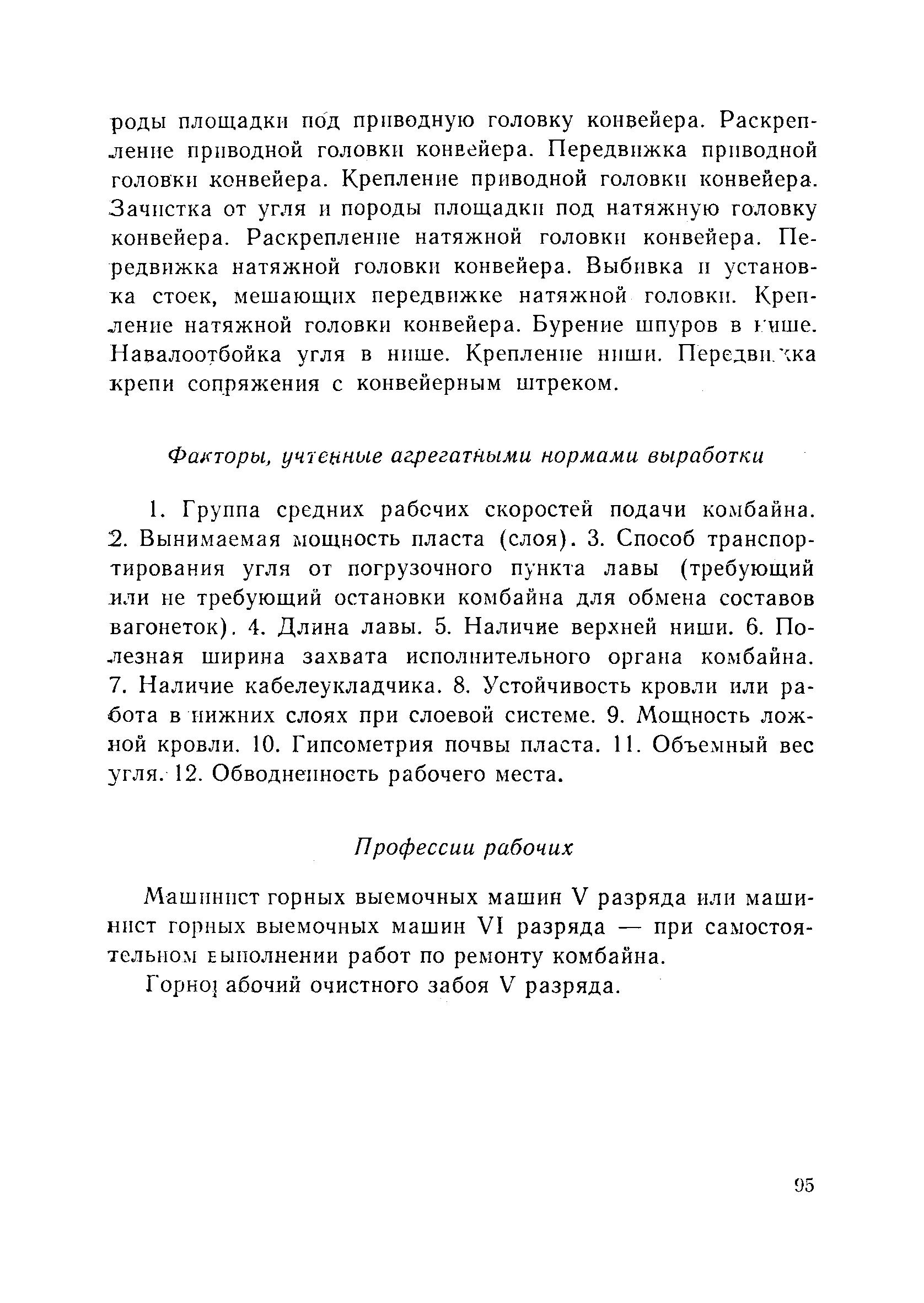 Типовые агрегатные нормы на выемку угля механизированными комплексами в очистных забоях угольных шахт| Статус: | справочные материалы, мп, тпр | | Название рус.: | Типовые агрегатные нормы на выемку угля механизированными комплексами в очистных забоях угольных шахт | | Дата добавления в базу: | 01.02.2020 | | Дата актуализации: | 01.01.2021 | | Область применения: | Агрегатные нормы сборника являются типовыми отраслевыми и предназначены в качестве основы для разработки единых бассейновых и местных норм на шахтах, имеющих фактическую производительность труда в лавах, оборудованных механизированными комплексами, выше единых бассейновых норм. | | Оглавление: | Общая часть Техническая часть Нормативная часть Глава I. Агрегатные нормы выработки и нормы обслуживания агрегата Глава II Организация выполнения операции по приемам Глава III Расчетные нормативы времени по операциям и рабочим процессам, учтенные агрегатными нормами Приложение 1 Сравнение типовых агрегатных норм с действующими нормами и достигнутой производительностью Приложение 2 Методические указания по расчету поправочных коэффициентов к типовым нормам выработки, учитывающих технологические перерывы на заряжание, взрывание шнуров и проветривание очистных забоев Приложение 3 Расчет продолжительности технологических перерывов на заряжание, взрывание шпуров в нишах, межслоевой толще и проветривание очистных забоев при выемке угля механизированными комплексами (угол падения пласта до 18 градусов) для определения поправочных коэффициентов к типовым агрегатным нормам выработки Приложение 4 Расчет поправочных коэффициентов к агрегатным нормам выработки на выемку угля механизированными комплексами типа КМ-871, учитывающих технологические перерывы на заряжание, взрывание шпуров в нишах и проветривание лавы Приложение 5 Методика расчета агрегатных норм выработки и норм обслуживания очистных механизированных комплексов | | Утверждён: | Министерство угольной промышленности СССР (USSR Ministry of the Coal Industry )