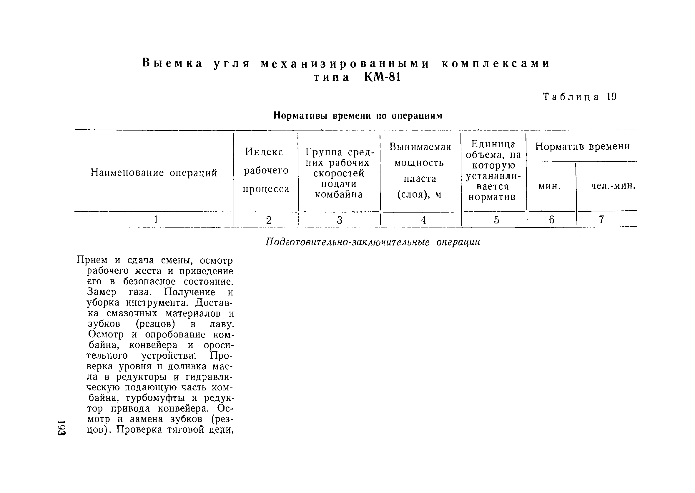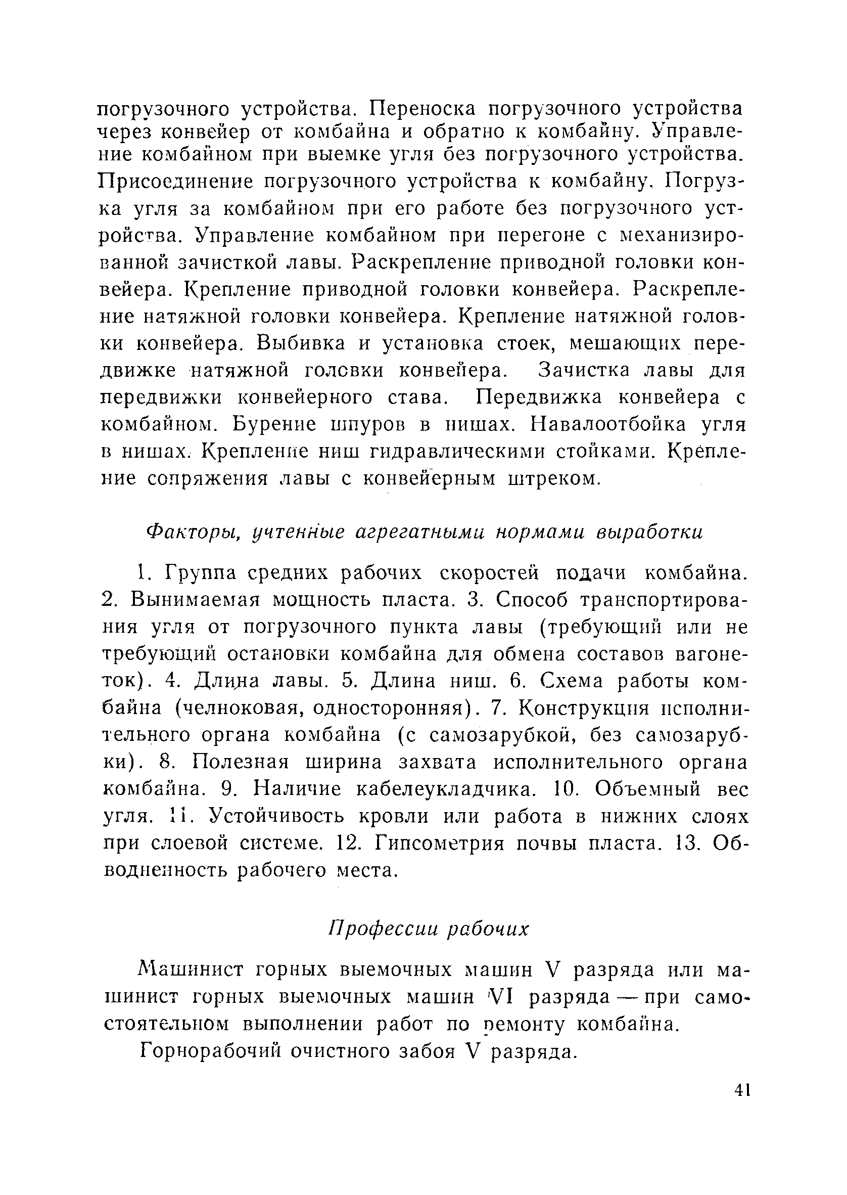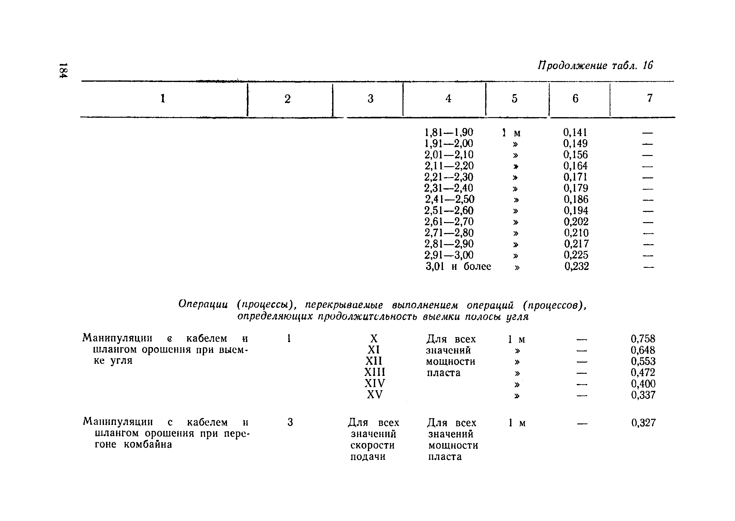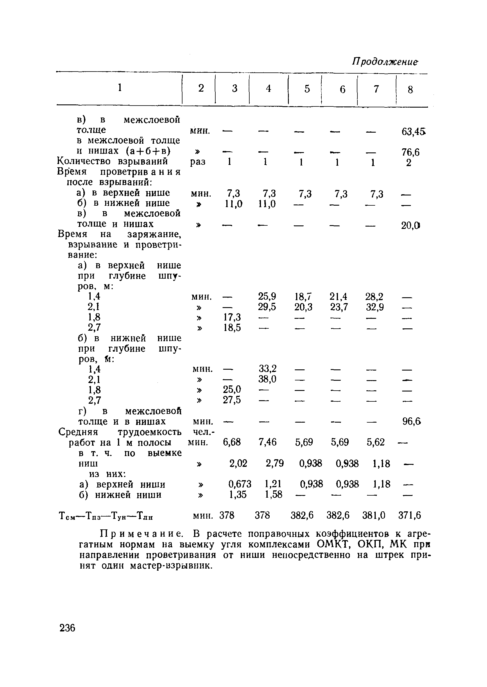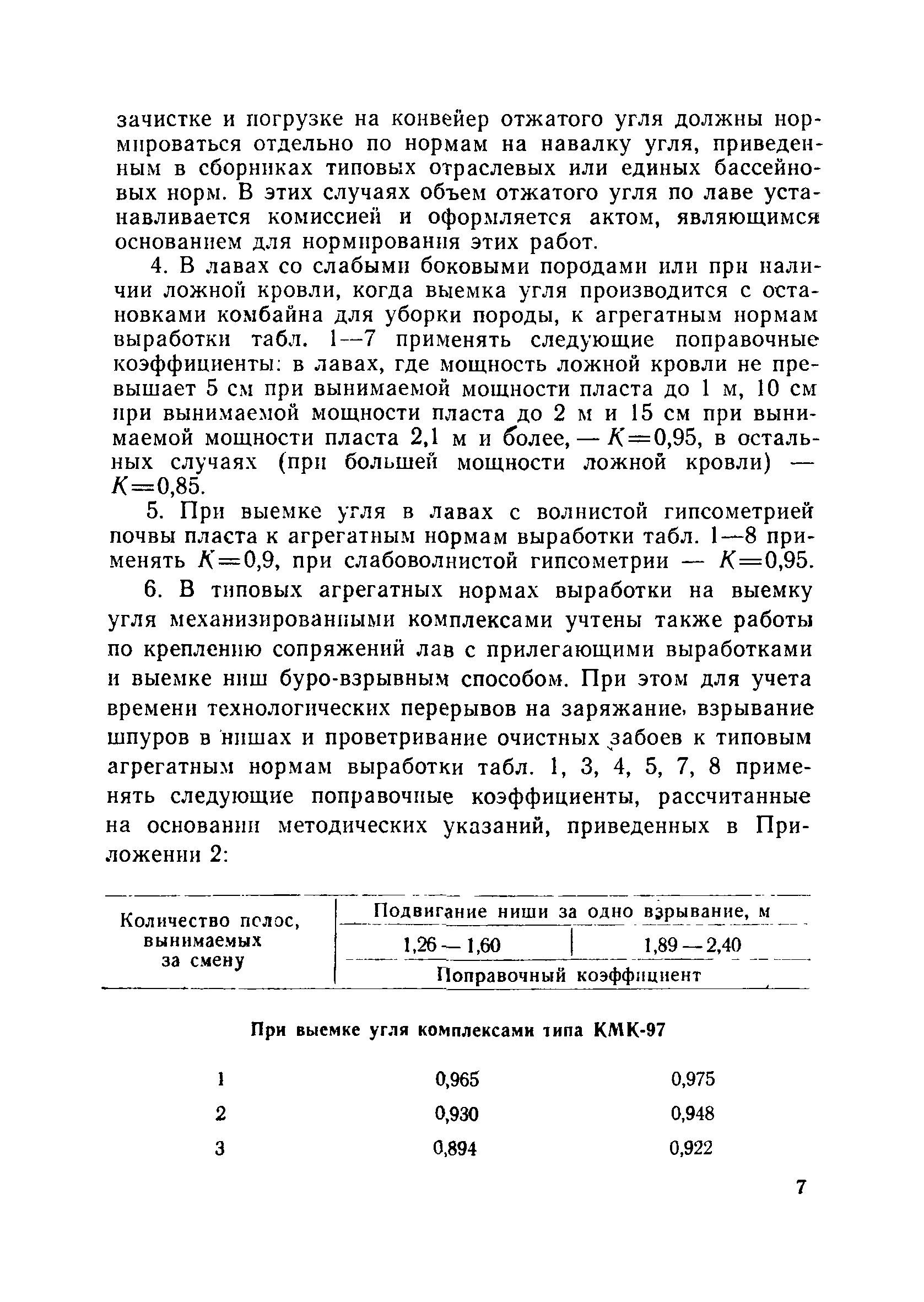 Типовые агрегатные нормы на выемку угля механизированными комплексами в очистных забоях угольных шахт| Статус: | справочные материалы, мп, тпр | | Название рус.: | Типовые агрегатные нормы на выемку угля механизированными комплексами в очистных забоях угольных шахт | | Дата добавления в базу: | 01.02.2020 | | Дата актуализации: | 01.01.2021 | | Область применения: | Агрегатные нормы сборника являются типовыми отраслевыми и предназначены в качестве основы для разработки единых бассейновых и местных норм на шахтах, имеющих фактическую производительность труда в лавах, оборудованных механизированными комплексами, выше единых бассейновых норм. | | Оглавление: | Общая часть Техническая часть Нормативная часть Глава I. Агрегатные нормы выработки и нормы обслуживания агрегата Глава II Организация выполнения операции по приемам Глава III Расчетные нормативы времени по операциям и рабочим процессам, учтенные агрегатными нормами Приложение 1 Сравнение типовых агрегатных норм с действующими нормами и достигнутой производительностью Приложение 2 Методические указания по расчету поправочных коэффициентов к типовым нормам выработки, учитывающих технологические перерывы на заряжание, взрывание шнуров и проветривание очистных забоев Приложение 3 Расчет продолжительности технологических перерывов на заряжание, взрывание шпуров в нишах, межслоевой толще и проветривание очистных забоев при выемке угля механизированными комплексами (угол падения пласта до 18 градусов) для определения поправочных коэффициентов к типовым агрегатным нормам выработки Приложение 4 Расчет поправочных коэффициентов к агрегатным нормам выработки на выемку угля механизированными комплексами типа КМ-871, учитывающих технологические перерывы на заряжание, взрывание шпуров в нишах и проветривание лавы Приложение 5 Методика расчета агрегатных норм выработки и норм обслуживания очистных механизированных комплексов | | Утверждён: | Министерство угольной промышленности СССР (USSR Ministry of the Coal Industry )
