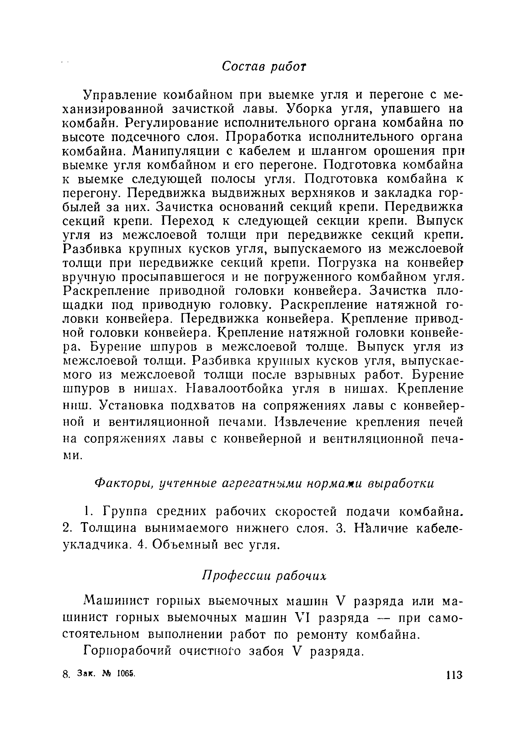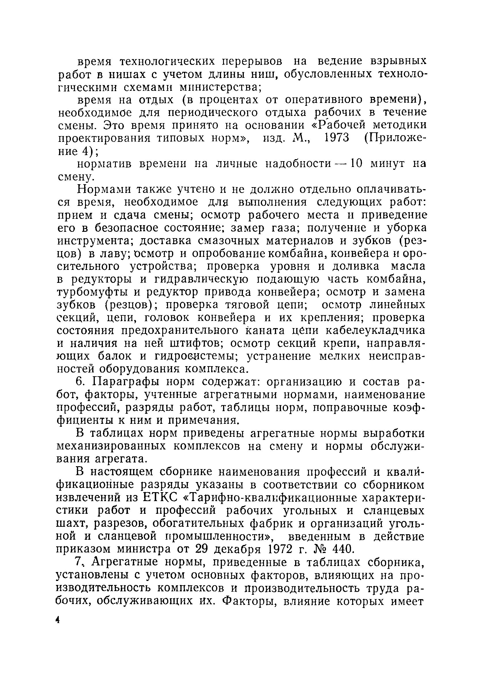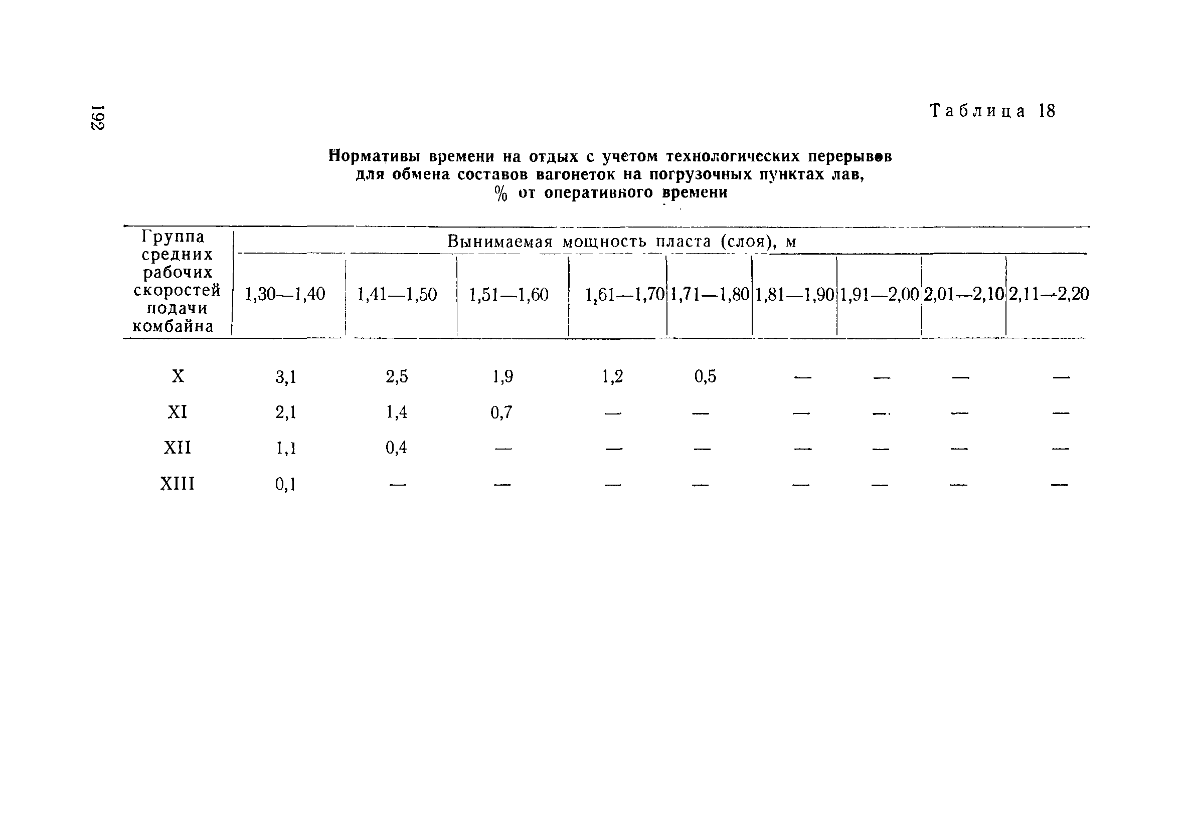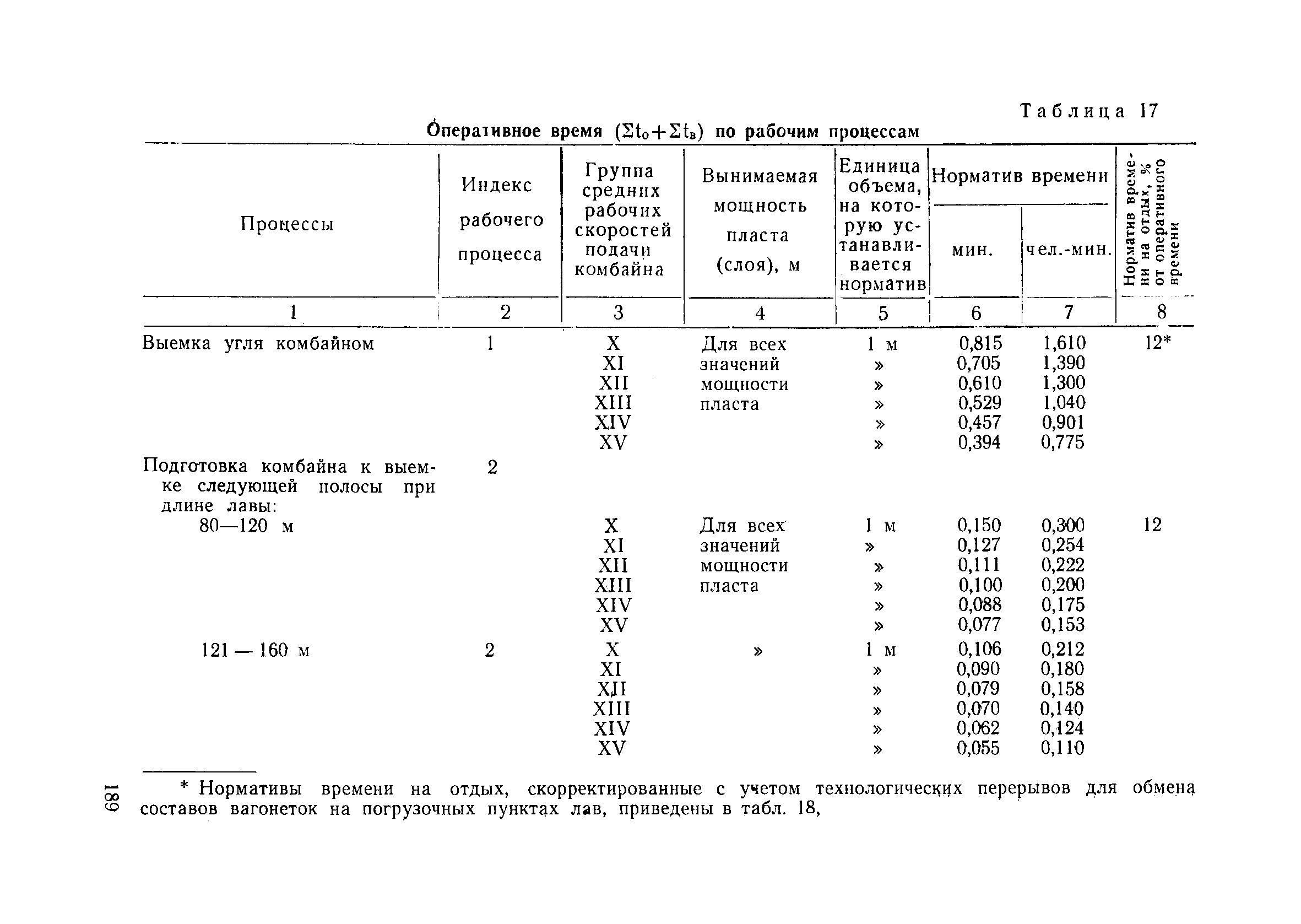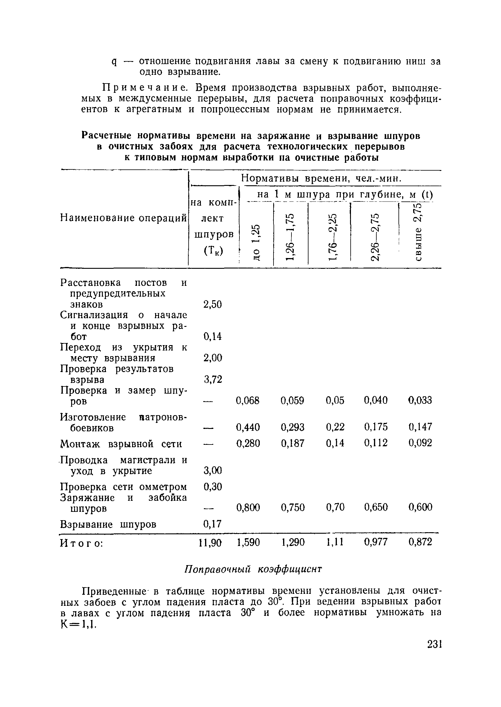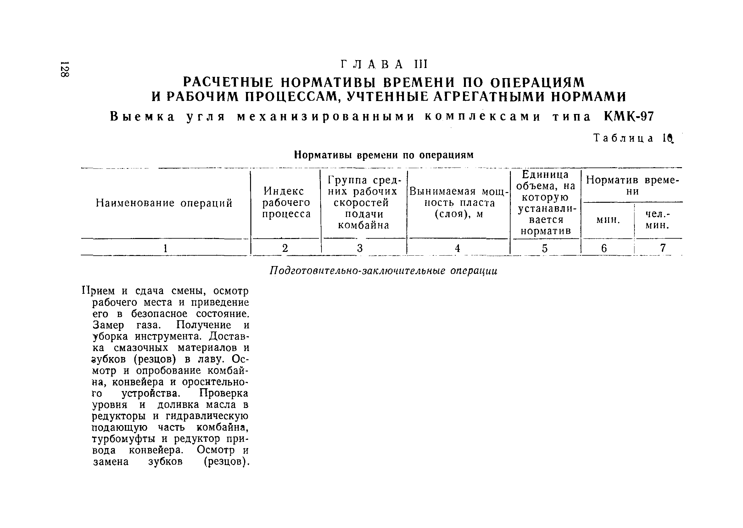 Типовые агрегатные нормы на выемку угля механизированными комплексами в очистных забоях угольных шахт| Статус: | справочные материалы, мп, тпр | | Название рус.: | Типовые агрегатные нормы на выемку угля механизированными комплексами в очистных забоях угольных шахт | | Дата добавления в базу: | 01.02.2020 | | Дата актуализации: | 01.01.2021 | | Область применения: | Агрегатные нормы сборника являются типовыми отраслевыми и предназначены в качестве основы для разработки единых бассейновых и местных норм на шахтах, имеющих фактическую производительность труда в лавах, оборудованных механизированными комплексами, выше единых бассейновых норм. | | Оглавление: | Общая часть Техническая часть Нормативная часть Глава I. Агрегатные нормы выработки и нормы обслуживания агрегата Глава II Организация выполнения операции по приемам Глава III Расчетные нормативы времени по операциям и рабочим процессам, учтенные агрегатными нормами Приложение 1 Сравнение типовых агрегатных норм с действующими нормами и достигнутой производительностью Приложение 2 Методические указания по расчету поправочных коэффициентов к типовым нормам выработки, учитывающих технологические перерывы на заряжание, взрывание шнуров и проветривание очистных забоев Приложение 3 Расчет продолжительности технологических перерывов на заряжание, взрывание шпуров в нишах, межслоевой толще и проветривание очистных забоев при выемке угля механизированными комплексами (угол падения пласта до 18 градусов) для определения поправочных коэффициентов к типовым агрегатным нормам выработки Приложение 4 Расчет поправочных коэффициентов к агрегатным нормам выработки на выемку угля механизированными комплексами типа КМ-871, учитывающих технологические перерывы на заряжание, взрывание шпуров в нишах и проветривание лавы Приложение 5 Методика расчета агрегатных норм выработки и норм обслуживания очистных механизированных комплексов | | Утверждён: | Министерство угольной промышленности СССР (USSR Ministry of the Coal Industry )