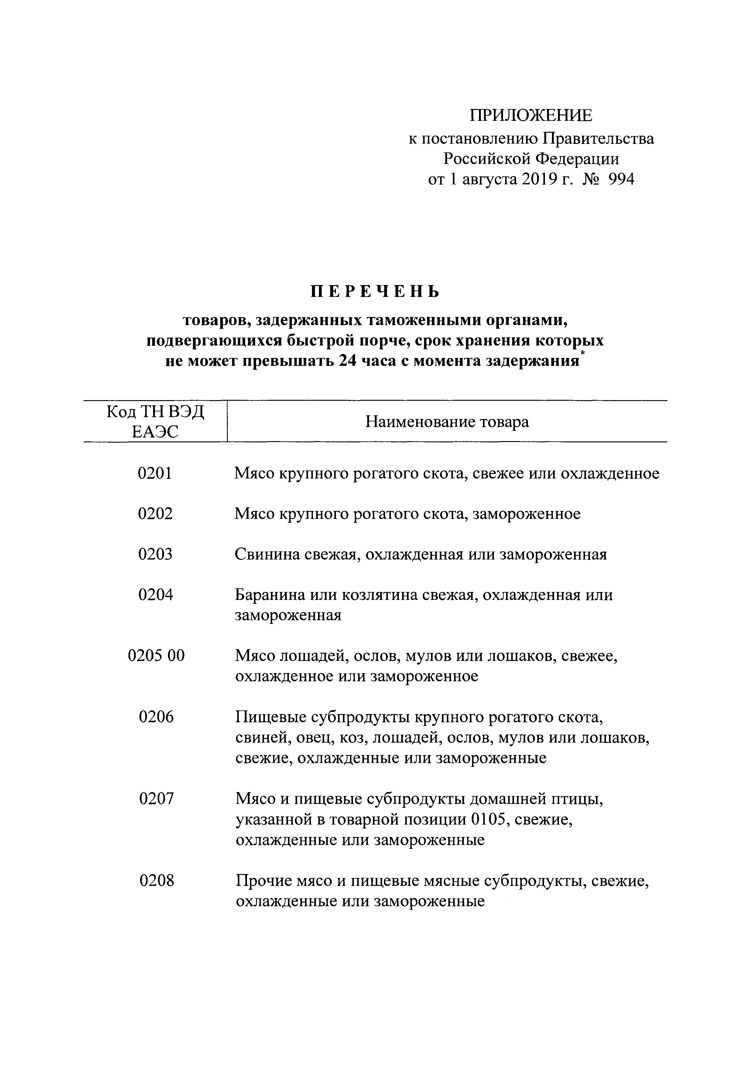 Перечень товаров, задержанных таможенными органами, подвергающихся быстрой порче, срок хранения которых не может превышать 24 часа с момента задержания| Статус: | действует | | Название рус.: | Перечень товаров, задержанных таможенными органами, подвергающихся быстрой порче, срок хранения которых не может превышать 24 часа с момента задержания | | Дата добавления в базу: | 01.02.2020 | | Дата актуализации: | 01.01.2021 | | Дата введения: | 06.09.2019 | | Утверждён: | 01.08.2019 Правительство Российской Федерации (994)