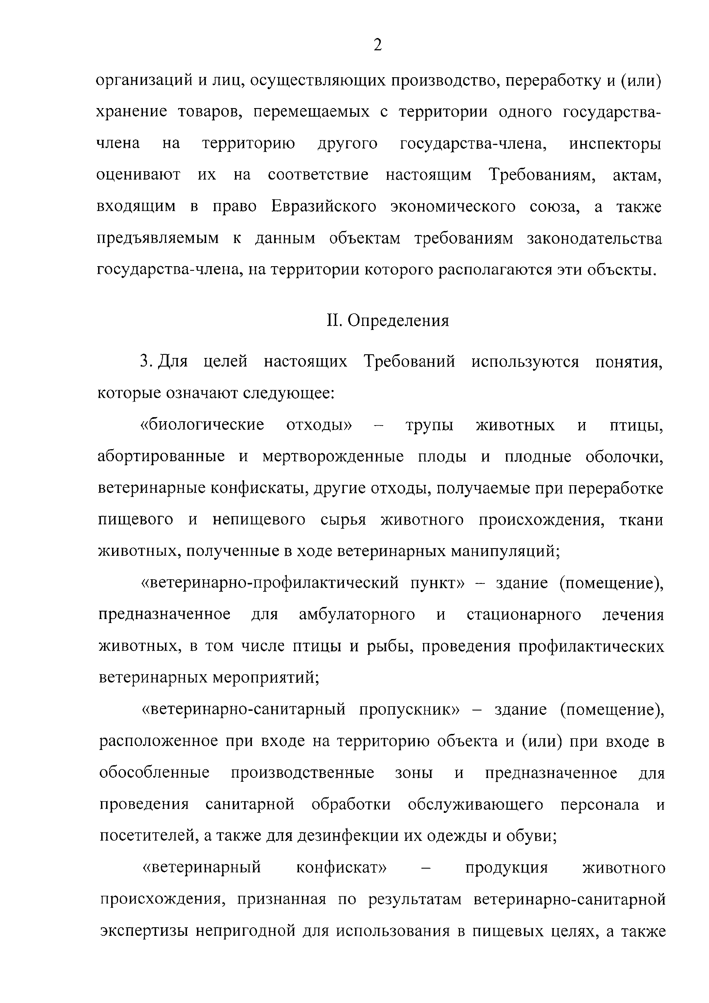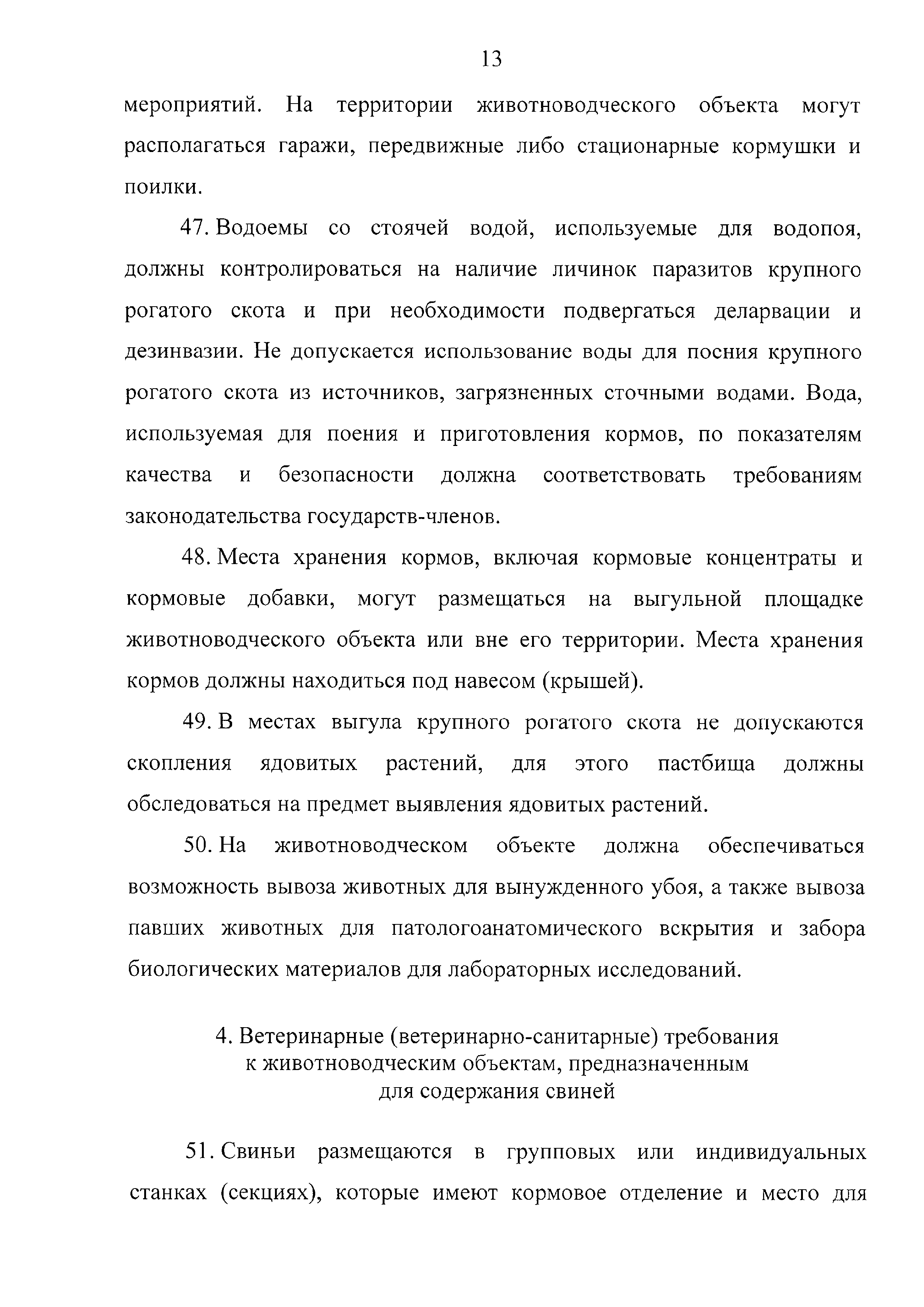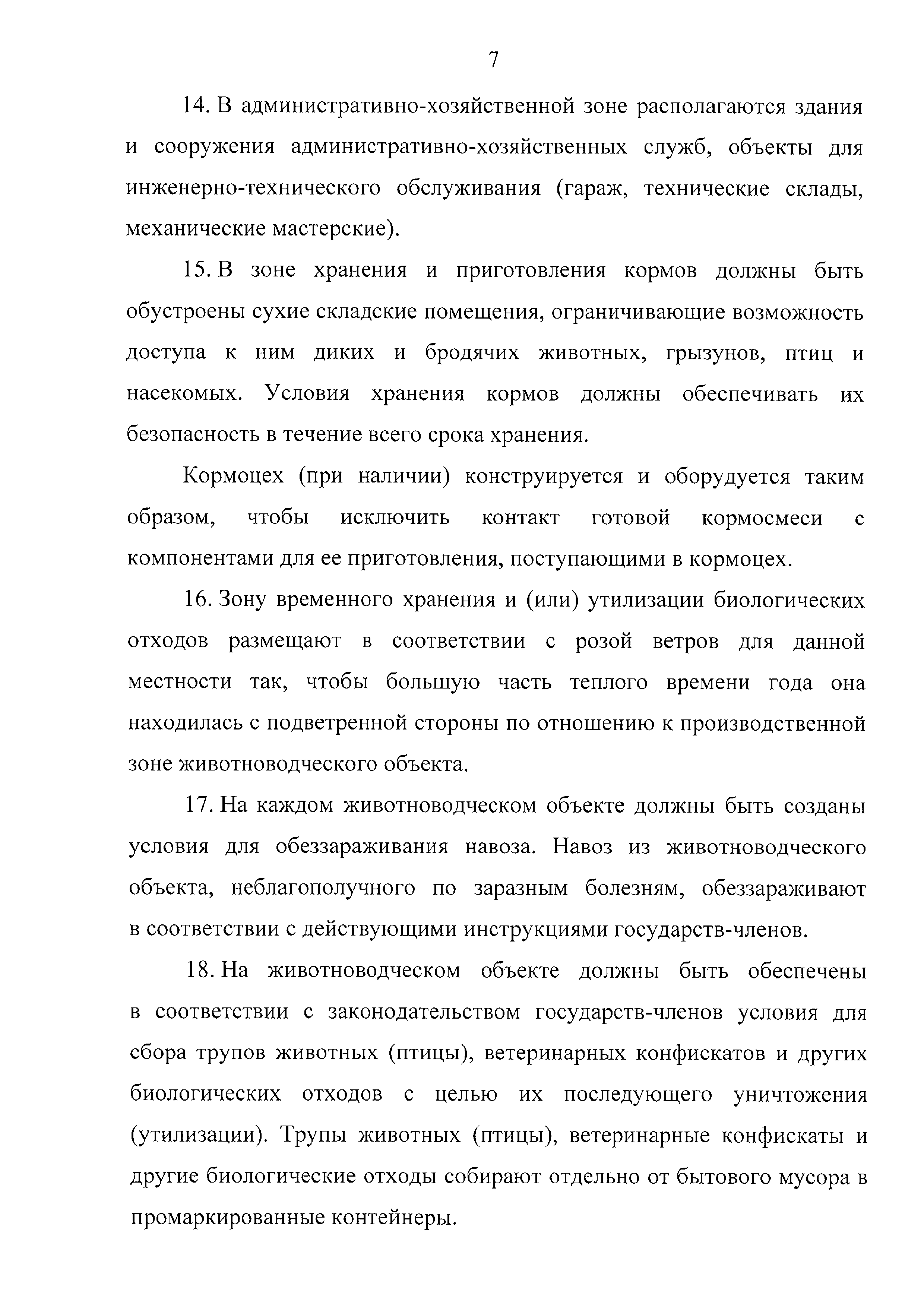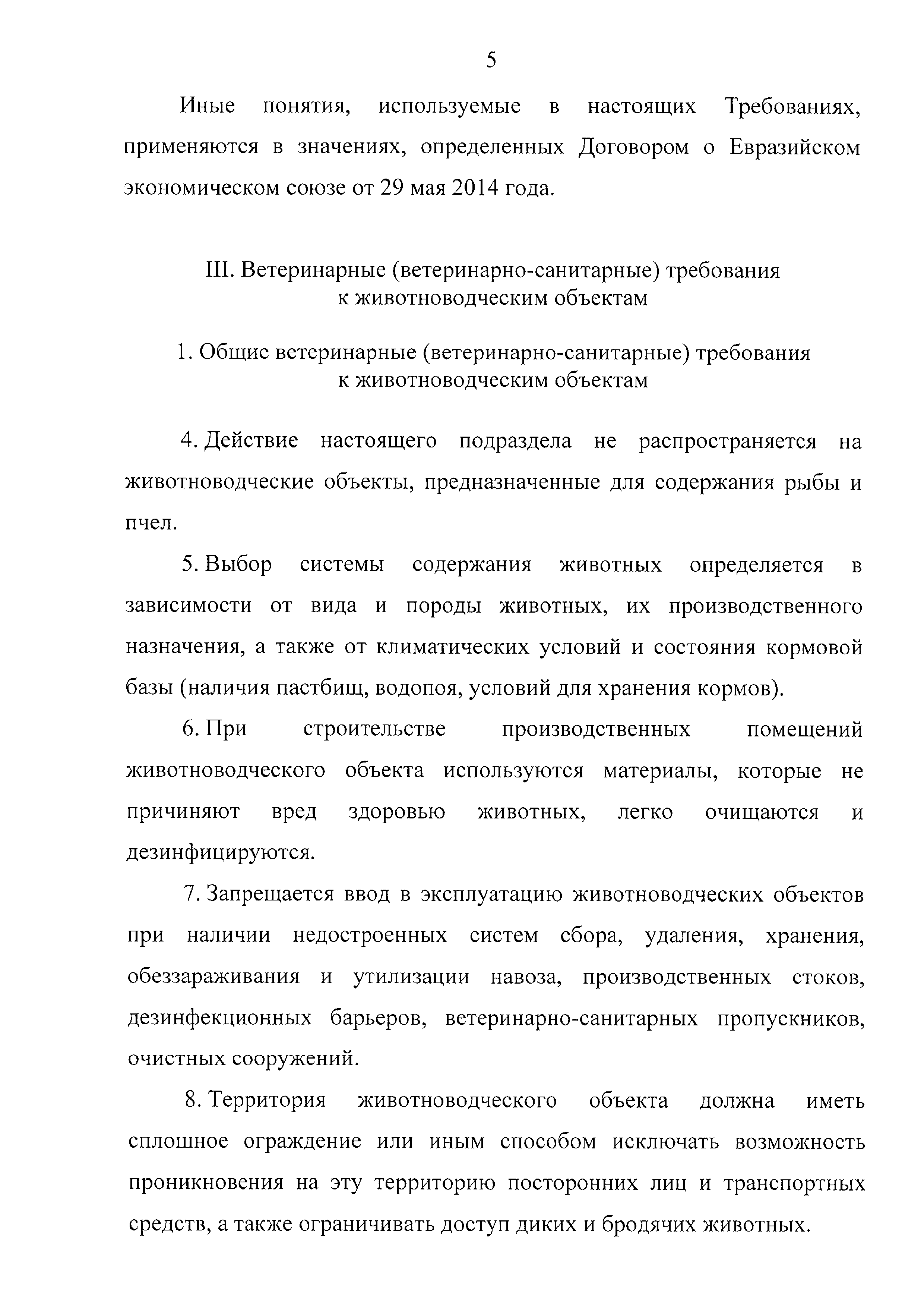 Единые ветеринарные (ветеринарно-санитарные) требования, предъявляемые к объектам, подлежащим ветеринарному контролю (надзору)| Статус: | действует | | Название рус.: | Единые ветеринарные (ветеринарно-санитарные) требования, предъявляемые к объектам, подлежащим ветеринарному контролю (надзору) | | Дата добавления в базу: | 01.02.2020 | | Дата актуализации: | 01.01.2021 | | Дата введения: | 14.08.2018 | | Область применения: | Требования являются обязательными для исполнения юридическими лицами, физическими лицами, в том числе зарегистрированными в качестве индивидуальных предпринимателей, которым принадлежат на праве собственности или на ином законном основании земельные участки, здания, строения, сооружения, места складирования (хранения), в которых осуществляется деятельность по выращиванию (разведению и содержанию), изготовлению, переработке и хранению товаров, подлежащих ветеринарному контролю (надзору), и сведения о которых включаются (включены) в реестр организаций и лиц, осуществляющих производство, переработку и (или) хранение товаров, перемещаемых с территории одного государства - члена Евразийского экономического союза на территорию другого государства-члена, а также собственниками (владельцами) транспортных средств, осуществляющих перемещение указанных товаров | | Оглавление: | I. Общие положения II. Определения III. Ветеринарные (ветеринарно-санитарные) требования к животноводческим объектам 1. Общие ветеринарные (ветеринарно-санитарные) требования к животноводческим объектам 2. Ветеринарные (ветеринарно-санитарные) требования к животноводческим объектам, предназначенным для содержания крупного рогатого скота 3. Ветеринарные (ветеринарно-санитарные) требования к животноводческим объектам, с круглогодичным пастбищным содержанием крупного рогатого скота 4. Ветеринарные (ветеринарно-санитарные) требования к животноводческим объектам, предназначенным для содержания свиней 5. Ветеринарные (ветеринарно-санитарные) требования к животноводческим объектам, предназначенным для содержания овец 6. Ветеринарные (ветеринарно-санитарные) требования к животноводческим объектам, предназначенным для содержания пушных зверей 7. Ветеринарные (ветеринарно-санитарные) требования к животноводческим объектам, предназначенным для содержания птицы (кроме водоплавающих) 8. Ветеринарные (ветеринарно-санитарные) требования к животноводческим объектам, предназначенным для содержания рыбы (только к прудовым хозяйствам) 9. Ветеринарные (ветеринарно-санитарные) требования к животноводческим объектам, предназначенным для содержания пчел IV. Общие ветеринарные (ветеринарно-санитарные) требования к объектам по производству (изготовлению) и (или) хранению товаров животного происхождения (пищевых и непищевых), подлежащих ветеринарному контролю (надзору) V. Ветеринарные (ветеринарно-санитарные) требования к объектам по убою продуктивных животных VI. Ветеринарные (ветеринарно-санитарные) требования к объектам по производству (изготовлению) товаров животного происхождения (пищевых и непищевых), подлежащих ветеринарному контролю (надзору) VII. Ветеринарные (ветеринарно-санитарные) требования к объектам по хранению товаров животного происхождения и кормов VIII. Ветеринарные (ветеринарно-санитарные) требования к объектам, осуществляющим транспортировку жи