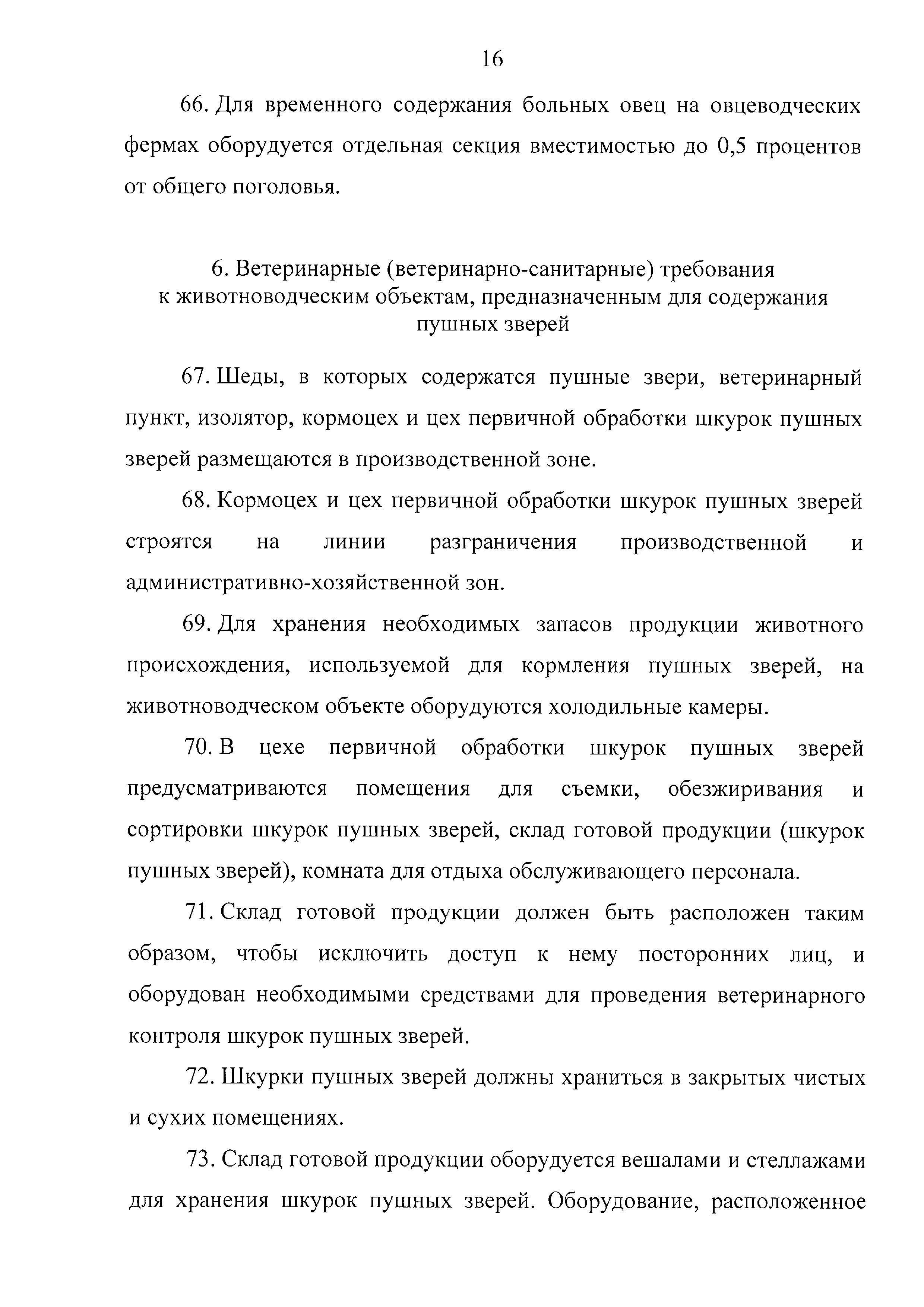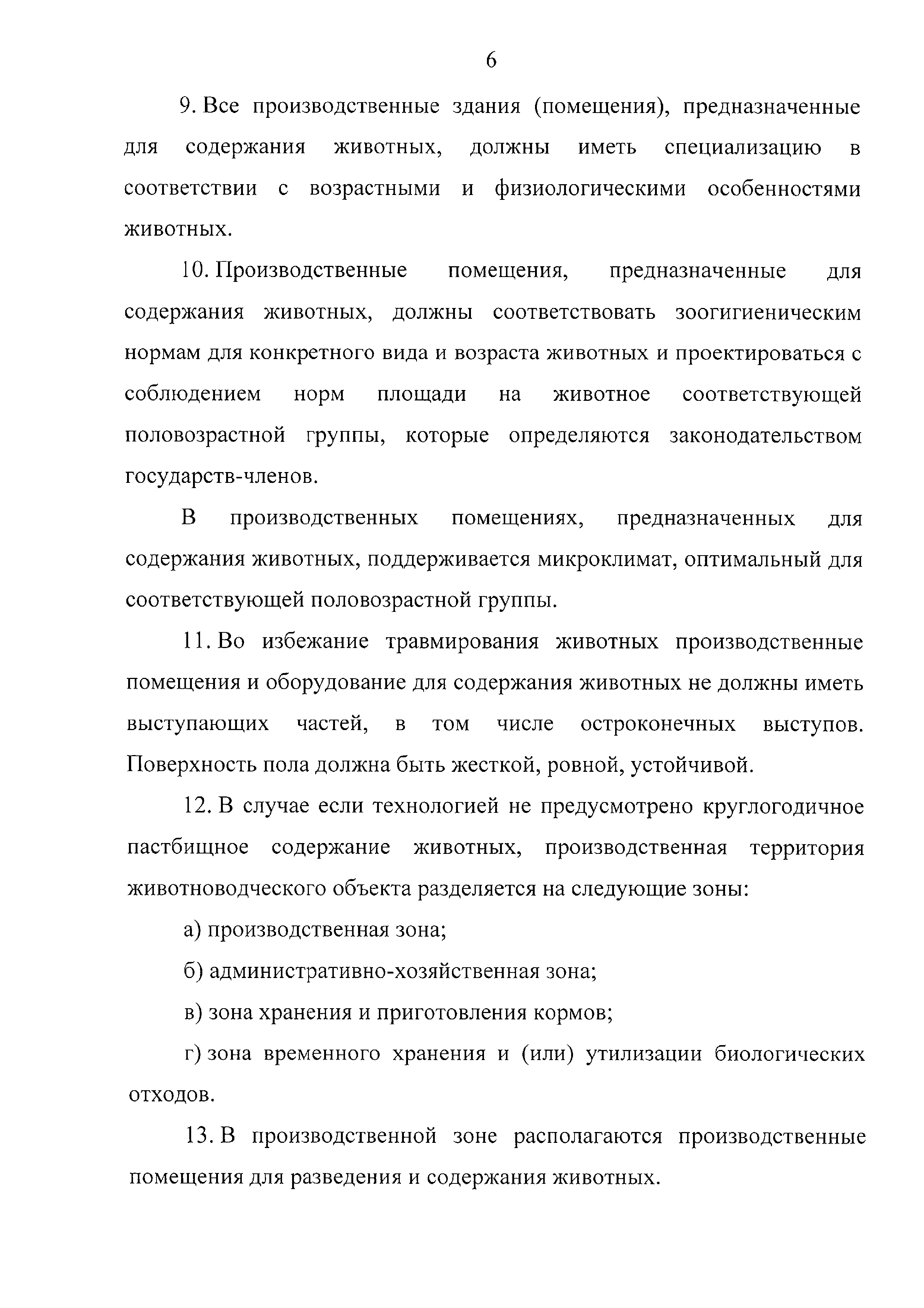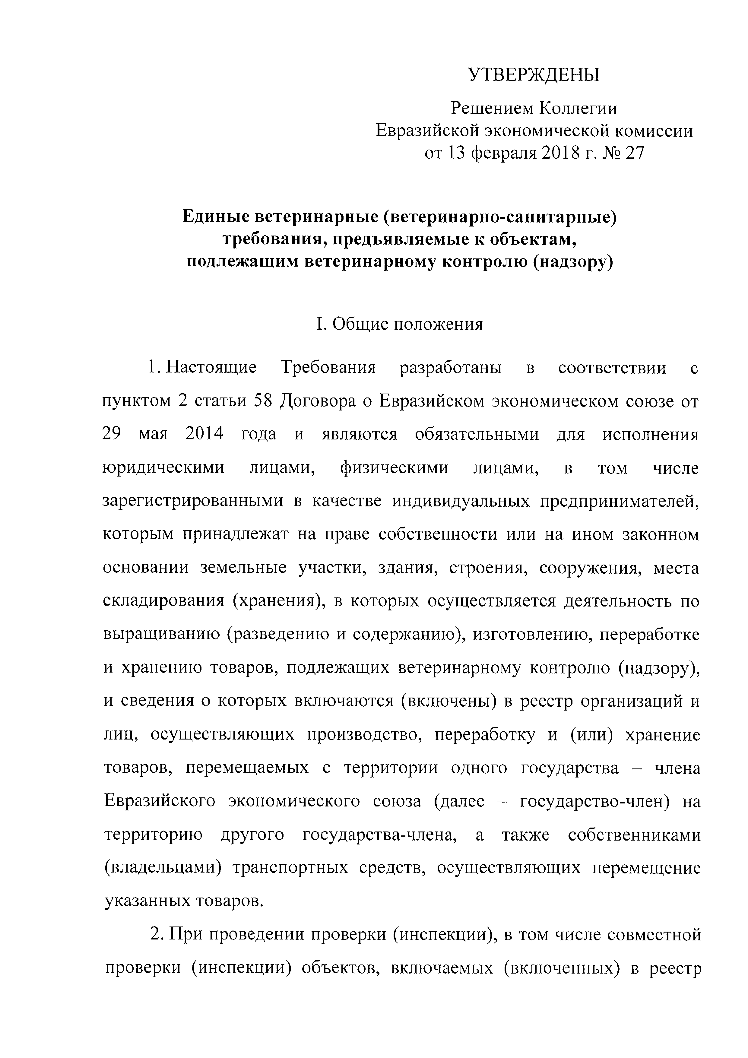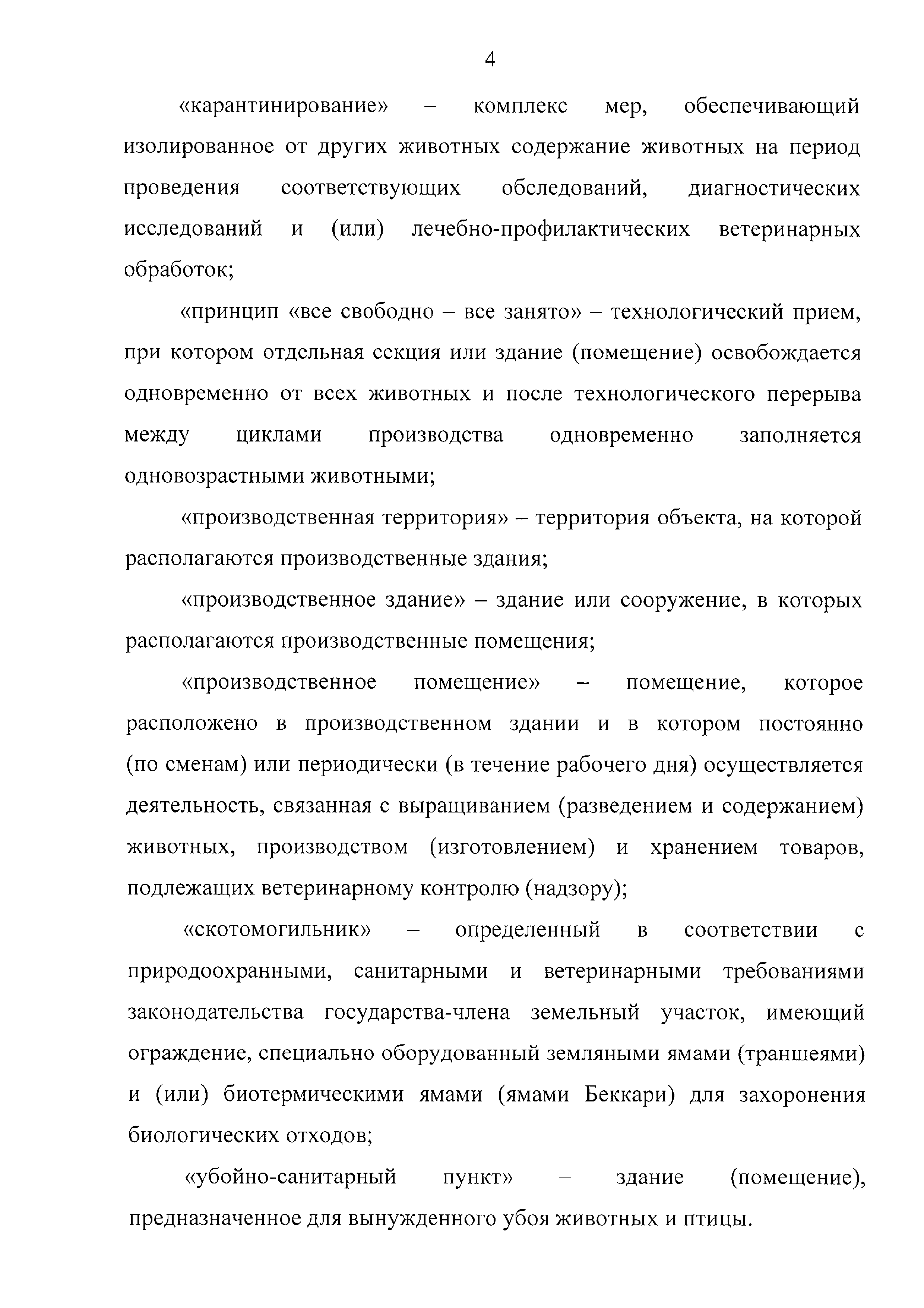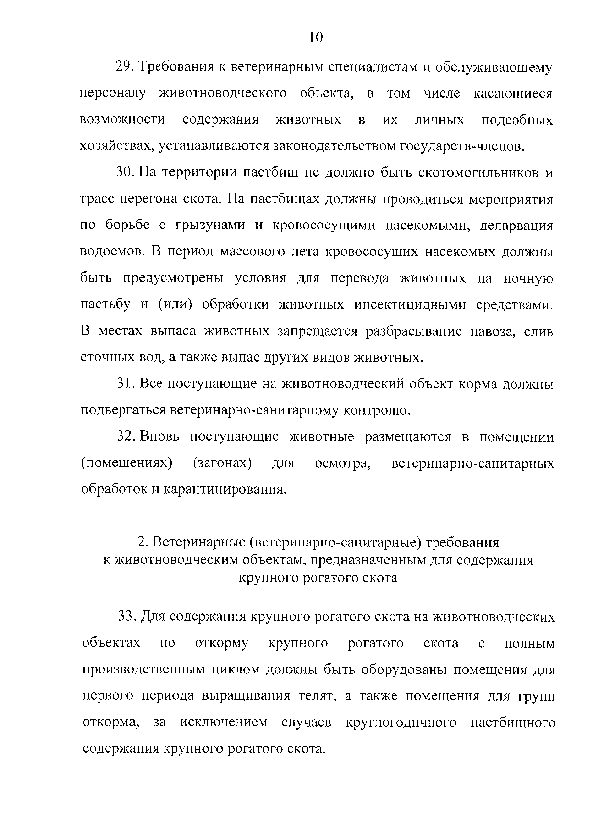Единые ветеринарные (ветеринарно-санитарные) требования, предъявляемые к объектам, подлежащим ветеринарному контролю (надзору)| Статус: | действует | | Название рус.: | Единые ветеринарные (ветеринарно-санитарные) требования, предъявляемые к объектам, подлежащим ветеринарному контролю (надзору) | | Дата добавления в базу: | 01.02.2020 | | Дата актуализации: | 01.01.2021 | | Дата введения: | 14.08.2018 | | Область применения: | Требования являются обязательными для исполнения юридическими лицами, физическими лицами, в том числе зарегистрированными в качестве индивидуальных предпринимателей, которым принадлежат на праве собственности или на ином законном основании земельные участки, здания, строения, сооружения, места складирования (хранения), в которых осуществляется деятельность по выращиванию (разведению и содержанию), изготовлению, переработке и хранению товаров, подлежащих ветеринарному контролю (надзору), и сведения о которых включаются (включены) в реестр организаций и лиц, осуществляющих производство, переработку и (или) хранение товаров, перемещаемых с территории одного государства - члена Евразийского экономического союза на территорию другого государства-члена, а также собственниками (владельцами) транспортных средств, осуществляющих перемещение указанных товаров | | Оглавление: | I. Общие положения II. Определения III. Ветеринарные (ветеринарно-санитарные) требования к животноводческим объектам 1. Общие ветеринарные (ветеринарно-санитарные) требования к животноводческим объектам 2. Ветеринарные (ветеринарно-санитарные) требования к животноводческим объектам, предназначенным для содержания крупного рогатого скота 3. Ветеринарные (ветеринарно-санитарные) требования к животноводческим объектам, с круглогодичным пастбищным содержанием крупного рогатого скота 4. Ветеринарные (ветеринарно-санитарные) требования к животноводческим объектам, предназначенным для содержания свиней 5. Ветеринарные (ветеринарно-санитарные) требования к животноводческим объектам, предназначенным для содержания овец 6. Ветеринарные (ветеринарно-санитарные) требования к животноводческим объектам, предназначенным для содержания пушных зверей 7. Ветеринарные (ветеринарно-санитарные) требования к животноводческим объектам, предназначенным для содержания птицы (кроме водоплавающих) 8. Ветеринарные (ветеринарно-санитарные) требования к животноводческим объектам, предназначенным для содержания рыбы (только к прудовым хозяйствам) 9. Ветеринарные (ветеринарно-санитарные) требования к животноводческим объектам, предназначенным для содержания пчел IV. Общие ветеринарные (ветеринарно-санитарные) требования к объектам по производству (изготовлению) и (или) хранению товаров животного происхождения (пищевых и непищевых), подлежащих ветеринарному контролю (надзору) V. Ветеринарные (ветеринарно-санитарные) требования к объектам по убою продуктивных животных VI. Ветеринарные (ветеринарно-санитарные) требования к объектам по производству (изготовлению) товаров животного происхождения (пищевых и непищевых), подлежащих ветеринарному контролю (надзору) VII. Ветеринарные (ветеринарно-санитарные) требования к объектам по хранению товаров животного происхождения и кормов VIII. Ветеринарные (ветеринарно-санитарные) требования к объектам, осуществляющим транспортировку жи