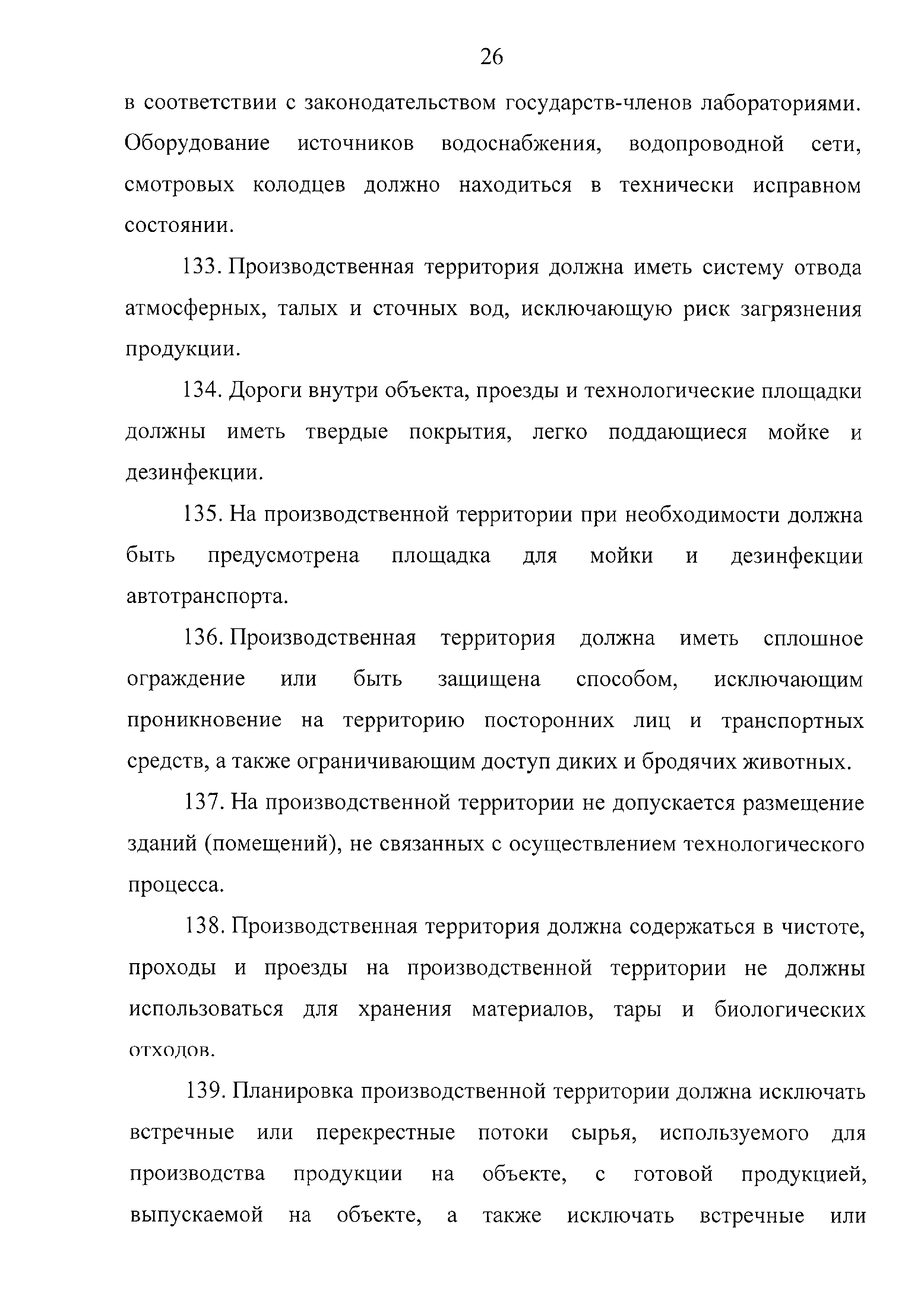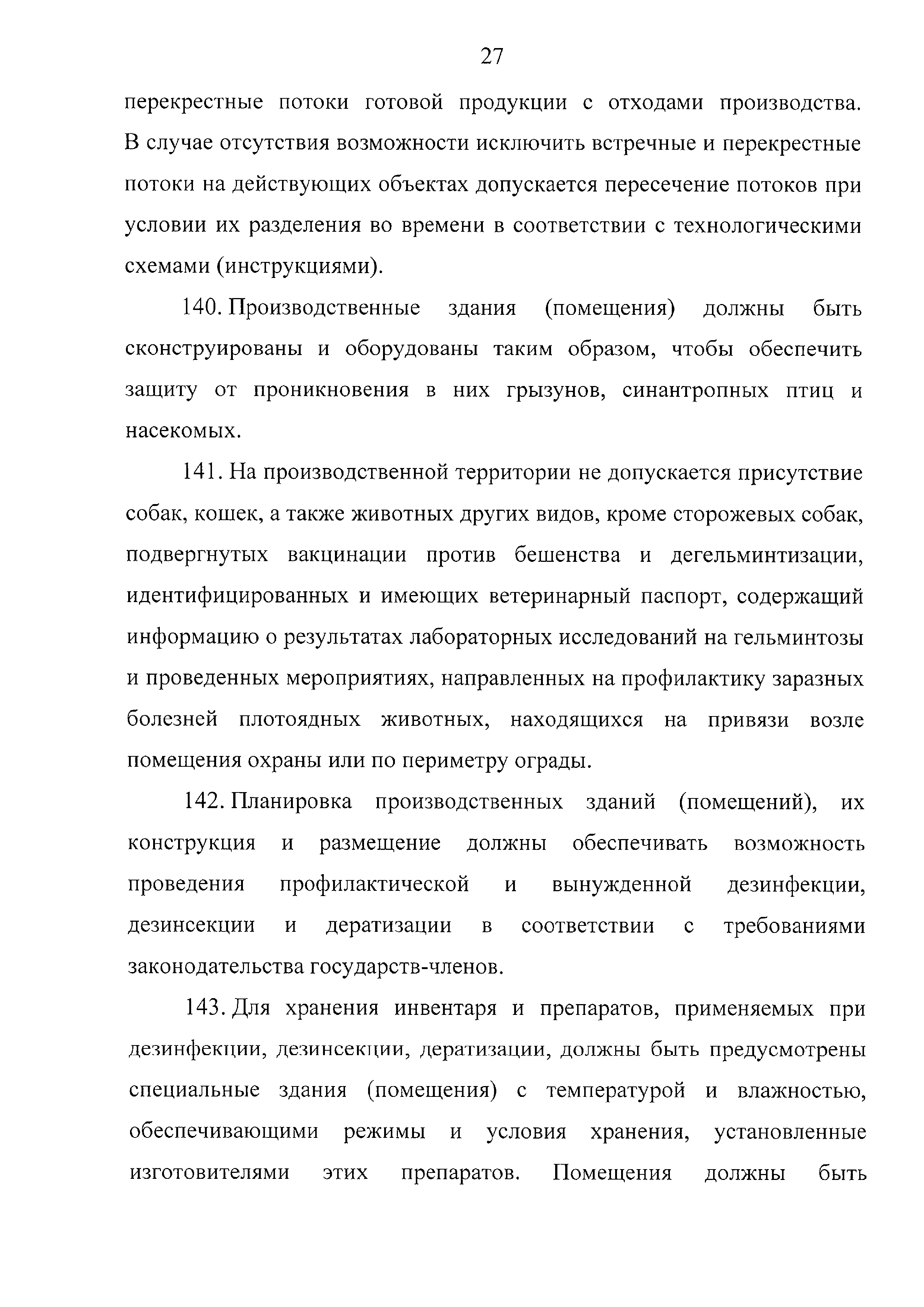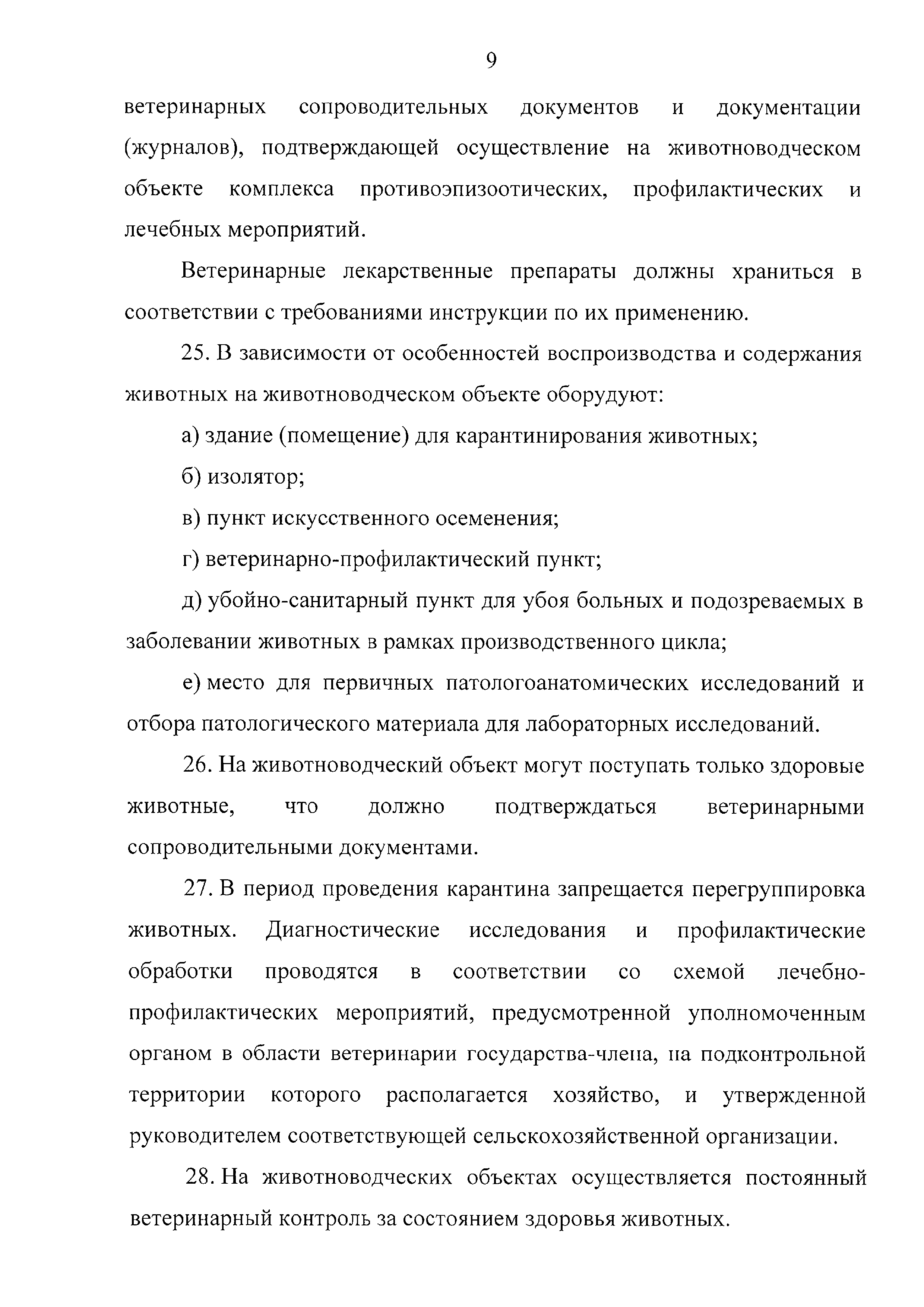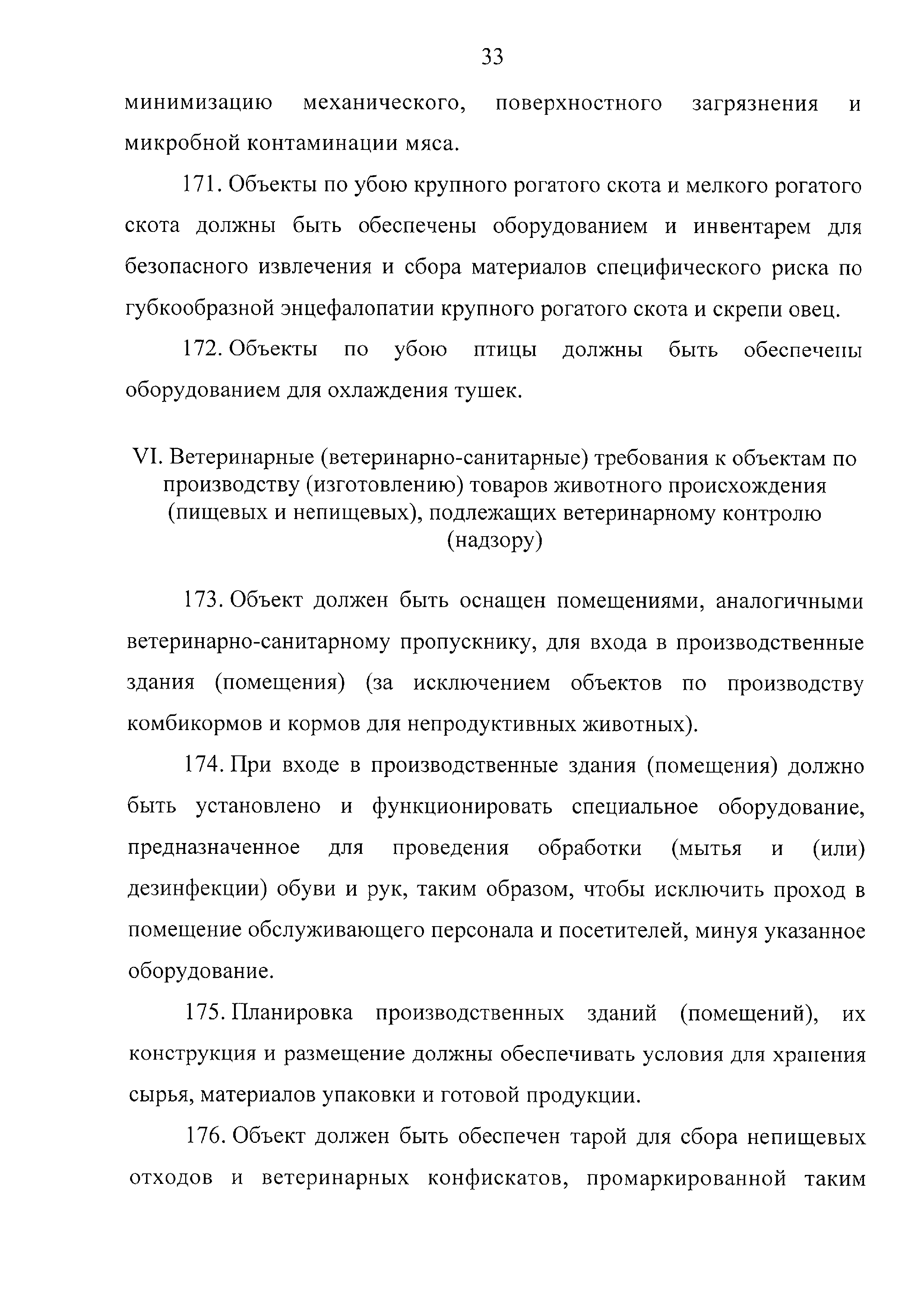 Единые ветеринарные (ветеринарно-санитарные) требования, предъявляемые к объектам, подлежащим ветеринарному контролю (надзору)| Статус: | действует | | Название рус.: | Единые ветеринарные (ветеринарно-санитарные) требования, предъявляемые к объектам, подлежащим ветеринарному контролю (надзору) | | Дата добавления в базу: | 01.02.2020 | | Дата актуализации: | 01.01.2021 | | Дата введения: | 14.08.2018 | | Область применения: | Требования являются обязательными для исполнения юридическими лицами, физическими лицами, в том числе зарегистрированными в качестве индивидуальных предпринимателей, которым принадлежат на праве собственности или на ином законном основании земельные участки, здания, строения, сооружения, места складирования (хранения), в которых осуществляется деятельность по выращиванию (разведению и содержанию), изготовлению, переработке и хранению товаров, подлежащих ветеринарному контролю (надзору), и сведения о которых включаются (включены) в реестр организаций и лиц, осуществляющих производство, переработку и (или) хранение товаров, перемещаемых с территории одного государства - члена Евразийского экономического союза на территорию другого государства-члена, а также собственниками (владельцами) транспортных средств, осуществляющих перемещение указанных товаров | | Оглавление: | I. Общие положения II. Определения III. Ветеринарные (ветеринарно-санитарные) требования к животноводческим объектам 1. Общие ветеринарные (ветеринарно-санитарные) требования к животноводческим объектам 2. Ветеринарные (ветеринарно-санитарные) требования к животноводческим объектам, предназначенным для содержания крупного рогатого скота 3. Ветеринарные (ветеринарно-санитарные) требования к животноводческим объектам, с круглогодичным пастбищным содержанием крупного рогатого скота 4. Ветеринарные (ветеринарно-санитарные) требования к животноводческим объектам, предназначенным для содержания свиней 5. Ветеринарные (ветеринарно-санитарные) требования к животноводческим объектам, предназначенным для содержания овец 6. Ветеринарные (ветеринарно-санитарные) требования к животноводческим объектам, предназначенным для содержания пушных зверей 7. Ветеринарные (ветеринарно-санитарные) требования к животноводческим объектам, предназначенным для содержания птицы (кроме водоплавающих) 8. Ветеринарные (ветеринарно-санитарные) требования к животноводческим объектам, предназначенным для содержания рыбы (только к прудовым хозяйствам) 9. Ветеринарные (ветеринарно-санитарные) требования к животноводческим объектам, предназначенным для содержания пчел IV. Общие ветеринарные (ветеринарно-санитарные) требования к объектам по производству (изготовлению) и (или) хранению товаров животного происхождения (пищевых и непищевых), подлежащих ветеринарному контролю (надзору) V. Ветеринарные (ветеринарно-санитарные) требования к объектам по убою продуктивных животных VI. Ветеринарные (ветеринарно-санитарные) требования к объектам по производству (изготовлению) товаров животного происхождения (пищевых и непищевых), подлежащих ветеринарному контролю (надзору) VII. Ветеринарные (ветеринарно-санитарные) требования к объектам по хранению товаров животного происхождения и кормов VIII. Ветеринарные (ветеринарно-санитарные) требования к объектам, осуществляющим транспортировку жи