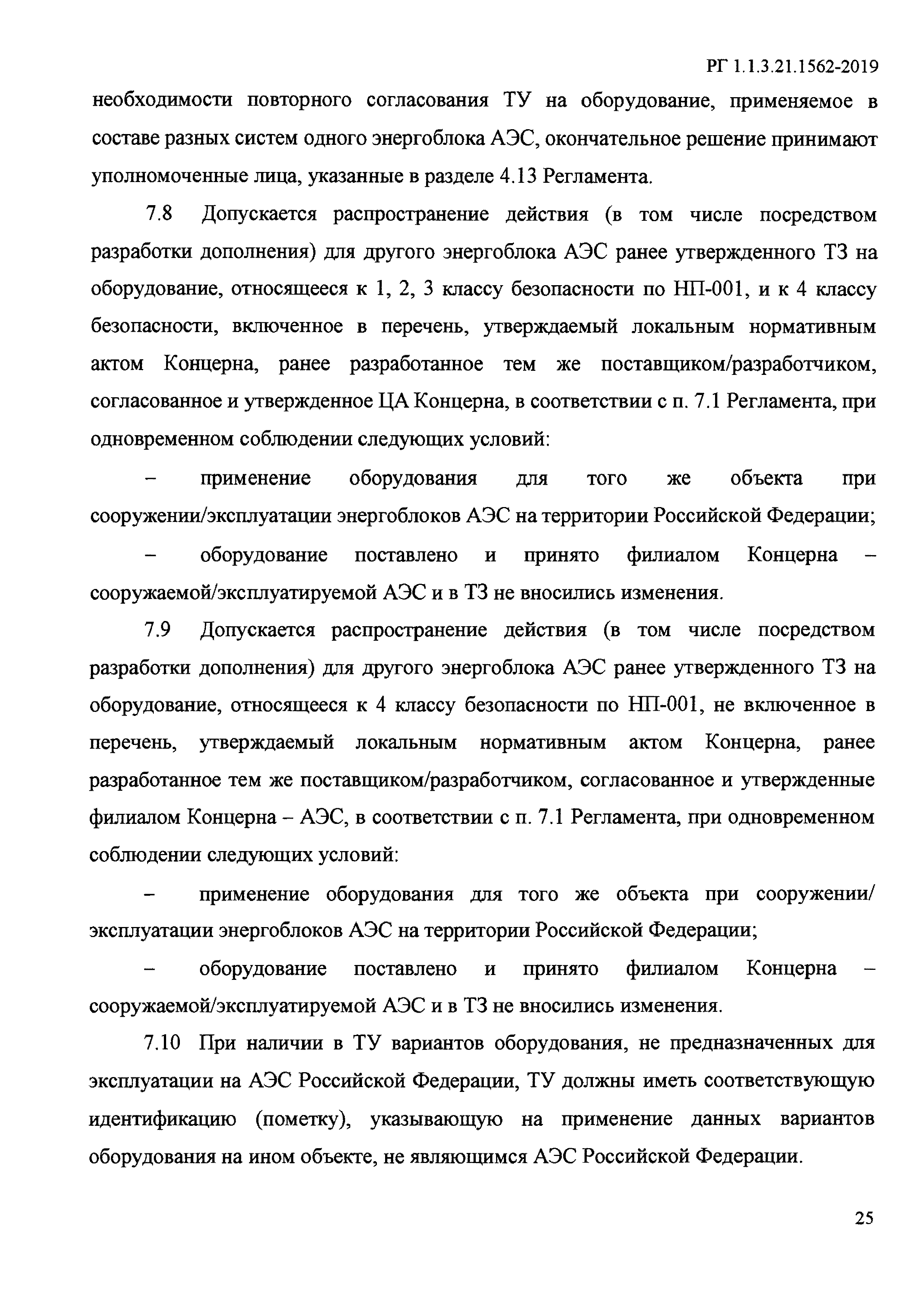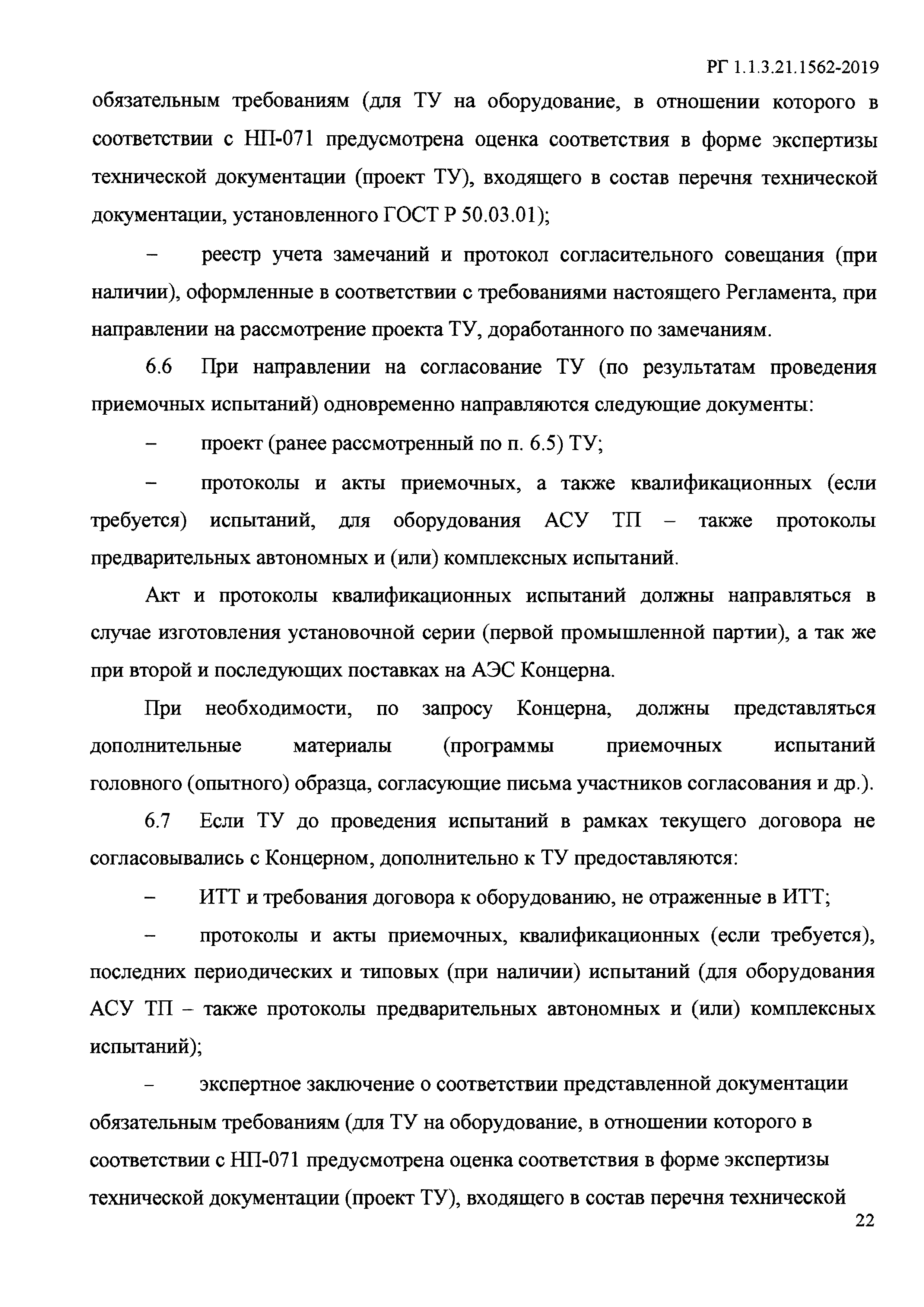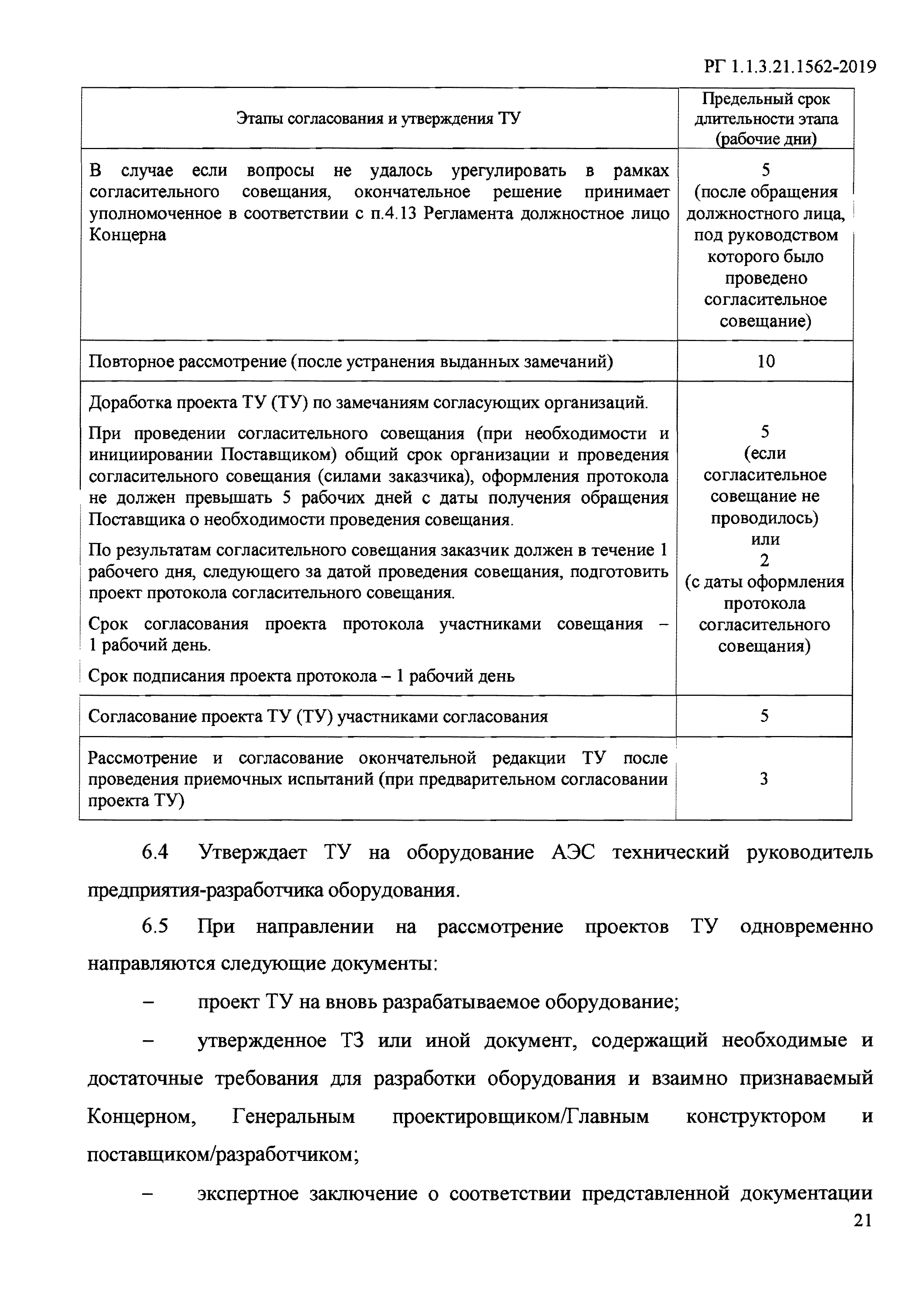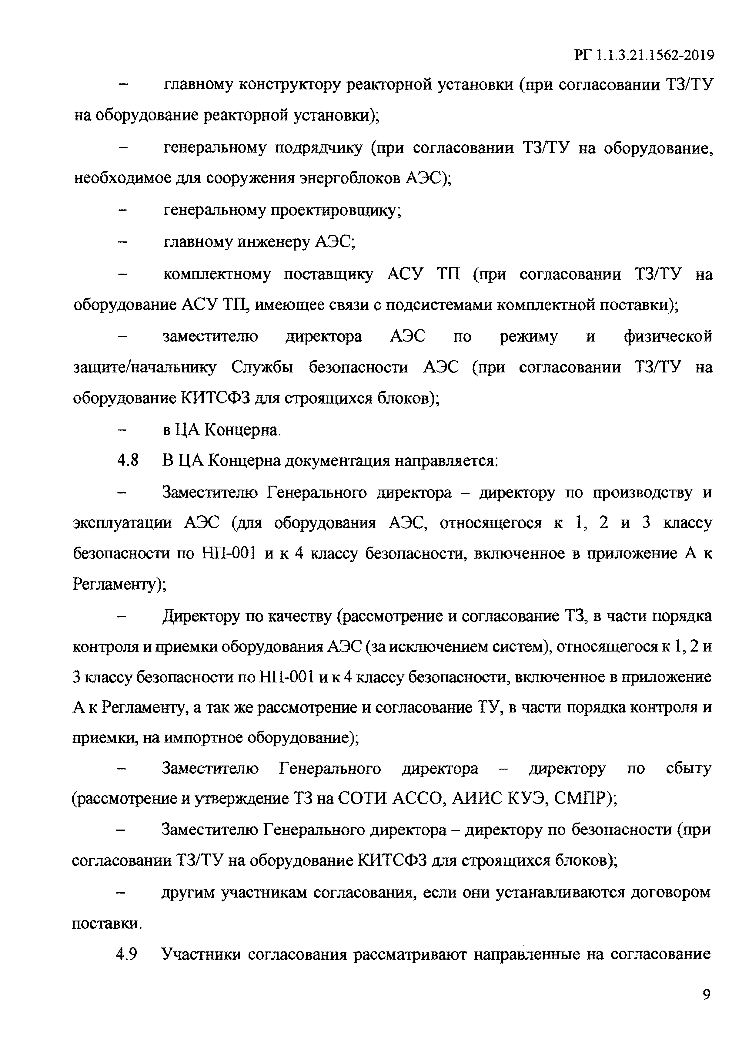 Согласование технических заданий и технических условий на оборудование и кабельную продукцию, применяемые на энергоблоках атомных станций. Регламент| Обозначение: | РГ 1.1.3.21.1562-2019 | | Обозначение англ: | 1.1.3.21.1562-2019 | | Статус: | взамен | | Название рус.: | Согласование технических заданий и технических условий на оборудование и кабельную продукцию, применяемые на энергоблоках атомных станций. Регламент | | Дата добавления в базу: | 01.02.2020 | | Дата актуализации: | 01.01.2021 | | Дата введения: | 25.04.2019 | | Область применения: | Регламент устанавливает требования к порядку согласования, утверждения, а так же ответственность и порядок взаимодействия участников процесса согласования ТЗ/ТУ в соответствии с Единым отраслевым порядком согласования технических заданий и технических условий на оборудование, необходимое для энергоблоков АЭС на территории Российской Федерации. Регламент предназначен для организации скоординированной деятельности подразделений АО "Концерн Росэнергоатом" и подрядных организаций при подготовке, согласовании и утверждении ТЗ и ТУ на оборудование (а также комплексы оборудования (системы), включая автоматизированные) и кабельную продукцию для АЭС Российской Федерации. | | Оглавление: | 1 Назначение и область применения 2 Нормативные ссылки 3 Термины, определения и сокращения 4 Основные положения 5 Согласование и утверждение технических заданий на оборудование атомных станций 6 Согласование технических условий на оборудование атомных станций 7 Внесение изменений в ранее утвержденные технические задания и технические условия 8 Контроль процесса согласования технических заданий и технических условий Приложение А (обязательное) Перечень оборудования 4 класса безопасности по НП-001-15, технические задания и технические условия для которого подлежат согласованию в ЦА Концерна Приложение Б (рекомендуемое) Форма реестра учета замечаний | | Разработан: | Департамент по эксплуатационной готовности новых АЭС ОАО Концерн Росэнергоатом