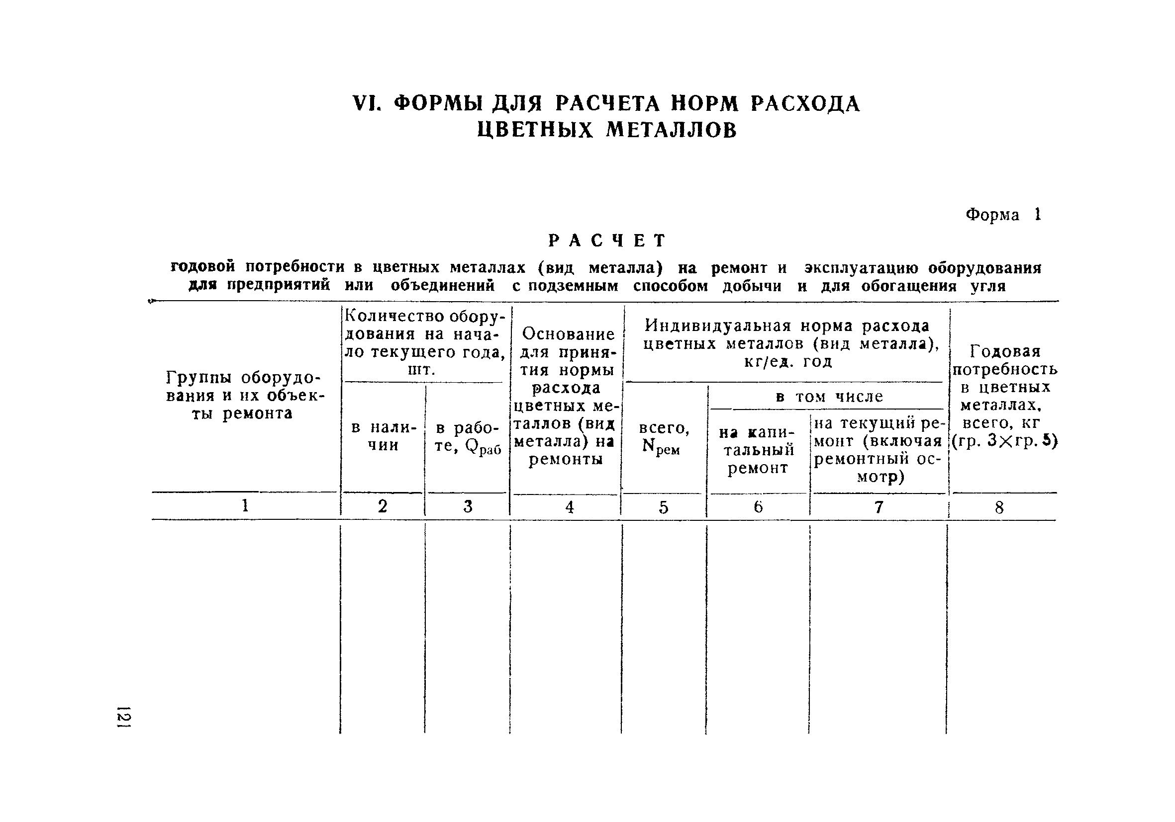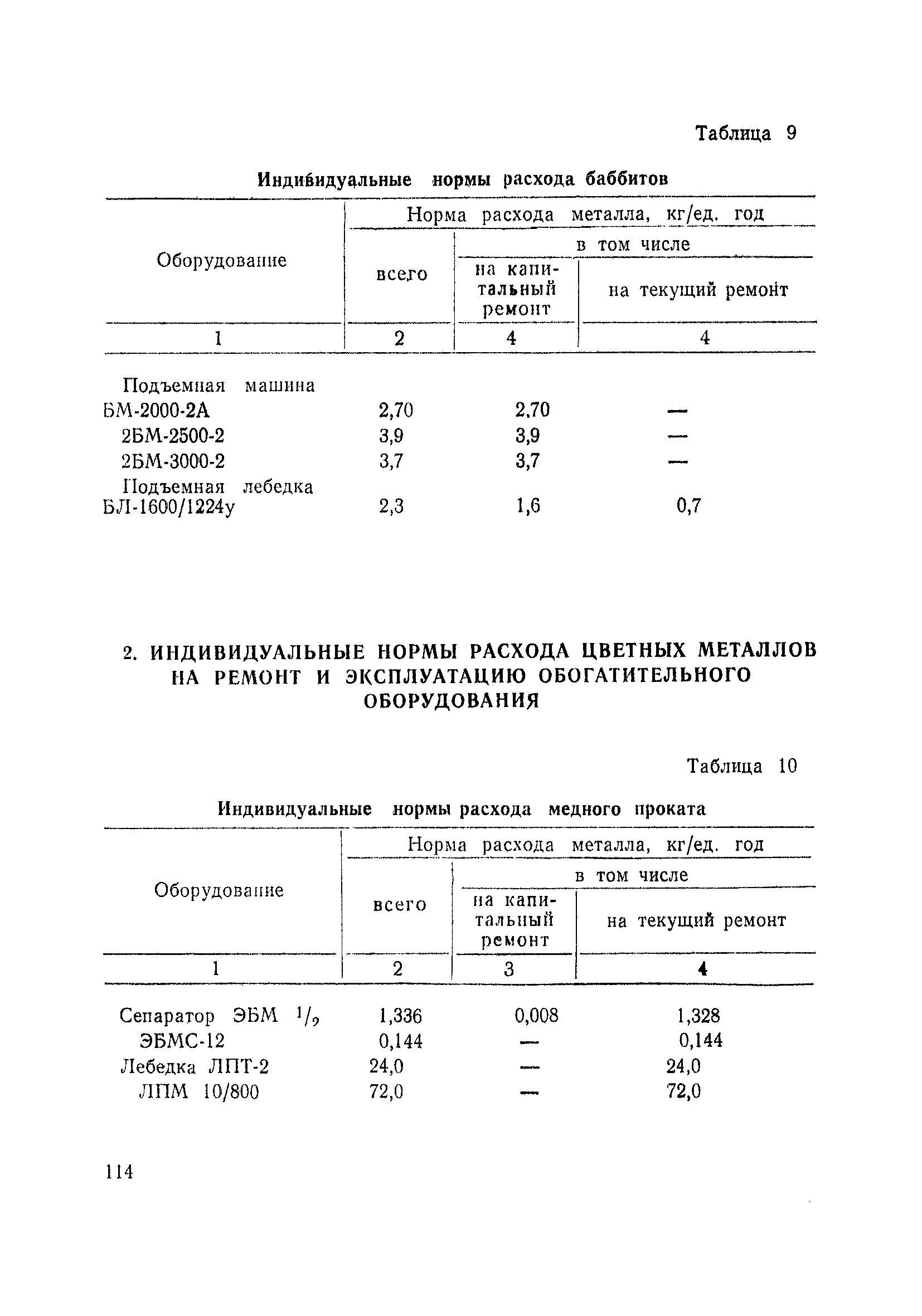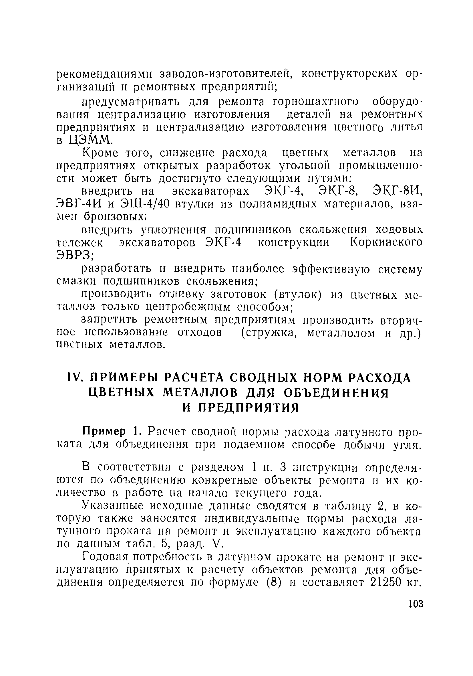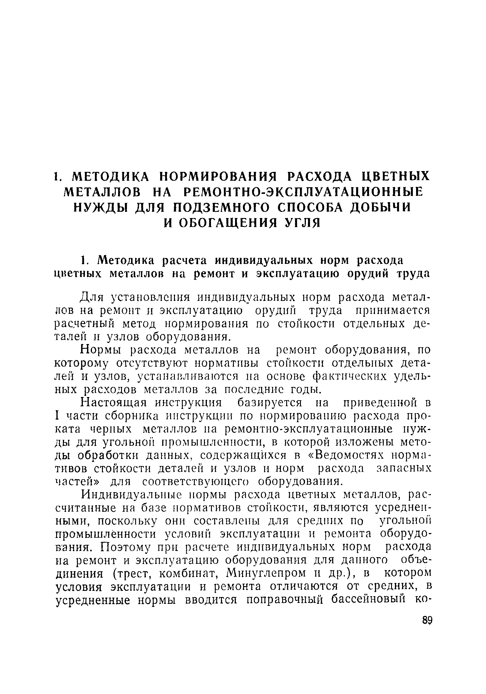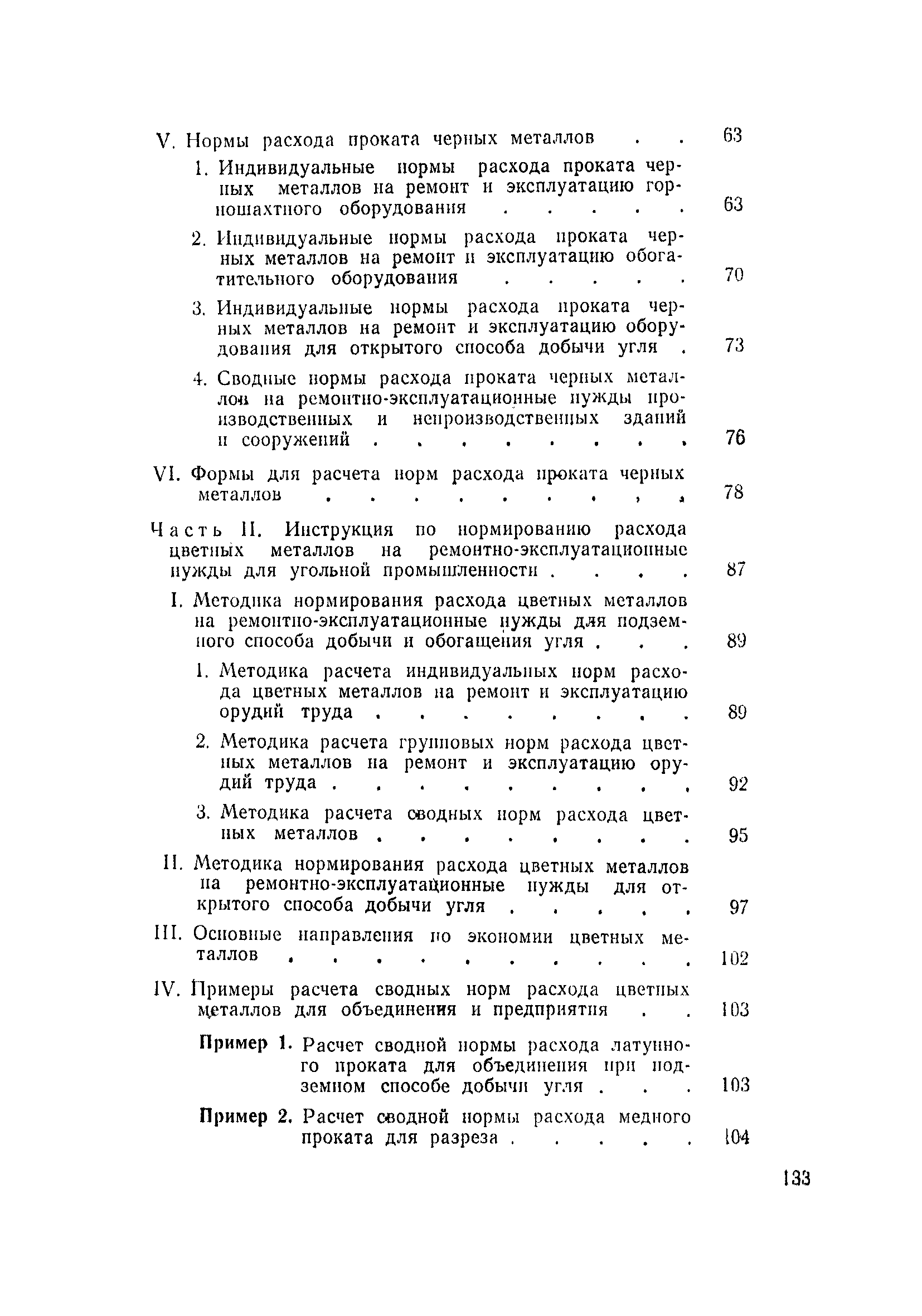 | Оглавление: | Общие положения Часть I. Инструкция во нормированию расхода проката черных металлов на ремонтно-эксплуатационные нужды для угольной промышленности I Методика нормирования расхода проката черных металлов на ремонтно-эксплуатационные нужды для подземного способа добычи и обогащения угля II. Методика нормирования расхода проката черных металлов на ремонтно-эксплуатационные нужды для открытого способа добычи угля III. Основные направления по экономии проката черных металлов IV. Примеры расчета потребности и сводных норм расхода проката черных металлов для объединения и предприятия V. Нормы расхода проката черных металлов VI. Формы для расчета норм расхода проката черных металлов Часть II. Инструкция по нормированию расхода цветных металлов на ремонтно-эксплуатационные нужды для угольной промышленности I. Методика нормирования расхода цветных металлов на ремонтно-эксплуатационные нужды для подземного способа добычи и обогащения угля II. Методика нормирования расхода цветных металлов на ремонтно-эксплуатационные нужды для открытого способа добычи угля III. Основные направления по экономии цветных металлов IV. Примеры расчета сводных норм расхода цветных металлов для объединения и предприятия V. Нормы расхода цветных металлов VI. Формы для расчета норм расхода цветных металлов Приложение Перечень оборудования, для которого разработаны индивидуальные нормы расхода на ремонт и эксплуатацию горношахтного оборудования |