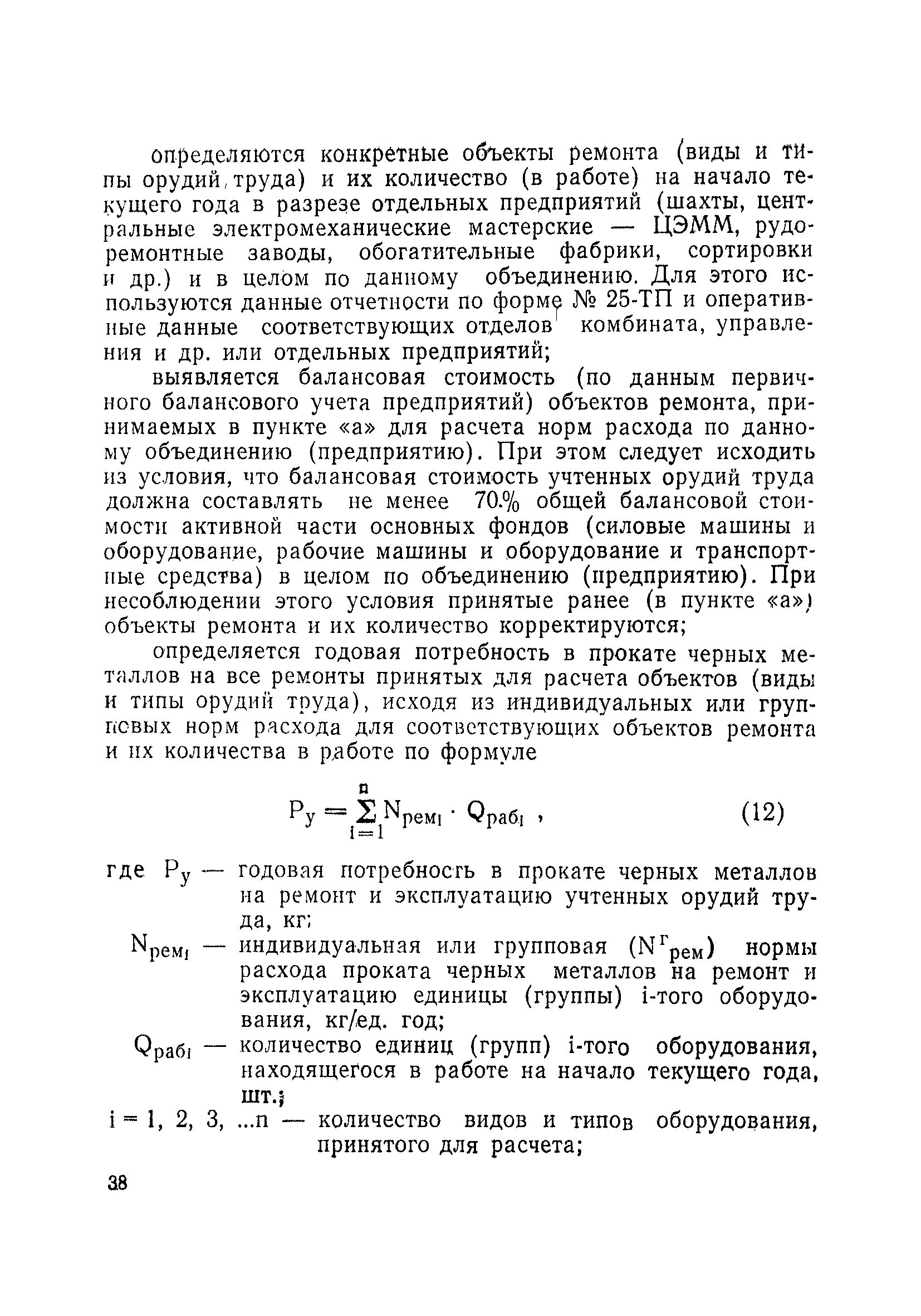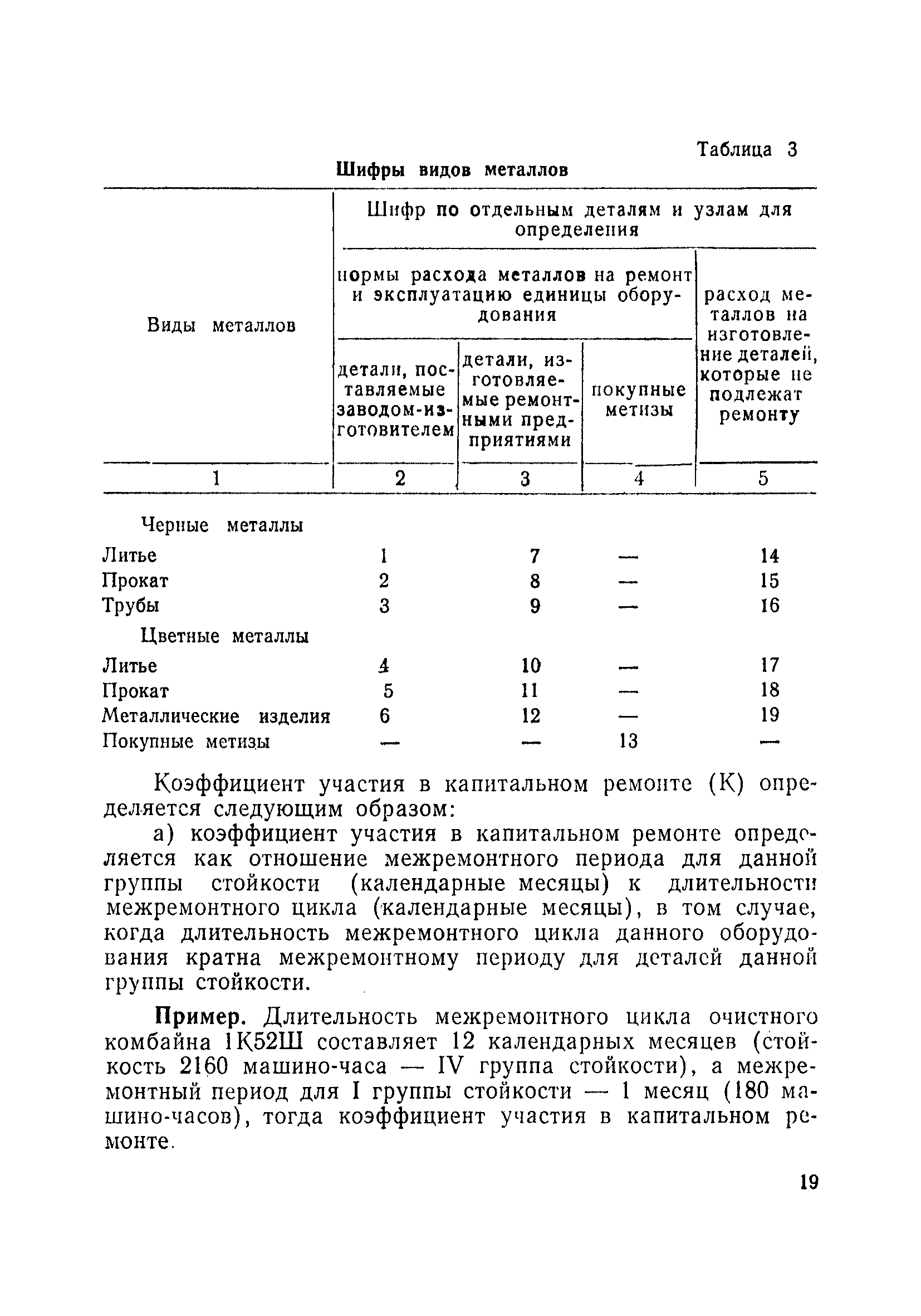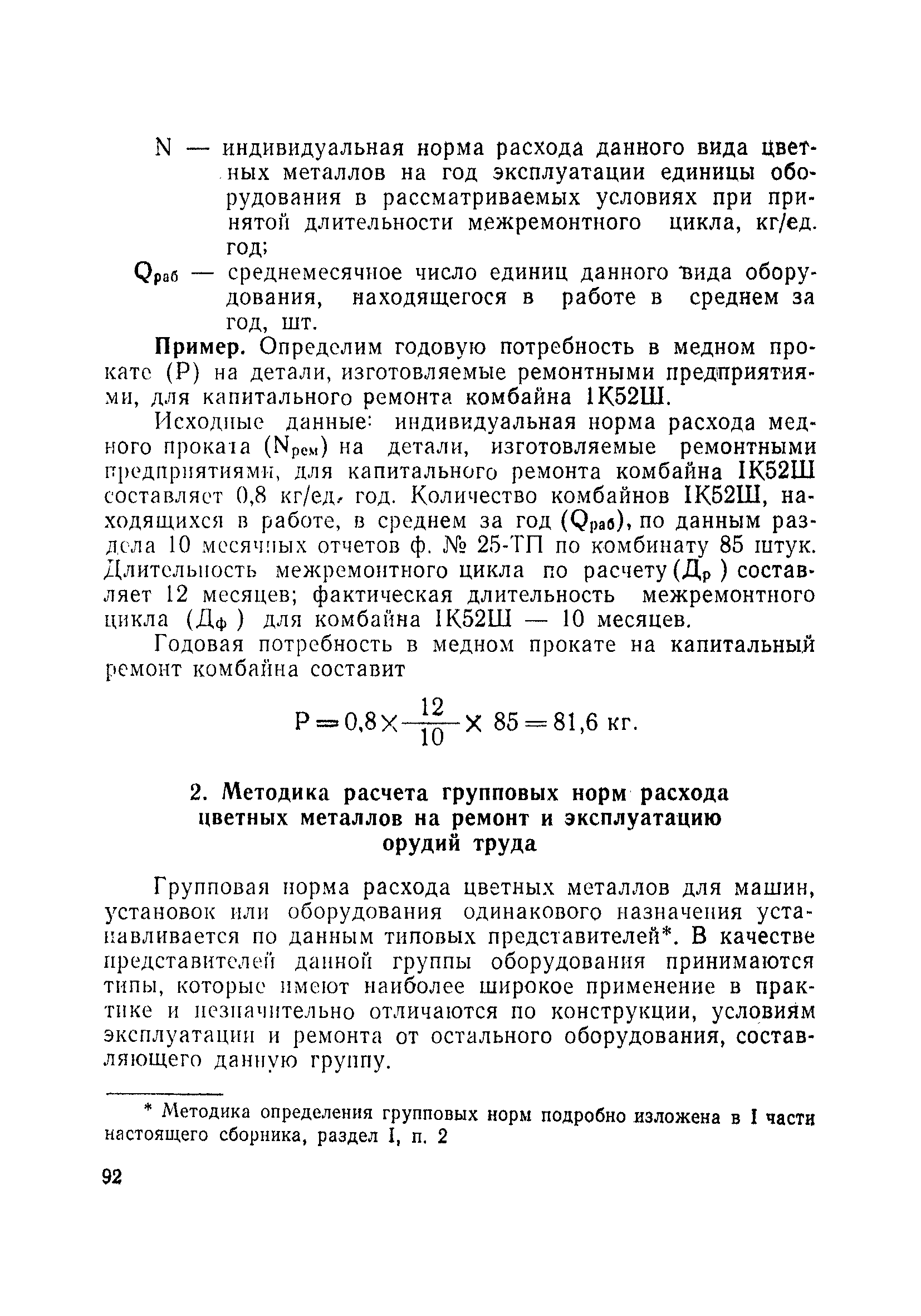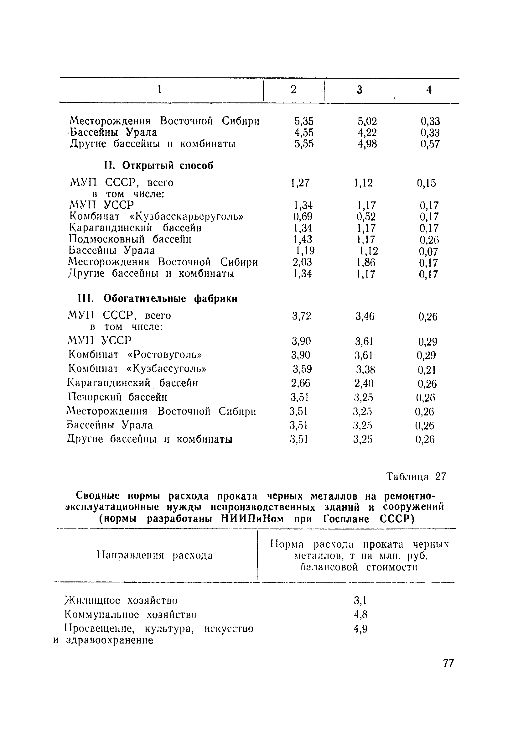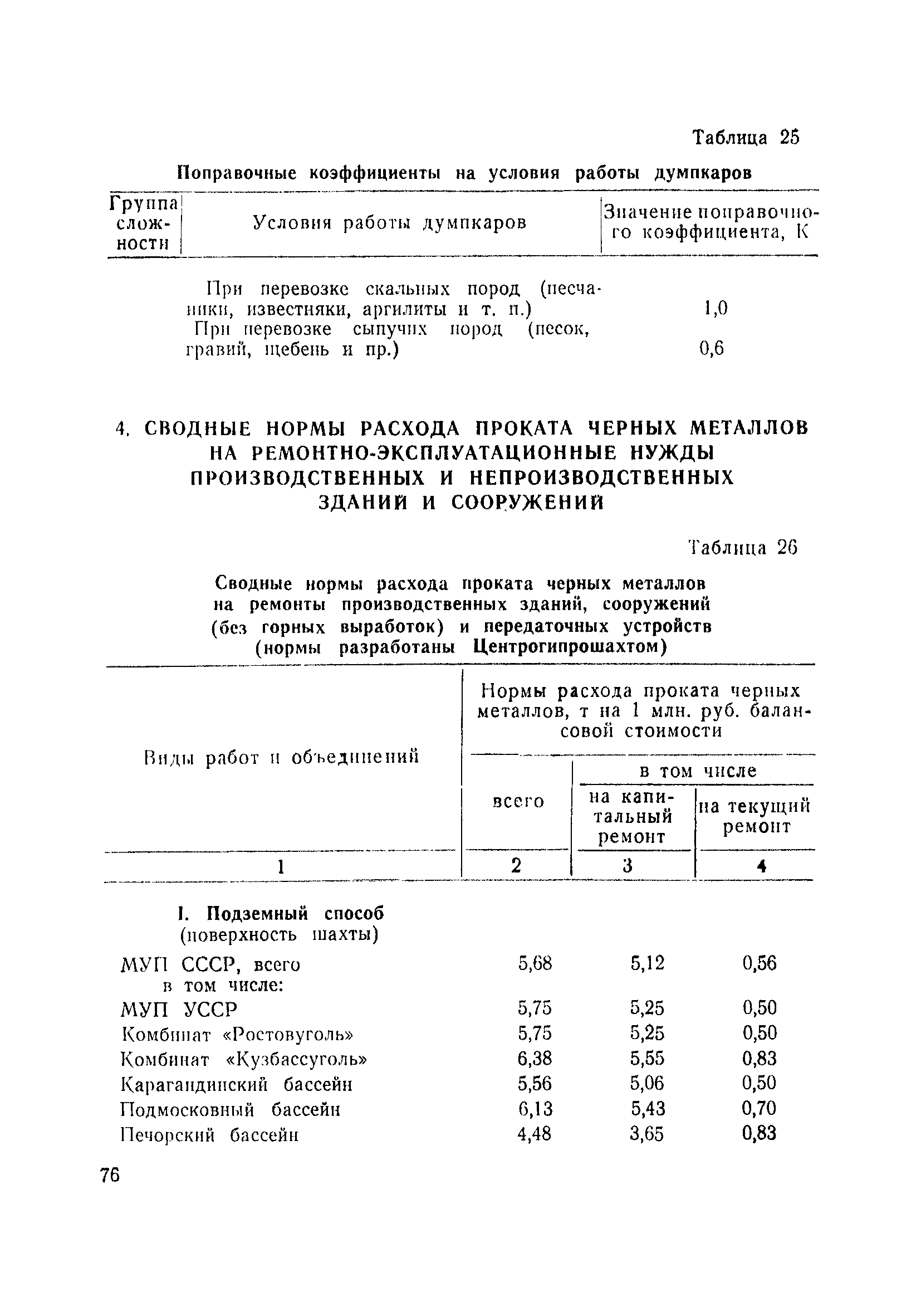 | Оглавление: | Общие положения Часть I. Инструкция во нормированию расхода проката черных металлов на ремонтно-эксплуатационные нужды для угольной промышленности I Методика нормирования расхода проката черных металлов на ремонтно-эксплуатационные нужды для подземного способа добычи и обогащения угля II. Методика нормирования расхода проката черных металлов на ремонтно-эксплуатационные нужды для открытого способа добычи угля III. Основные направления по экономии проката черных металлов IV. Примеры расчета потребности и сводных норм расхода проката черных металлов для объединения и предприятия V. Нормы расхода проката черных металлов VI. Формы для расчета норм расхода проката черных металлов Часть II. Инструкция по нормированию расхода цветных металлов на ремонтно-эксплуатационные нужды для угольной промышленности I. Методика нормирования расхода цветных металлов на ремонтно-эксплуатационные нужды для подземного способа добычи и обогащения угля II. Методика нормирования расхода цветных металлов на ремонтно-эксплуатационные нужды для открытого способа добычи угля III. Основные направления по экономии цветных металлов IV. Примеры расчета сводных норм расхода цветных металлов для объединения и предприятия V. Нормы расхода цветных металлов VI. Формы для расчета норм расхода цветных металлов Приложение Перечень оборудования, для которого разработаны индивидуальные нормы расхода на ремонт и эксплуатацию горношахтного оборудования |