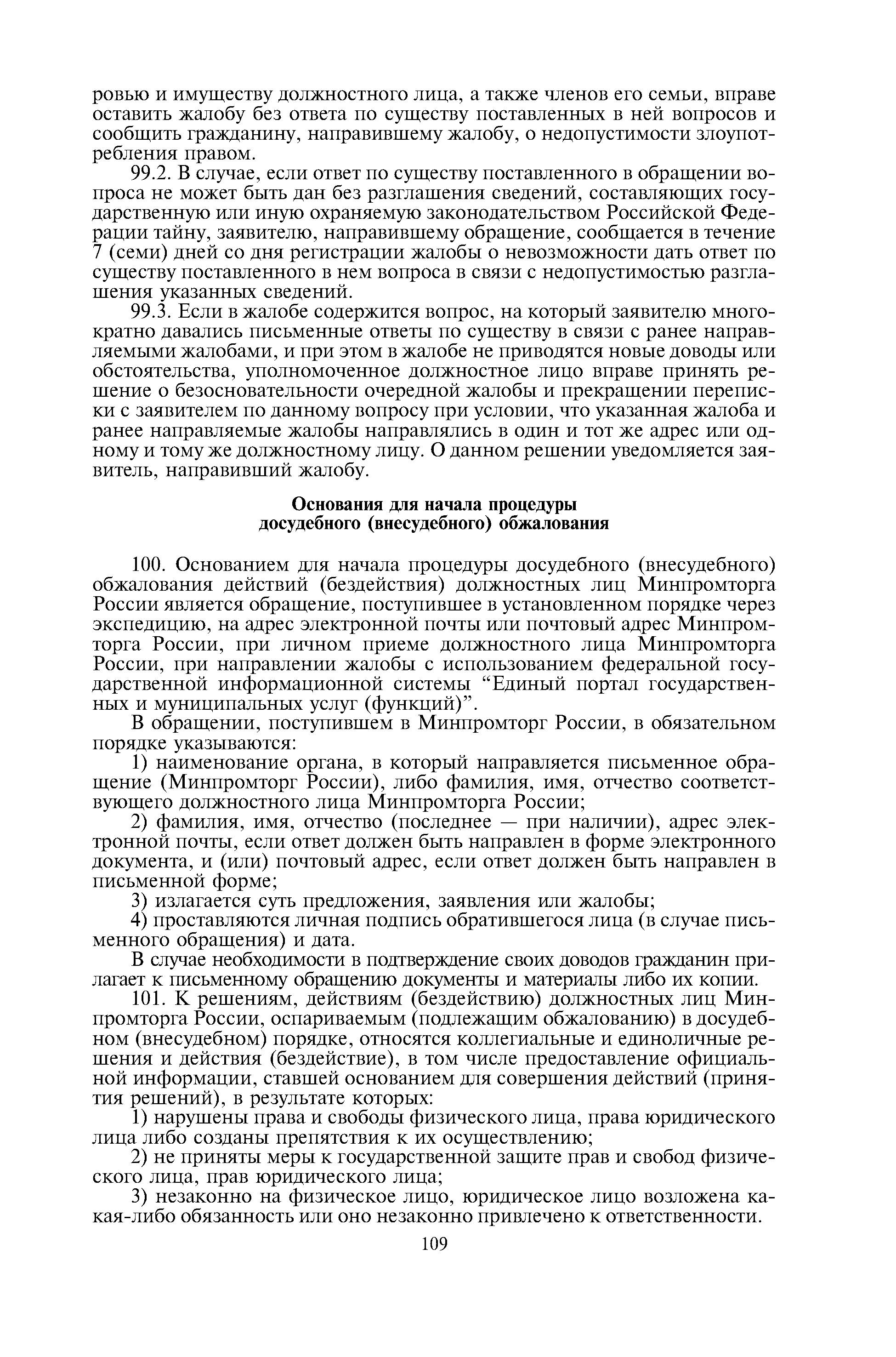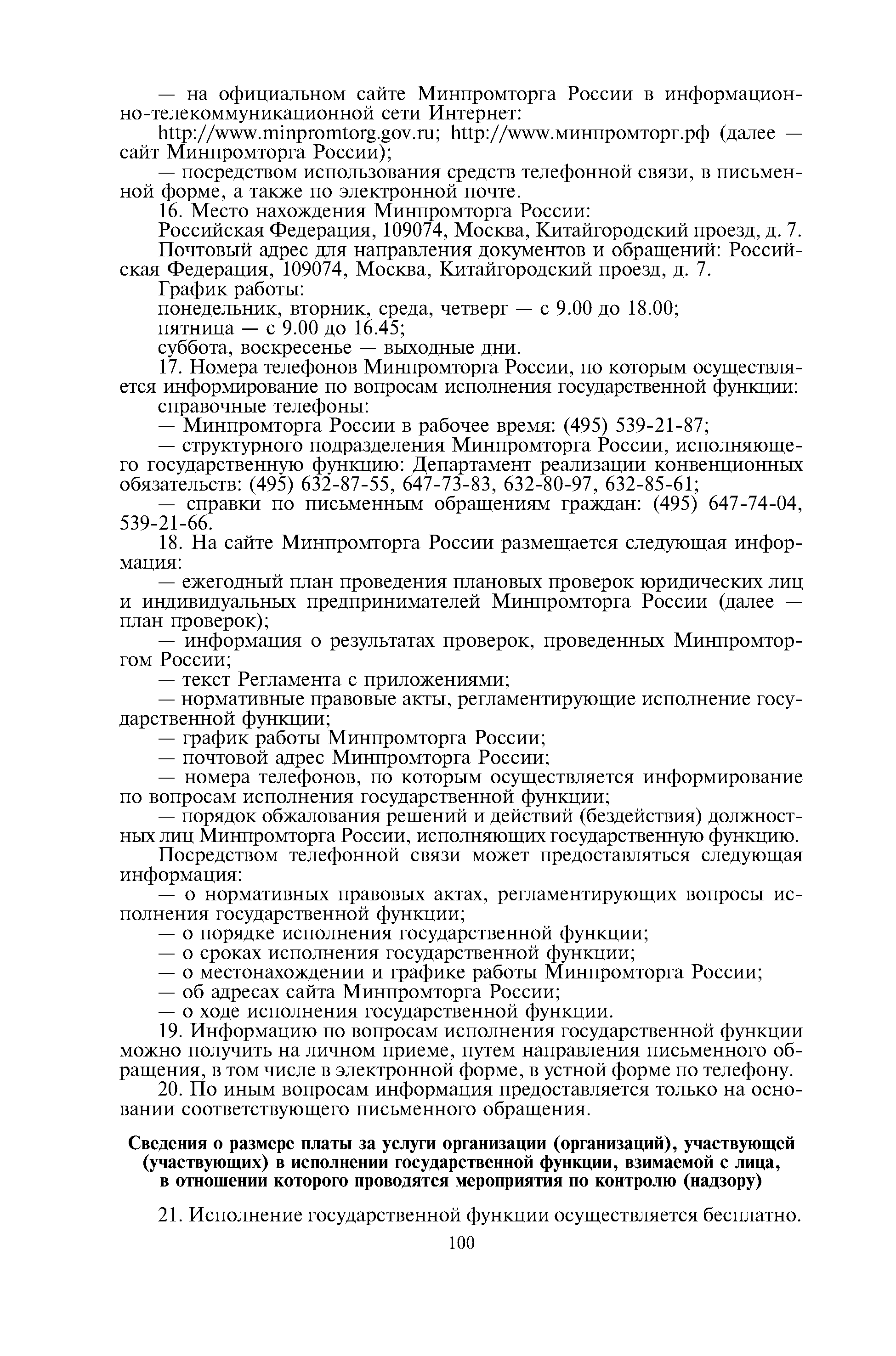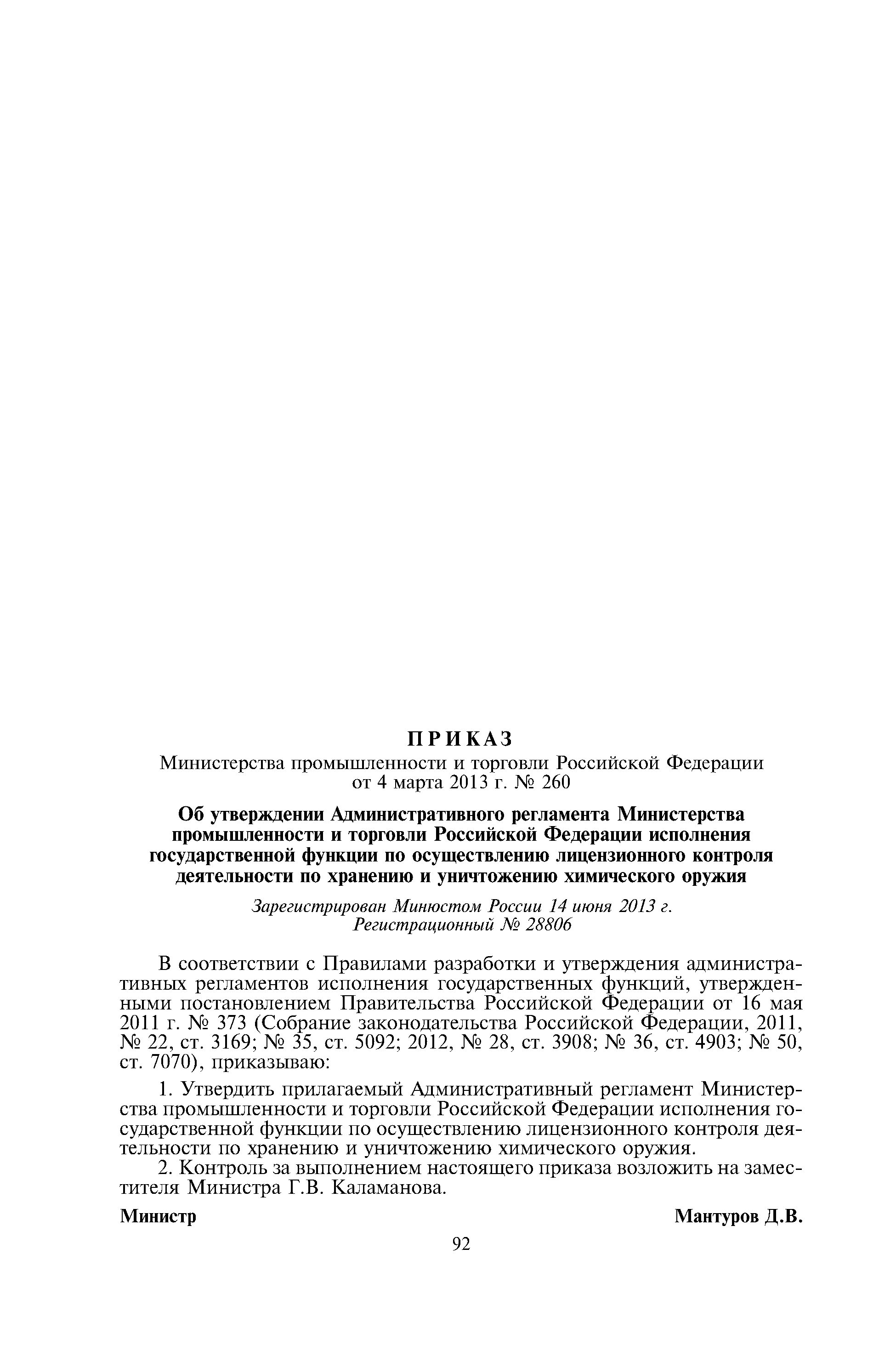 Административный регламент исполнения Министерством промышленности и торговли Российской Федерации государственной функции по осуществлению лицензионного контроля деятельности по хранению и уничтожению химического оружия| Статус: | действует | | Название рус.: | Административный регламент исполнения Министерством промышленности и торговли Российской Федерации государственной функции по осуществлению лицензионного контроля деятельности по хранению и уничтожению химического оружия | | Дата добавления в базу: | 01.02.2020 | | Дата актуализации: | 01.01.2021 | | Дата введения: | 23.08.2013 | | Область применения: | Административный регламент устанавливает сроки и последовательность административных процедур (действий) при осуществлении лицензионного контроля, а также порядок взаимодействия между структурными подразделениями Министерства промышленности и торговли Российской Федерации, их должностными лицами с лицензиатами, иными органами государственной власти при исполнении государственной функции | | Оглавление: | I. Общие положения II. Требования к порядку исполнения государственной функции III. Состав, последовательность и сроки выполнения административных процедур (действий), требования к порядку их выполнения, в том числе особенности выполнения административных процедур (действий) в электронной форме IV. Порядок и формы контроля за исполнением государственной функции V. Досудебный (внесудебный) порядок обжалования решений и действий (бездействия) Минпромторга России и должностных лиц Информация для заинтересованных лиц об их праве на досудебное (внесудебное) обжалование действий (бездействий) и решений, принятых (осуществляемых) в ходе исполнения государственной функции | | Утверждён: | 04.03.2013 Министерство промышленности и торговли РФ (260)