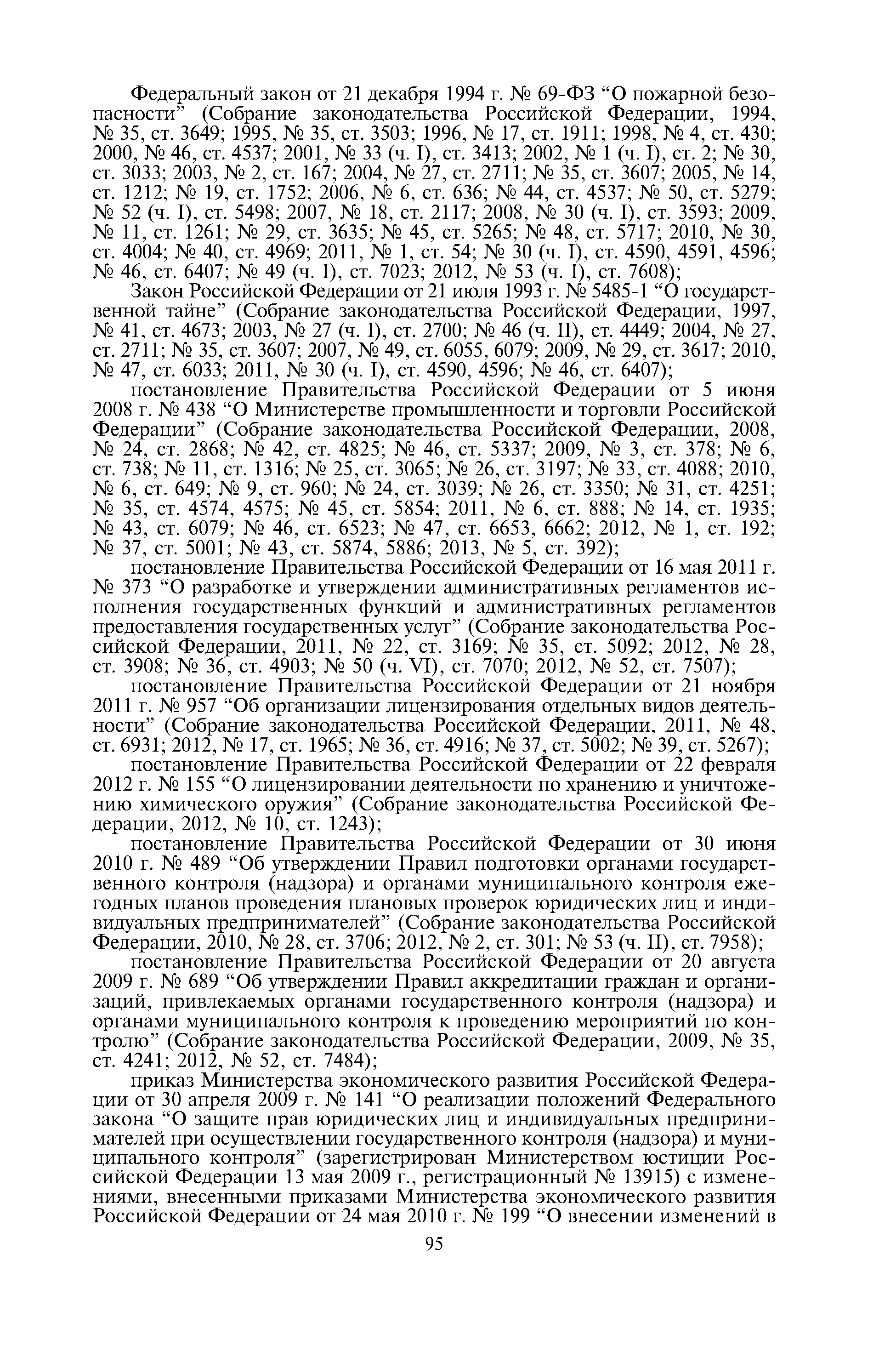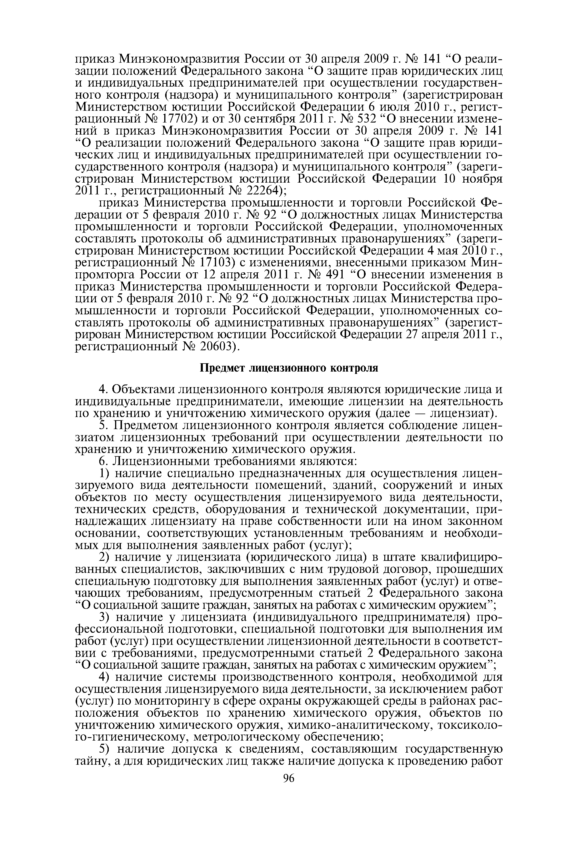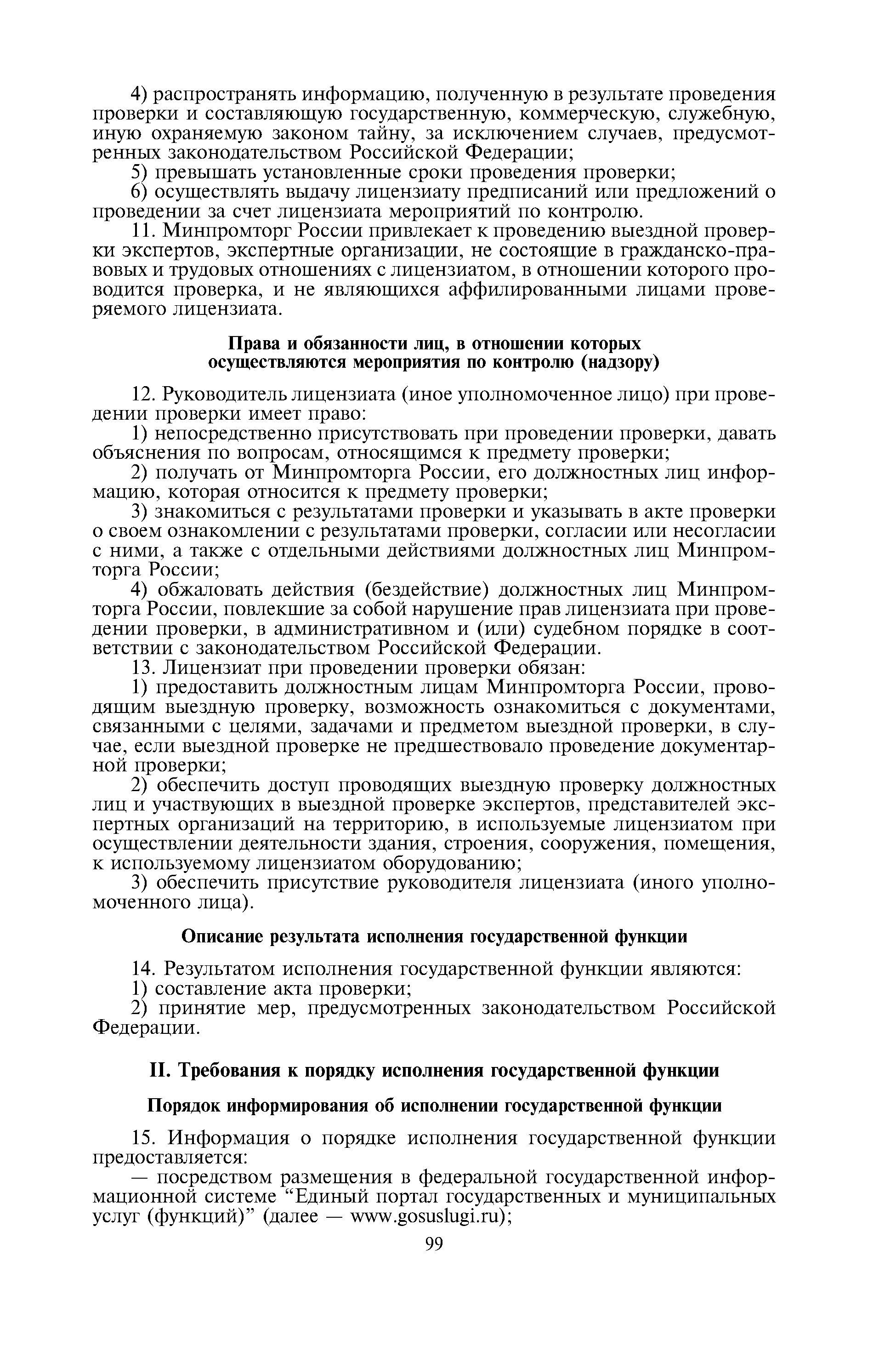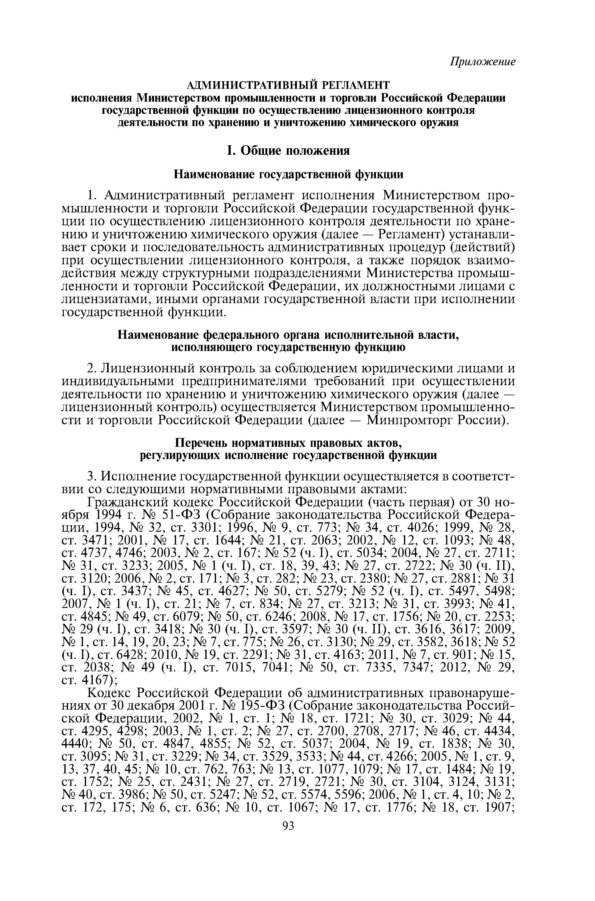 | | Нормативные ссылки: |   Федеральный закон 69-ФЗ «О пожарной безопасности»  Федеральный закон 116-ФЗ «О промышленной безопасности опасных производственных объектов»  Федеральный закон 52-ФЗ «О санитарно-эпидемиологическом благополучии населения»  Федеральный закон 181-ФЗ «О социальной защите инвалидов в Российской Федерации»  Федеральный закон 7-ФЗ «Об охране окружающей среды»  Федеральный закон 149-ФЗ «Об информации, информационных технологиях и о защите информации»  Закон 5485-I «О государственной тайне»  Федеральный закон 294-ФЗ «О защите прав юридических лиц и индивидуальных предпринимателей при осуществлении государственного контроля (надзора) и муниципального контроля»  Федеральный закон 63-ФЗ «Об электронной подписи»  Федеральный закон 99-ФЗ «О лицензировании отдельных видов деятельности» Постановление 957 «Об организации лицензирования отдельных видов деятельности» «Положение о лицензировании деятельности по хранению и уничтожению химического оружия» Постановление 373 «О разработке и утверждении административных регламентов осуществления государственного контроля (надзора) и административных регламентов предоставления государственных услуг»  Федеральный закон 210-ФЗ «Об организации предоставления государственных и муниципальных услуг»  «Правила предоставления документов по вопросам лицензирования в форме электронных документов»  «Типовая форма лицензии»  «Требования к предоставлению в электронной форме государственных и муниципальных услуг»  Постановление 438 «О Министерстве промышленности и торговли Российской Федерации» «Правила подачи и рассмотрения жалоб на решения и действия (бездействие) федеральных органов исполнительной власти и их должностных лиц, федеральных государственных служащих, должностных лиц государственных внебюджетных фондов Российской Федерации, государственных корпораций, наделенных в соответствии с федеральными законами полномочиями по предоставлению государственных услуг в установленной сфере деятельности, и их должностных лиц, организаций, предусмотренных частью 1.1 статьи 16 Федерального закона "Об организации предоставления государственных и муниципальных услуг", и их работников, а также многофункциональных центров предоставления государственных и муниципальных услуг и их работников»