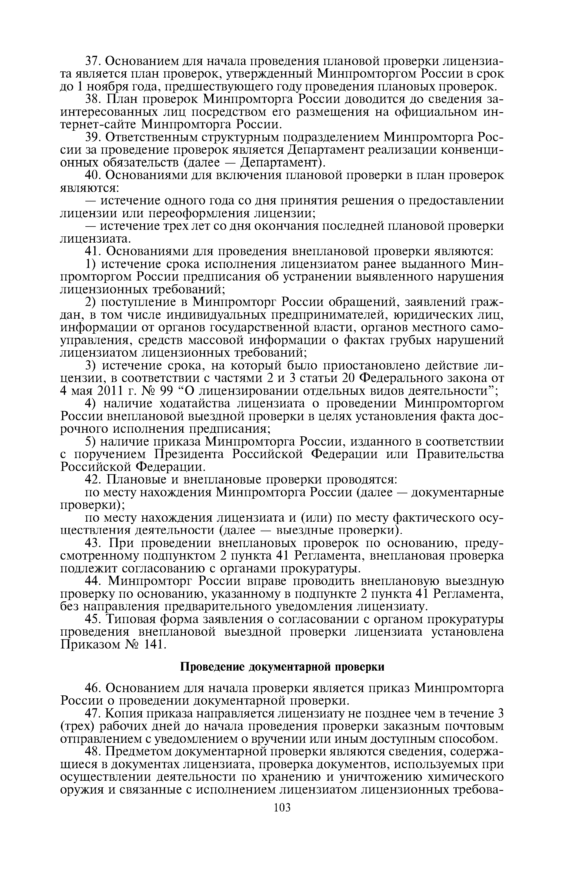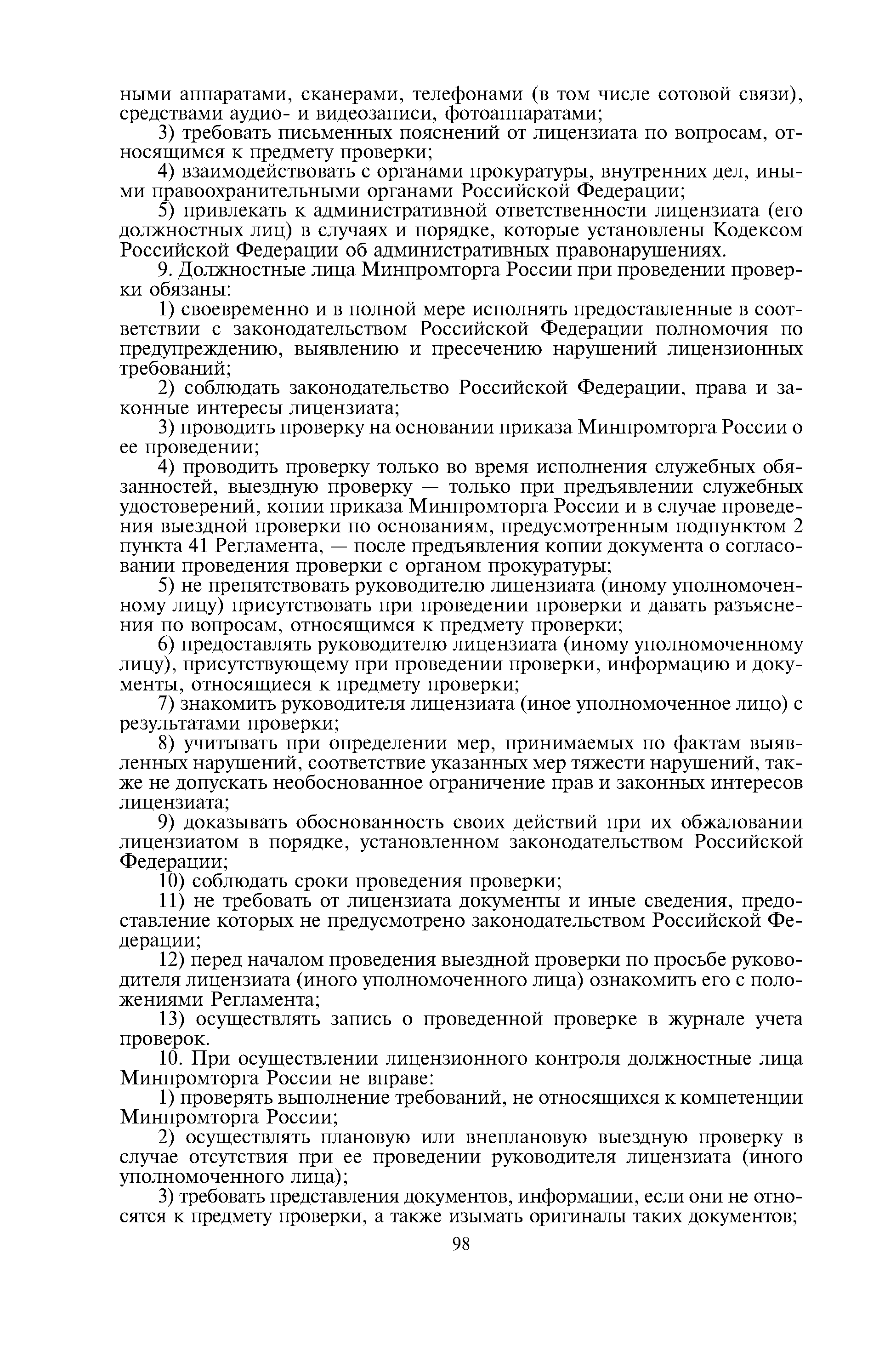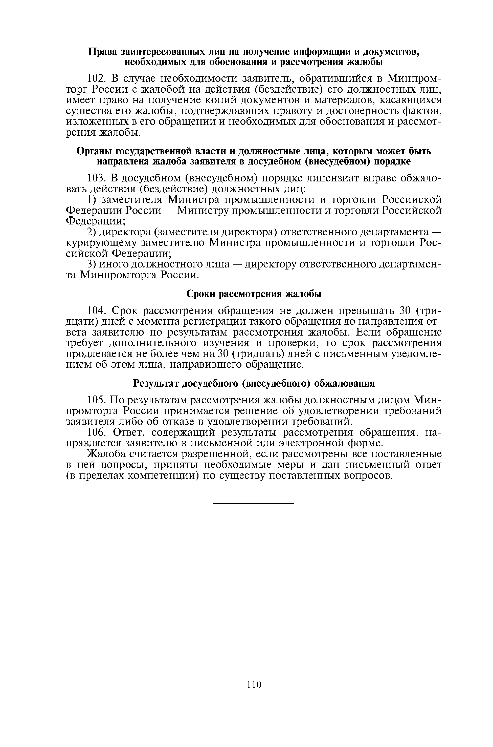 | | Нормативные ссылки: |   Федеральный закон 69-ФЗ «О пожарной безопасности»  Федеральный закон 116-ФЗ «О промышленной безопасности опасных производственных объектов»  Федеральный закон 52-ФЗ «О санитарно-эпидемиологическом благополучии населения»  Федеральный закон 181-ФЗ «О социальной защите инвалидов в Российской Федерации»  Федеральный закон 7-ФЗ «Об охране окружающей среды»  Федеральный закон 149-ФЗ «Об информации, информационных технологиях и о защите информации»  Закон 5485-I «О государственной тайне»  Федеральный закон 294-ФЗ «О защите прав юридических лиц и индивидуальных предпринимателей при осуществлении государственного контроля (надзора) и муниципального контроля»  Федеральный закон 63-ФЗ «Об электронной подписи»  Федеральный закон 99-ФЗ «О лицензировании отдельных видов деятельности» Постановление 957 «Об организации лицензирования отдельных видов деятельности» «Положение о лицензировании деятельности по хранению и уничтожению химического оружия» Постановление 373 «О разработке и утверждении административных регламентов осуществления государственного контроля (надзора) и административных регламентов предоставления государственных услуг»  Федеральный закон 210-ФЗ «Об организации предоставления государственных и муниципальных услуг»  «Правила предоставления документов по вопросам лицензирования в форме электронных документов»  «Типовая форма лицензии»  «Требования к предоставлению в электронной форме государственных и муниципальных услуг»  Постановление 438 «О Министерстве промышленности и торговли Российской Федерации» «Правила подачи и рассмотрения жалоб на решения и действия (бездействие) федеральных органов исполнительной власти и их должностных лиц, федеральных государственных служащих, должностных лиц государственных внебюджетных фондов Российской Федерации, государственных корпораций, наделенных в соответствии с федеральными законами полномочиями по предоставлению государственных услуг в установленной сфере деятельности, и их должностных лиц, организаций, предусмотренных частью 1.1 статьи 16 Федерального закона "Об организации предоставления государственных и муниципальных услуг", и их работников, а также многофункциональных центров предоставления государственных и муниципальных услуг и их работников»