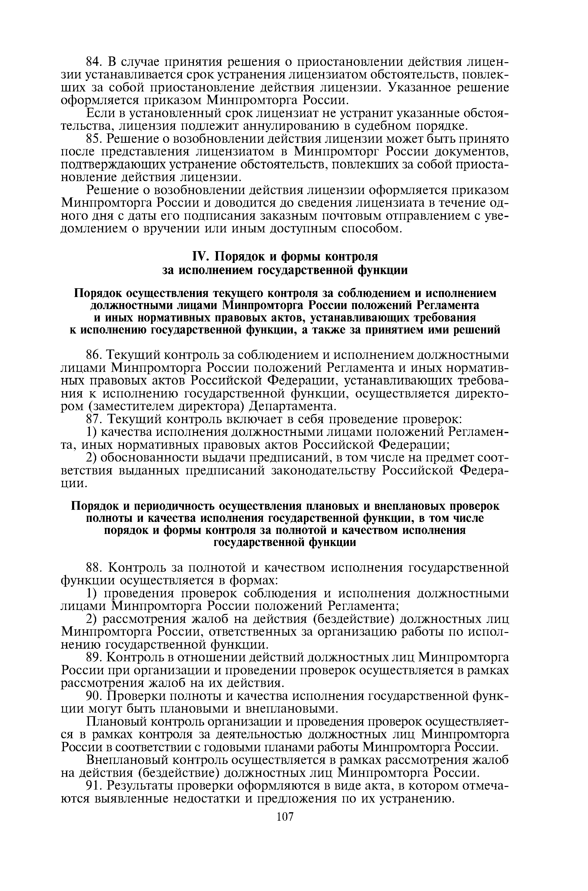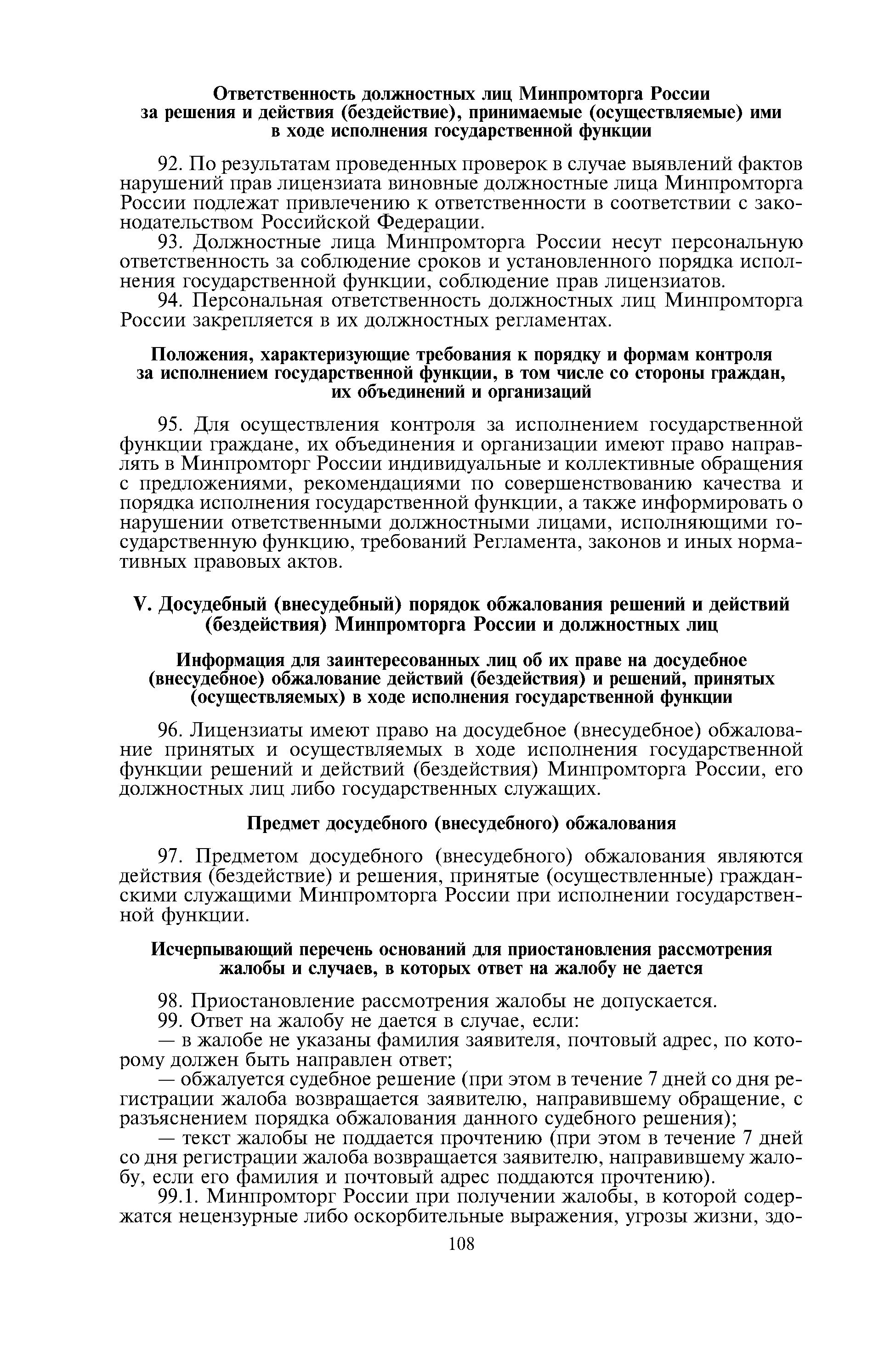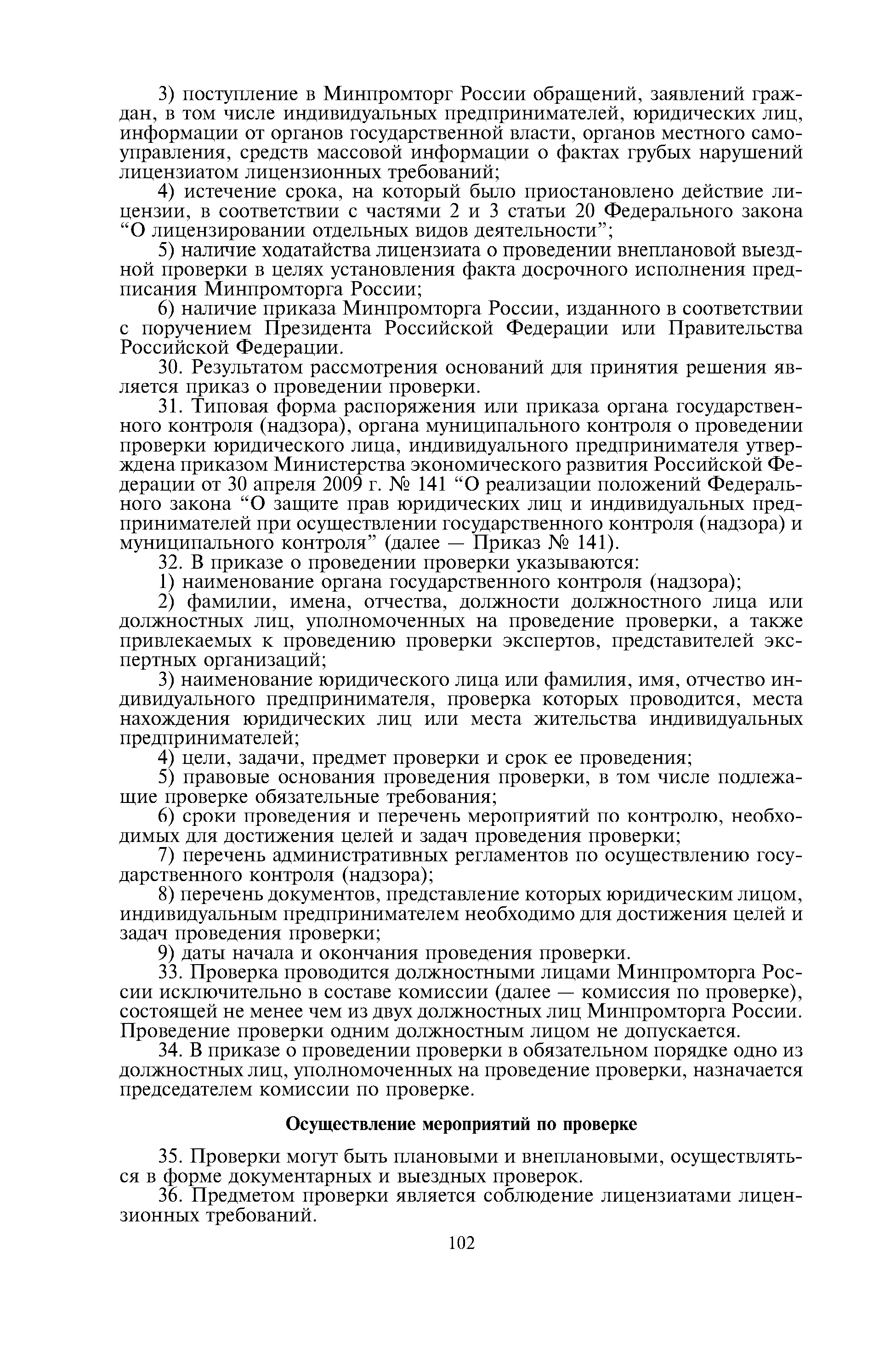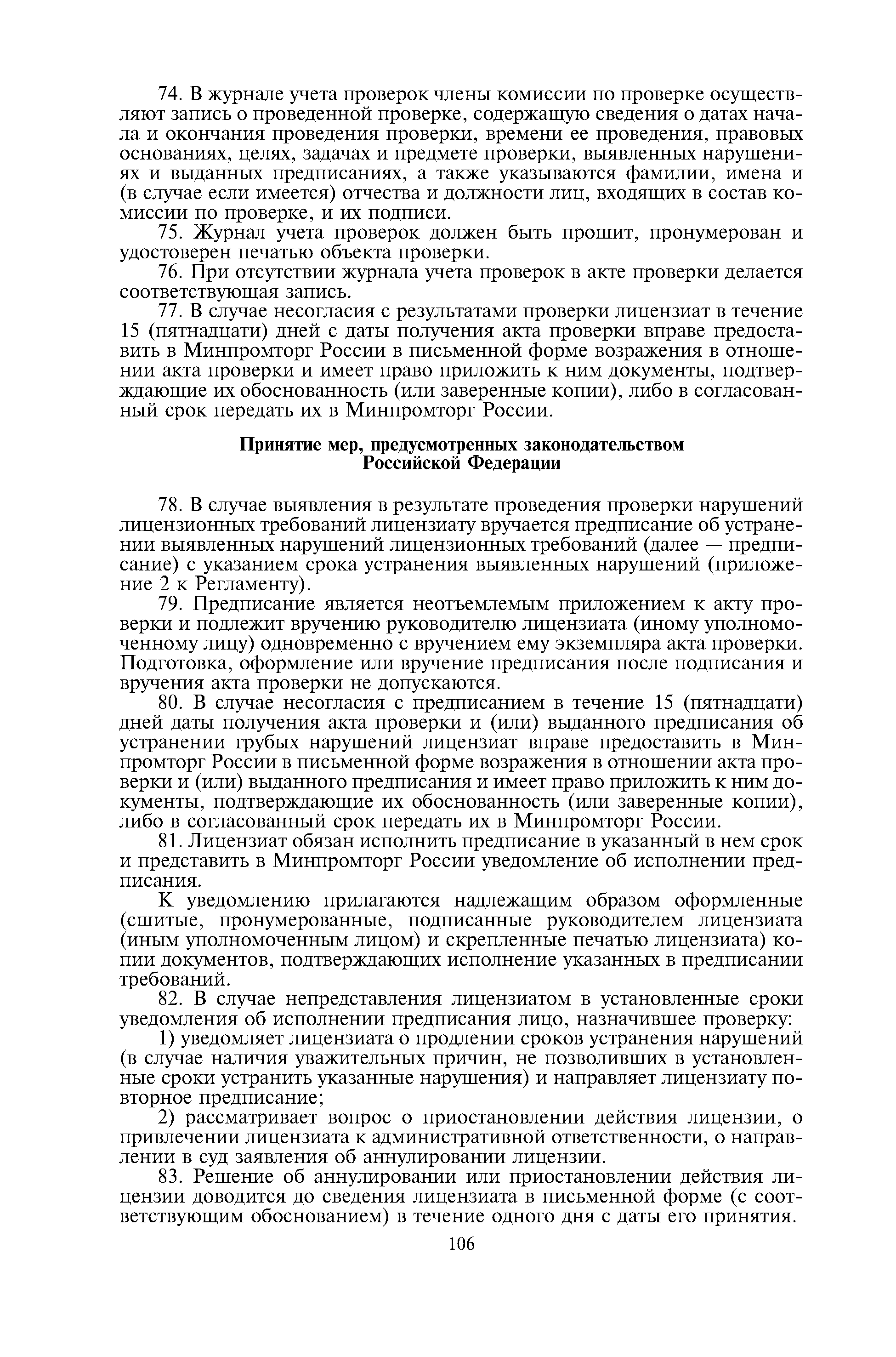| | Нормативные ссылки: |   Федеральный закон 69-ФЗ «О пожарной безопасности»  Федеральный закон 116-ФЗ «О промышленной безопасности опасных производственных объектов»  Федеральный закон 52-ФЗ «О санитарно-эпидемиологическом благополучии населения»  Федеральный закон 181-ФЗ «О социальной защите инвалидов в Российской Федерации»  Федеральный закон 7-ФЗ «Об охране окружающей среды»  Федеральный закон 149-ФЗ «Об информации, информационных технологиях и о защите информации»  Закон 5485-I «О государственной тайне»  Федеральный закон 294-ФЗ «О защите прав юридических лиц и индивидуальных предпринимателей при осуществлении государственного контроля (надзора) и муниципального контроля»  Федеральный закон 63-ФЗ «Об электронной подписи»  Федеральный закон 99-ФЗ «О лицензировании отдельных видов деятельности» Постановление 957 «Об организации лицензирования отдельных видов деятельности» «Положение о лицензировании деятельности по хранению и уничтожению химического оружия» Постановление 373 «О разработке и утверждении административных регламентов осуществления государственного контроля (надзора) и административных регламентов предоставления государственных услуг»  Федеральный закон 210-ФЗ «Об организации предоставления государственных и муниципальных услуг»  «Правила предоставления документов по вопросам лицензирования в форме электронных документов»  «Типовая форма лицензии»  «Требования к предоставлению в электронной форме государственных и муниципальных услуг»  Постановление 438 «О Министерстве промышленности и торговли Российской Федерации» «Правила подачи и рассмотрения жалоб на решения и действия (бездействие) федеральных органов исполнительной власти и их должностных лиц, федеральных государственных служащих, должностных лиц государственных внебюджетных фондов Российской Федерации, государственных корпораций, наделенных в соответствии с федеральными законами полномочиями по предоставлению государственных услуг в установленной сфере деятельности, и их должностных лиц, организаций, предусмотренных частью 1.1 статьи 16 Федерального закона "Об организации предоставления государственных и муниципальных услуг", и их работников, а также многофункциональных центров предоставления государственных и муниципальных услуг и их работников»