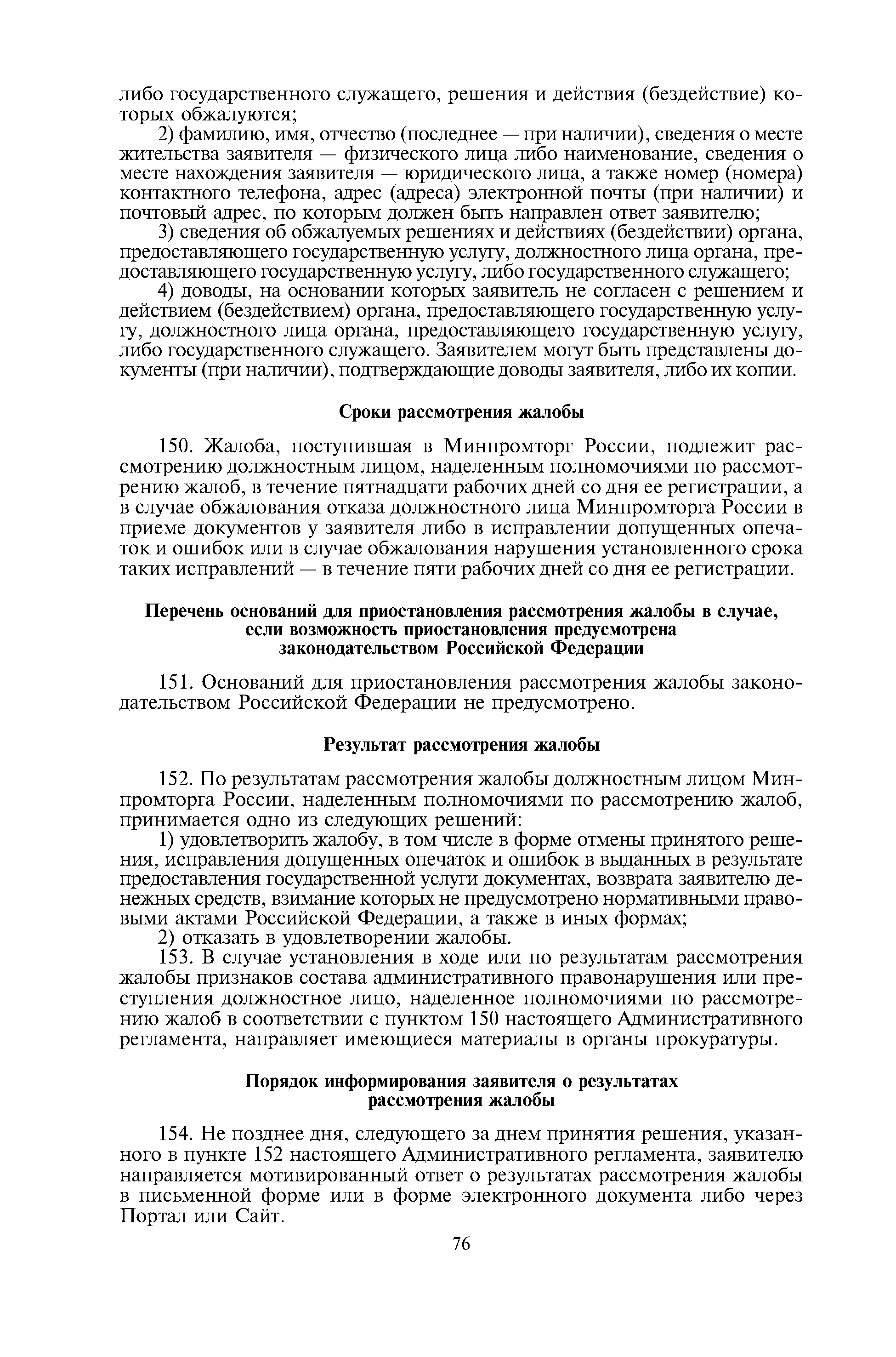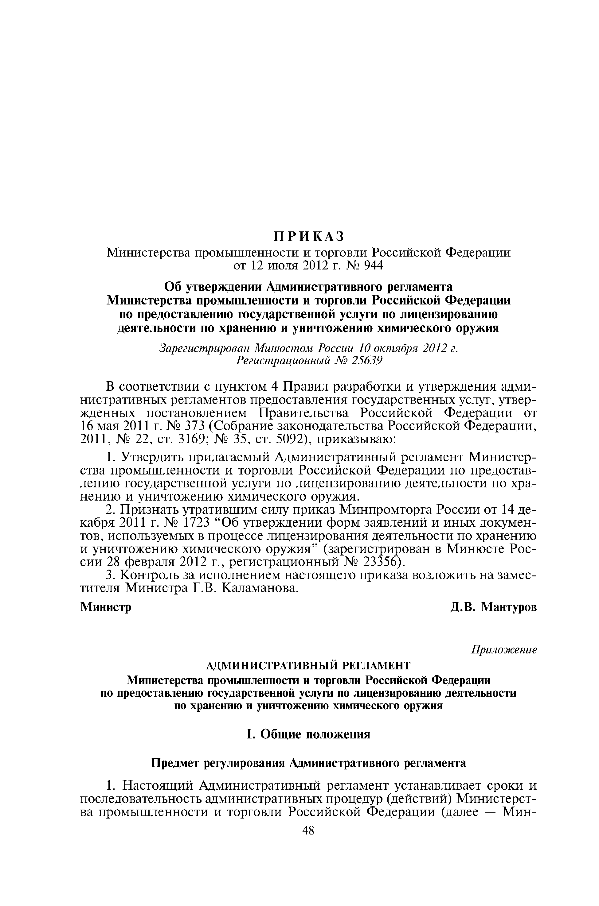 Административный регламент Министерства промышленности и торговли Российской Федерации по предоставлению государственной услуги по лицензированию деятельности по хранению и уничтожению химического оружия| Статус: | действует | | Название рус.: | Административный регламент Министерства промышленности и торговли Российской Федерации по предоставлению государственной услуги по лицензированию деятельности по хранению и уничтожению химического оружия | | Дата добавления в базу: | 01.02.2020 | | Дата актуализации: | 01.01.2021 | | Дата введения: | 12.04.2013 | | Область применения: | Административный регламент устанавливает сроки и последовательность административных процедур (действий) Министерства промышленности и торговли Российской Федерации, порядок взаимодействия между структурными подразделениями и должностными лицами Минпромторга России, а также взаимодействие Минпромторга России с юридическими лицами, индивидуальными предпринимателями, физическими лицами и органами государственной власти Российской Федерации при предоставлении государственной услуги по лицензированию деятельности по хранению и уничтожению химического оружия | | Оглавление: | I. Общие положения II. Стандарт предоставления государственной услуги III. Состав, последовательность и сроки выполнения административных процедур (действий), требования к порядку их выполнения, в том числе особенности выполнения административных процедур (действий) в форме электронного документа IV. Формы контроля за исполнением Административного регламента V. Досудебный (внесудебный) порядок обжалования решений и действий (бездействия) федерального органа исполнительной власти и органа государственного внебюджетного фонда, предоставляющих государственную услугу, а также их должностных лиц | | Утверждён: | 12.07.2012 Министерство промышленности и торговли РФ (944)