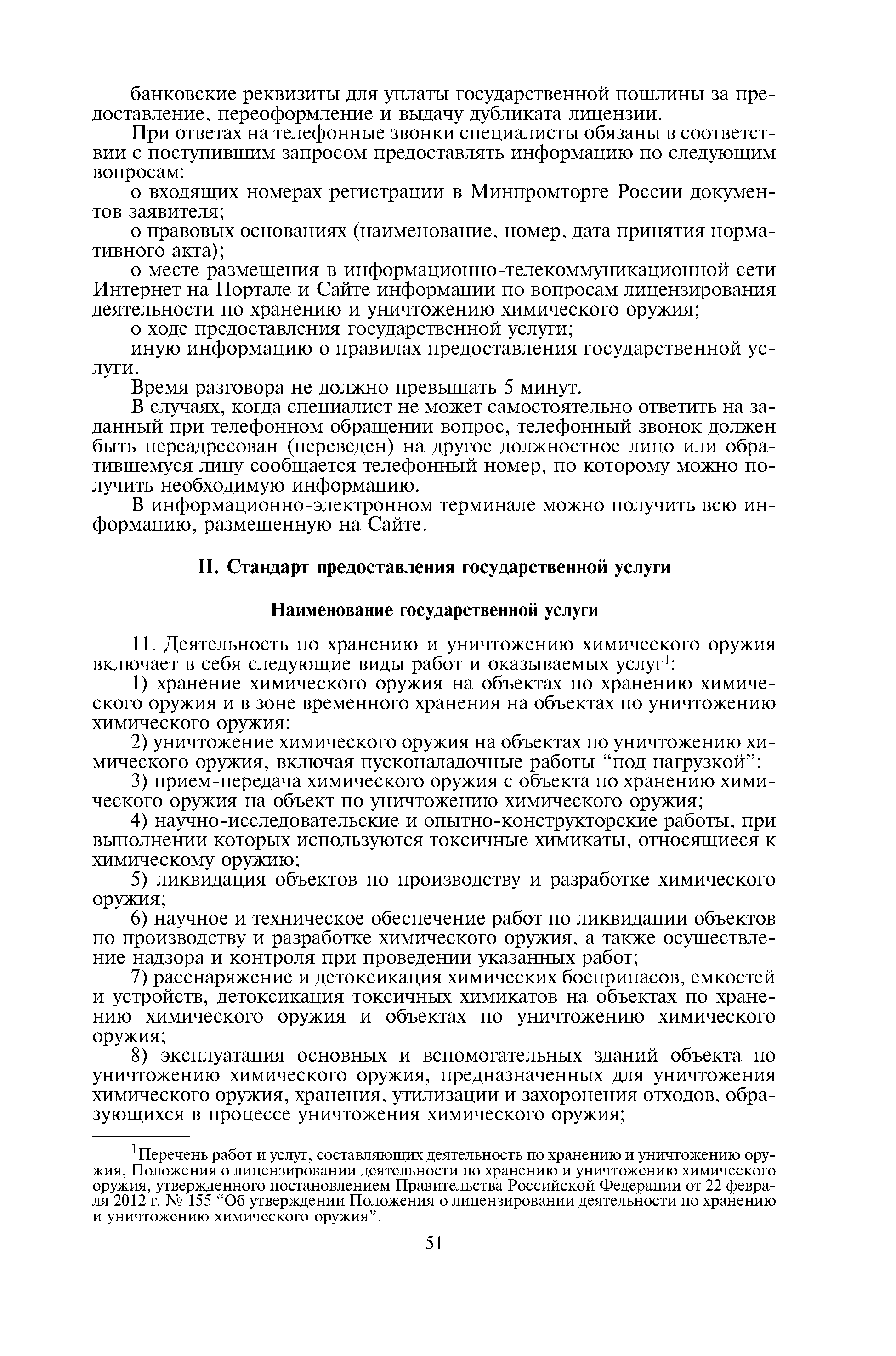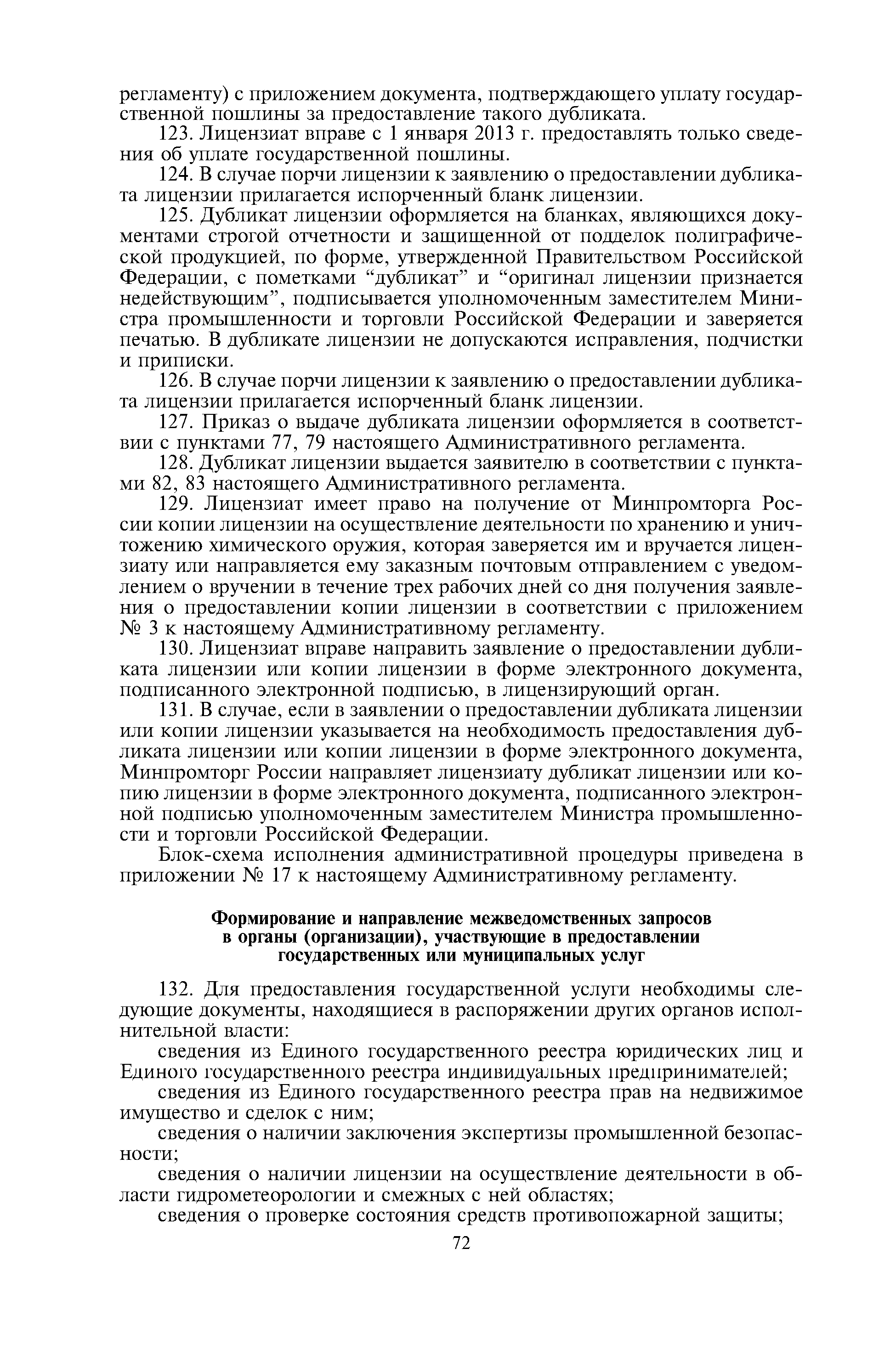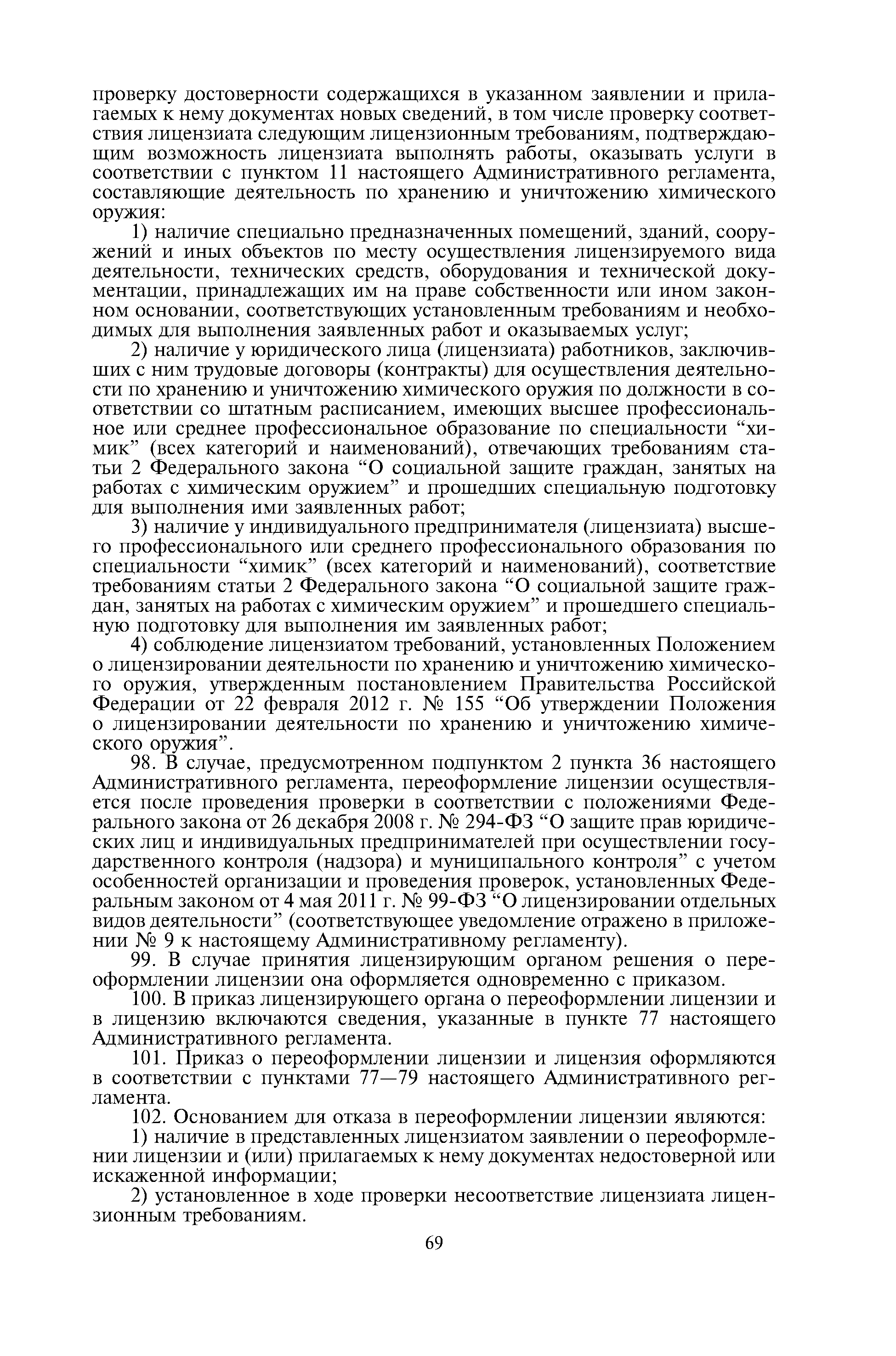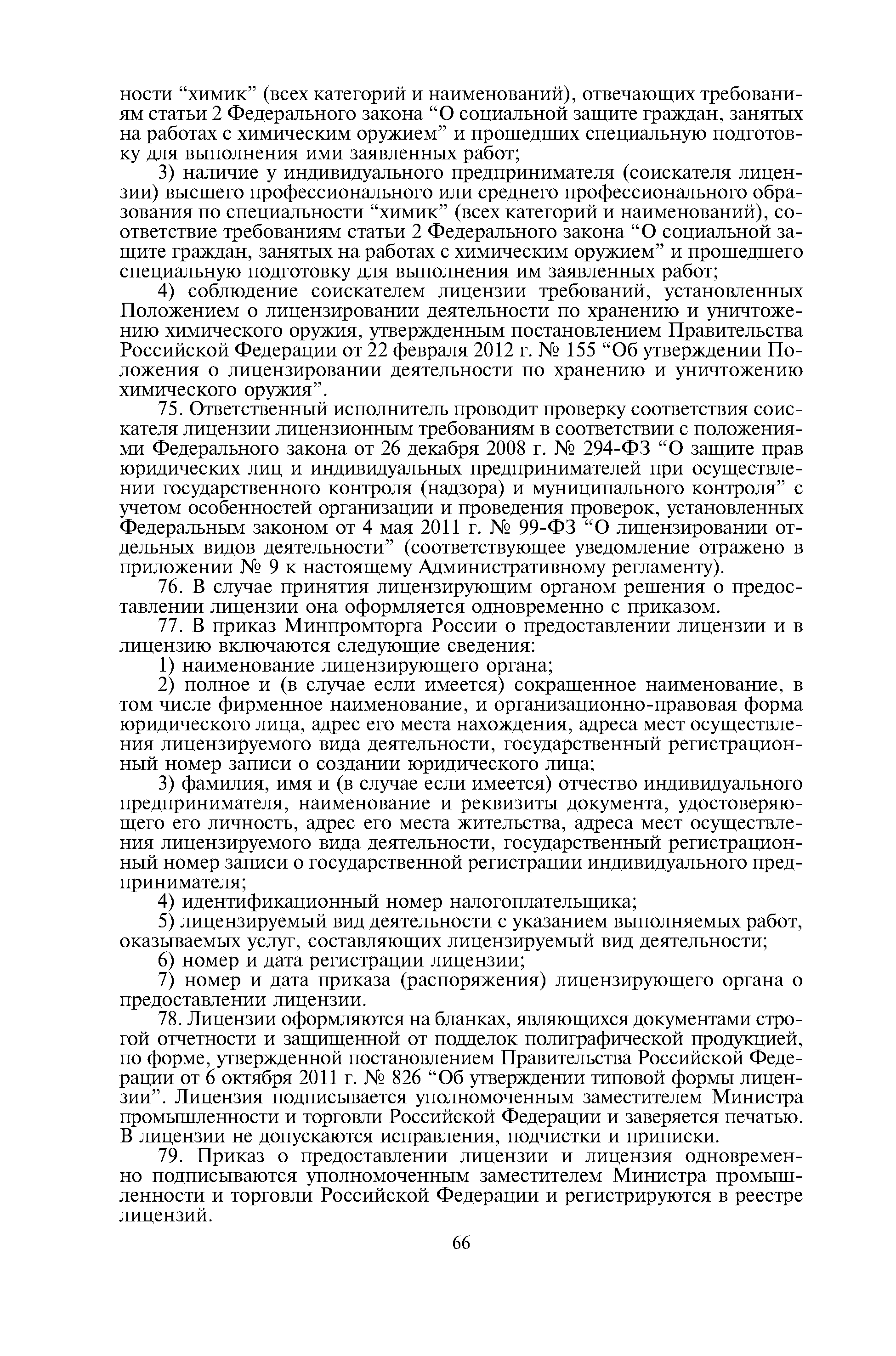 | | Нормативные ссылки: |   Федеральный закон 69-ФЗ «О пожарной безопасности»  Федеральный закон 52-ФЗ «О санитарно-эпидемиологическом благополучии населения»  Федеральный закон 181-ФЗ «О социальной защите инвалидов в Российской Федерации»  Федеральный закон 7-ФЗ «Об охране окружающей среды»  Федеральный закон 149-ФЗ «Об информации, информационных технологиях и о защите информации»  Федеральный закон 294-ФЗ «О защите прав юридических лиц и индивидуальных предпринимателей при осуществлении государственного контроля (надзора) и муниципального контроля»  Федеральный закон 99-ФЗ «О лицензировании отдельных видов деятельности» Постановление 957 «Об организации лицензирования отдельных видов деятельности» «Положение о лицензировании деятельности по хранению и уничтожению химического оружия» Постановление 373 «О разработке и утверждении административных регламентов осуществления государственного контроля (надзора) и административных регламентов предоставления государственных услуг»  Федеральный закон 210-ФЗ «Об организации предоставления государственных и муниципальных услуг»  «Правила предоставления документов по вопросам лицензирования в форме электронных документов»  «Типовая форма лицензии»  «Требования к предоставлению в электронной форме государственных и муниципальных услуг»  Постановление 438 «О Министерстве промышленности и торговли Российской Федерации» «Правила подачи и рассмотрения жалоб на решения и действия (бездействие) федеральных органов исполнительной власти и их должностных лиц, федеральных государственных служащих, должностных лиц государственных внебюджетных фондов Российской Федерации, государственных корпораций, наделенных в соответствии с федеральными законами полномочиями по предоставлению государственных услуг в установленной сфере деятельности, и их должностных лиц, организаций, предусмотренных частью 1.1 статьи 16 Федерального закона "Об организации предоставления государственных и муниципальных услуг", и их работников, а также многофункциональных центров предоставления государственных и муниципальных услуг и их работников»