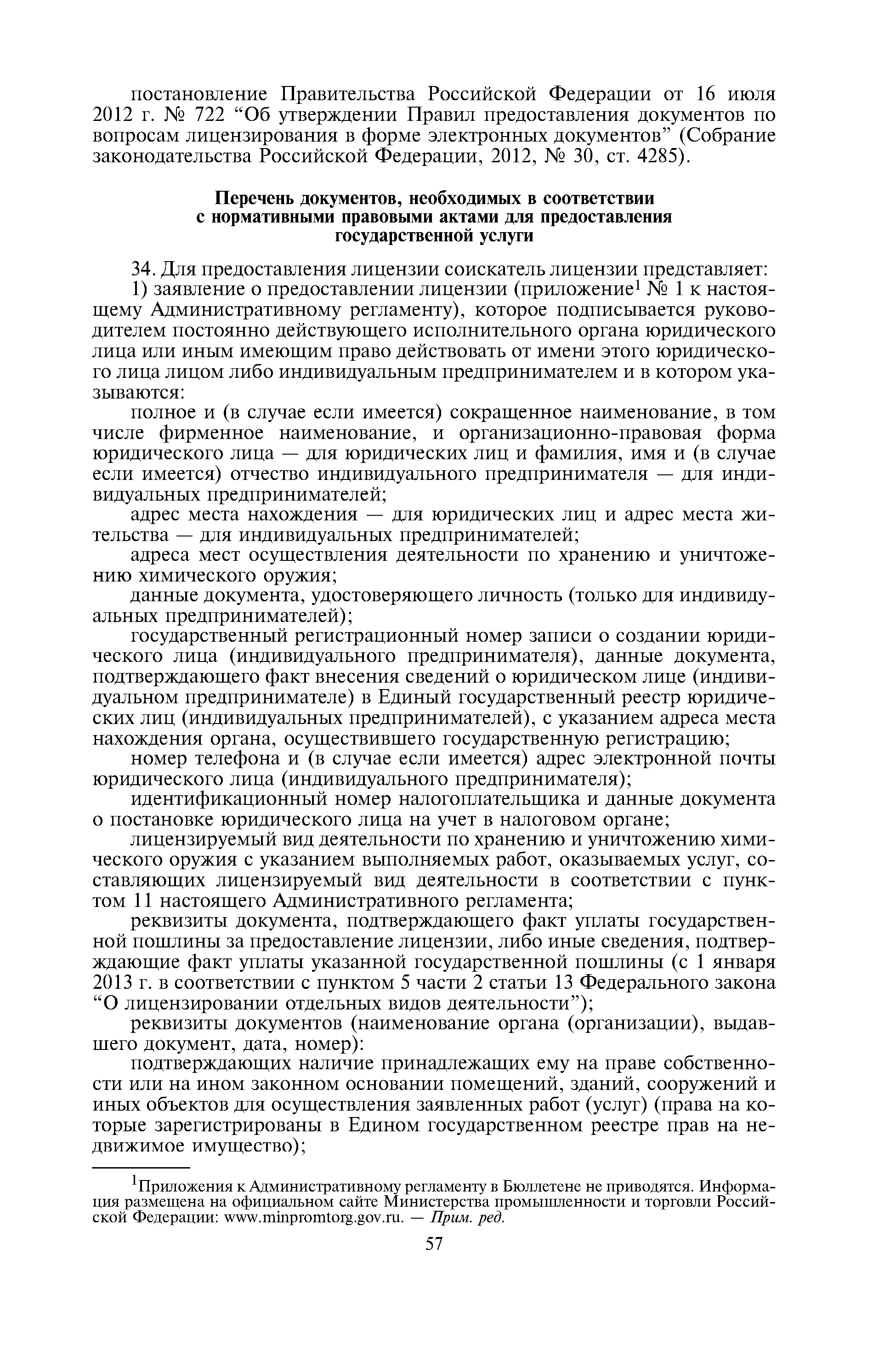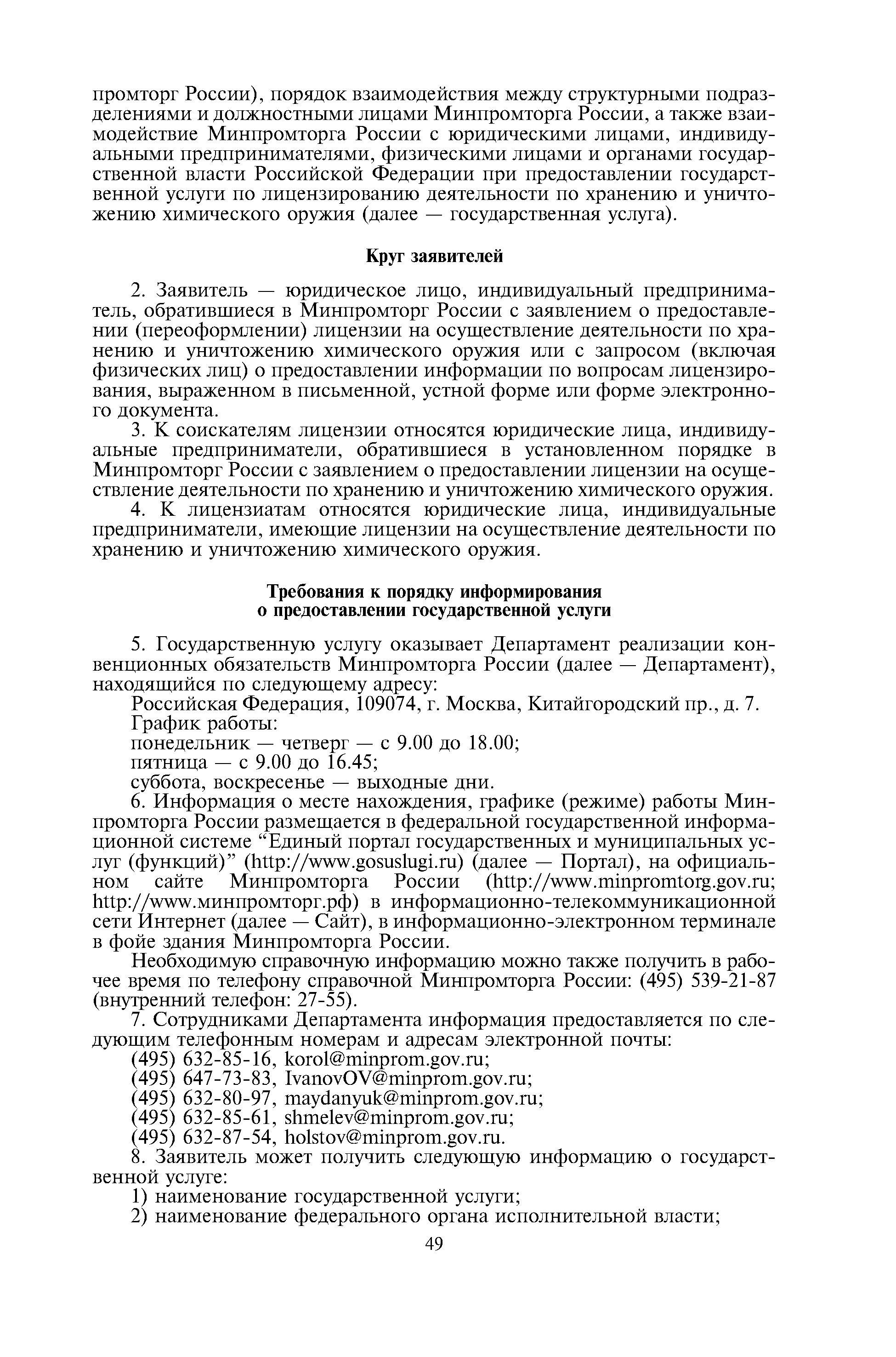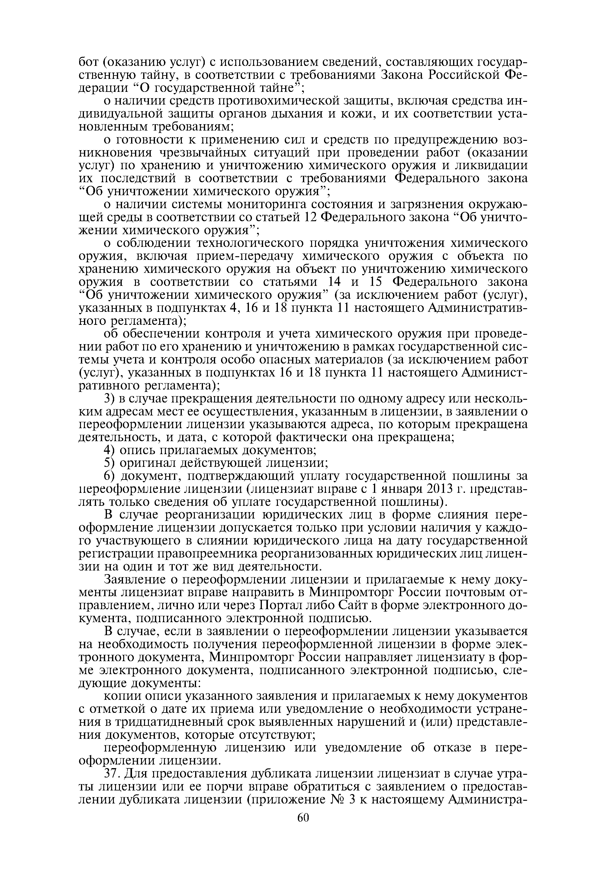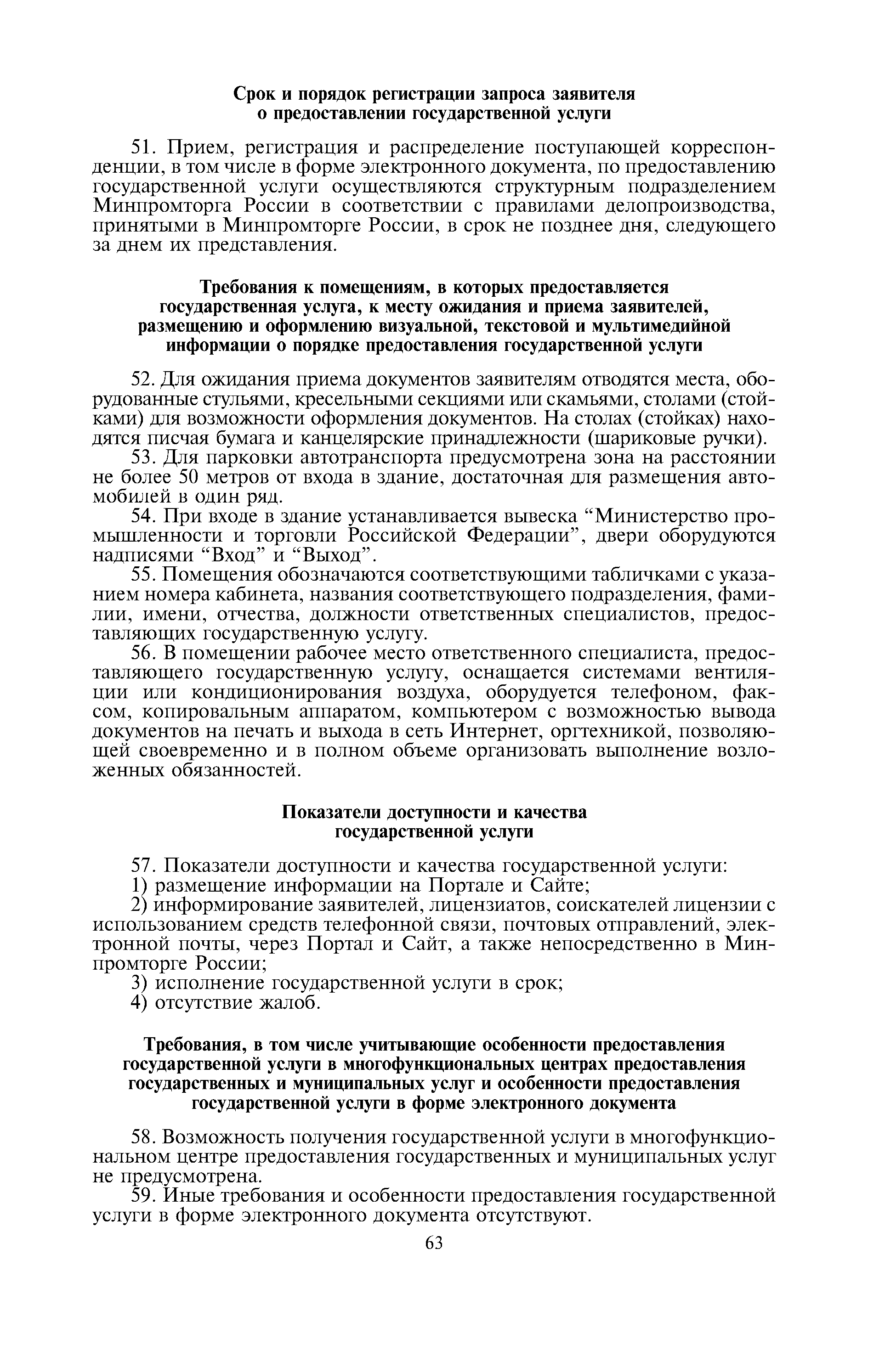 | | Нормативные ссылки: |   Федеральный закон 69-ФЗ «О пожарной безопасности»  Федеральный закон 52-ФЗ «О санитарно-эпидемиологическом благополучии населения»  Федеральный закон 181-ФЗ «О социальной защите инвалидов в Российской Федерации»  Федеральный закон 7-ФЗ «Об охране окружающей среды»  Федеральный закон 149-ФЗ «Об информации, информационных технологиях и о защите информации»  Федеральный закон 294-ФЗ «О защите прав юридических лиц и индивидуальных предпринимателей при осуществлении государственного контроля (надзора) и муниципального контроля»  Федеральный закон 99-ФЗ «О лицензировании отдельных видов деятельности» Постановление 957 «Об организации лицензирования отдельных видов деятельности» «Положение о лицензировании деятельности по хранению и уничтожению химического оружия» Постановление 373 «О разработке и утверждении административных регламентов осуществления государственного контроля (надзора) и административных регламентов предоставления государственных услуг»  Федеральный закон 210-ФЗ «Об организации предоставления государственных и муниципальных услуг»  «Правила предоставления документов по вопросам лицензирования в форме электронных документов»  «Типовая форма лицензии»  «Требования к предоставлению в электронной форме государственных и муниципальных услуг»  Постановление 438 «О Министерстве промышленности и торговли Российской Федерации» «Правила подачи и рассмотрения жалоб на решения и действия (бездействие) федеральных органов исполнительной власти и их должностных лиц, федеральных государственных служащих, должностных лиц государственных внебюджетных фондов Российской Федерации, государственных корпораций, наделенных в соответствии с федеральными законами полномочиями по предоставлению государственных услуг в установленной сфере деятельности, и их должностных лиц, организаций, предусмотренных частью 1.1 статьи 16 Федерального закона "Об организации предоставления государственных и муниципальных услуг", и их работников, а также многофункциональных центров предоставления государственных и муниципальных услуг и их работников»