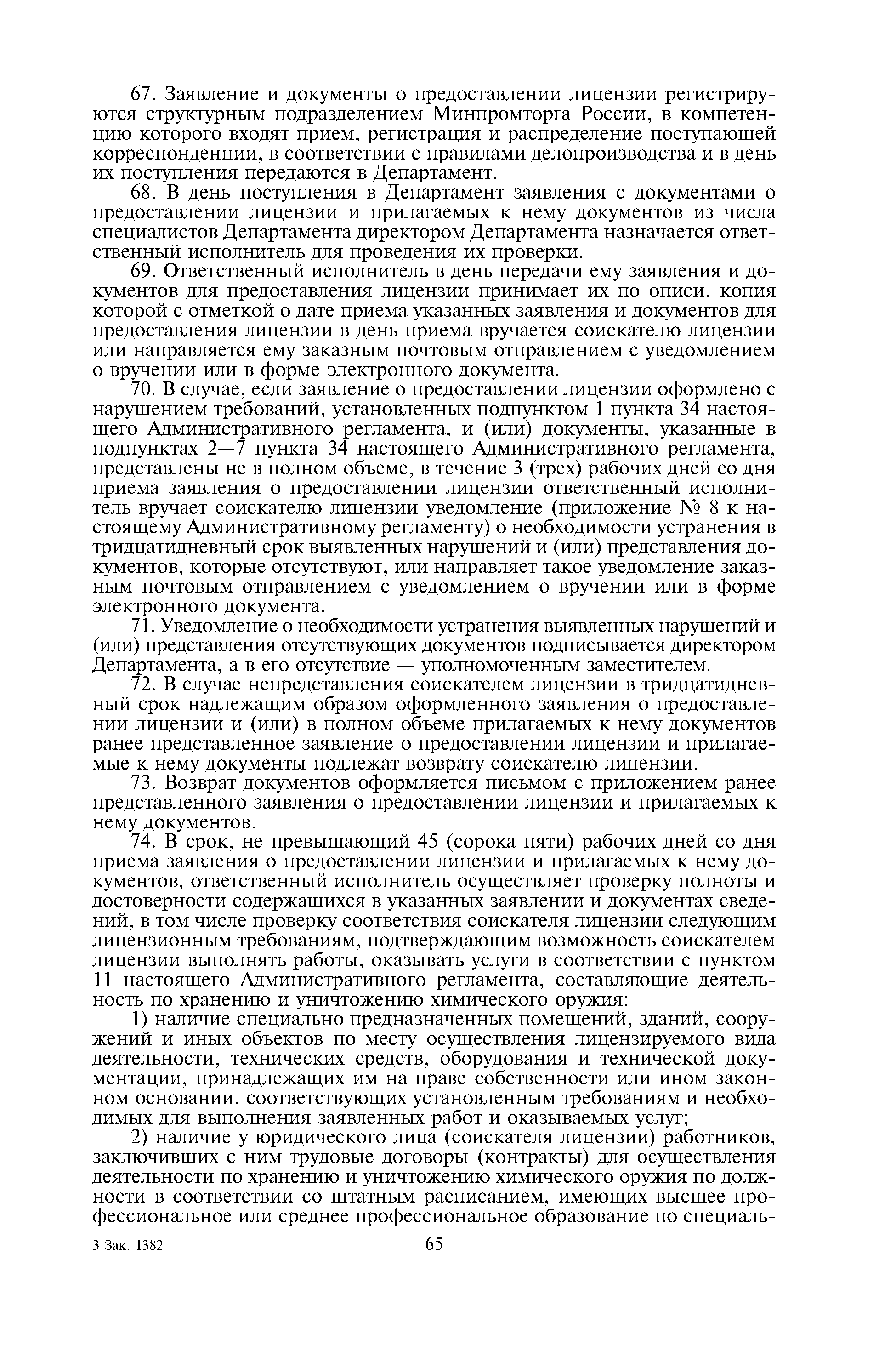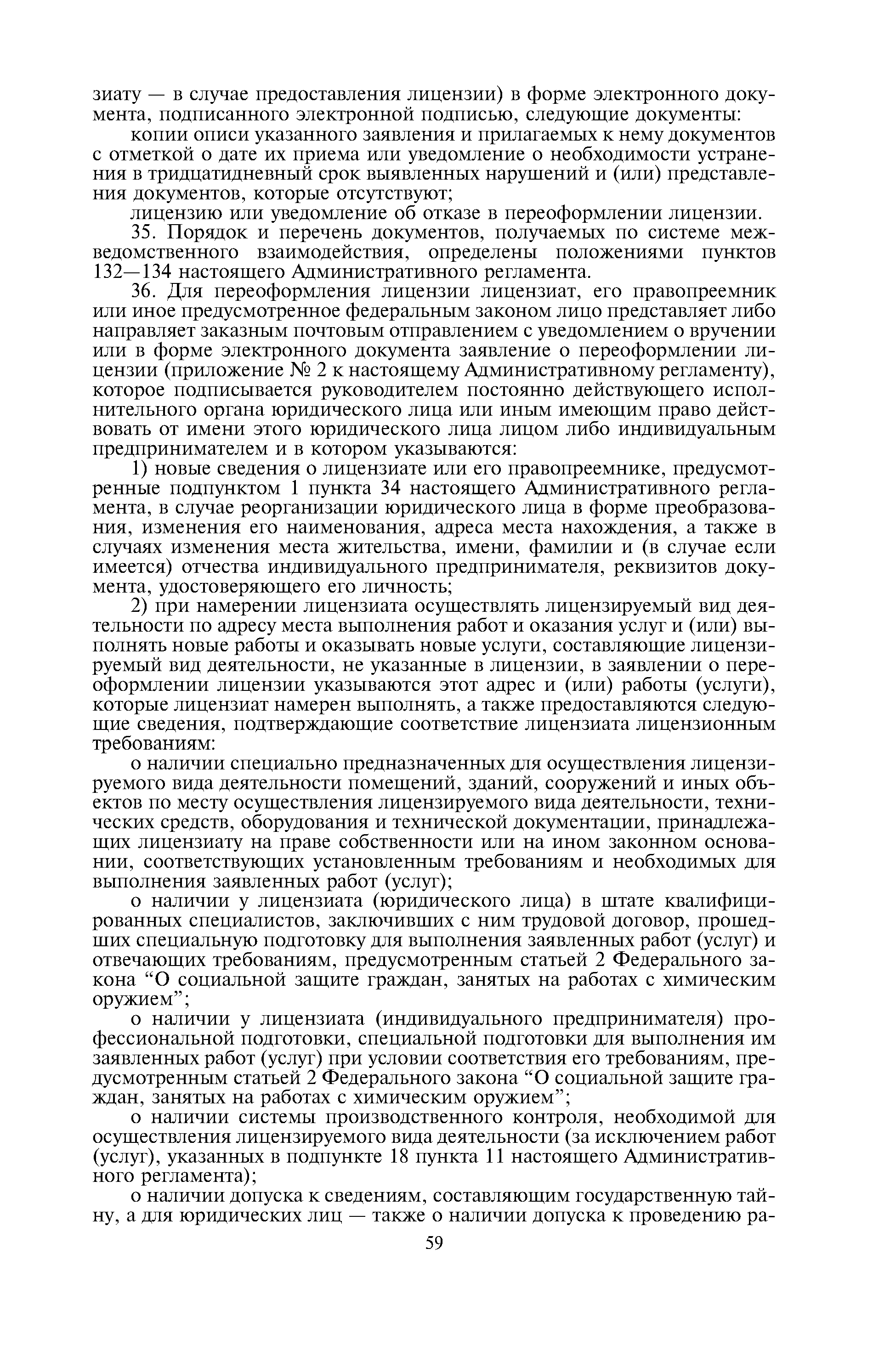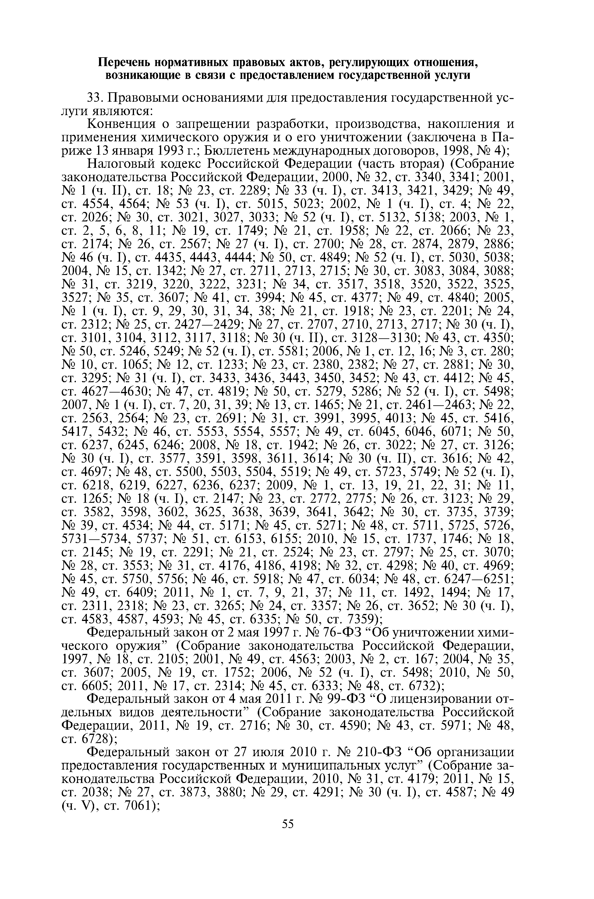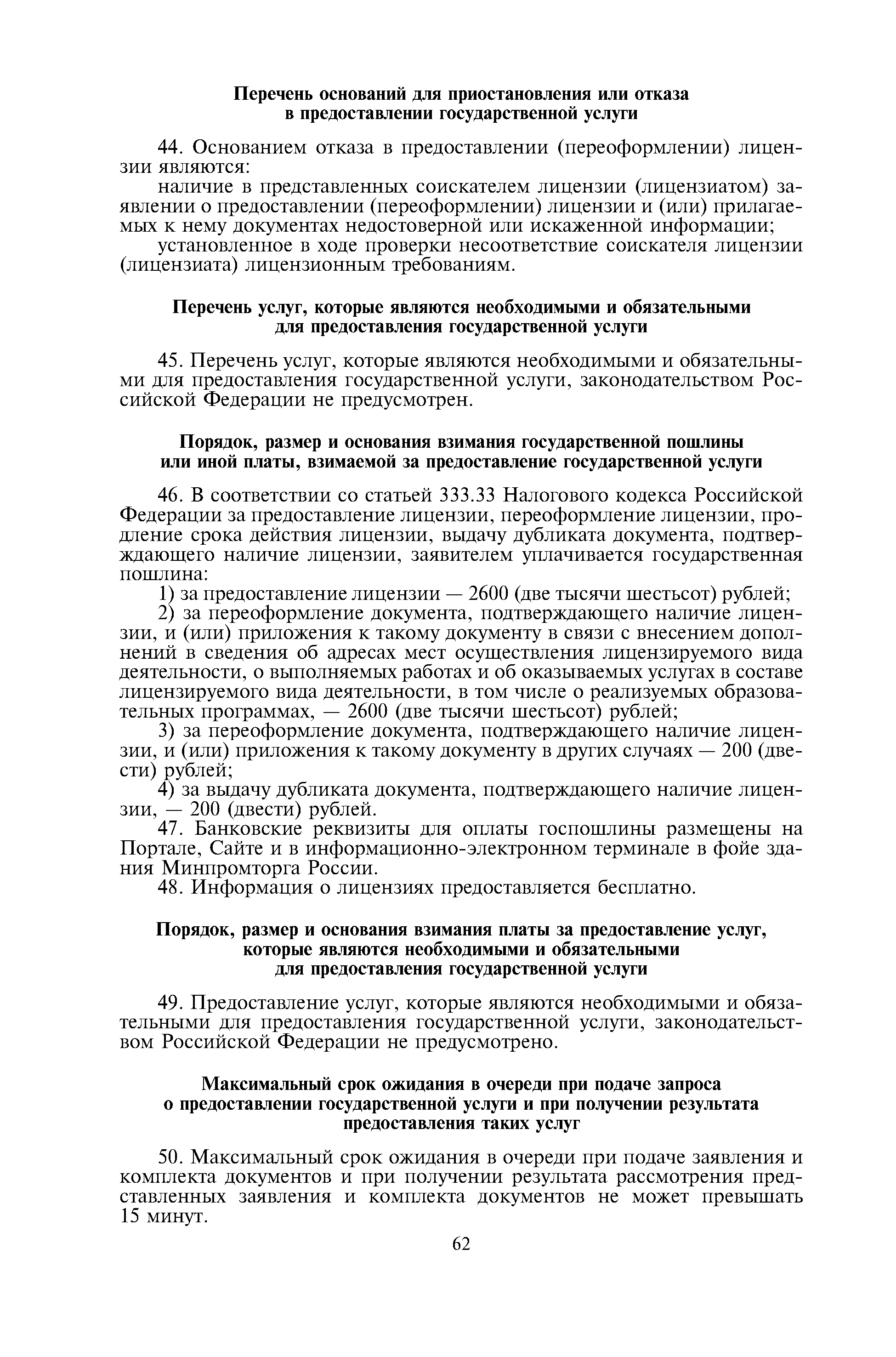 | | Нормативные ссылки: |   Федеральный закон 69-ФЗ «О пожарной безопасности»  Федеральный закон 52-ФЗ «О санитарно-эпидемиологическом благополучии населения»  Федеральный закон 181-ФЗ «О социальной защите инвалидов в Российской Федерации»  Федеральный закон 7-ФЗ «Об охране окружающей среды»  Федеральный закон 149-ФЗ «Об информации, информационных технологиях и о защите информации»  Федеральный закон 294-ФЗ «О защите прав юридических лиц и индивидуальных предпринимателей при осуществлении государственного контроля (надзора) и муниципального контроля»  Федеральный закон 99-ФЗ «О лицензировании отдельных видов деятельности» Постановление 957 «Об организации лицензирования отдельных видов деятельности» «Положение о лицензировании деятельности по хранению и уничтожению химического оружия» Постановление 373 «О разработке и утверждении административных регламентов осуществления государственного контроля (надзора) и административных регламентов предоставления государственных услуг»  Федеральный закон 210-ФЗ «Об организации предоставления государственных и муниципальных услуг»  «Правила предоставления документов по вопросам лицензирования в форме электронных документов»  «Типовая форма лицензии»  «Требования к предоставлению в электронной форме государственных и муниципальных услуг»  Постановление 438 «О Министерстве промышленности и торговли Российской Федерации» «Правила подачи и рассмотрения жалоб на решения и действия (бездействие) федеральных органов исполнительной власти и их должностных лиц, федеральных государственных служащих, должностных лиц государственных внебюджетных фондов Российской Федерации, государственных корпораций, наделенных в соответствии с федеральными законами полномочиями по предоставлению государственных услуг в установленной сфере деятельности, и их должностных лиц, организаций, предусмотренных частью 1.1 статьи 16 Федерального закона "Об организации предоставления государственных и муниципальных услуг", и их работников, а также многофункциональных центров предоставления государственных и муниципальных услуг и их работников»