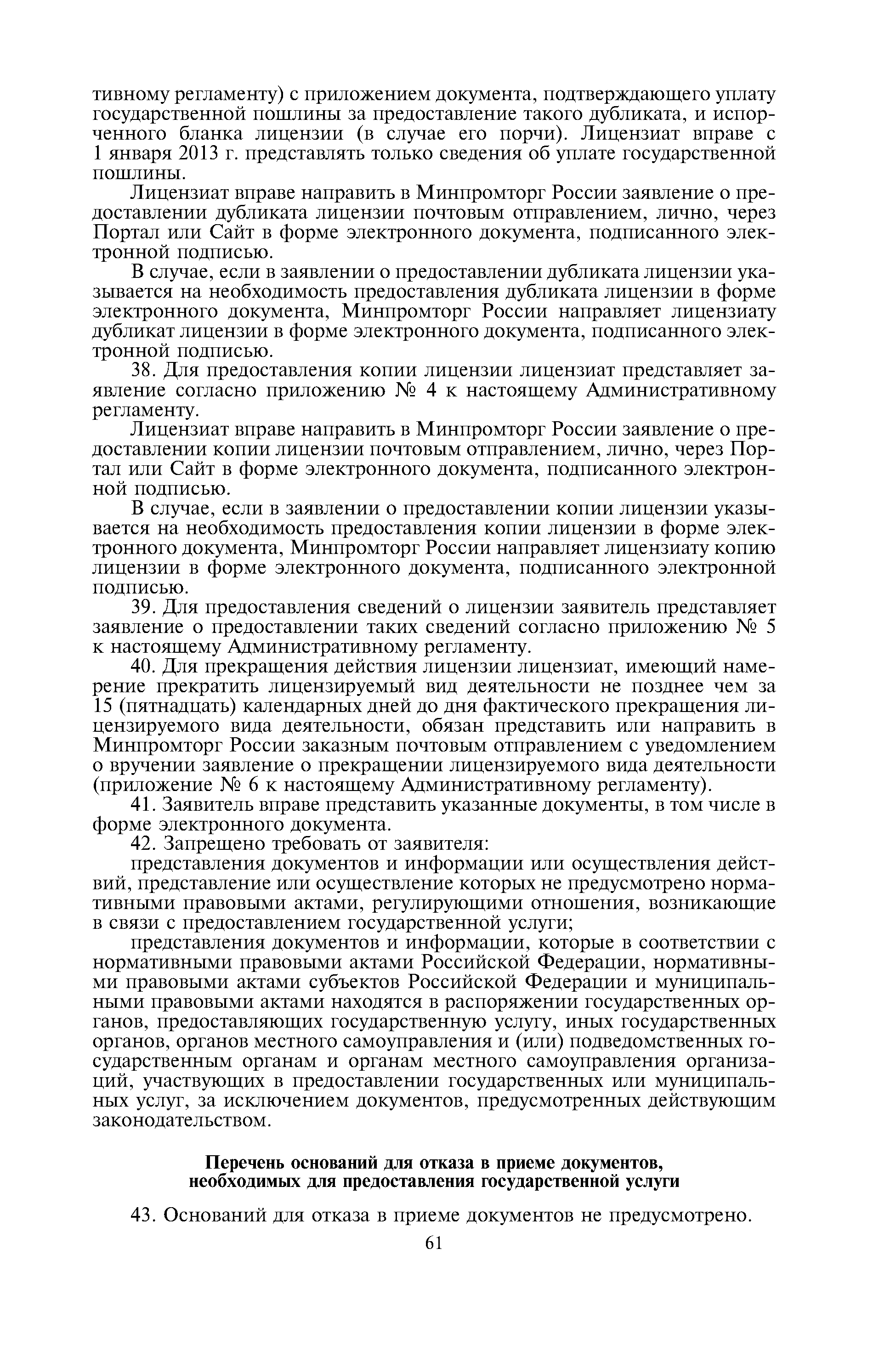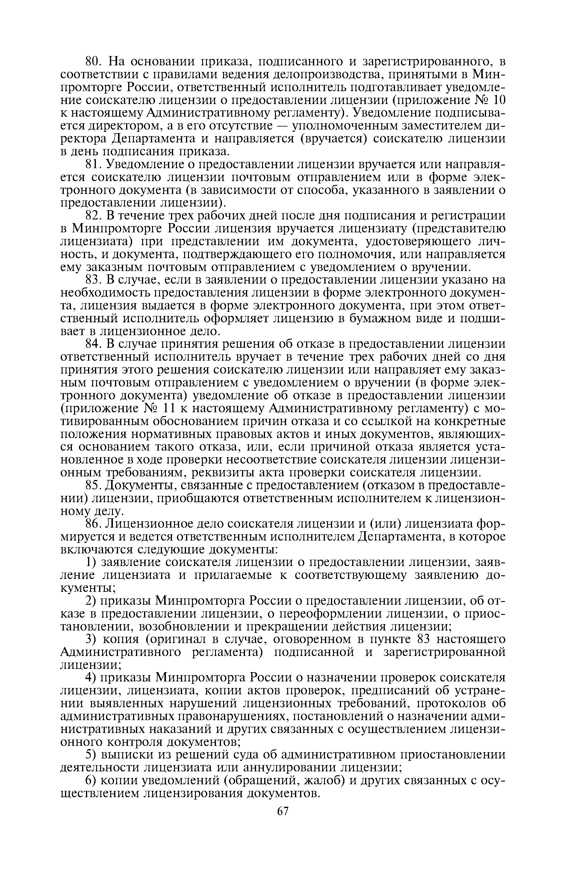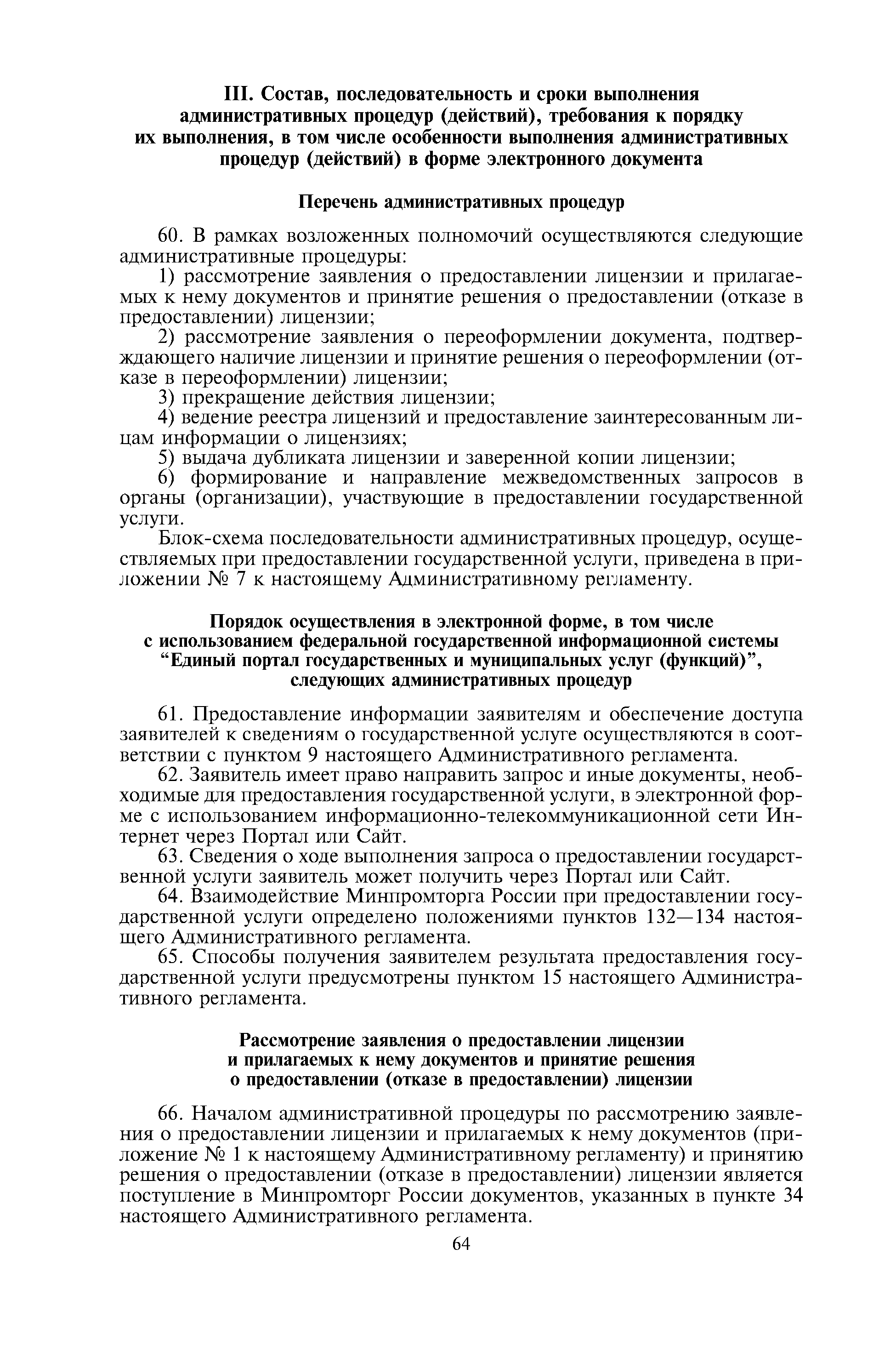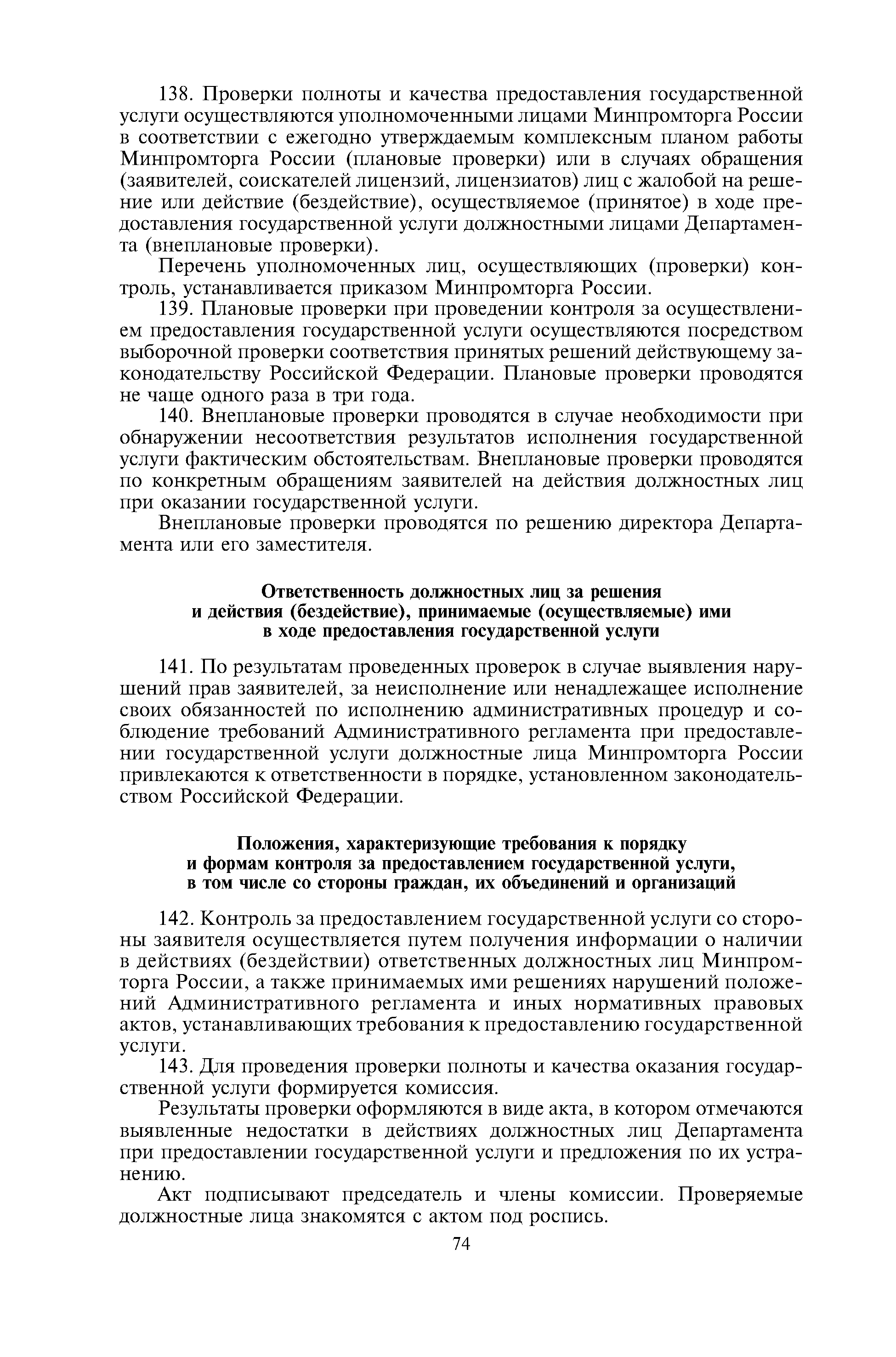| | Нормативные ссылки: |   Федеральный закон 69-ФЗ «О пожарной безопасности»  Федеральный закон 52-ФЗ «О санитарно-эпидемиологическом благополучии населения»  Федеральный закон 181-ФЗ «О социальной защите инвалидов в Российской Федерации»  Федеральный закон 7-ФЗ «Об охране окружающей среды»  Федеральный закон 149-ФЗ «Об информации, информационных технологиях и о защите информации»  Федеральный закон 294-ФЗ «О защите прав юридических лиц и индивидуальных предпринимателей при осуществлении государственного контроля (надзора) и муниципального контроля»  Федеральный закон 99-ФЗ «О лицензировании отдельных видов деятельности» Постановление 957 «Об организации лицензирования отдельных видов деятельности» «Положение о лицензировании деятельности по хранению и уничтожению химического оружия» Постановление 373 «О разработке и утверждении административных регламентов осуществления государственного контроля (надзора) и административных регламентов предоставления государственных услуг»  Федеральный закон 210-ФЗ «Об организации предоставления государственных и муниципальных услуг»  «Правила предоставления документов по вопросам лицензирования в форме электронных документов»  «Типовая форма лицензии»  «Требования к предоставлению в электронной форме государственных и муниципальных услуг»  Постановление 438 «О Министерстве промышленности и торговли Российской Федерации» «Правила подачи и рассмотрения жалоб на решения и действия (бездействие) федеральных органов исполнительной власти и их должностных лиц, федеральных государственных служащих, должностных лиц государственных внебюджетных фондов Российской Федерации, государственных корпораций, наделенных в соответствии с федеральными законами полномочиями по предоставлению государственных услуг в установленной сфере деятельности, и их должностных лиц, организаций, предусмотренных частью 1.1 статьи 16 Федерального закона "Об организации предоставления государственных и муниципальных услуг", и их работников, а также многофункциональных центров предоставления государственных и муниципальных услуг и их работников»