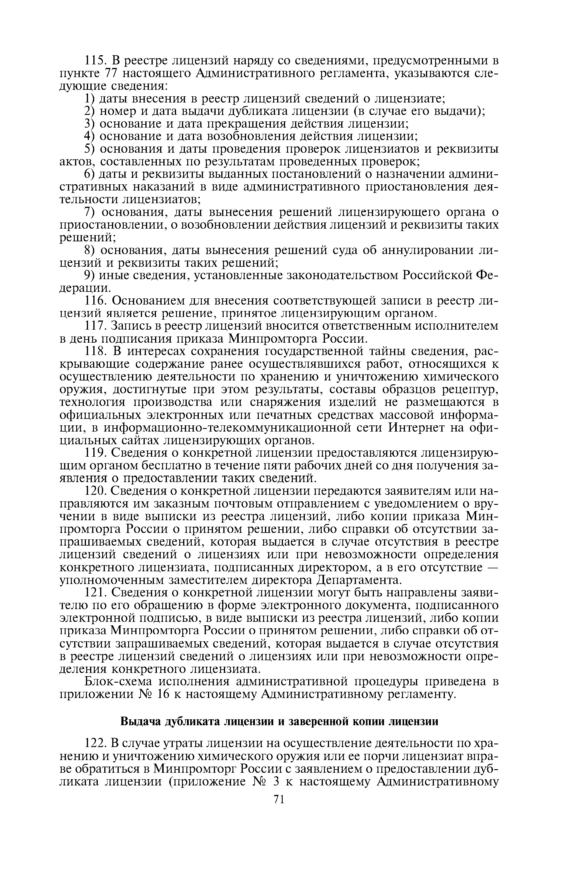 Скачать Административный регламент Министерства промышленности и торговли Российской Федерации по предоставлению государственной услуги по лицензированию деятельности по хранению и уничтожению химического оружияДата актуализации: 01.01.2021