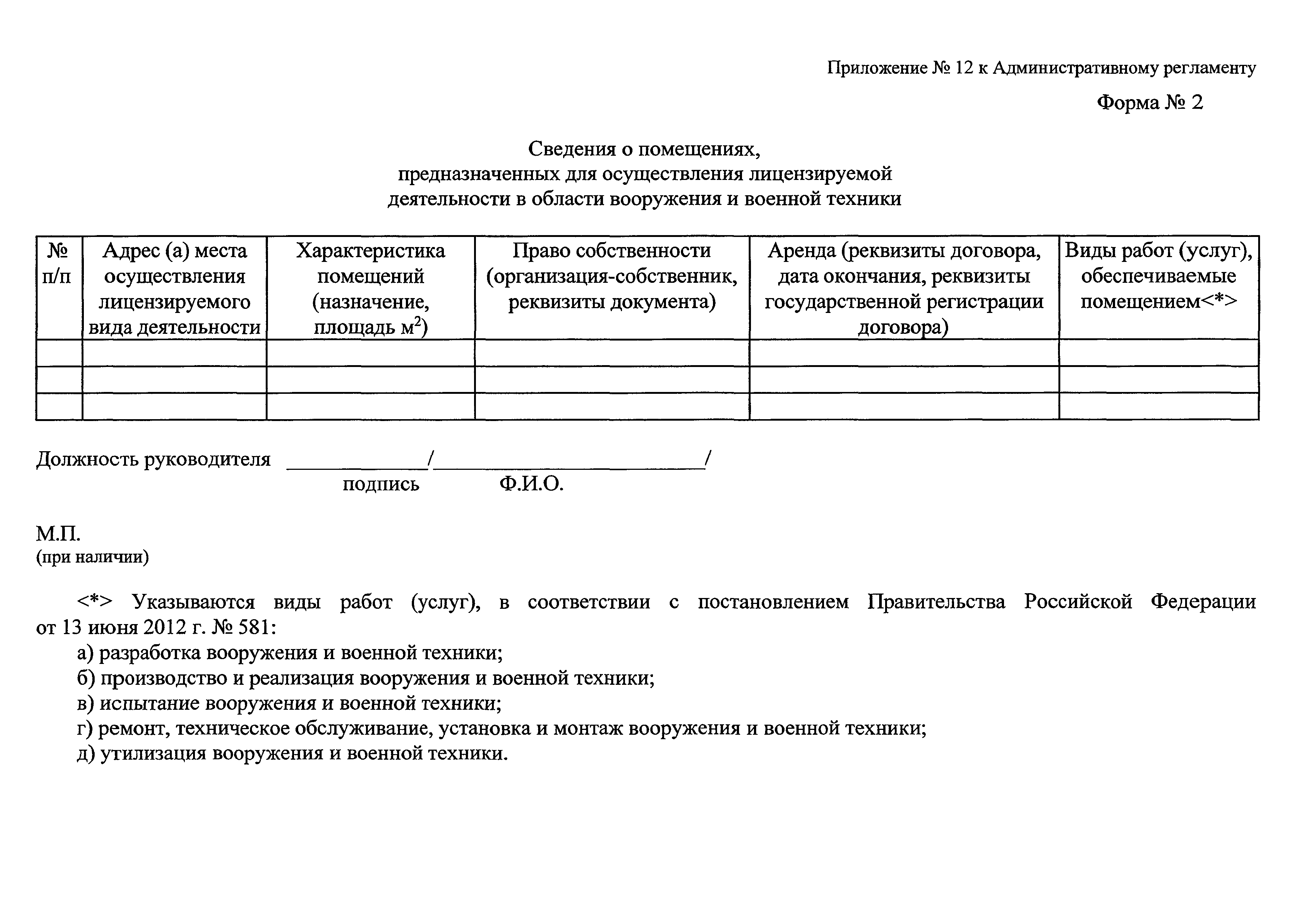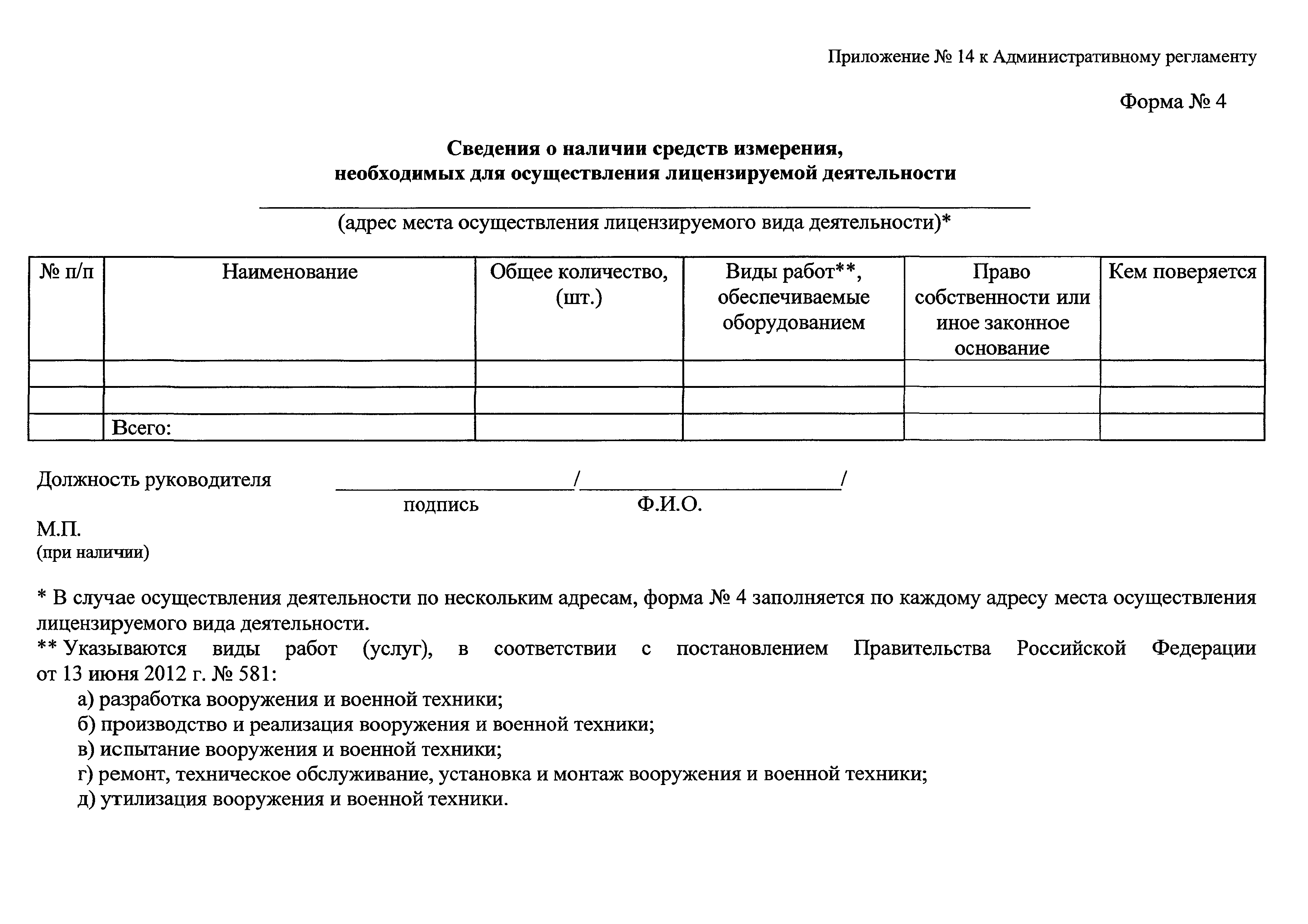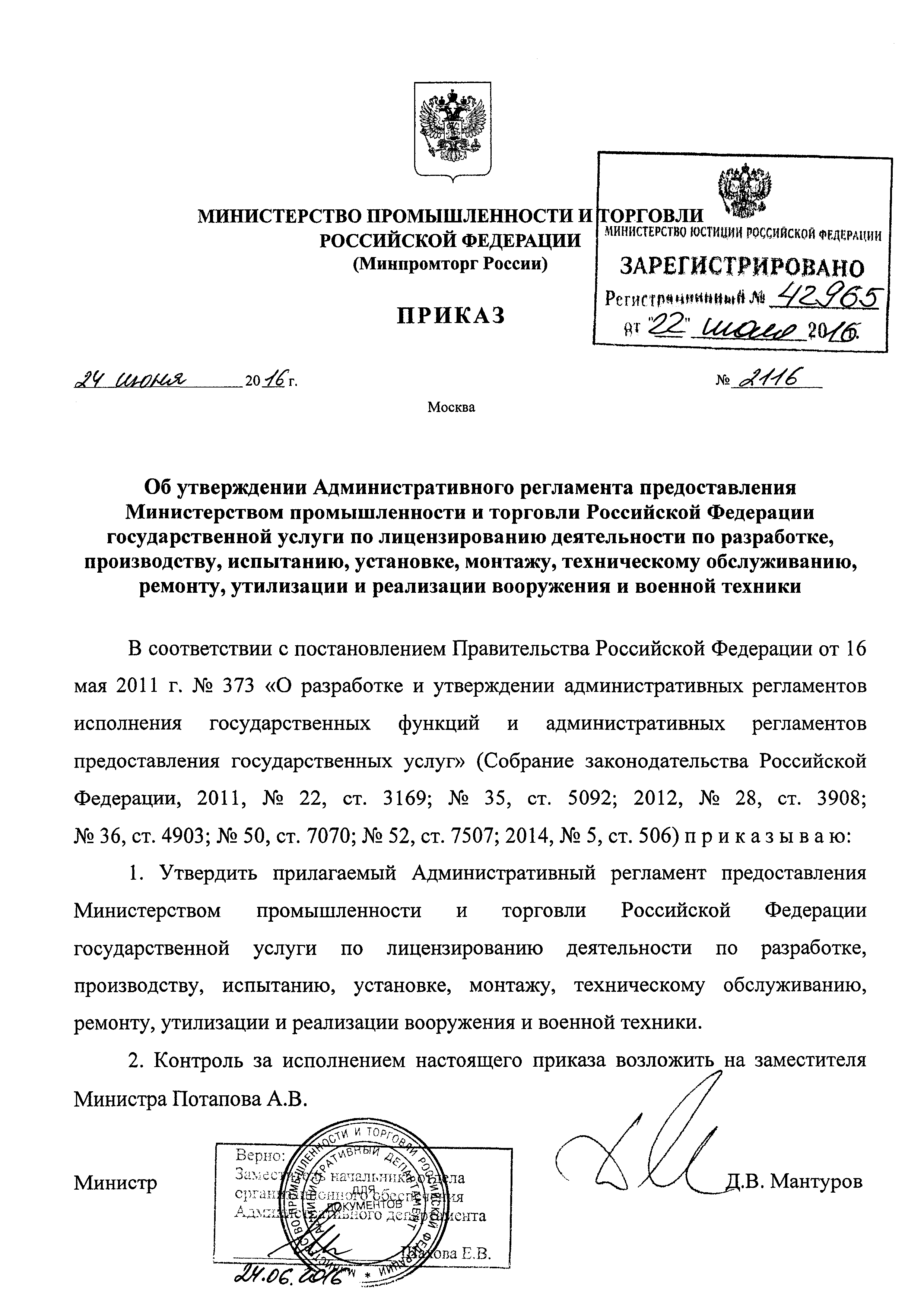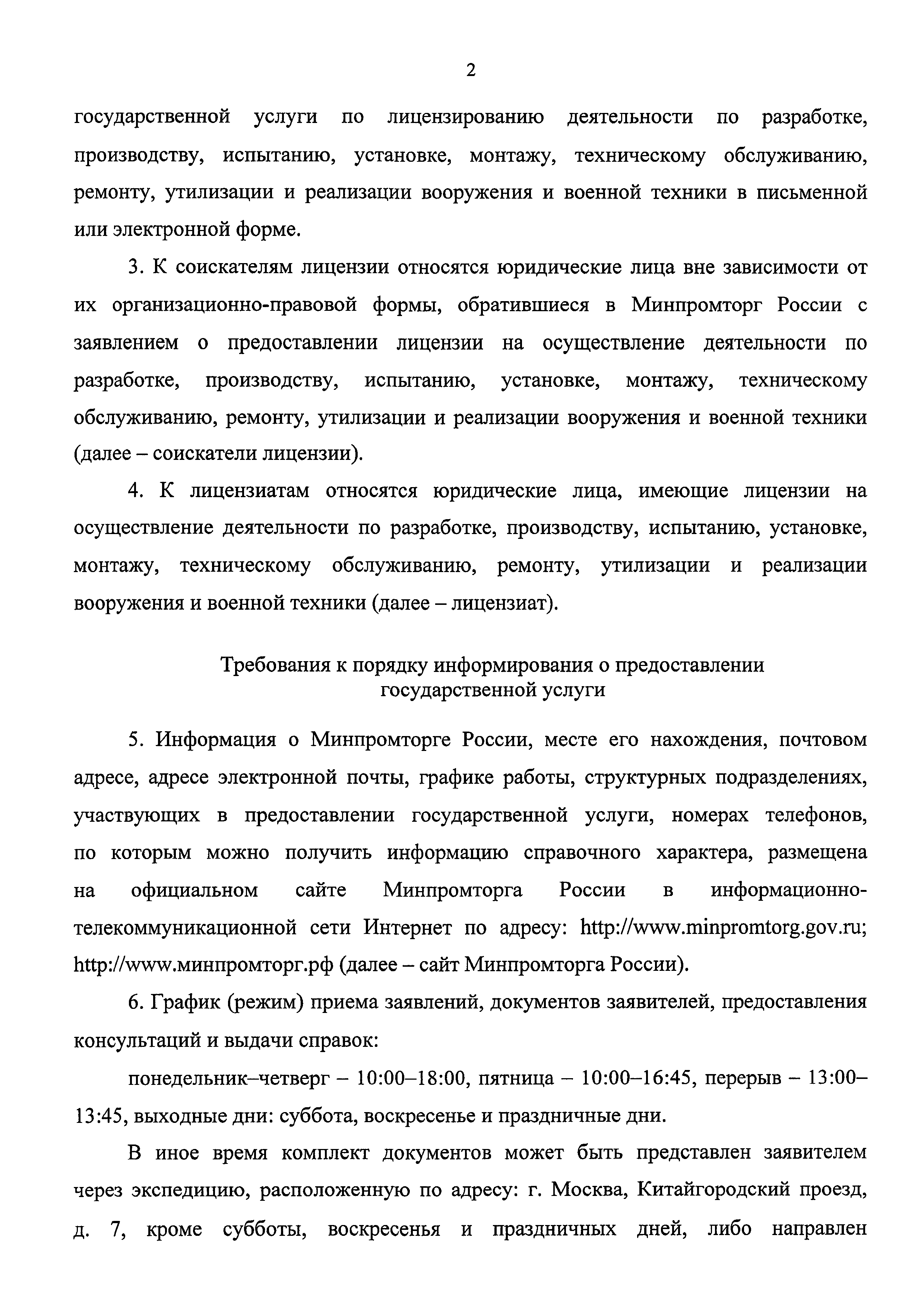 | Название рус.: | Административный регламент предоставления Министерством промышленности и торговли Российской Федерации государственной услуги по лицензированию деятельности по разработке, производству, испытанию, установке, монтажу, техническому обслуживанию, ремонту, утилизации и реализации вооружения и военной техники |