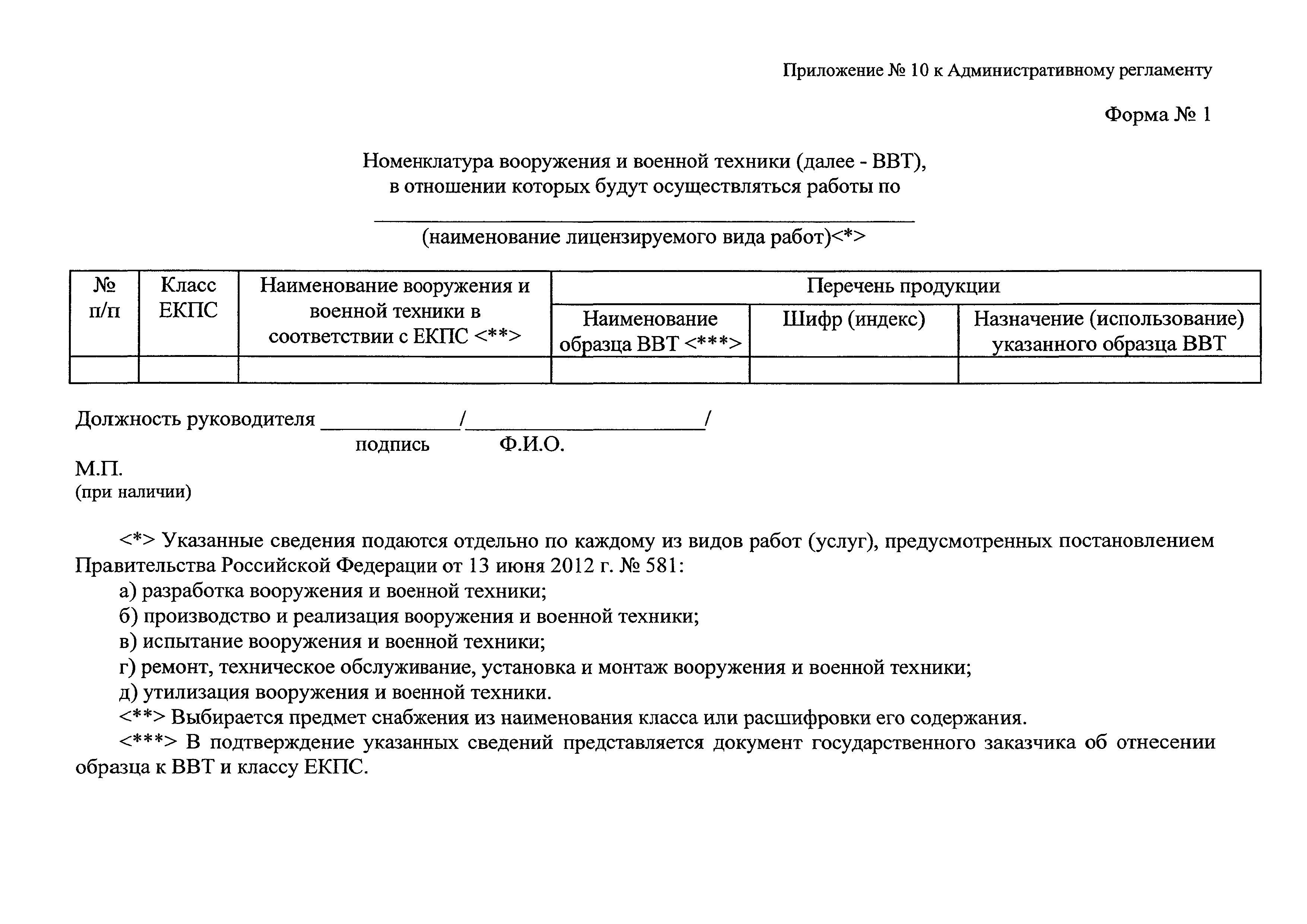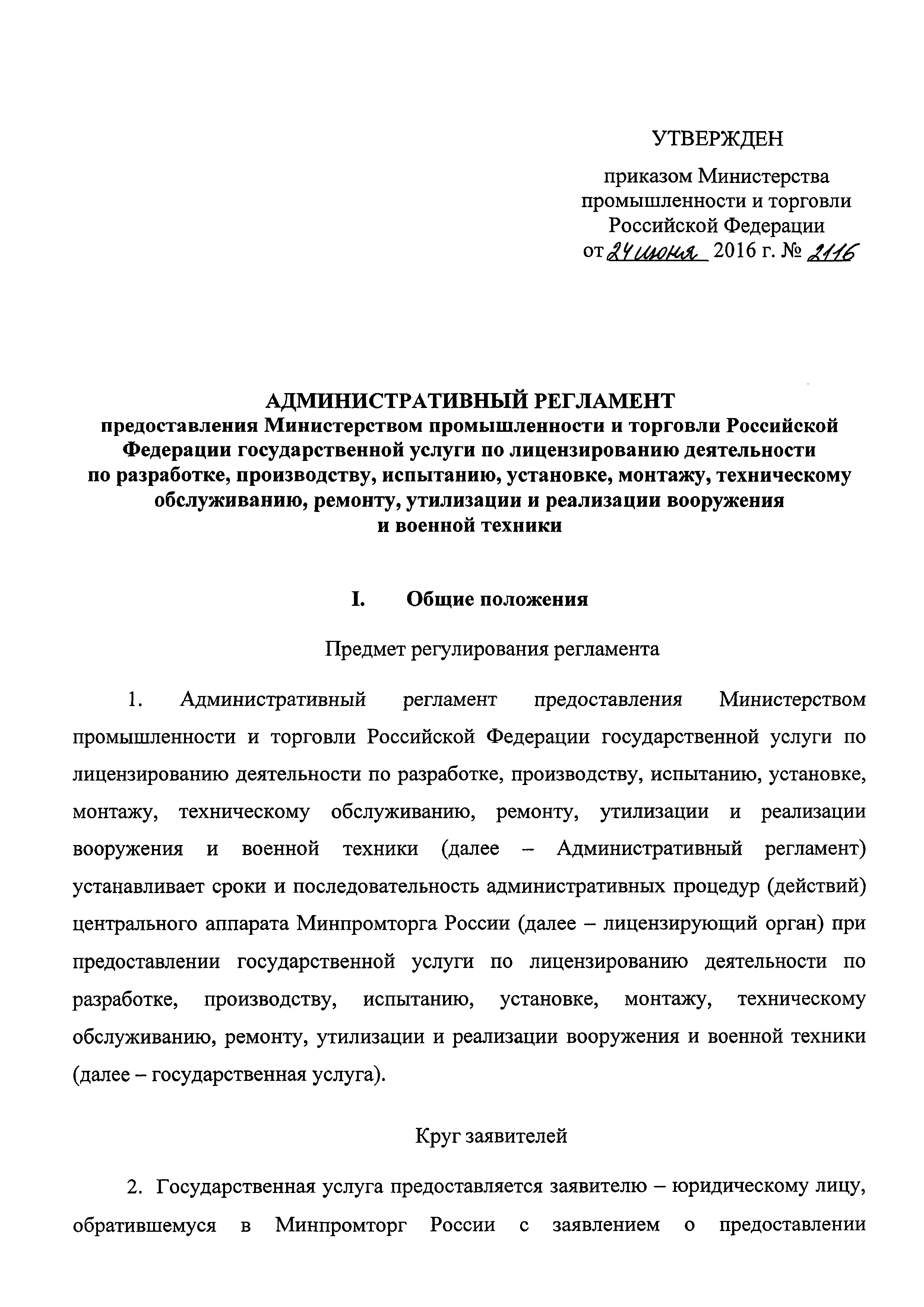 | Область применения: | Административный регламент устанавливает сроки и последовательность административных процедур (действий) центрального аппарата Минпромторга России при предоставлении государственной услуги по лицензированию деятельности по разработке, производству, испытанию, установке, монтажу, техническому обслуживанию, ремонту, утилизации и реализации вооружения и военной техники |