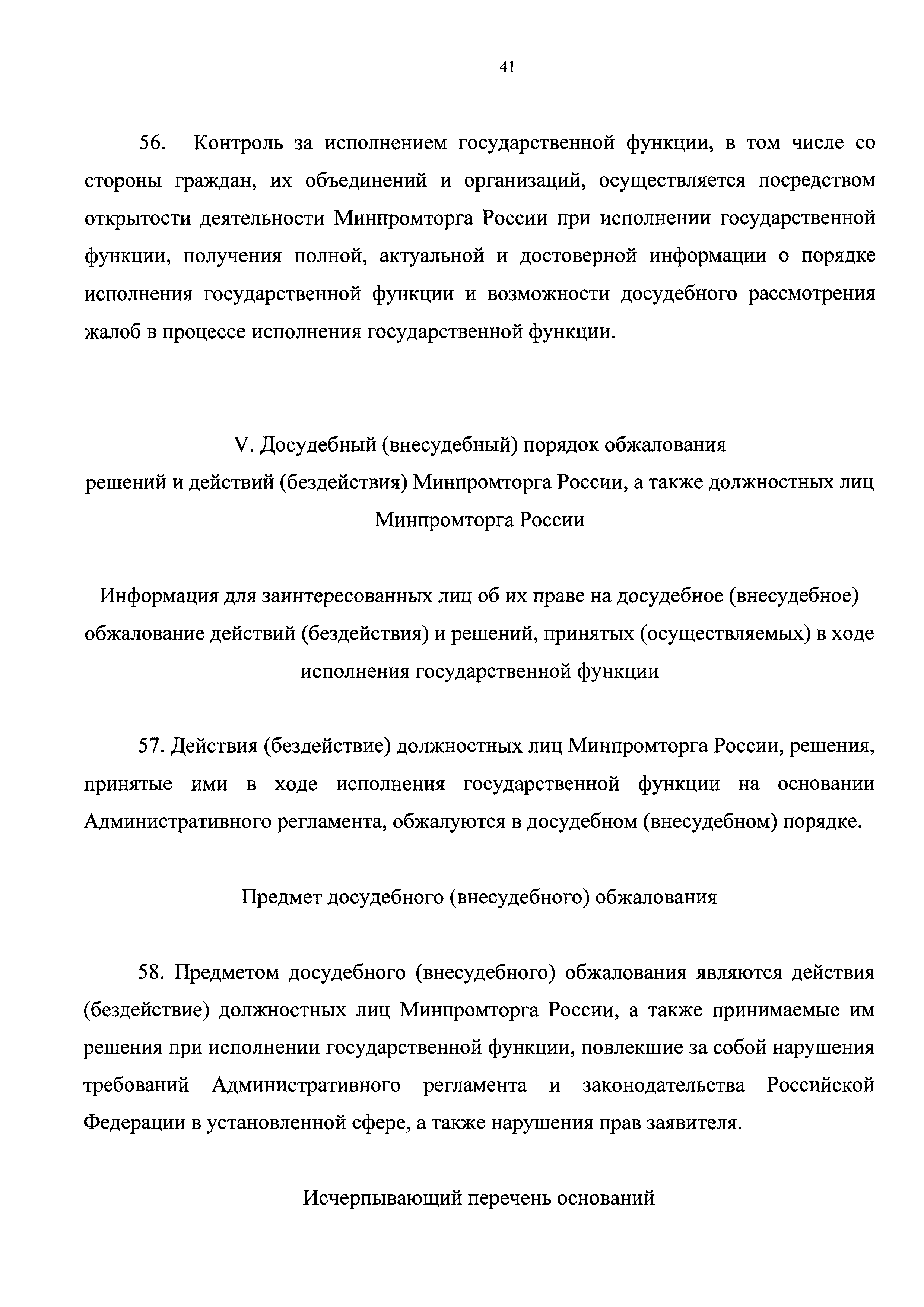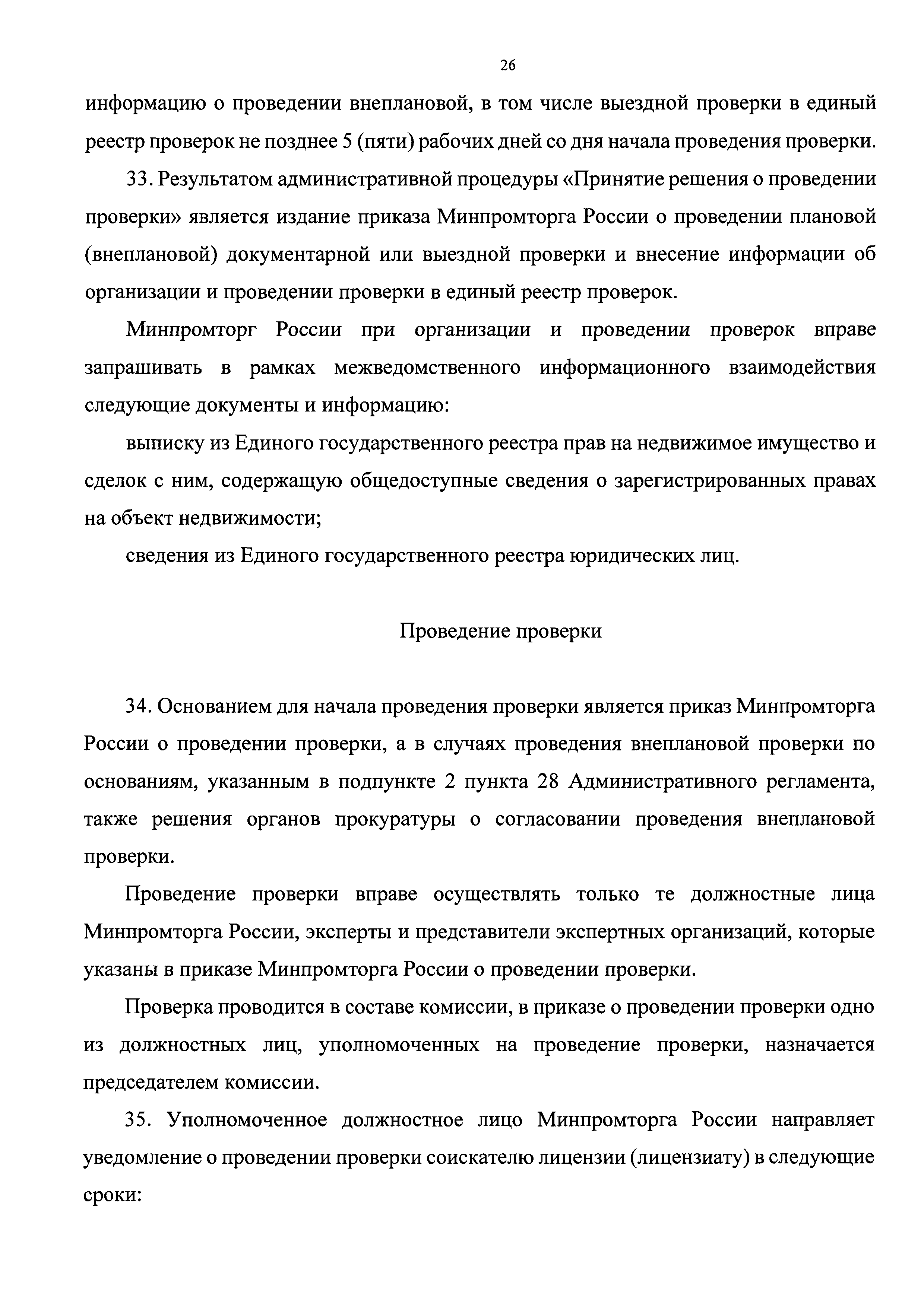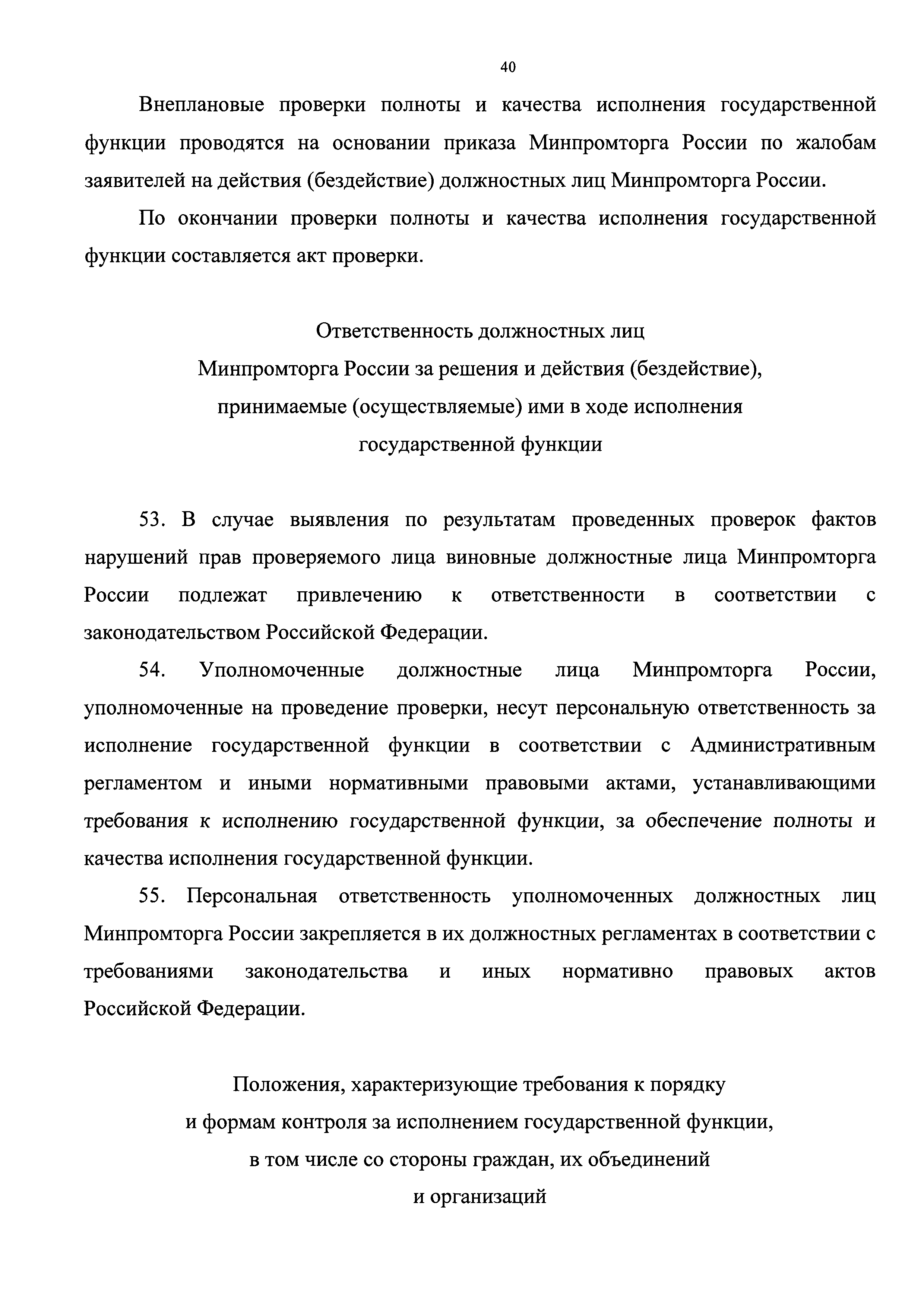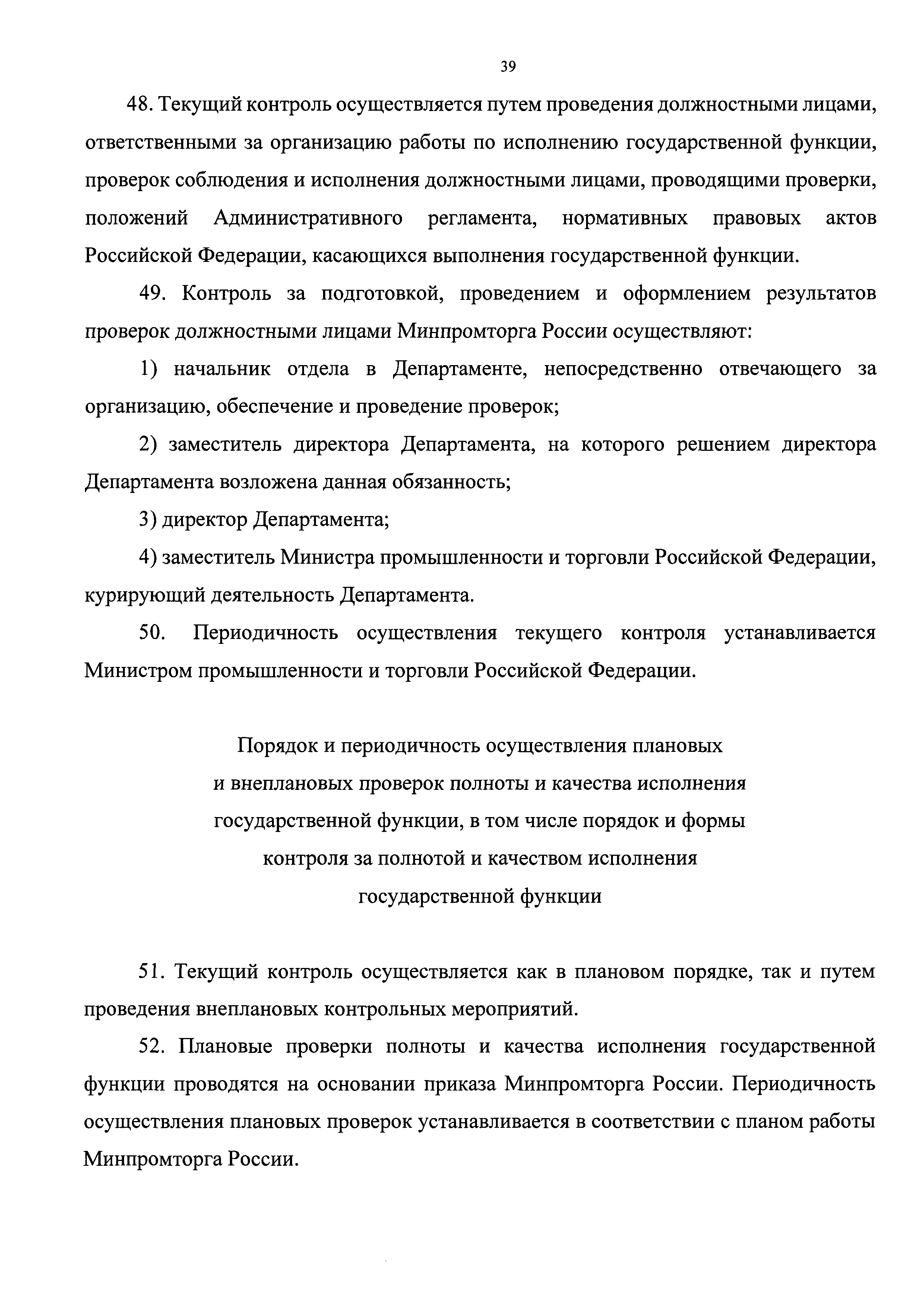 | Оглавление: | I. Общие положения Наименование государственной функции Наименование федерального органа исполнительной власти, исполняющего государственную функцию Перечень нормативных правовых актов, регулирующих исполнение государственной функции, с указанием их реквизитов и источников официального опубликования Предмет государственного контроля Права и обязанности должностных лиц при осуществлении государственного контроля Права и обязанности лиц, в отношении которых осуществляются мероприятия по контролю Описание результата исполнения государственной функции II. Требования к порядку исполнения государственной функции Порядок информирования об исполнении государственной функции Сведения о размере платы за услуги организации (организаций), участвующей (участвующих) в исполнении государственной функции, взимаемой с лица, в отношении которого проводятся мероприятия по контролю Срок исполнения государственной функции III. Состав, последовательность и сроки выполнения административных процедур, требования к порядку их выполнения, в том числе особенности выполнения административных процедур в электронной форме Исчерпывающий перечень административных процедур Планирование проведения проверок Принятие решения о проведении проверки Проведение проверки Оформление результатов проверки Принятие мер по результатам проверки IV. Порядок и формы контроля за исполнением государственной функции Порядок осуществления текущего контроля за соблюдением и исполнением должностными лицами Минпромторга России положений Административного регламента и иных нормативных правовых актов, устанавливающих требования к исполнению государственной функции, а также за принятием ими решений Порядок и периодичность осуществления плановых и внеплановых проверок полноты и качества исполнения государственной функции, в том числе порядок и формы контроля за полнотой и качеством исполнения государственной функции Ответственность должностных лиц Минпромторга России за решения и действия (бездействие), принимаемые (осуществляемые) ими в ходе исполнения государственной функции Положения, характеризующие требования к порядку и формам контроля за исполнением государственной функции, в том числе со стороны граждан, их объединений и организаций V. Досудебный (внесудебный) порядок обжалования решений и действий (бездействия) Минпромторга России, а также должностных лиц Минпромторга России Информация для заинтересованных лиц об их праве на досудебное (внесудебное) обжалование действий (бездействия) и решений, принятых (осуществляемых) в ходе исполнения государственной функции Предмет досудебного (внесудебного) обжалования Исчерпывающий перечень оснований для приостановления рассмотрения жалобы и случаев, в которых ответ на жалобу не дается Основания для начала процедуры досудебного (внесудебного) обжалования Права заинтересованных лиц на получение информации и документов, необходимых для обоснования и рассмотрения жалобы Органы государственной власти и должностные лица, которым может быть направлена жалоба заявителя в досудебном (внесудебном) порядке Сроки рассмотрения жалобы Результат досудебного (внесудебного) обжалования применительно к каждой процедуре либо инстанции обжалования |
