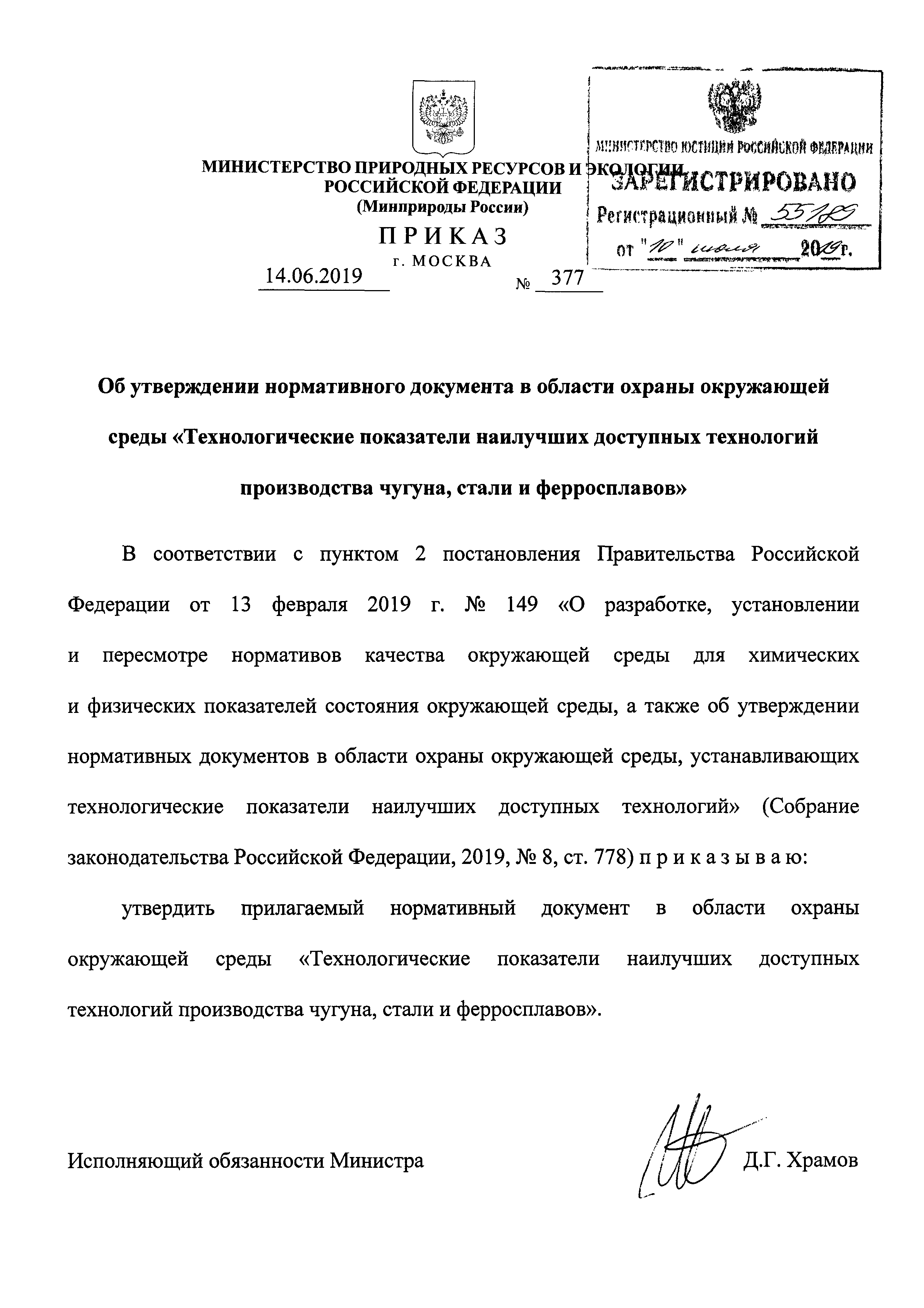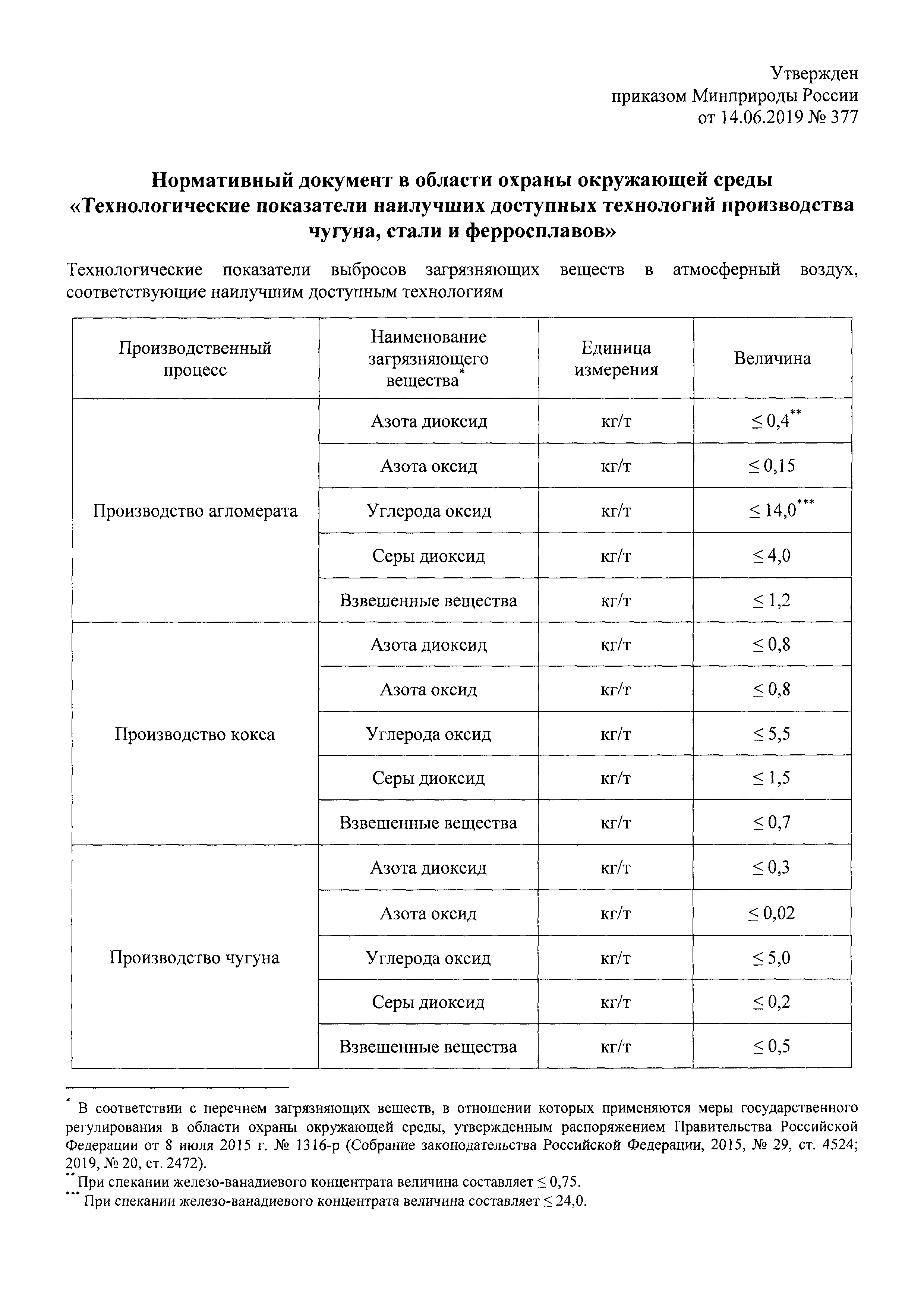 Нормативный документ в области охраны окружающей среды "Технологические показатели наилучших доступных технологий производства чугуна, стали и ферросплавов"| Статус: | действует | | Название рус.: | Нормативный документ в области охраны окружающей среды "Технологические показатели наилучших доступных технологий производства чугуна, стали и ферросплавов" | | Дата добавления в базу: | 01.02.2020 | | Дата актуализации: | 01.01.2021 | | Дата введения: | 21.07.2019 | | Утверждён: | 14.06.2019 Министерство природных ресурсов и экологии Российской Федерации (377)