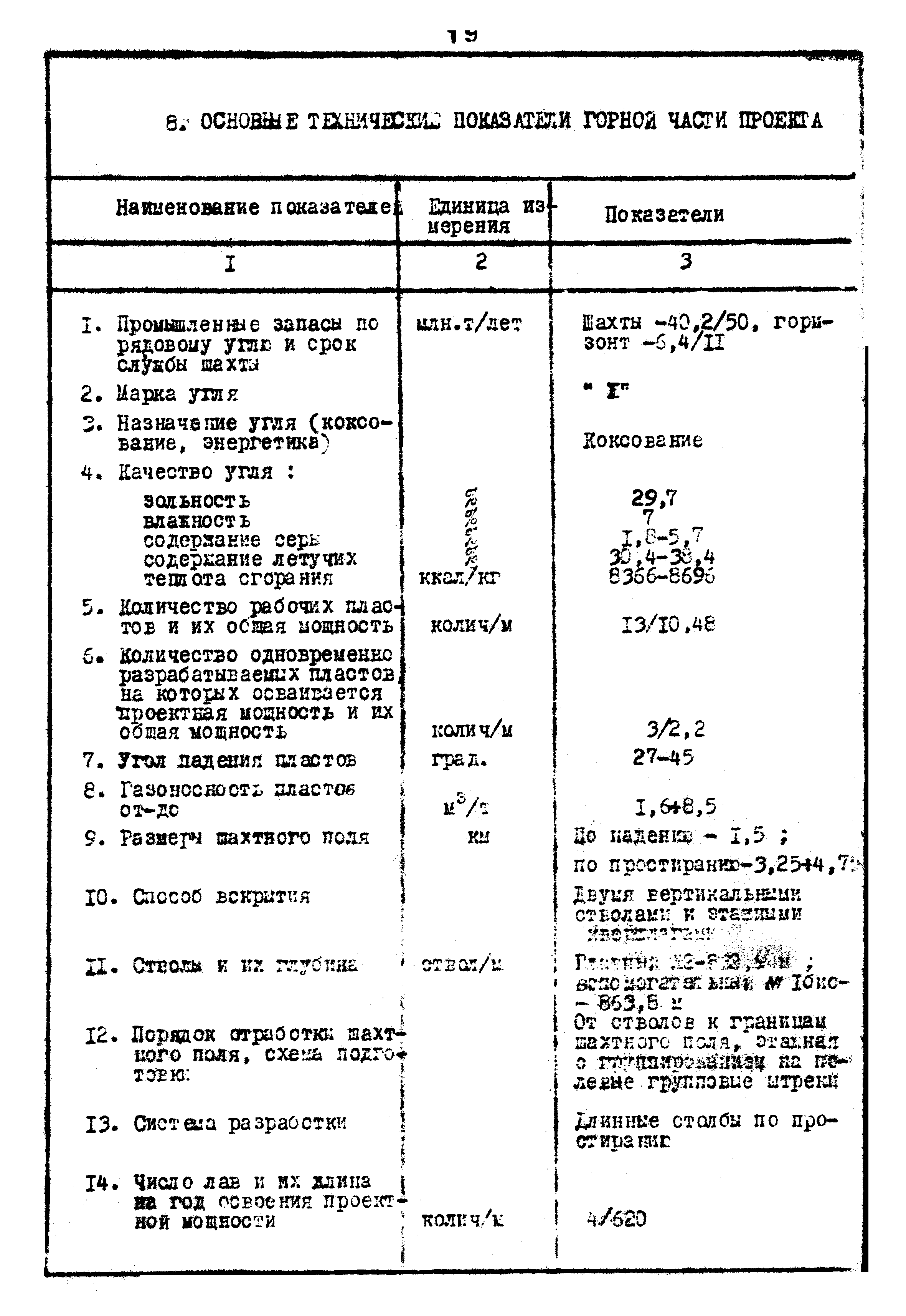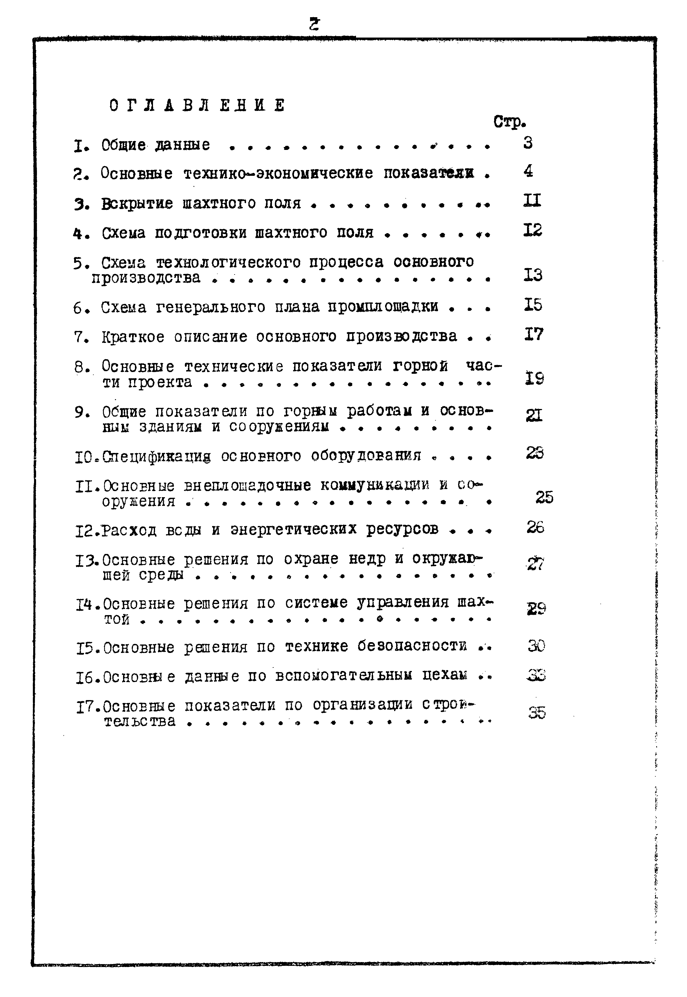 | Оглавление: | 1. Общие данные 2. Основные технико-экономические показатели 3. Вскрытие шахтного поля 4. Схема подготовки шахтного поля 5. Схема технологического процесса основного производства 6. Схема генерального плана промплощадки 7. Краткое описание основного производства 8. Основные технические показатели горной части проекта 9. Общие показатели по горным работам и основным зданиям и сооружениям 10. Спецификация основного оборудования 11. Основные внеплощадочные коммуникации и сооружения 12. Расход воды и энергетических ресурсов 13. Основные решения по охране недр и окружающей среды 14. Основные решения по системе управления шахтой 15. Основные решения по технике безопасности 16. Основные данные по вспомогательным цехам 17. Основные показатели по организации строительства |